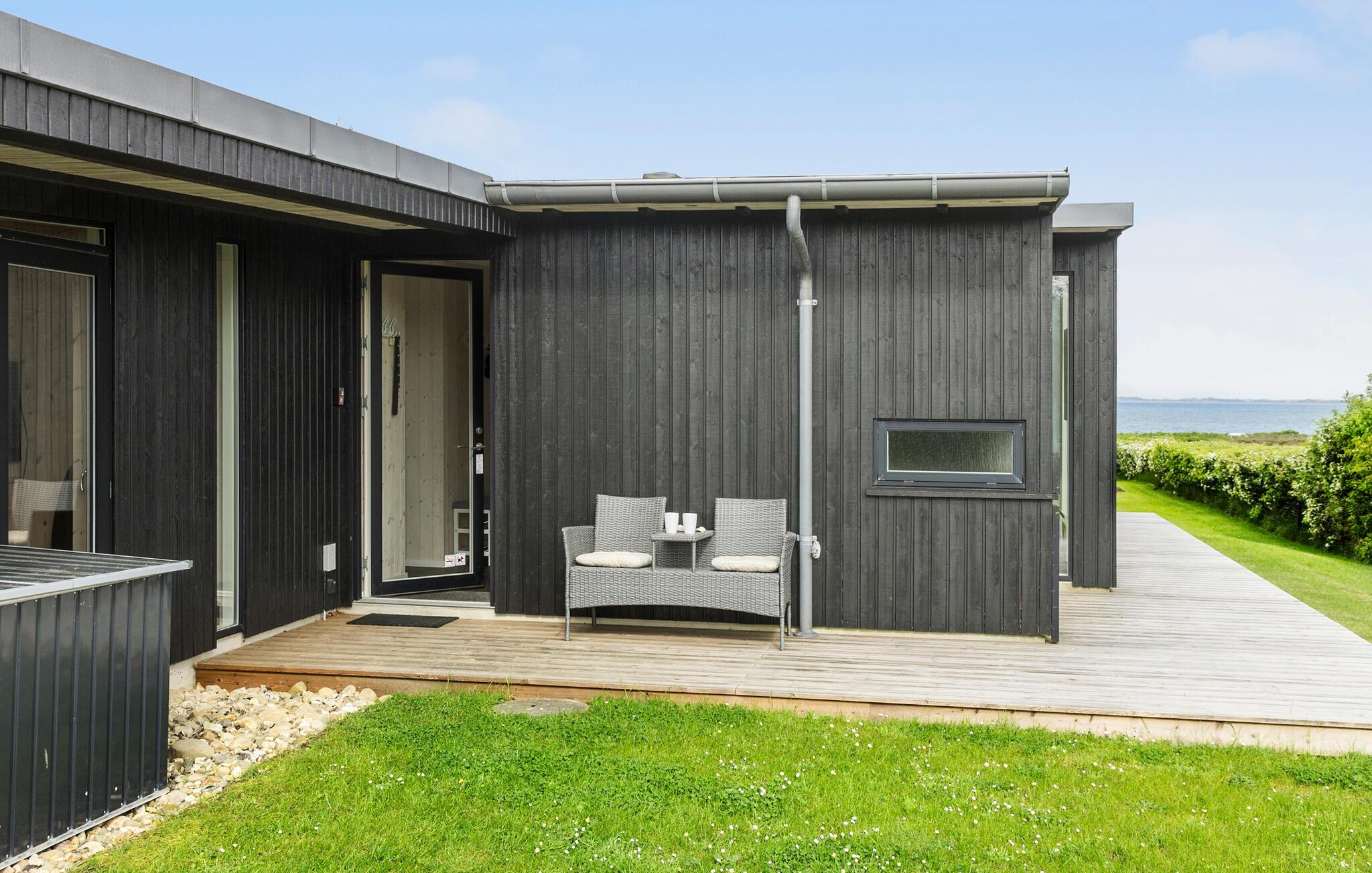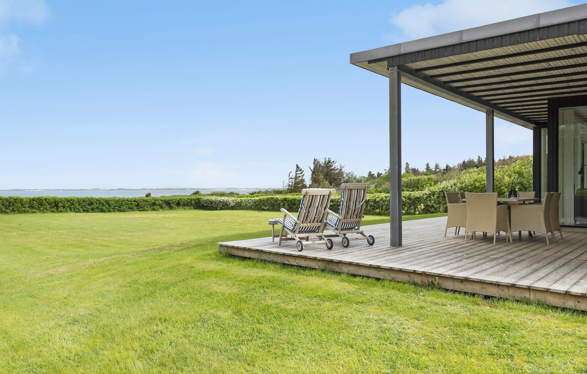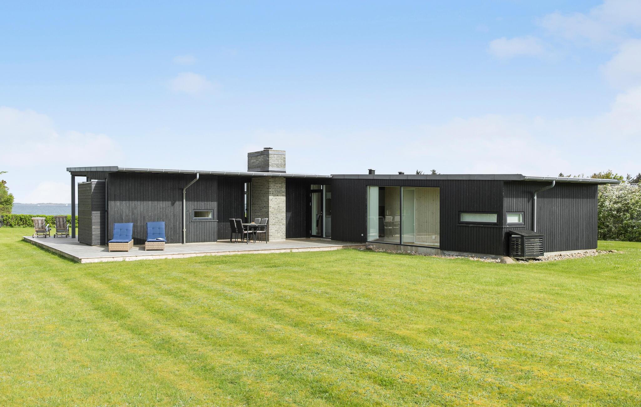 Modernes Ferienhaus mit Fjordblick, Kamin, überdachter Terrasse und direktem Strandzugang in Dänemark.