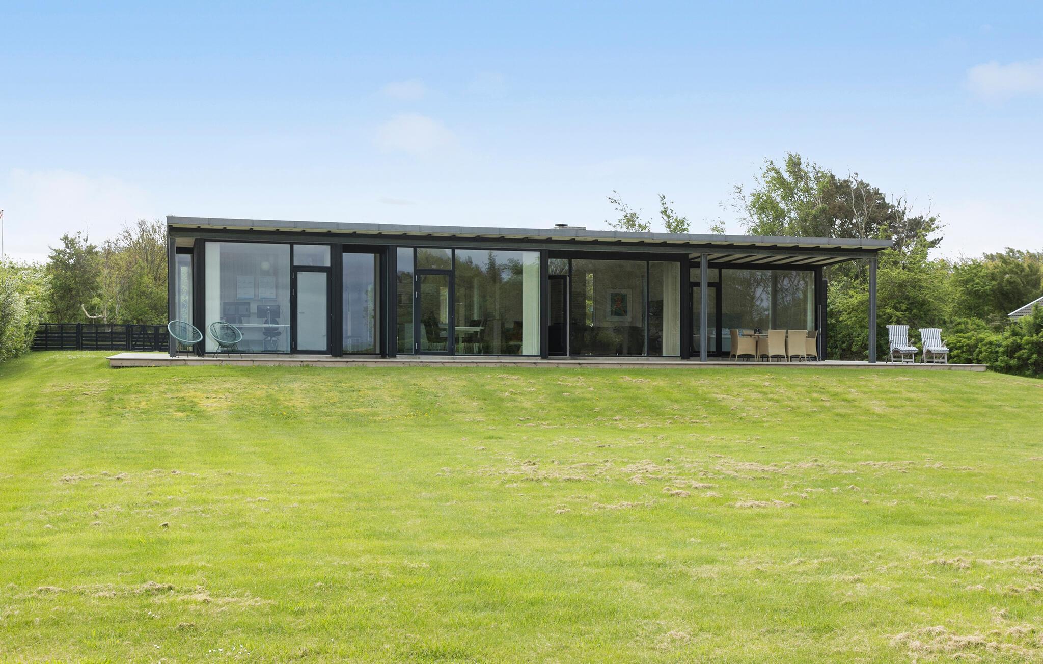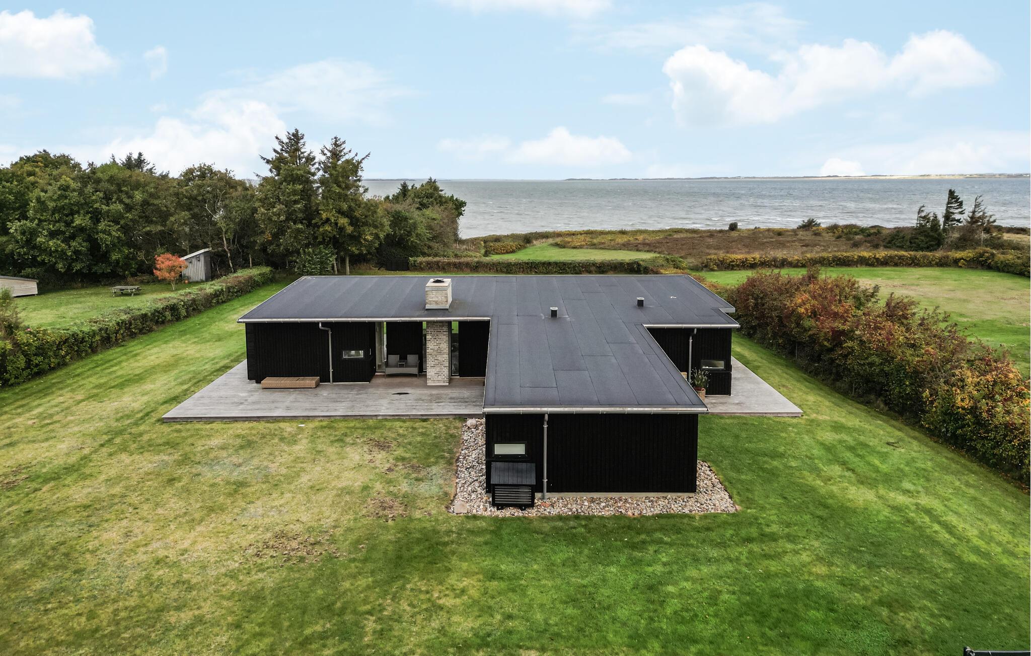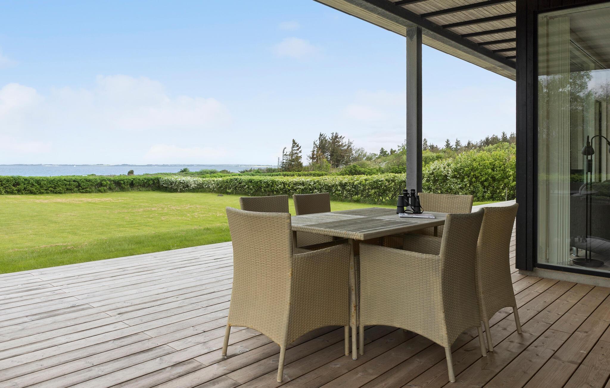 Modernes Ferienhaus mit Fjordblick, Kamin, überdachter Terrasse und direktem Strandzugang in Dänemark.