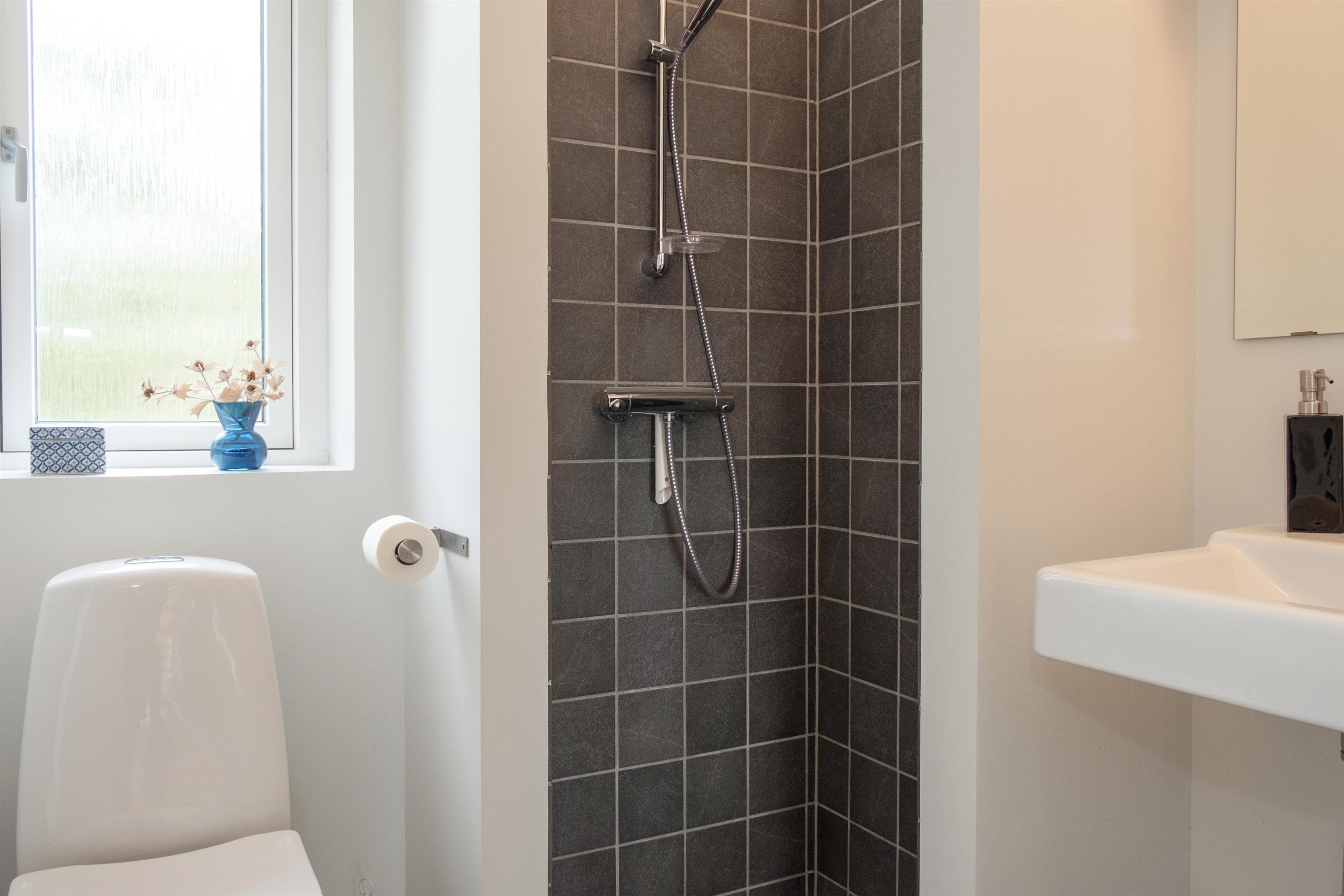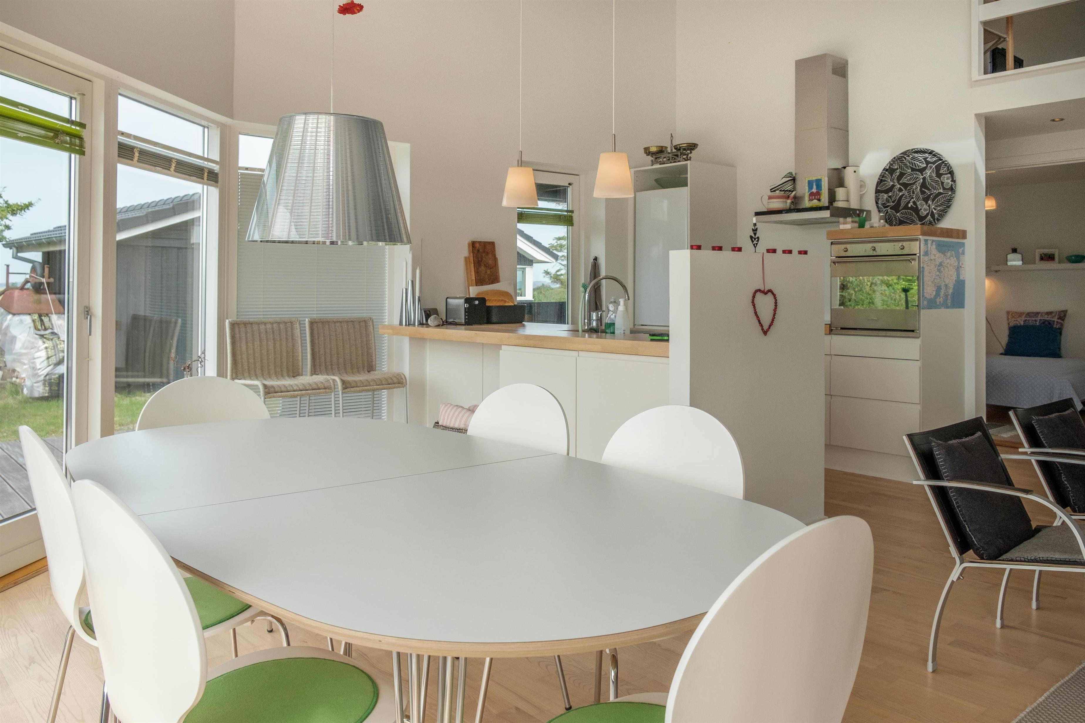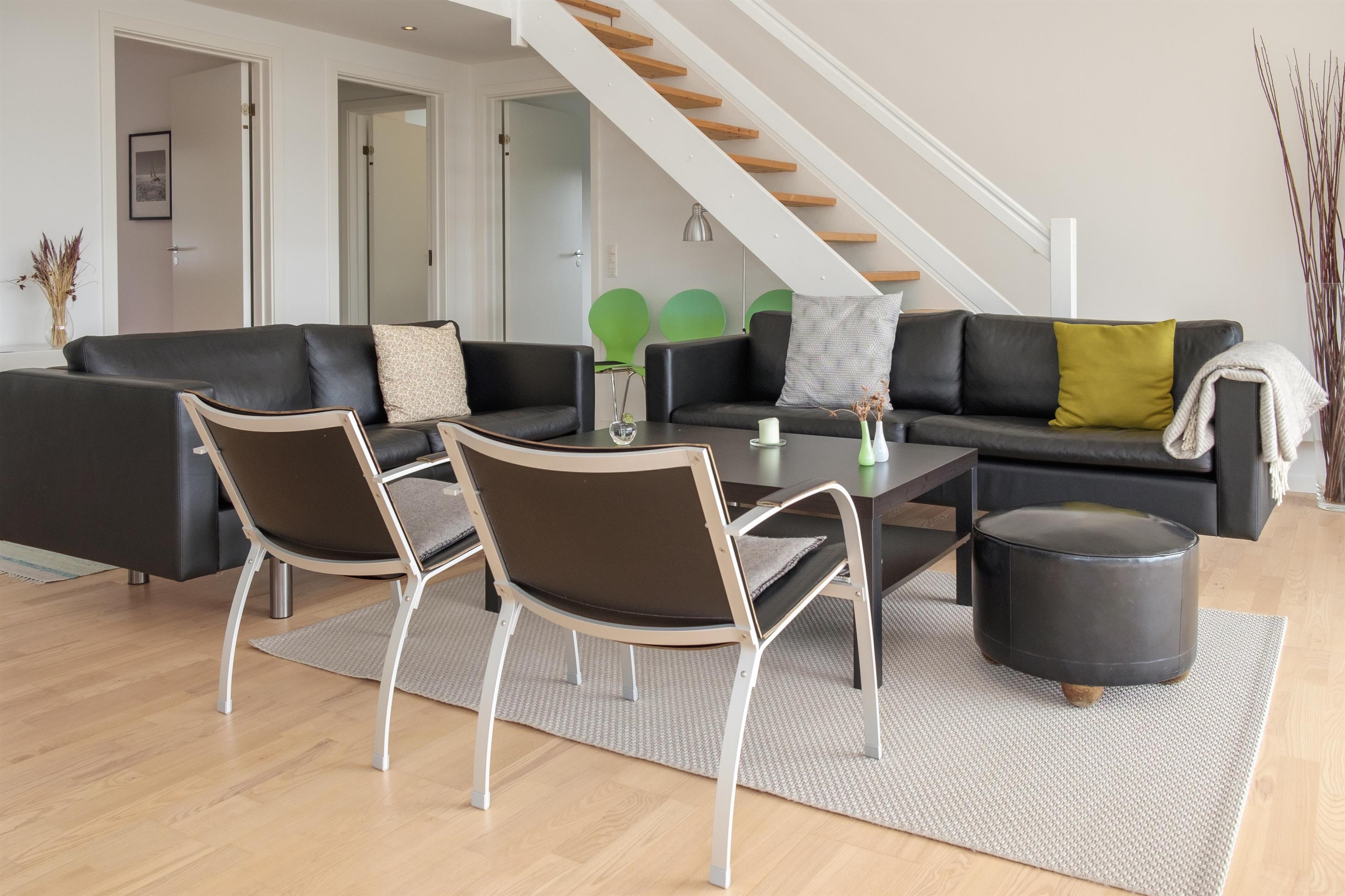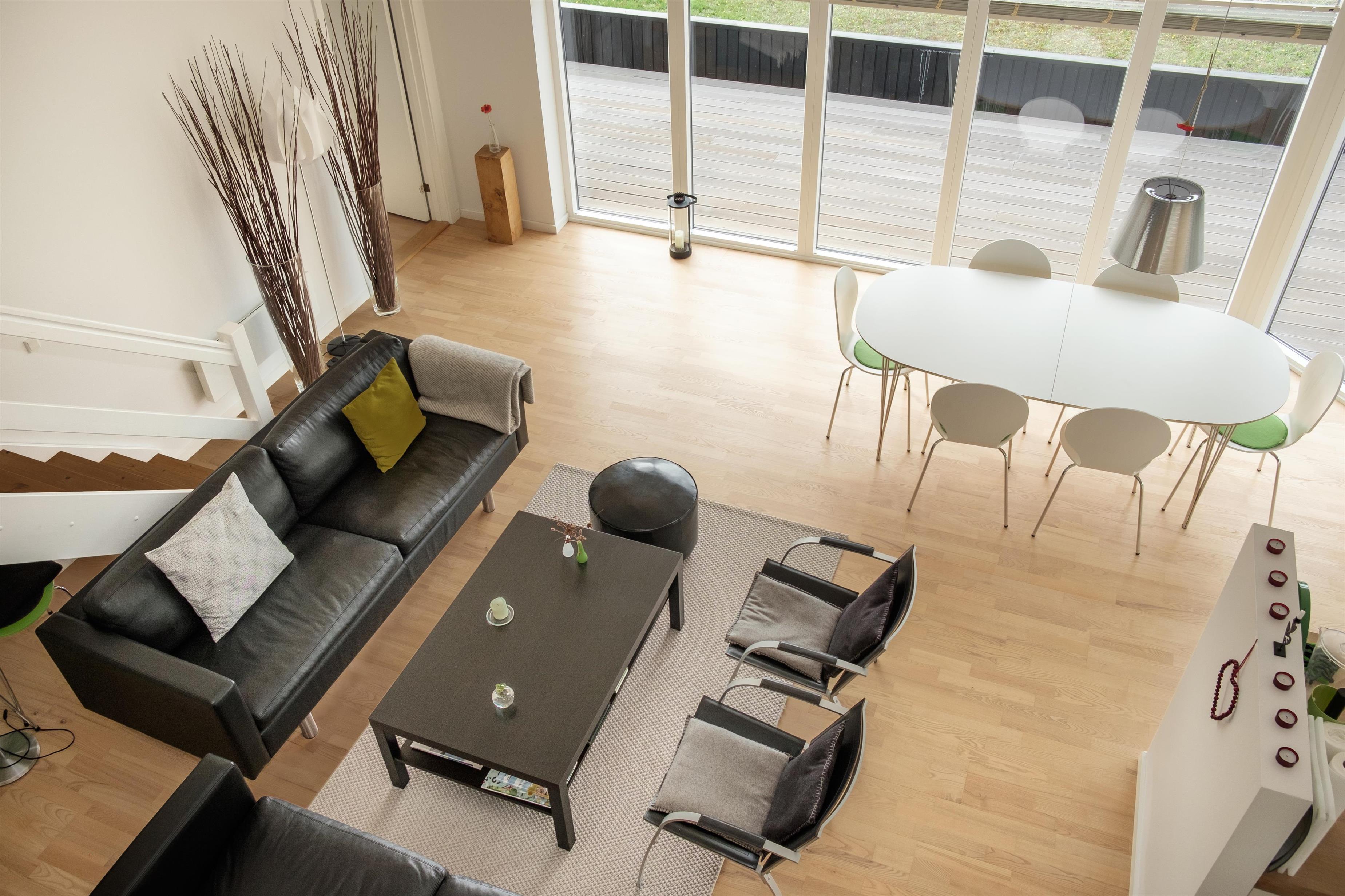 Das geräumige, helle und einladende Wohnzimmer mit großen Panoramafenstern liegt in offener Verbindung zur Küche und hat Zugang zur Terrasse. Hier findet man einen bequemen Sofabereich, einen Essbereich für sechs Personen, TV mit dänischen (inkl. TV2) und deutschen Programmen sowie Radio. Schöne und gut ausgestattete neue Küche mit Glaskeramik-Kochfeld, Backofen, Kühl-/Gefrierkombination und Geschirrspüler. Vom Wohnzimmer führt eine Treppe in den 1. Stock mit einem gemütlichen, hellen Aufenthaltsraum mit Aussichtsbalkon. Die sechs Schlafplätze verteilen sich auf drei schöne, helle Schlafzimmer mit Doppelbett im Erdgeschoss. Schönes, großes Badezimmer mit Whirlpool und Dusche sowie kleineres Badezimmer mit Dusche. Internetzugang.
