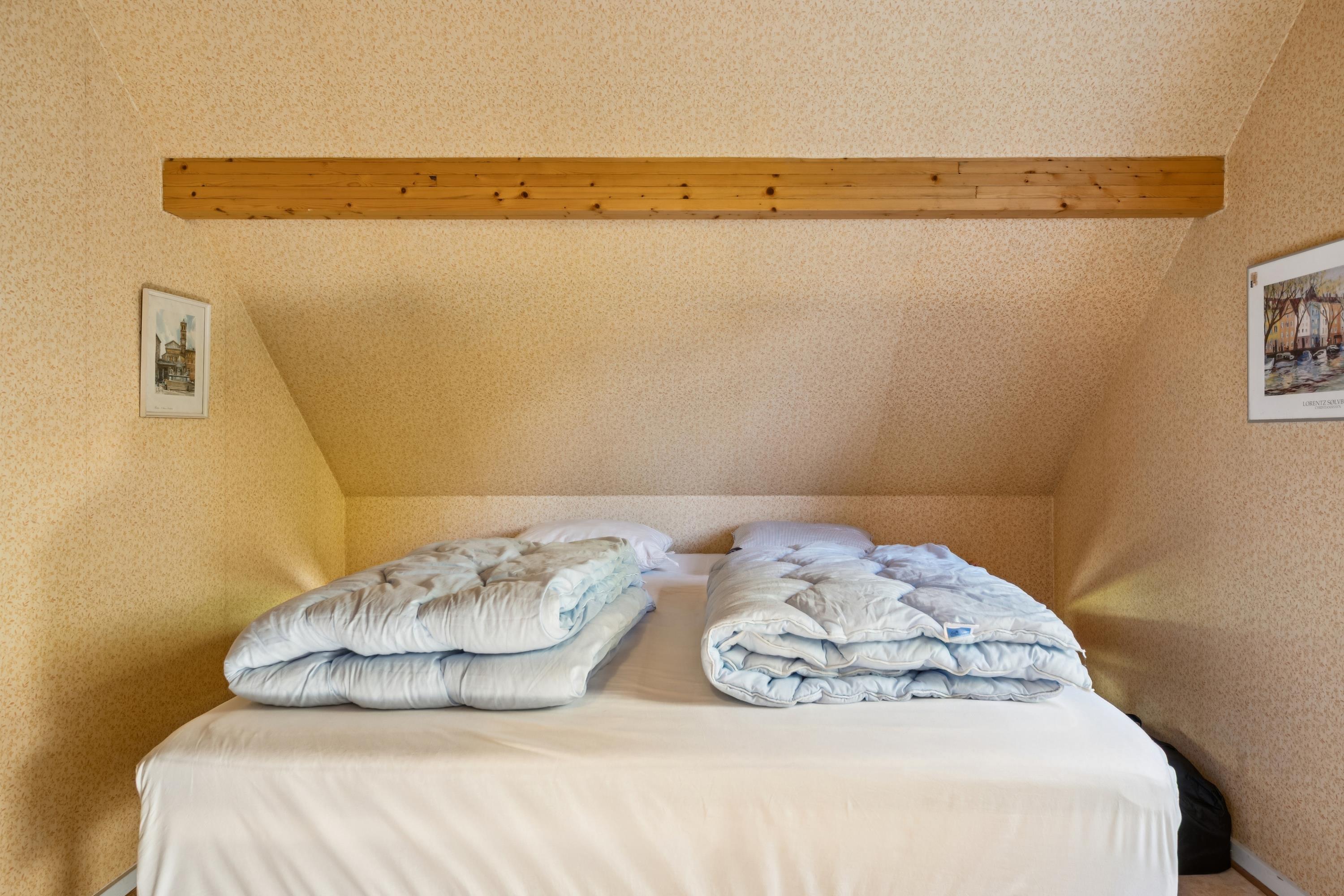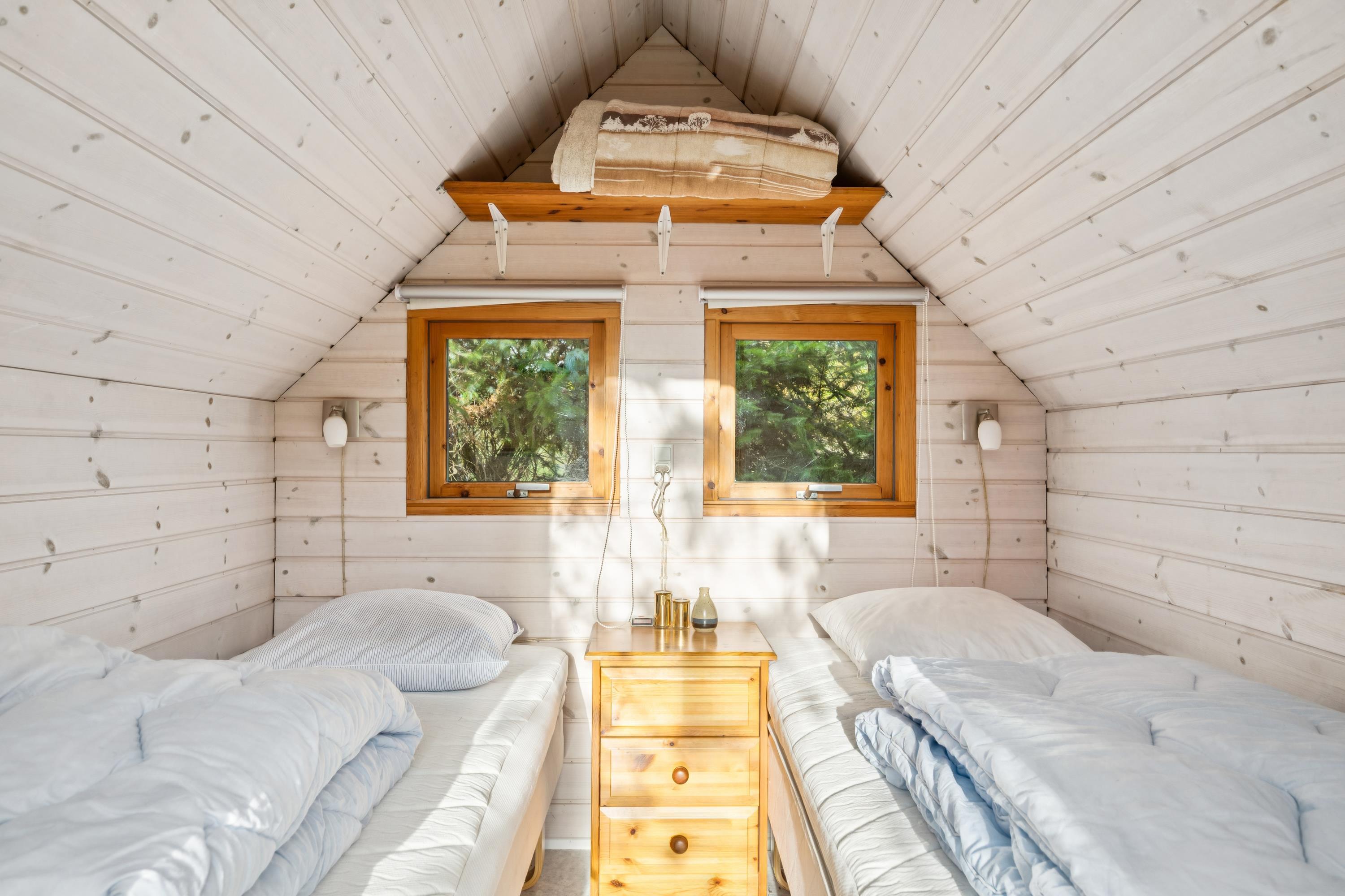 Die letzten zwei Schlafplätze befinden sich in einem neueren Annex mit zwei Einzelbetten, beheizt durch einen Elektroheizkörper. Für die kleinsten Gäste stehen Hochstuhl und Kinderbett bereit.