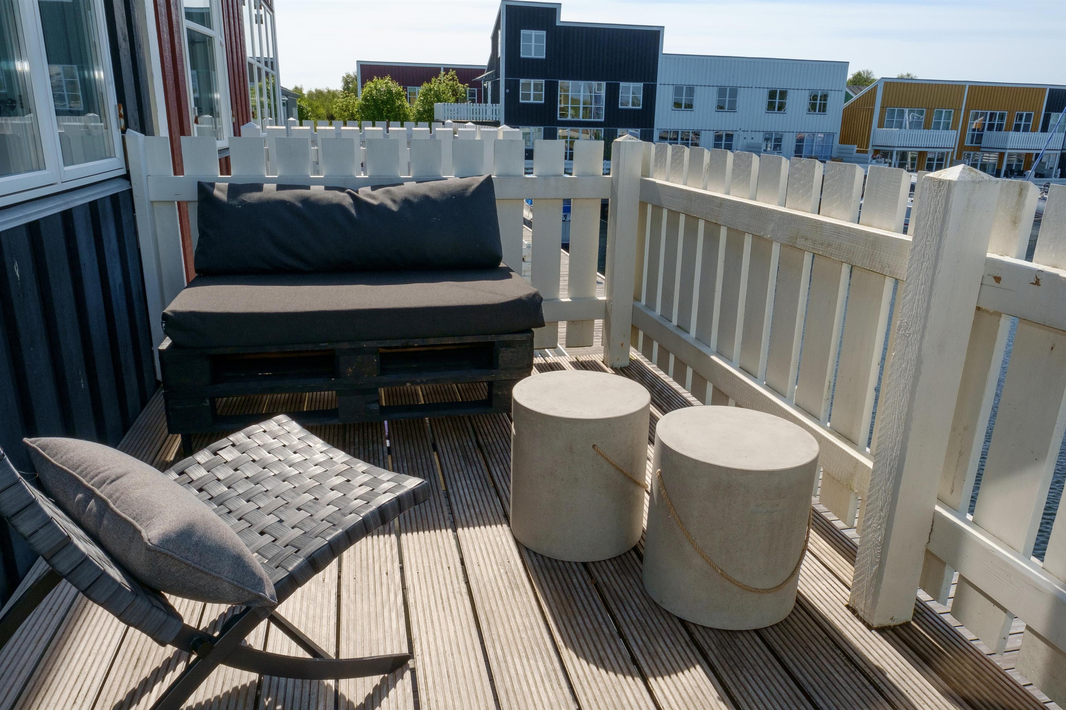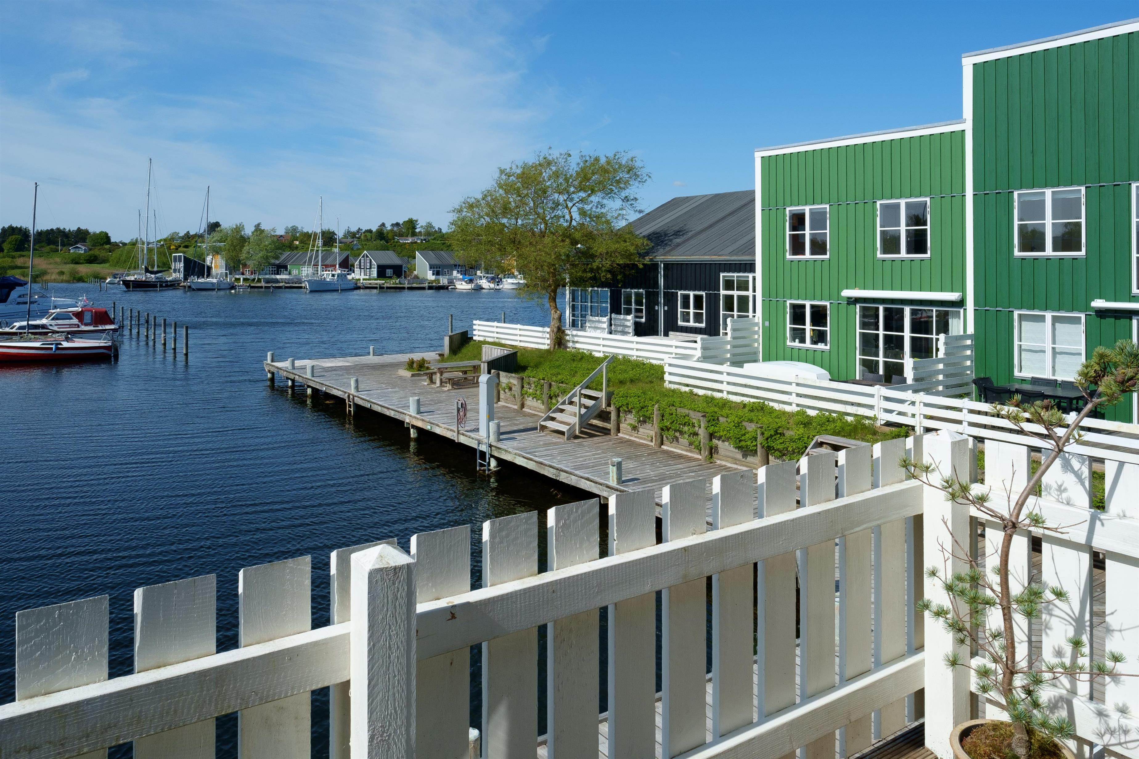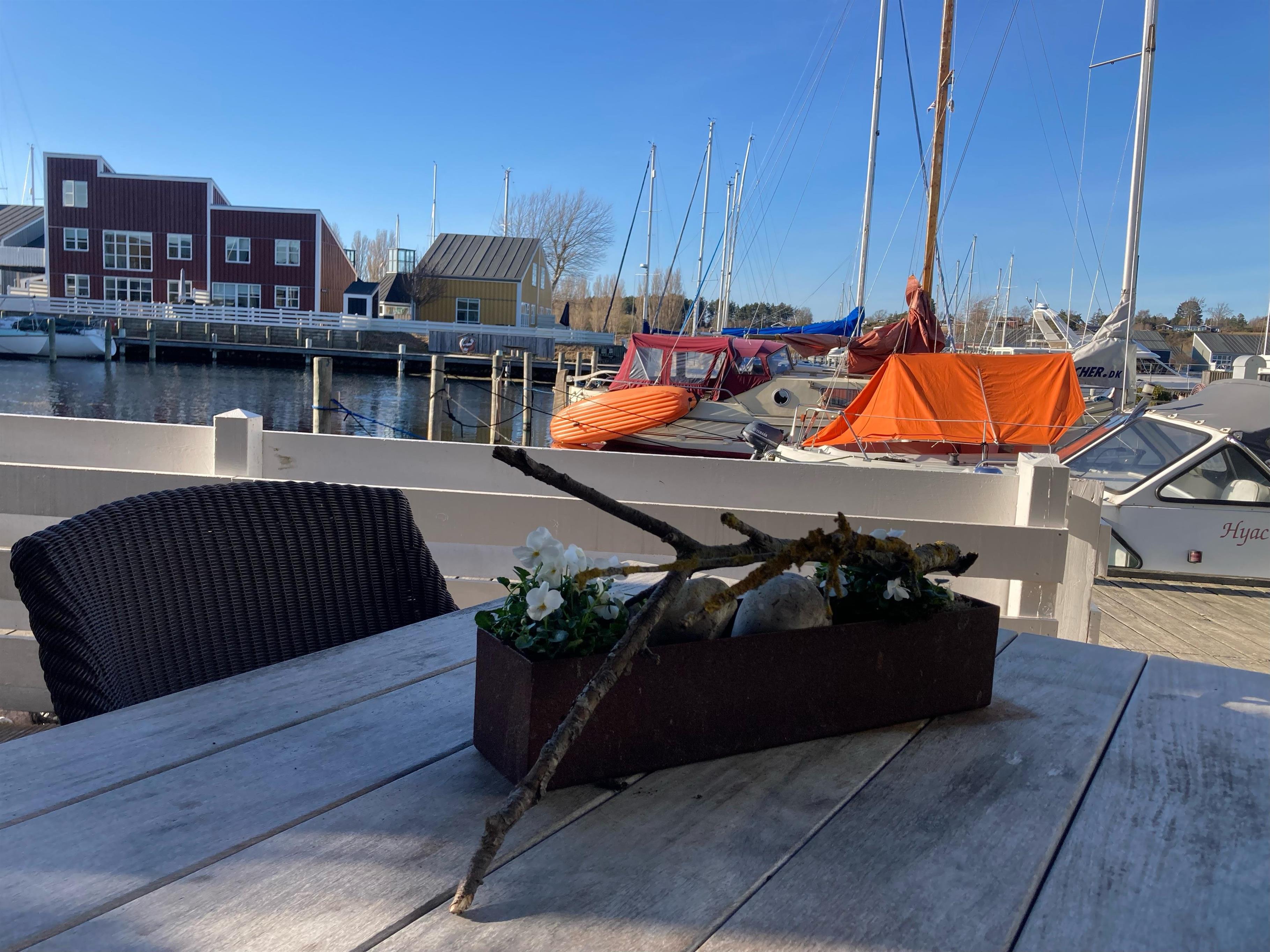 Neu renovierte und geschmackvoll eingerichtete Ferienwohnung auf 2 Etagen in der malerischen Ferienanlage Øer Maritime Ferieby und mit herrlichem Blick auf die Liegeplätze von der nach Osten gewandten Holzterrasse sowie vom Balkon und Wohnzimmer im 1. Stock. Es gibt Gartenmöbel, Sonnenliegen, Sonnenschirm und Grill. Außerdem verfügt das Haus über eine kleine, nach Westen gewandte Terrasse vor der Haustür.