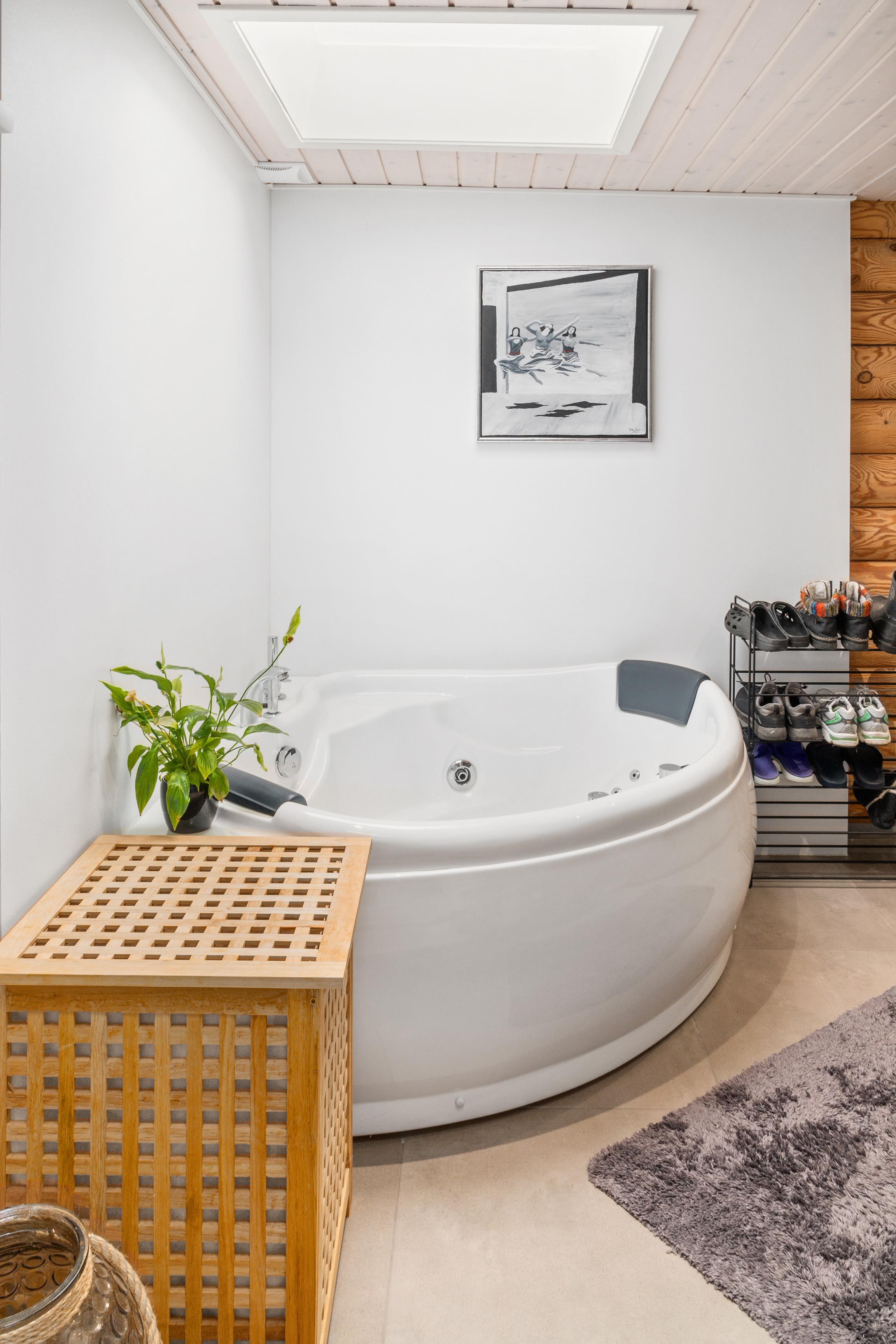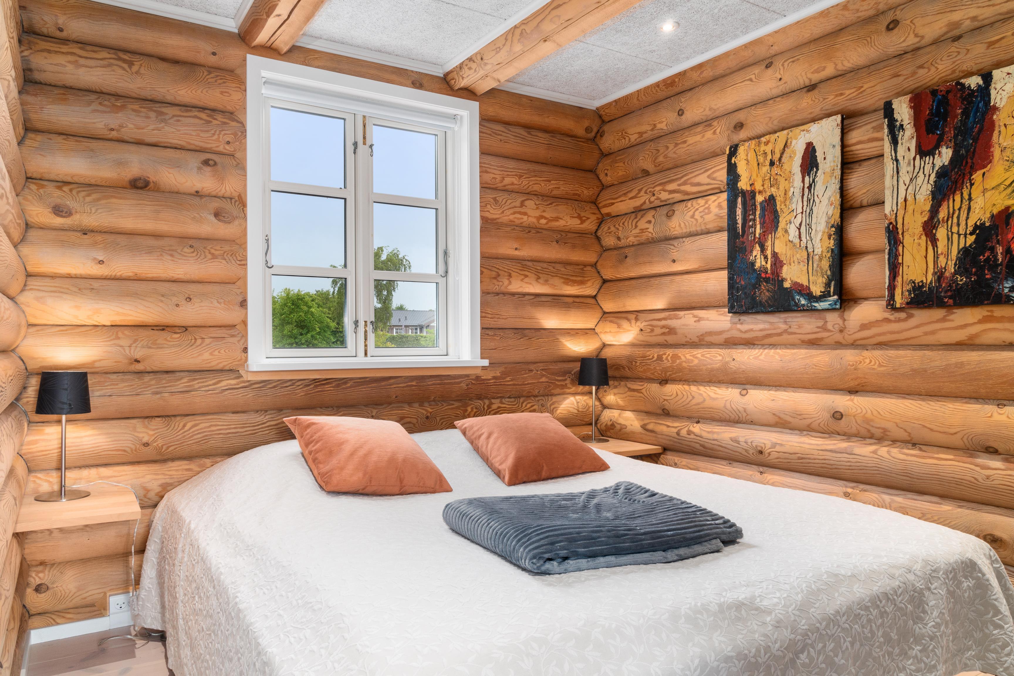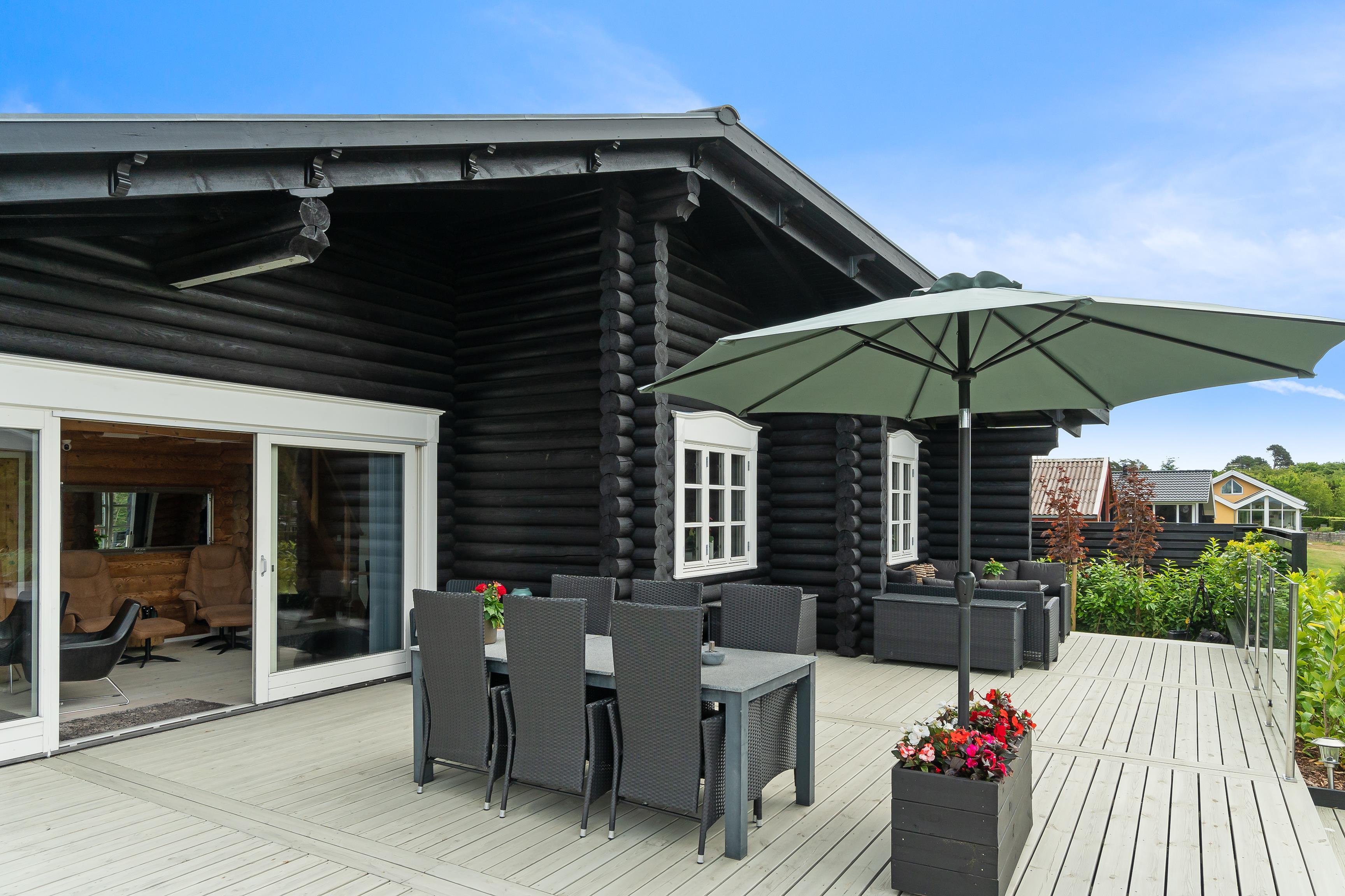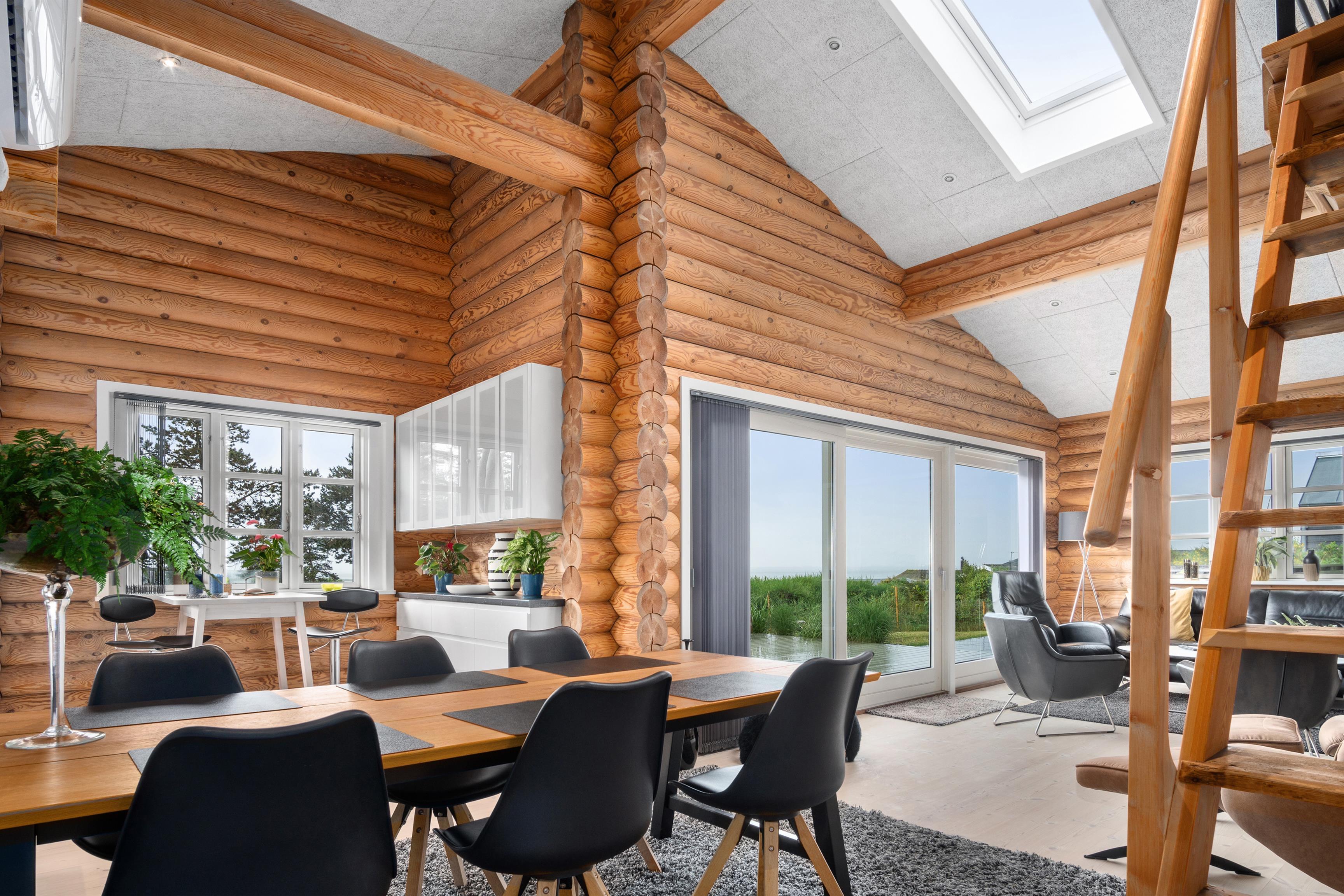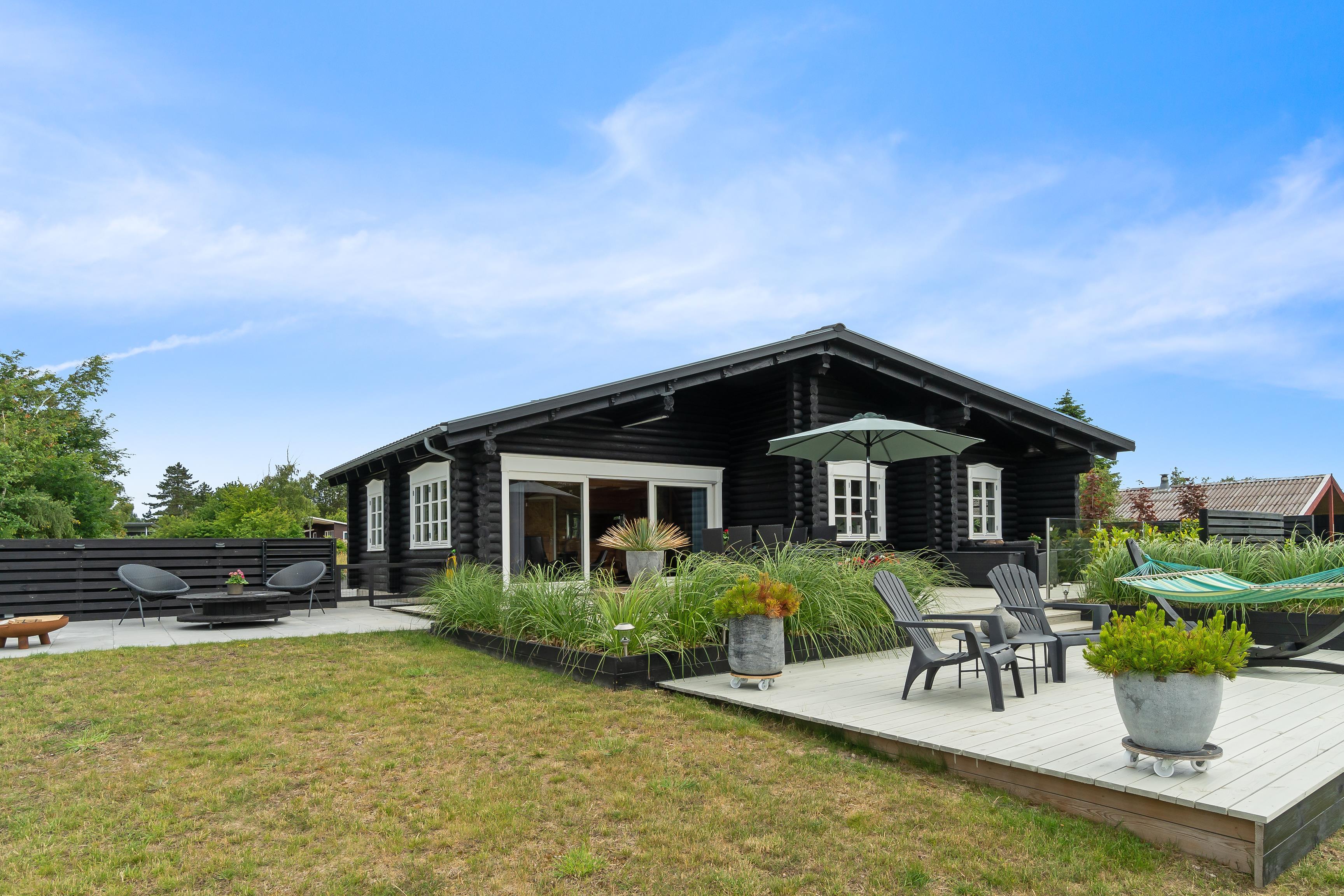 Nur 5 Autominuten von Ebeltoft entfernt liegt dieses einzigartige Blockhaus, dessen besondere Atmosphäre man schon beim Betreten der Diele spürt. Schönes, gemütliches und geschmackvoll möbliertes Wohnzimmer mit Zugang zur fantastischen Terrasse mit Gartenmöbeln und herrlichem Blick auf das Wasser. In offener Verbindung zum Wohnzimmer liegt die schicke, gut ausgestattete Küche mit Ausgang auf eine weitere Terrasse mit Gartenmöbeln. Die Schlafplätze verteilen sich auf drei schöne Schlafzimmer mit Doppelbett. Das eine Schlafzimmer hat direkten Zugang zu einem schicken Badezimmer mit WC und ein paar Stufen hinunter zum Whirlpool. Hier findet man auch eine Waschmaschine und einen Trockner. Die beiden letzten Schlafplätze bietet ein Doppel-Schlafsofa auf einem großen Hängeboden. Das Haus verfügt über ein weiteres Badezimmer mit Dusche. Ein wirklich tolles Ferienhaus für eine große oder zwei kleinere Familien.