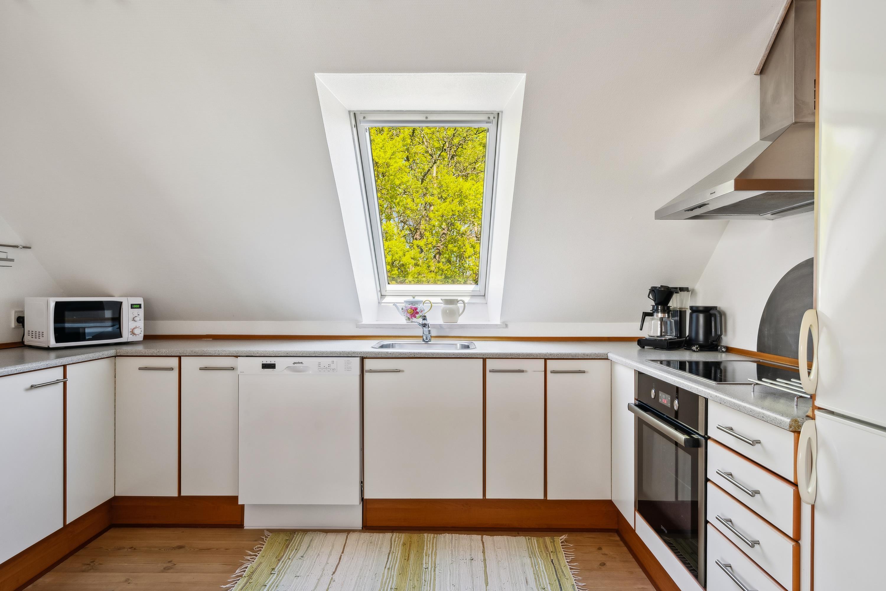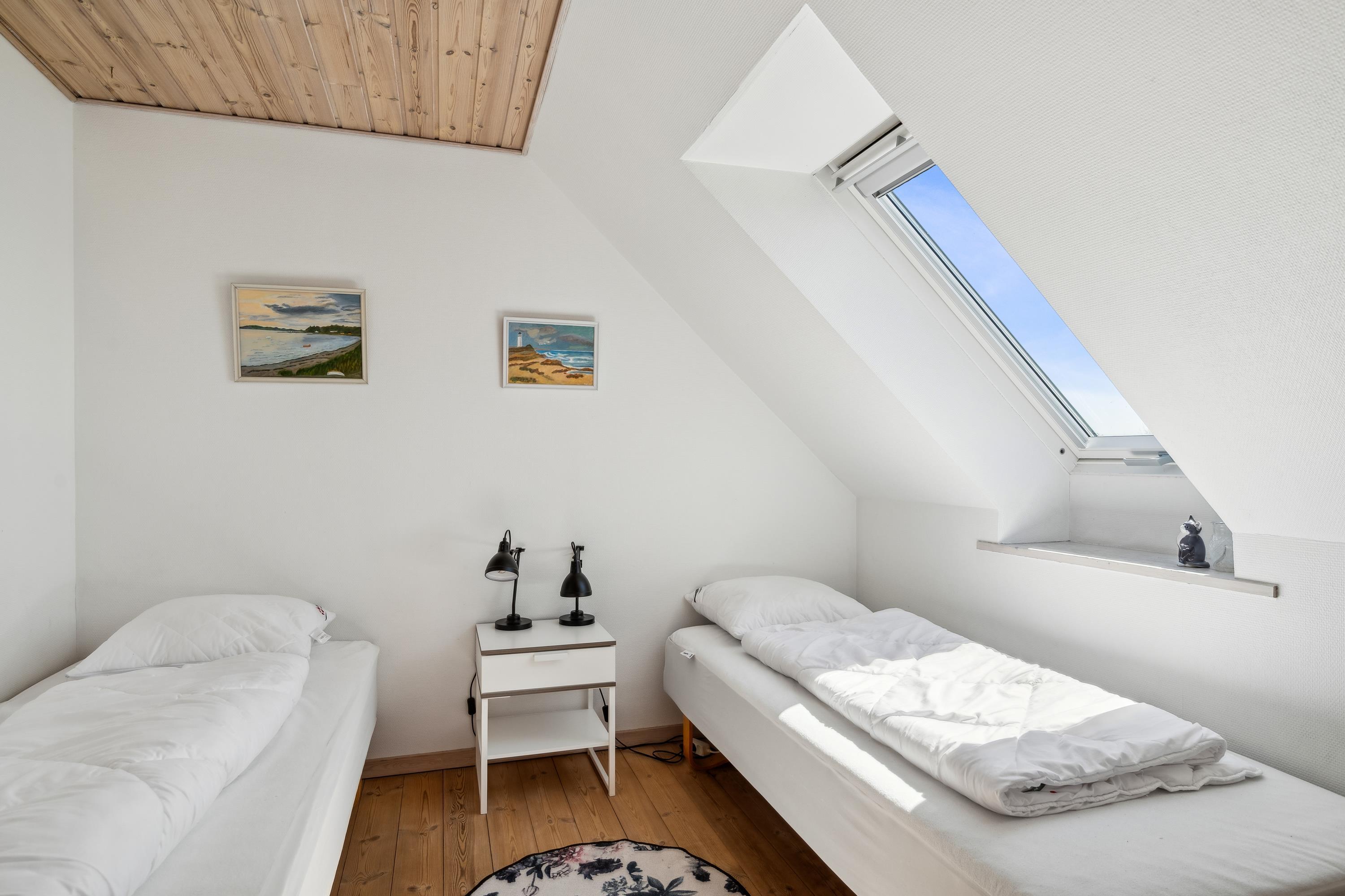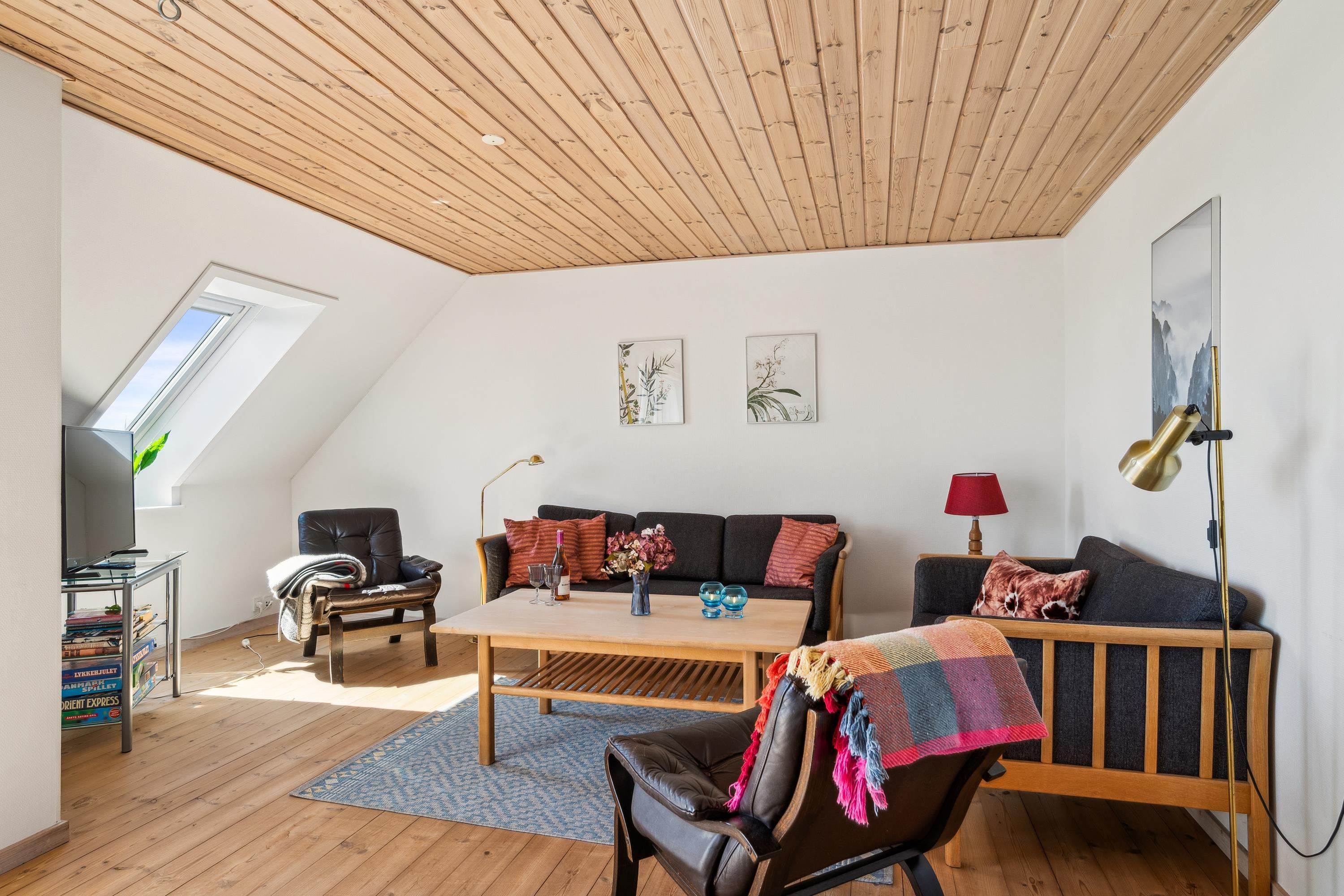 Gemeinsame Haustür mit der Erdgeschosswohnung, und vom Eingangsbereich führt eine Treppe hinauf zur Wohnungstür. Man kommt direkt in das gemütliche Wohnzimmer in halb offener Verbindung zur Küche. Das Wohnzimmer ist mit Zugang zum Balkon, Essplatz für sechs Personen, Sitzecke und TV mit dänischen Programmen ausgestattet. Große Küche mit viel Arbeitsfläche, Glaskeramikherd, Kühl-/Gefrierkombination, Geschirrspüler und Mikrowelle. Die insgesamt sechs Schlafplätze verteilen sich auf ein helles Schlafzimmer mit Doppelbett, ein etwas kleineres Zimmer mit zwei Einzelbetten sowie zwei Schlafplätze auf dem Schlafsofa im Wohnzimmer. Schönes, gut eingerichtetes Badezimmer mit Fußbodenheizung, Dusche und Waschmaschine. Internetzugang.