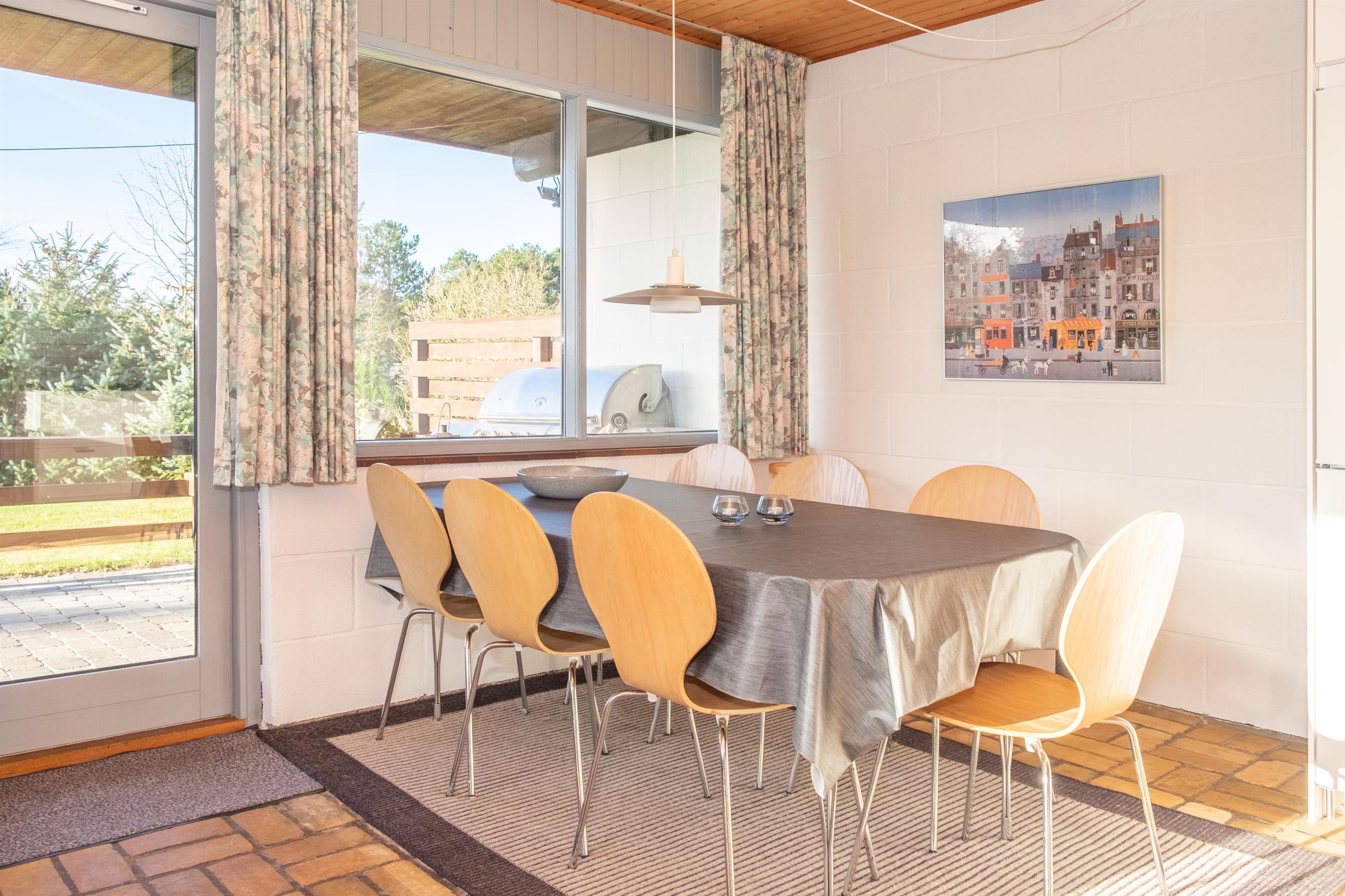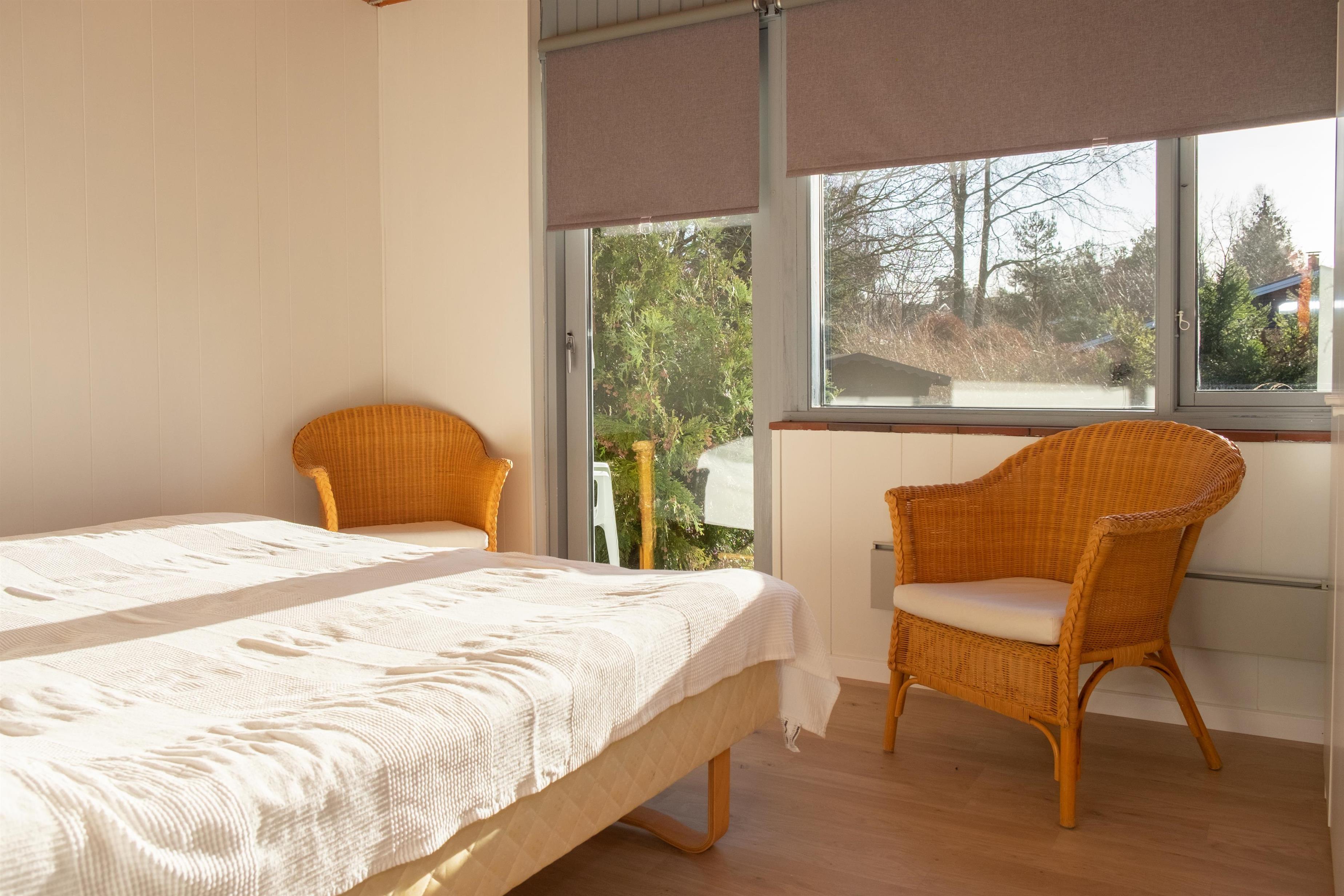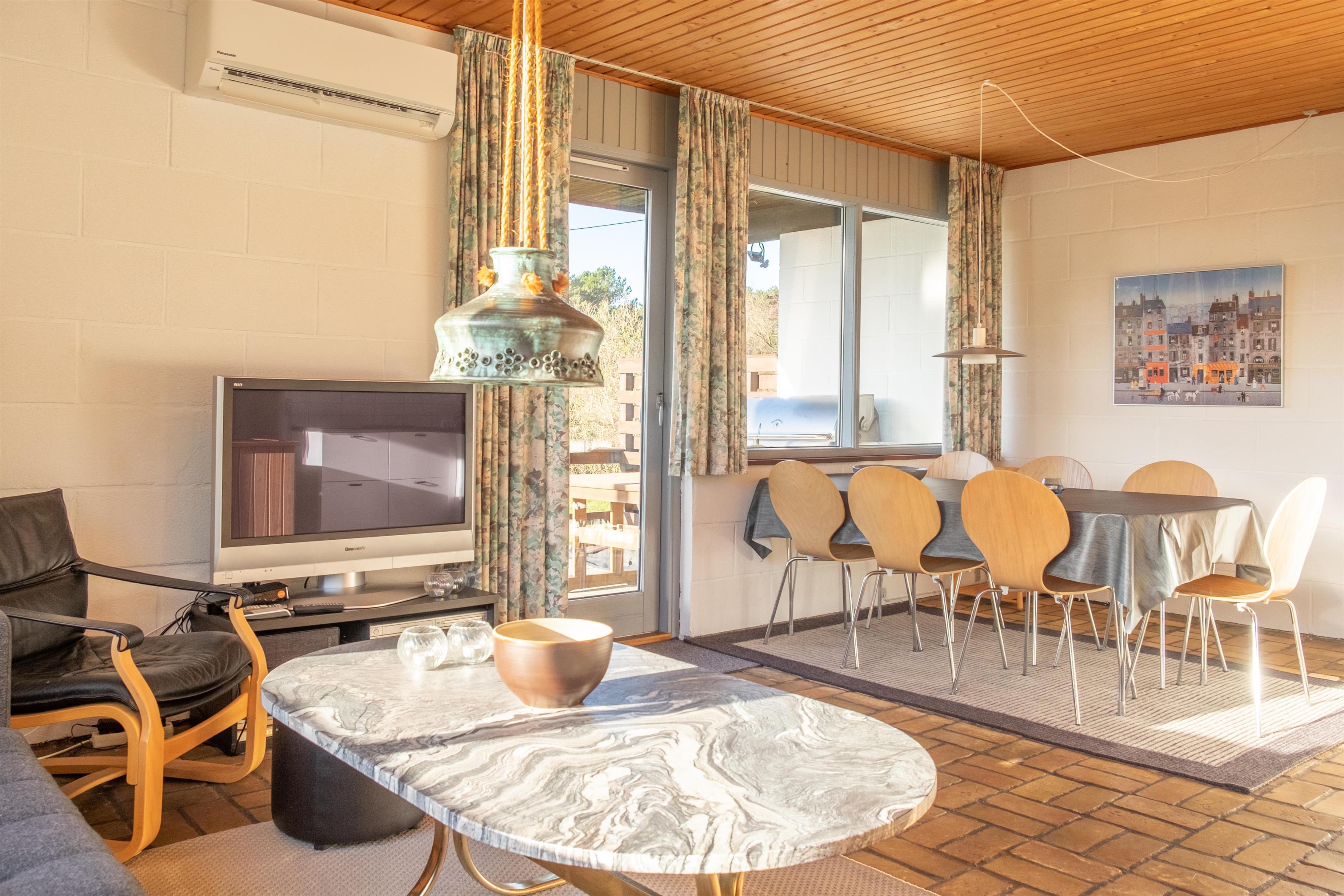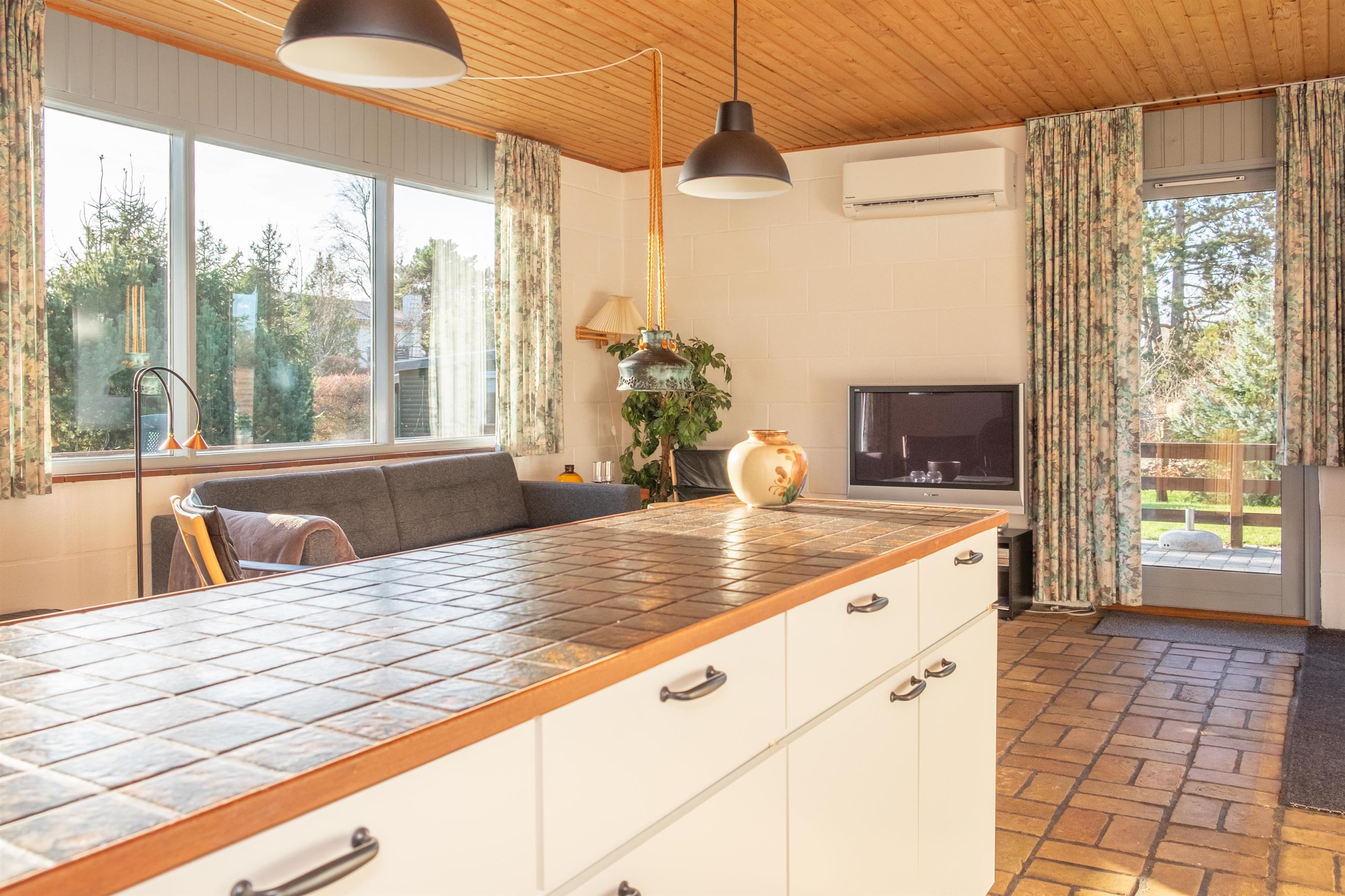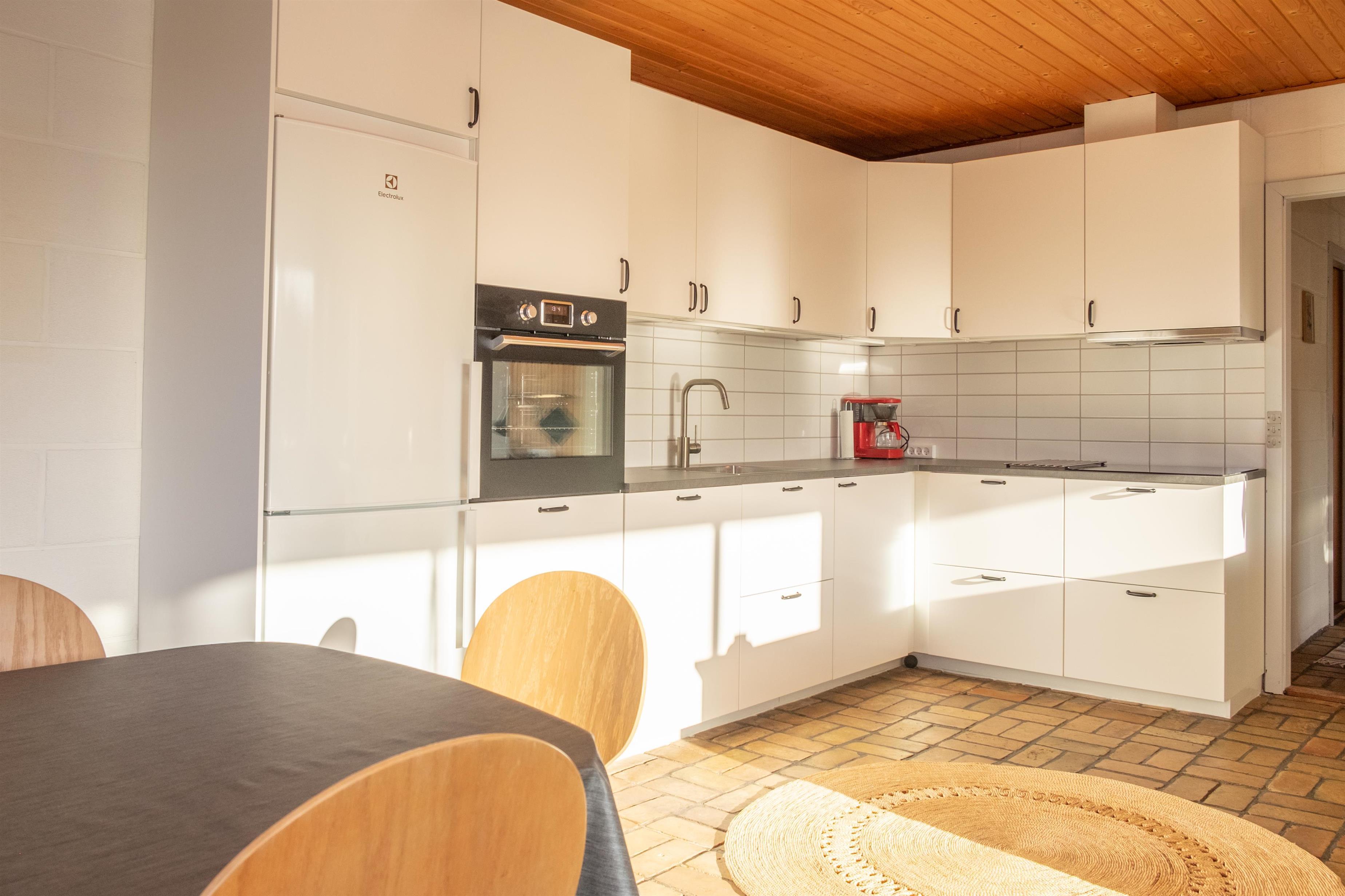 Das helle Wohnzimmer in offener Verbindung zur Küche ist mit Fliesenboden, Kaminofen, Essbereich für sechs Personen, Sitzecke mit bequemen Sesseln, TV mit dänischen (inkl. TV2) und deutschen Programmen sowie DVD-Player ausgestattet. Schicke neue Küche mit viel Arbeitsfläche, Glaskeramik-Kochfeld, Backofen, Kühl-/Gefrierkombination und Geschirrspüler. Die insgesamt sechs Schlafplätze verteilen sich auf zwei große, helle Schlafzimmer mit Doppelbett, das eine mit Ausgang auf die Terrasse, und ein etwas kleineres Zimmer mit Doppelbett. Neueres, gefliestes Badezimmer mit Fußbodenheizung, Dusche, Waschmaschine und Trockner. Das Haus ist mit Wärmepumpe mit Klimaanlage ausgestattet. Für die Kleinsten ist ein Hochstuhl vorhanden. Internetzugang.
