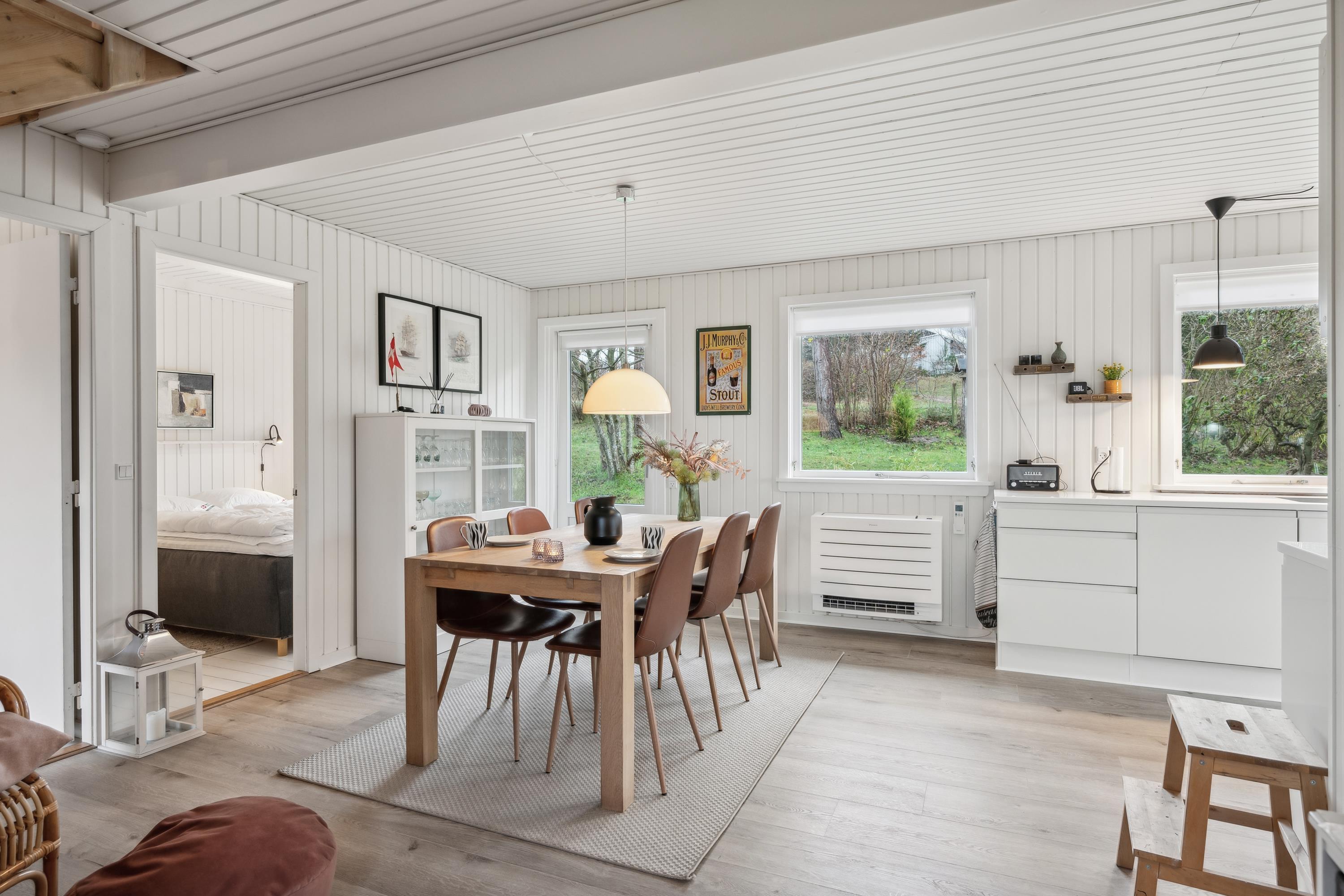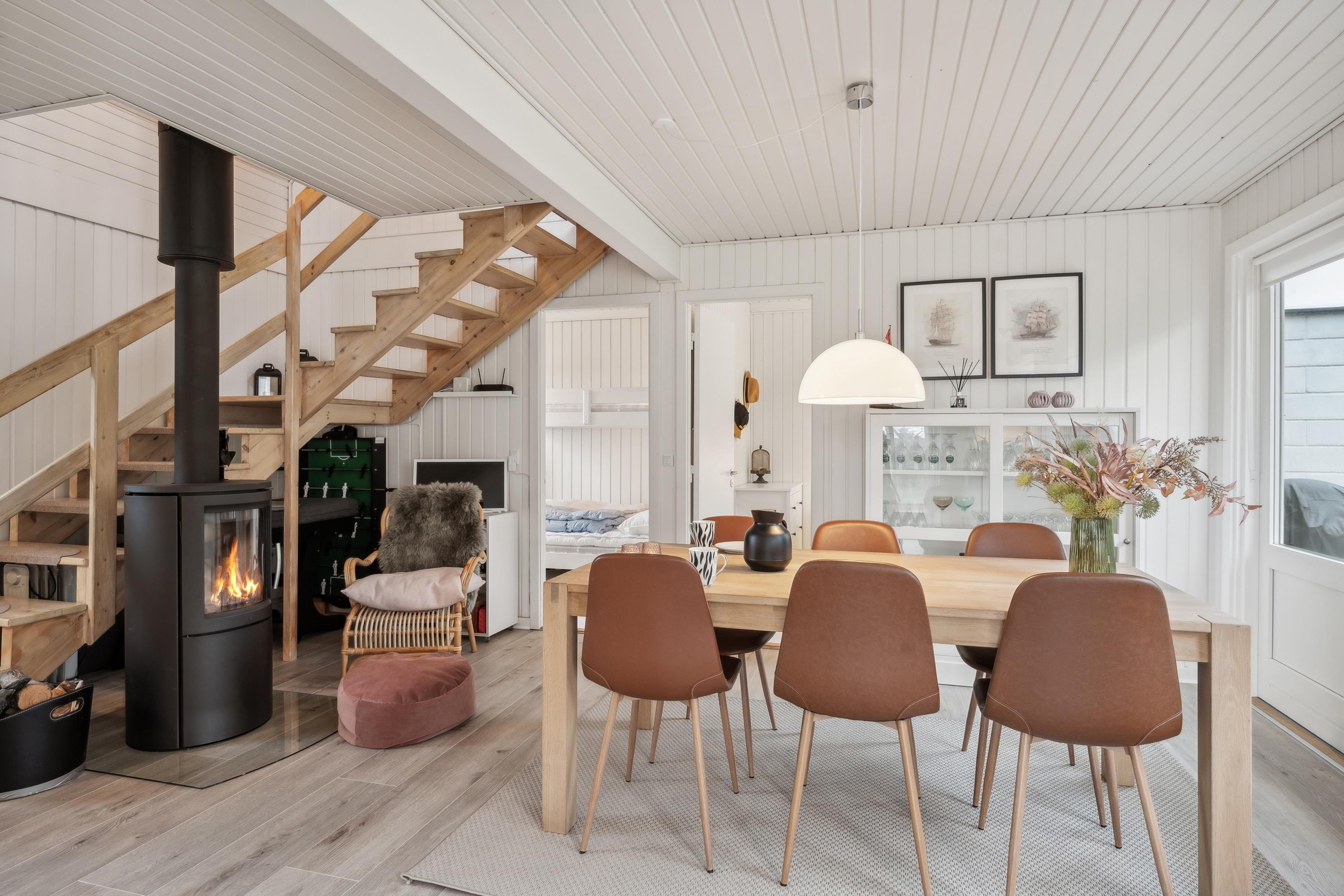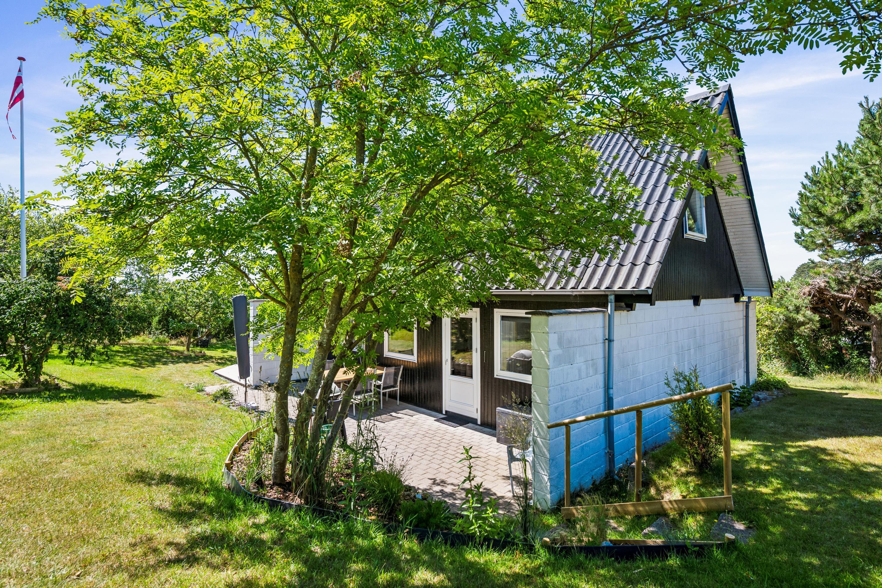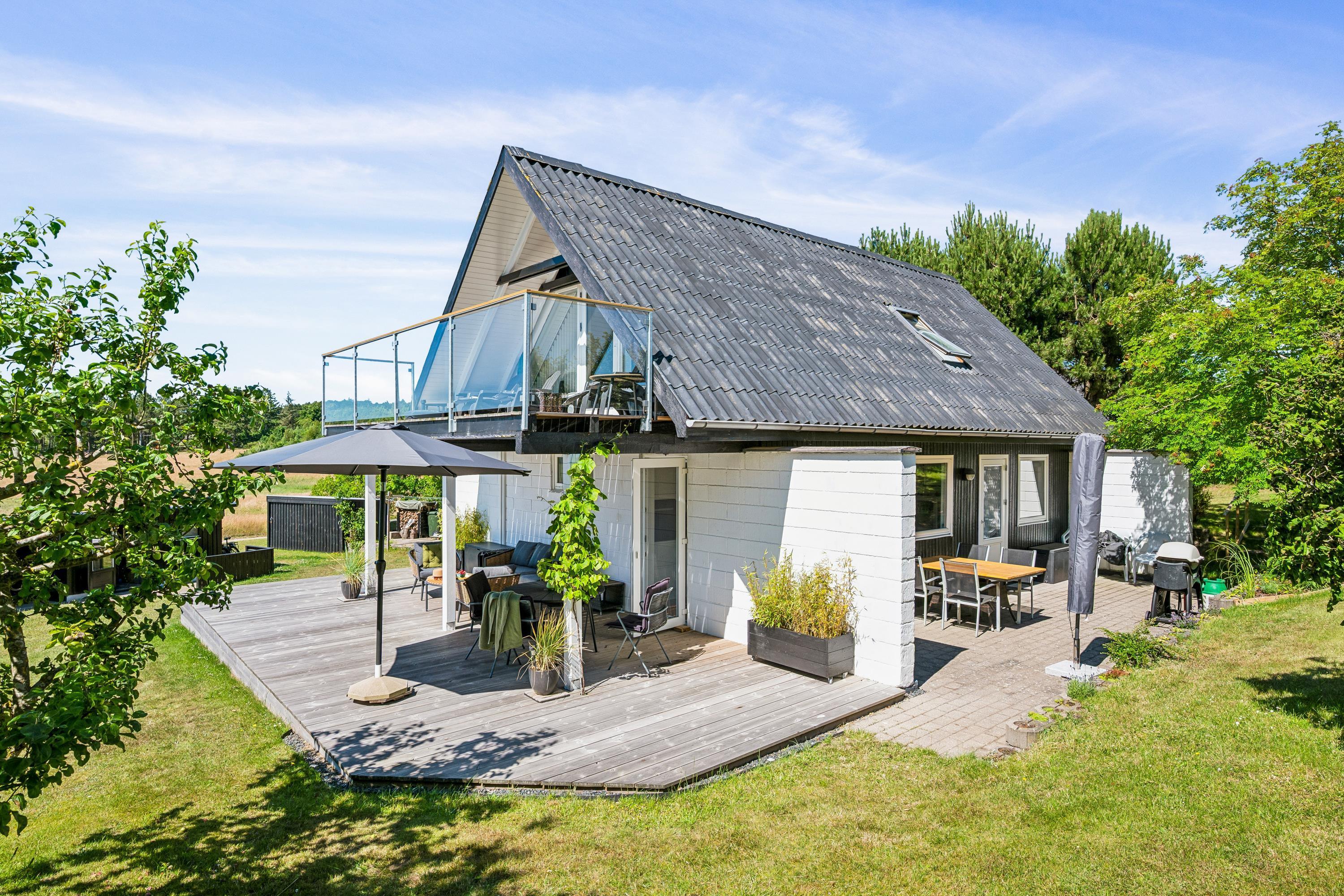 Nur 5 Minuten Fahrt von Ebeltoft entfernt finden Sie dieses schöne und gepflegte Ferienhaus auf zwei Etagen. Beim Betreten des Feirenhauses gelangen Sie in den Eingangsbereich mit Platz für Schuhe und Jacken sowie die Waschmaschine des Hauses. Die moderne Küche, ausgestattet u.a. mit einem Geschirrspüler, bietet direkten Zugang zu einer herrlichen, überdachten Terrasse mit Gartenmöbeln. Angrenzend an das Wohnzimmer befindet sich der gemütliche Essbereich, von dem aus eine weitere Terrasse zugänglich ist – ebenfalls mit Gartenmöbeln und Grill. Zwei komfortable Schlafzimmer mit Doppelbetten und ein schönes Badezimmer mit Dusche sind ebenfalls vorhanden. Vom Essbereich führt eine gute Treppe in die obere Etage, wo sich ein gemütliches und geschmackvoll eingerichtetes Wohnzimmer befindet. Von hier aus gelangen Sie auf eine herrliche Terrasse mit einem atemberaubenden Blick auf das Wasser. Auf der ersten Etage finden Sie zudem das letzte Schlafzimmer mit einem Doppelbett. Das Ferienhaus liegt auf einem schönen Grundstück mit großer Rasenfläche, ideal für Spiel und Outdoor-Aktivitäten.