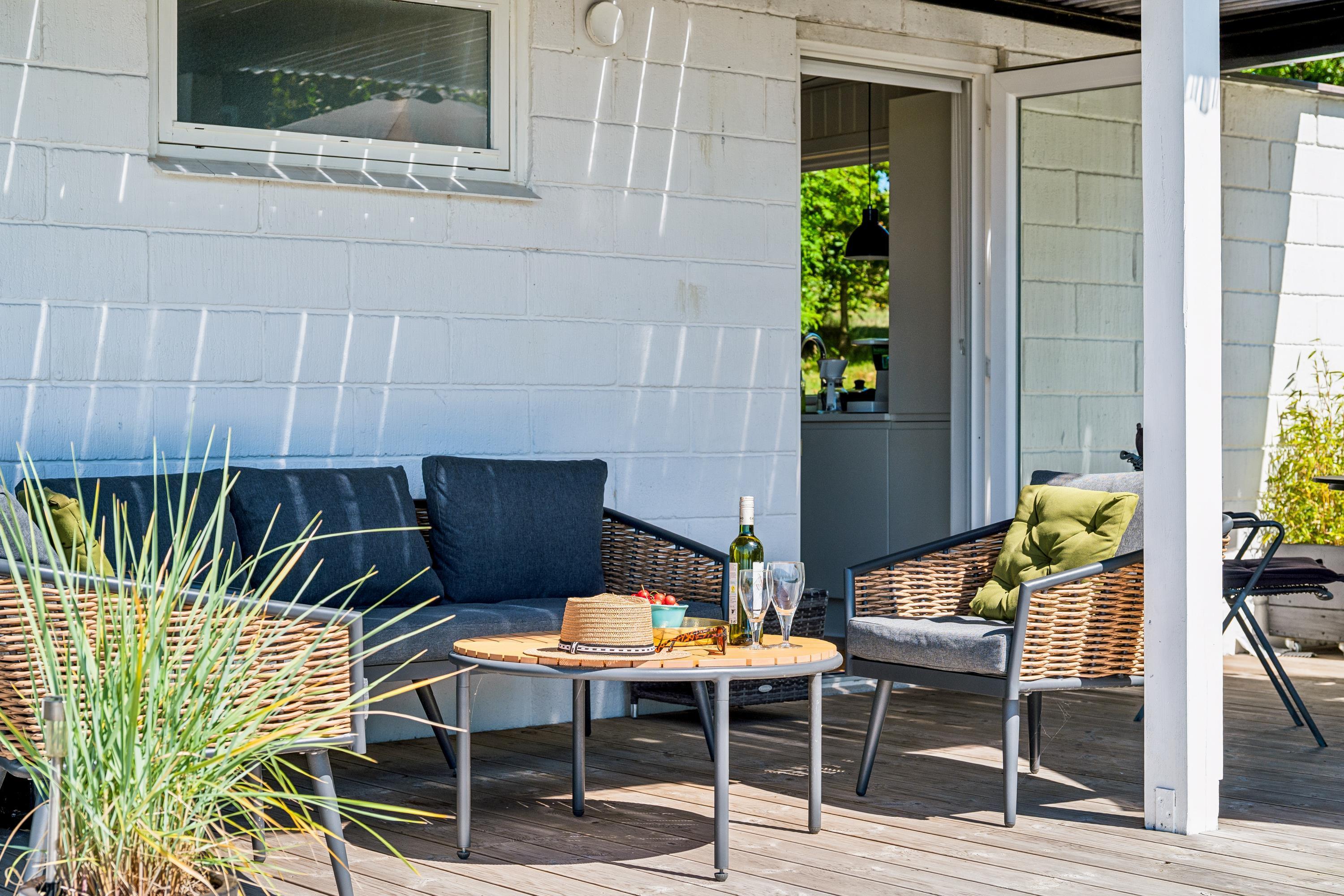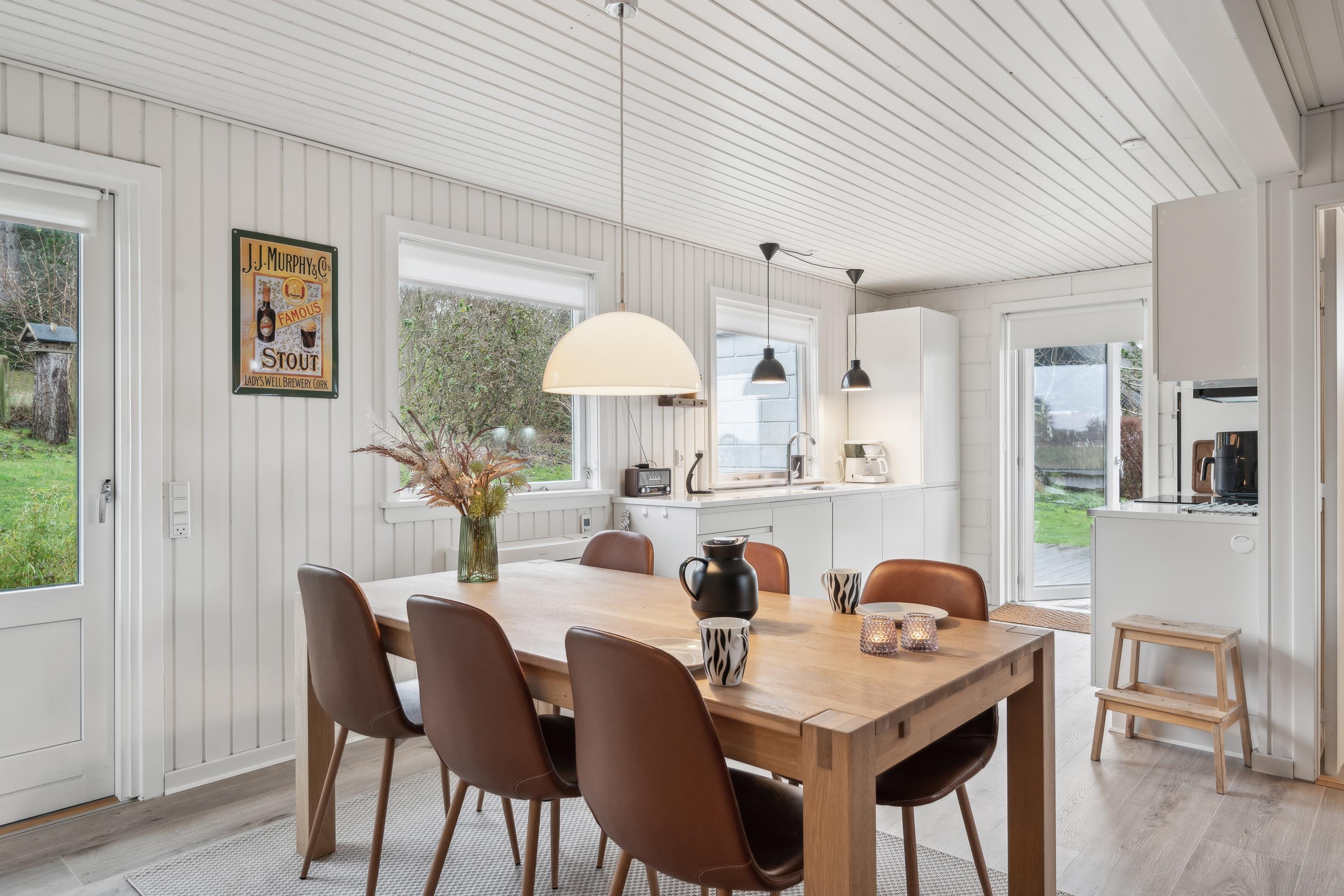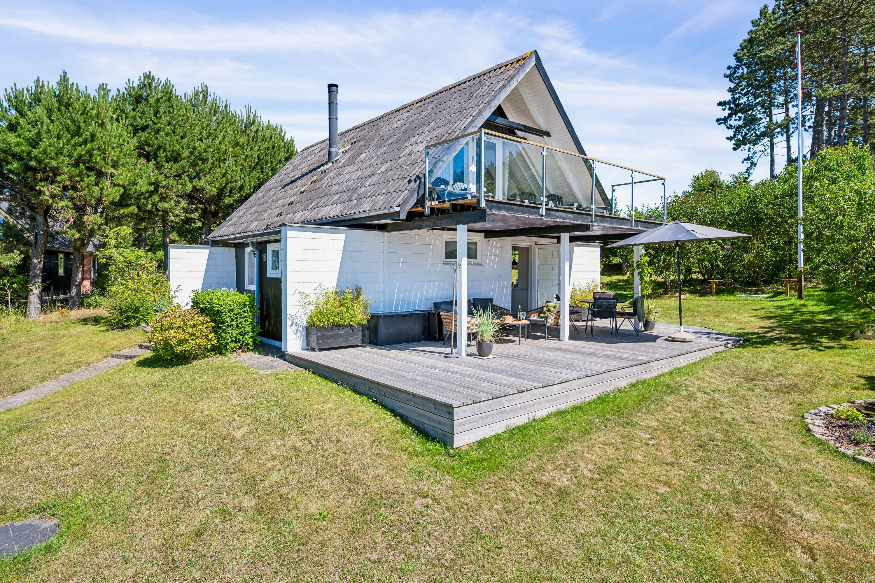 Nur 5 Minuten Fahrt von Ebeltoft entfernt finden Sie dieses schöne und gepflegte Ferienhaus auf zwei Etagen. Beim Betreten des Feirenhauses gelangen Sie in den Eingangsbereich mit Platz für Schuhe und Jacken sowie die Waschmaschine des Hauses. Die moderne Küche, ausgestattet u.a. mit einem Geschirrspüler, bietet direkten Zugang zu einer herrlichen, überdachten Terrasse mit Gartenmöbeln. Angrenzend an das Wohnzimmer befindet sich der gemütliche Essbereich, von dem aus eine weitere Terrasse zugänglich ist – ebenfalls mit Gartenmöbeln und Grill. Zwei komfortable Schlafzimmer mit Doppelbetten und ein schönes Badezimmer mit Dusche sind ebenfalls vorhanden. Vom Essbereich führt eine gute Treppe in die obere Etage, wo sich ein gemütliches und geschmackvoll eingerichtetes Wohnzimmer befindet. Von hier aus gelangen Sie auf eine herrliche Terrasse mit einem atemberaubenden Blick auf das Wasser. Auf der ersten Etage finden Sie zudem das letzte Schlafzimmer mit einem Doppelbett. Das Ferienhaus liegt auf einem schönen Grundstück mit großer Rasenfläche, ideal für Spiel und Outdoor-Aktivitäten.