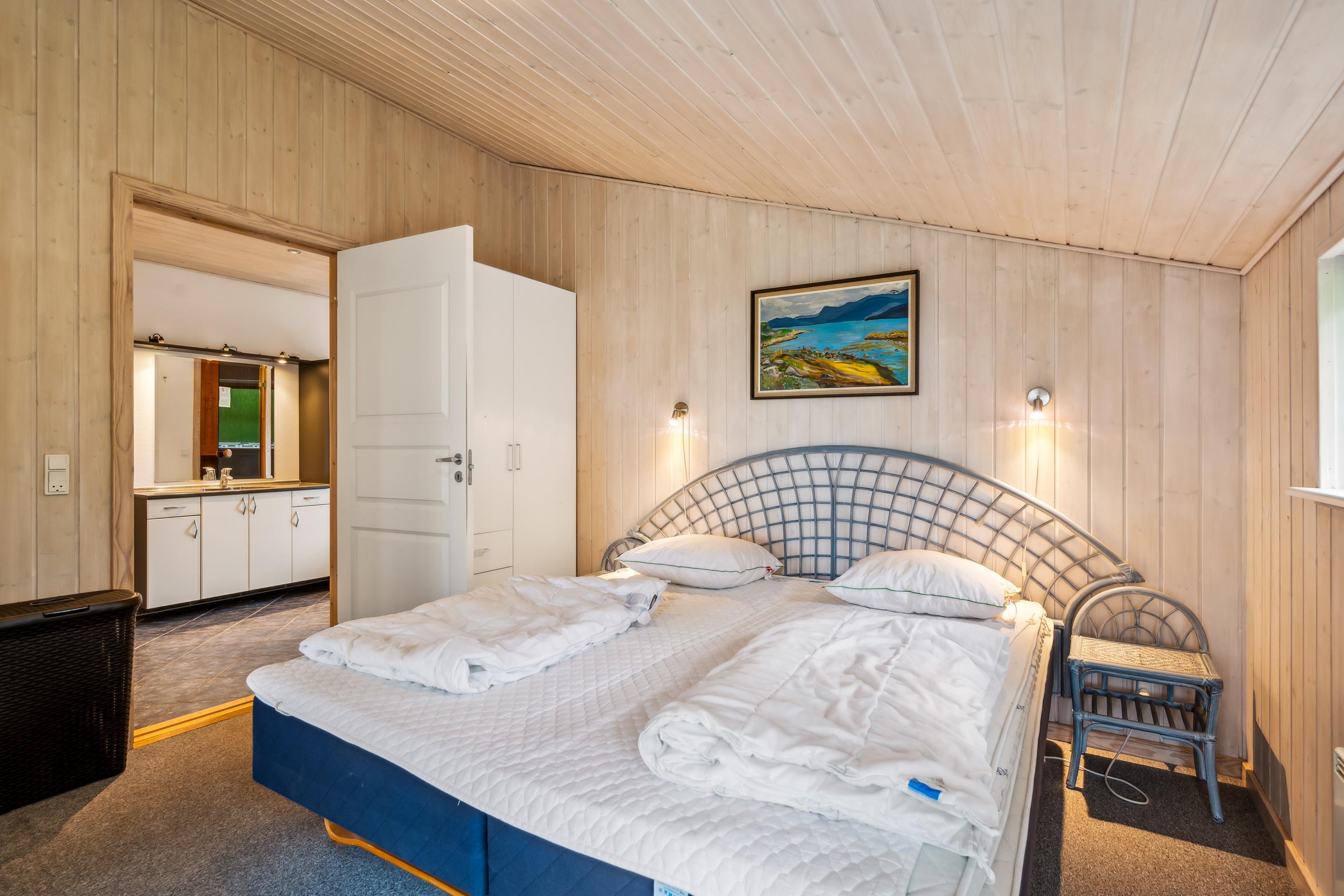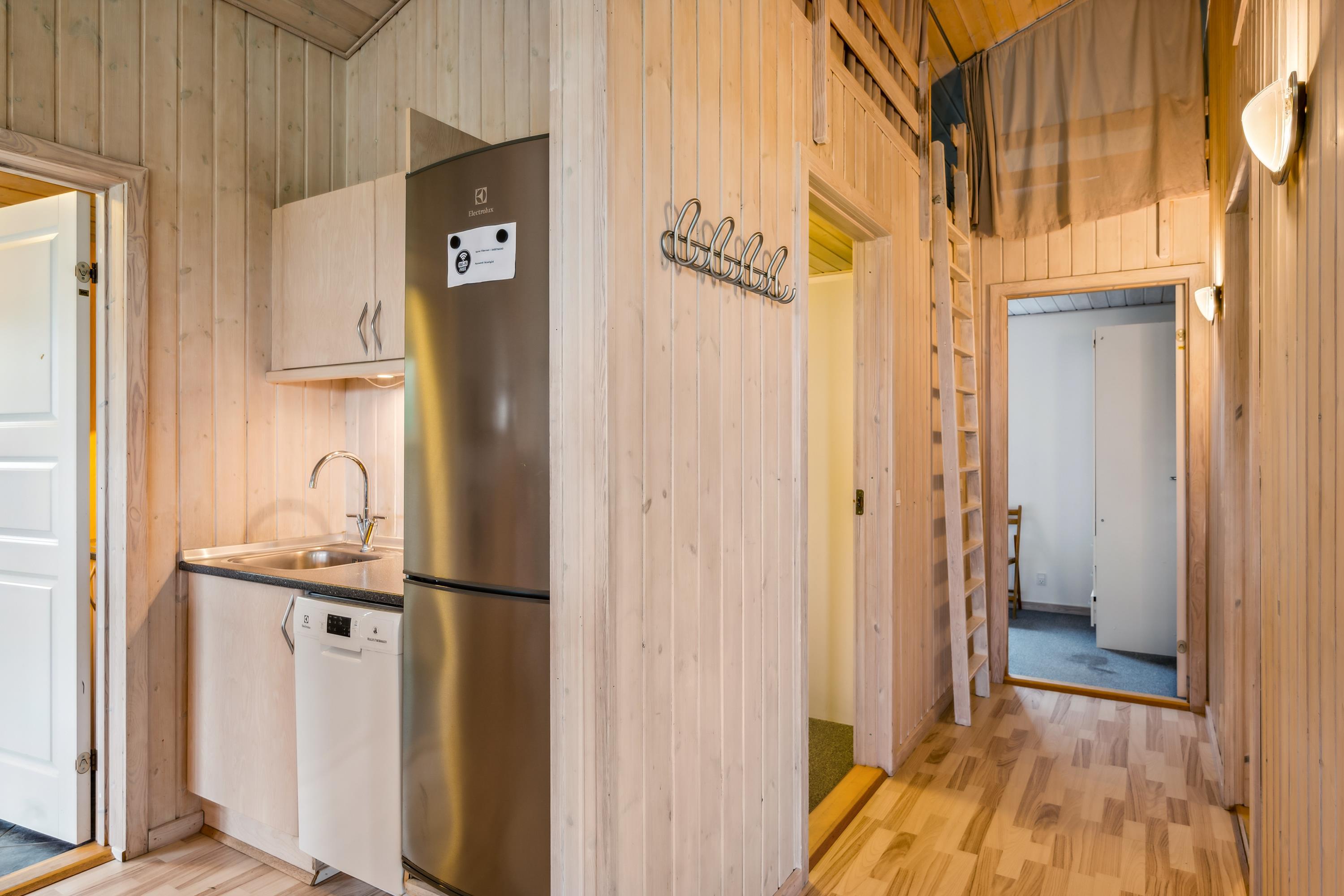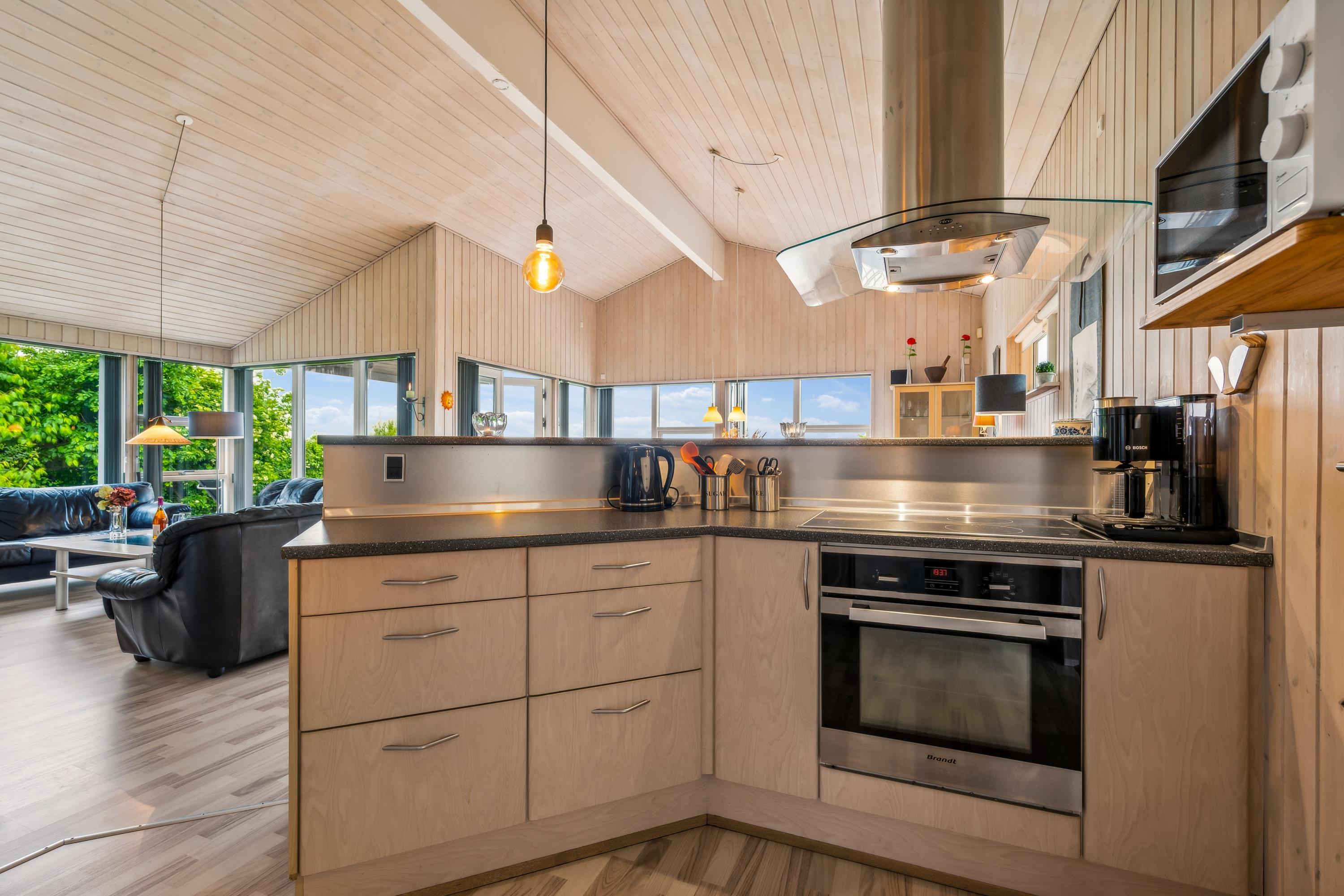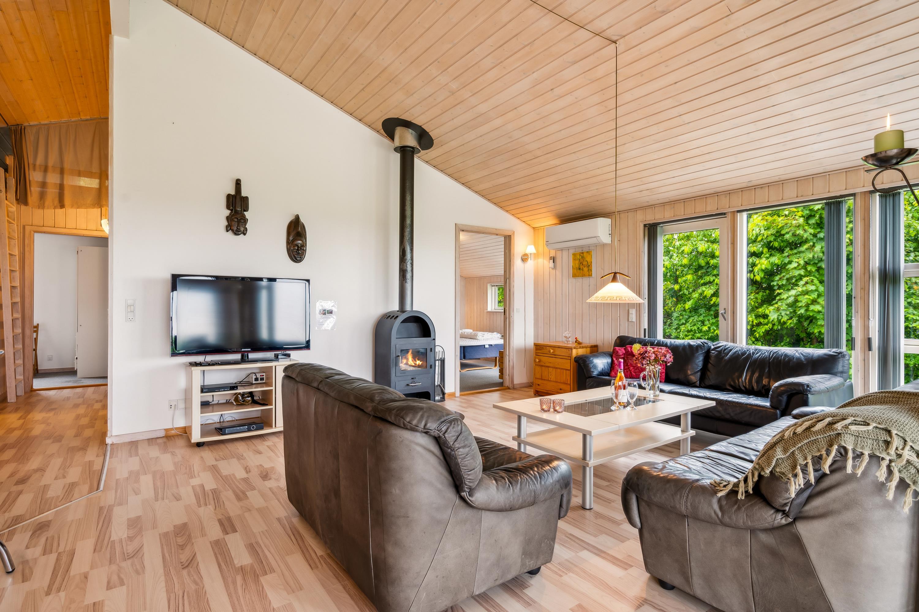 Das Haus präsentiert sich überall hell und freundlich mit bis zum Dachfirst offener Bauweise und gutem Lichteinfall. Großes Wohnzimmer mit Panoramafenstern, Zugang zur Terrasse, Kaminofen, bequemer Sitzecke, TV mit dänischen (inkl. TV2) sowie Essplatz für acht Personen. In offener Verbindung dazu liegt die neuere Küche mit Glaskeramik-Kochfeld, Backofen, Kühl-/Gefrierkombination, Geschirrspüler und Mikrowelle. Die acht Schlafplätze verteilen sich auf zwei große Zimmer mit Doppelbett, ein kleineres Zimmer mit Einzelbett und Etagenbett sowie einen großen Hängeboden mit Doppelbett und Einzelbett. Schickes Badezimmer mit Dusche, Whirlpool und Sauna. Fußbodenheizung in allen Nassräumen. In einem separaten Raum neben der Küche stehen eine Waschmaschine und ein Trockner. Internetzugang.