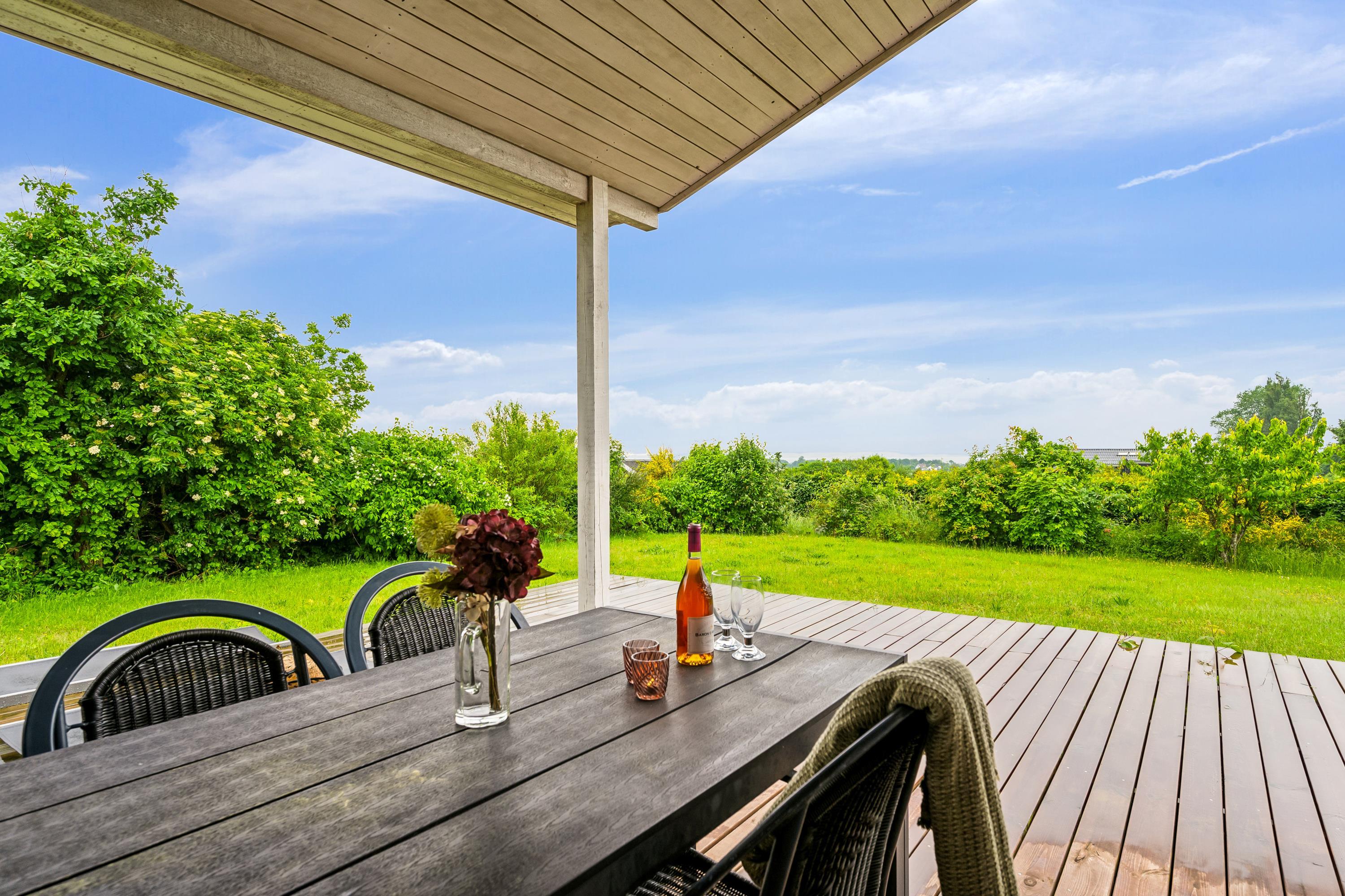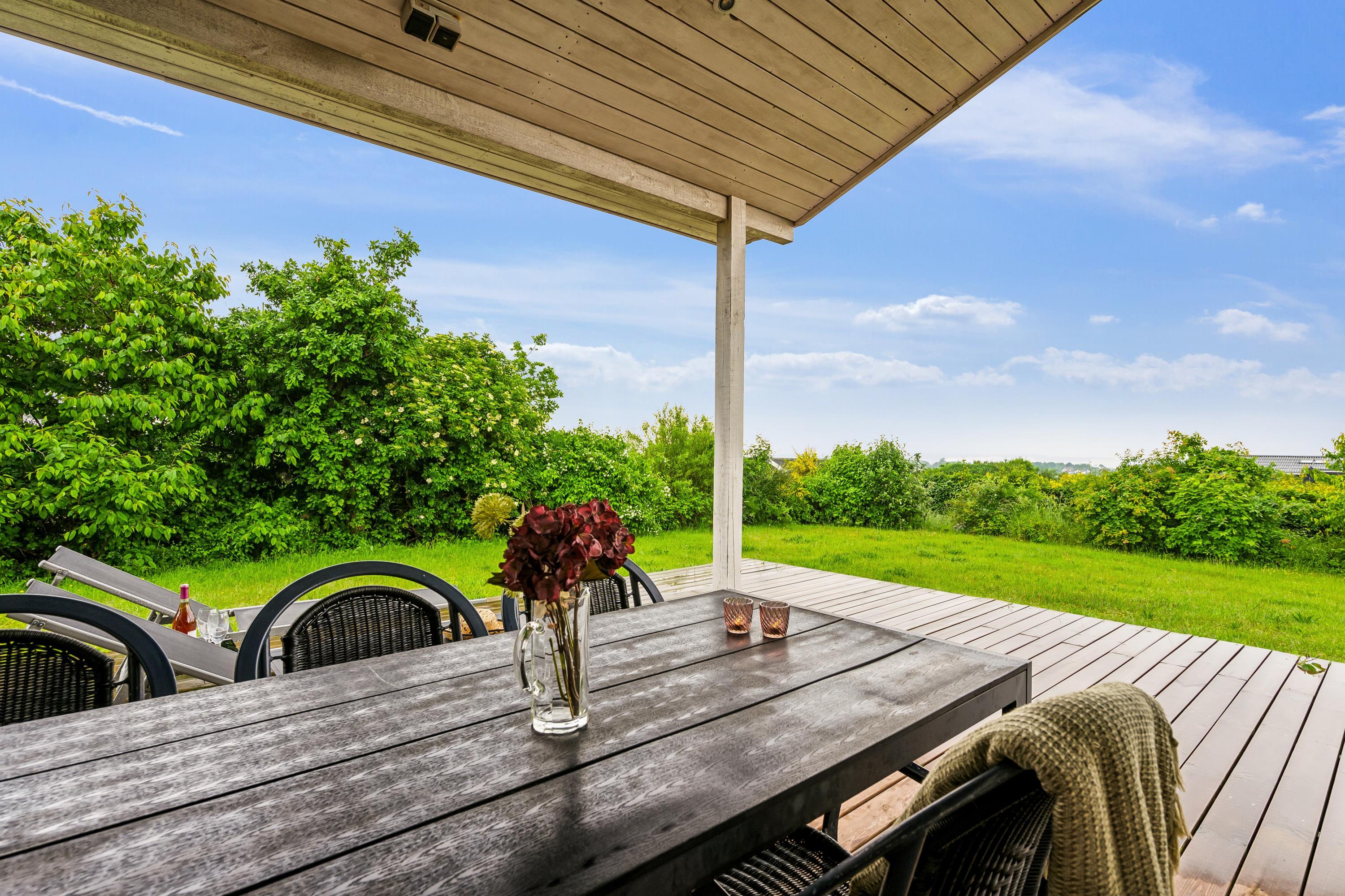 Dieses geräumige und gut eingerichtete Ferienhaus mit Platz für acht Personen liegt auf einem abschüssigen Naturgrundstück mit herrlichem Blick auf das Kattegat und die Landschaft bei Øer. Große, nach Westen gewandte und teilweise überdachte Holzterrasse mit Gartenmöbeln, Liegestühlen, Sonnenschirm und Grill.