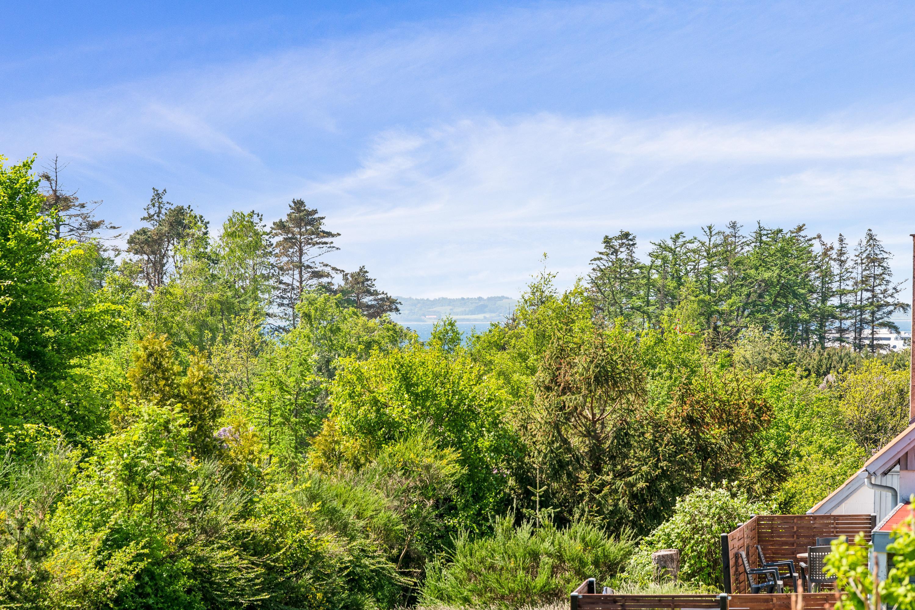 Gemütliches Ferienhaus nahe Ebeltoft mit Terrasse, Garten, Kaminofen und Blick auf die idyllische Landschaft.
