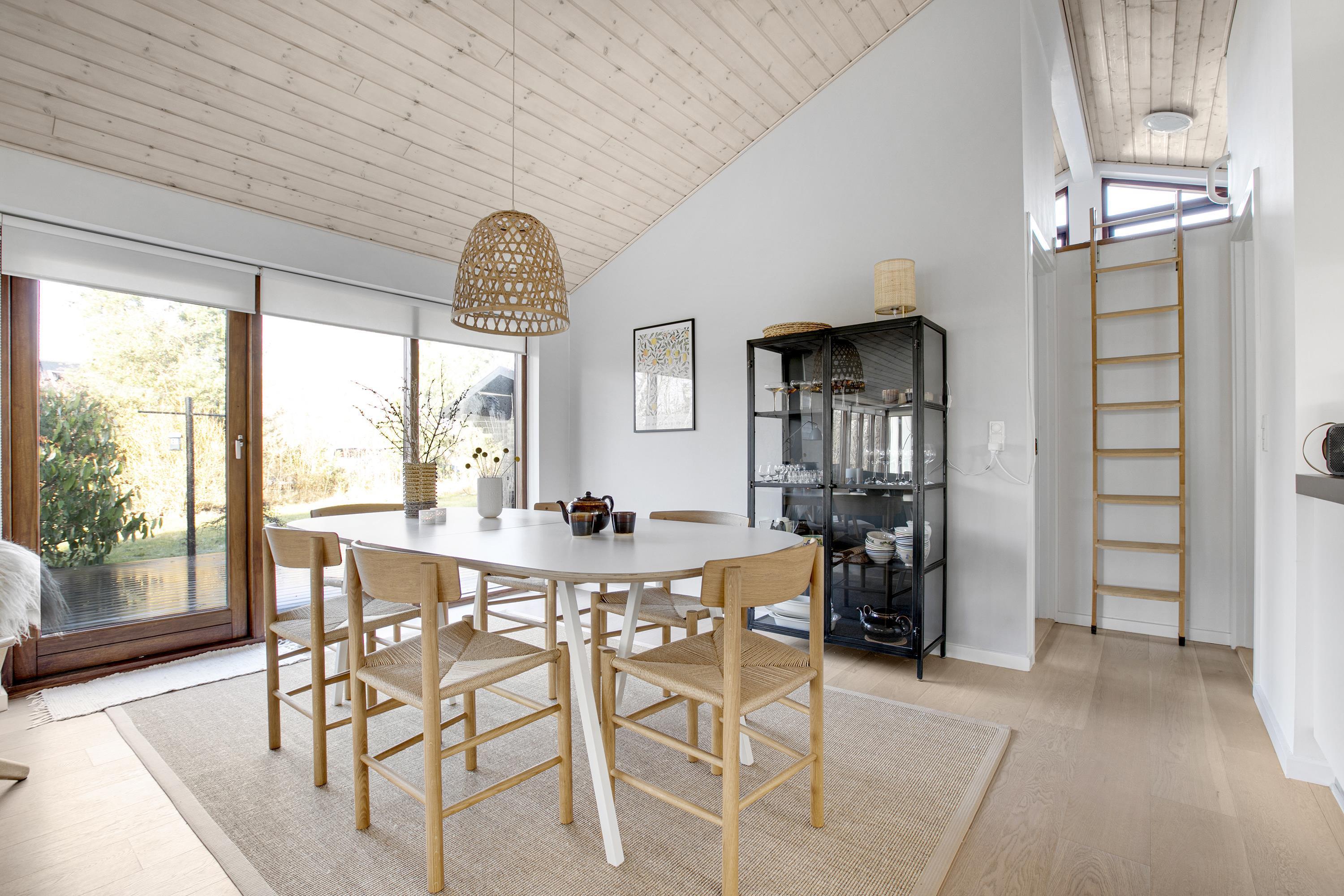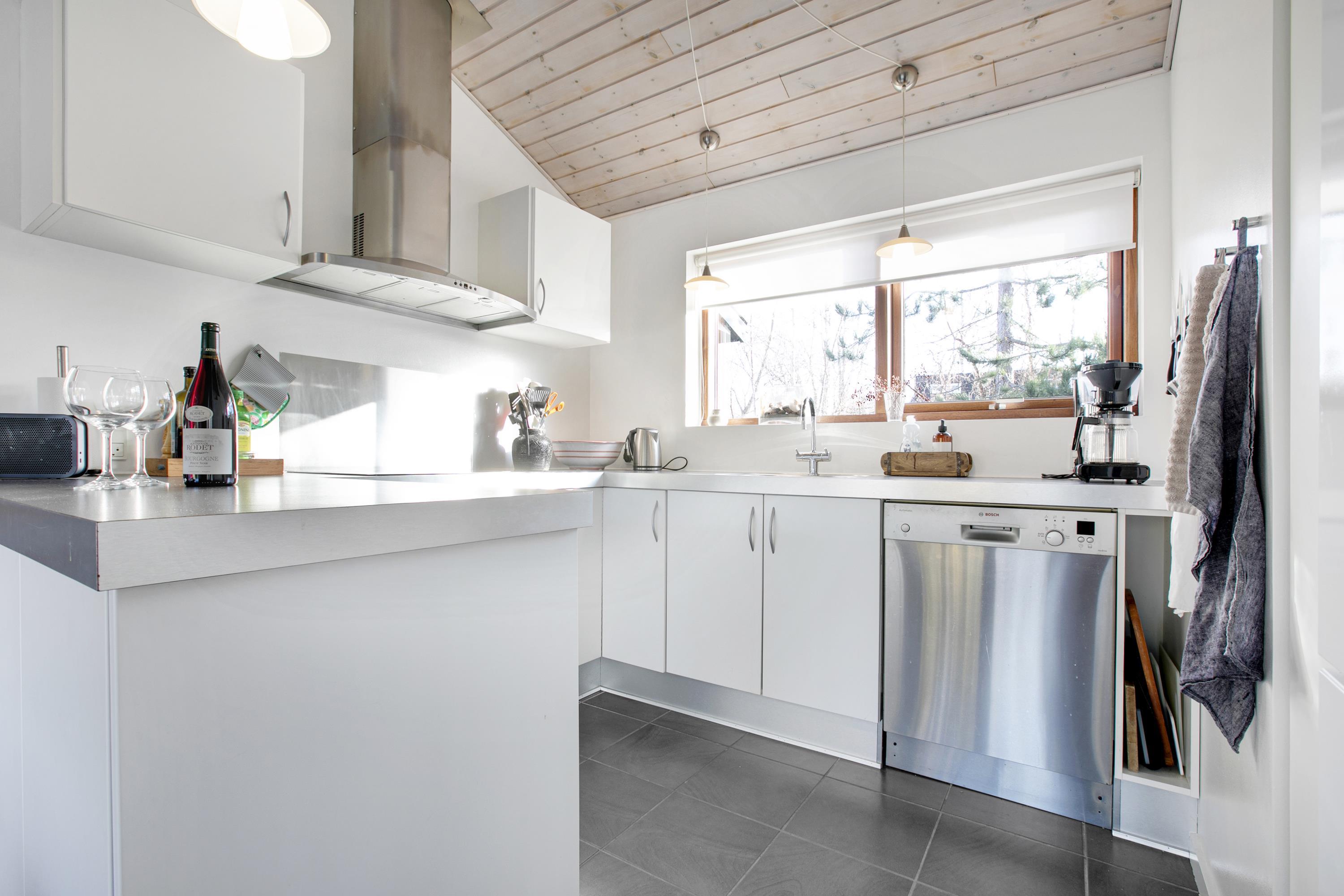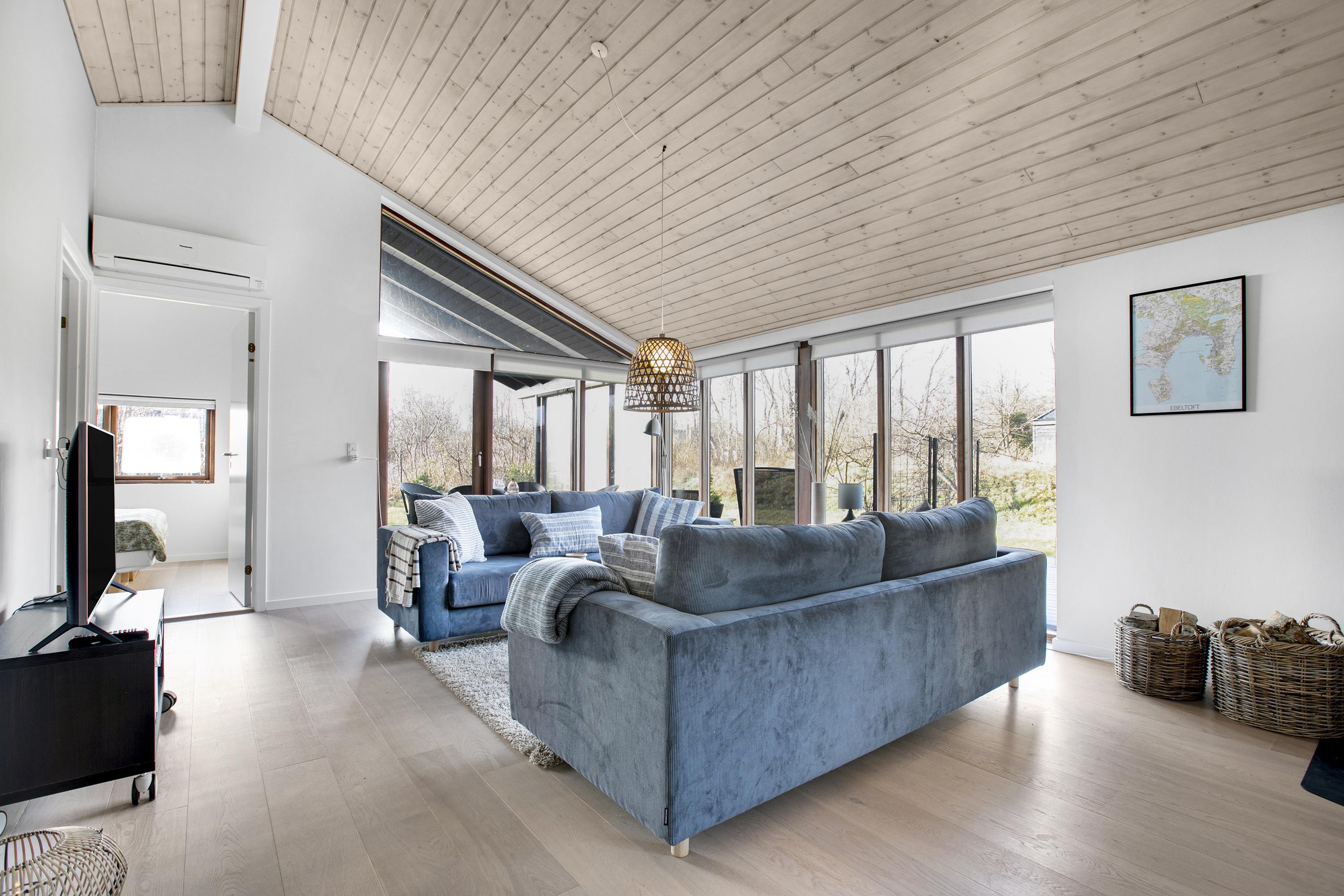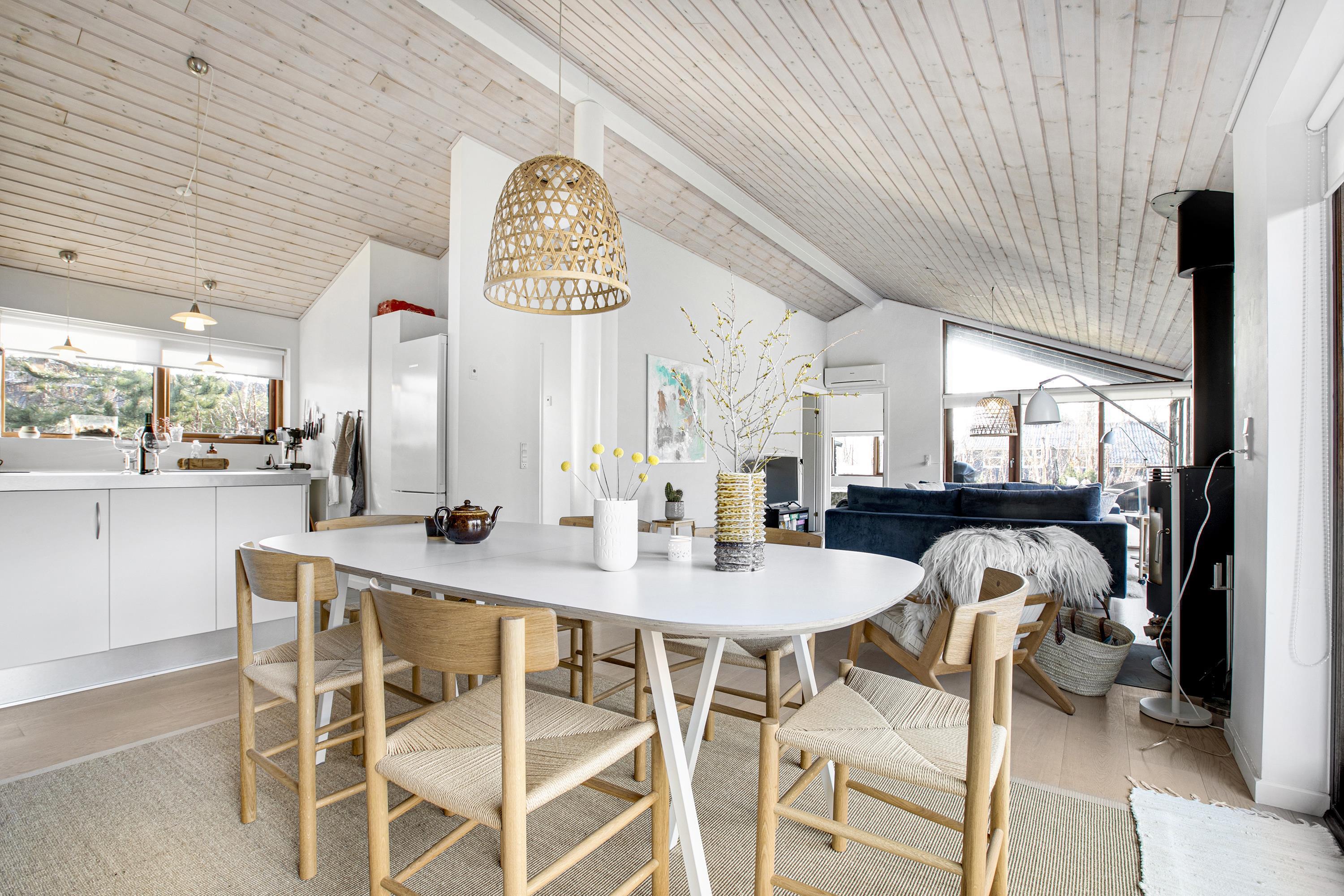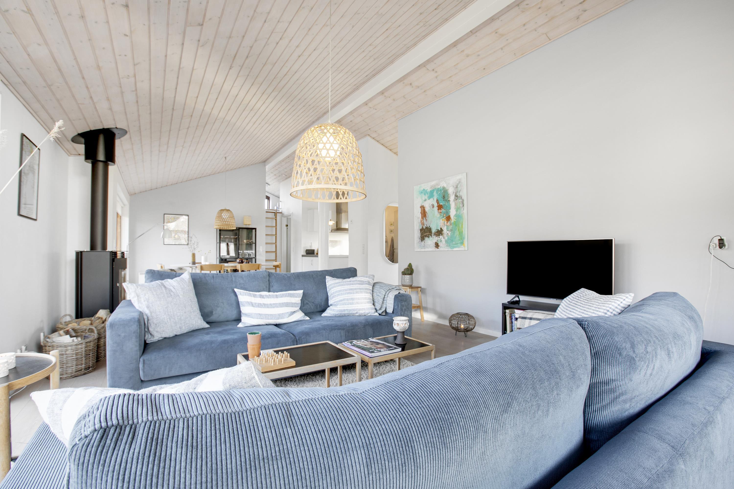 Helles und schönes Wohnzimmer in offener Verbindung mit Küche und mit Zugang zur Terrasse. Hier, wie im Rest des Hauses, ist es mit abgeschrägten Decken und mit Holzofen, Essecke für 6 Personen, schönen Sofamöbeln und Fernseher mit Chromecast ausgestattet. Neue, gut ausgestattete Küche mit Cerankochfeld und Backofen, Kühlschrank mit Gefrierfach, Geschirrspüler und Mikrowelle. Das Haus ist für 6 Personen und die Schlafplätze verteilen sich auf 3 schönen Doppelzimmern. Großes, schönes Badezimmer mit Schrankeinrichtung und Dusche und Sauna sowie ein etwas kleineres Badezimmer mit Dusche, beide Nassräume mit Fußbodenheizung. Im kleinen Hauswirtschaftsraum mit Zugang von der Terrasse finden Sie Waschmaschine und Trockner, und für die kleinsten Gäste gibt es einen Hochstuhl. Das Haus hat eine Wärmepumpe. Internetzugang.