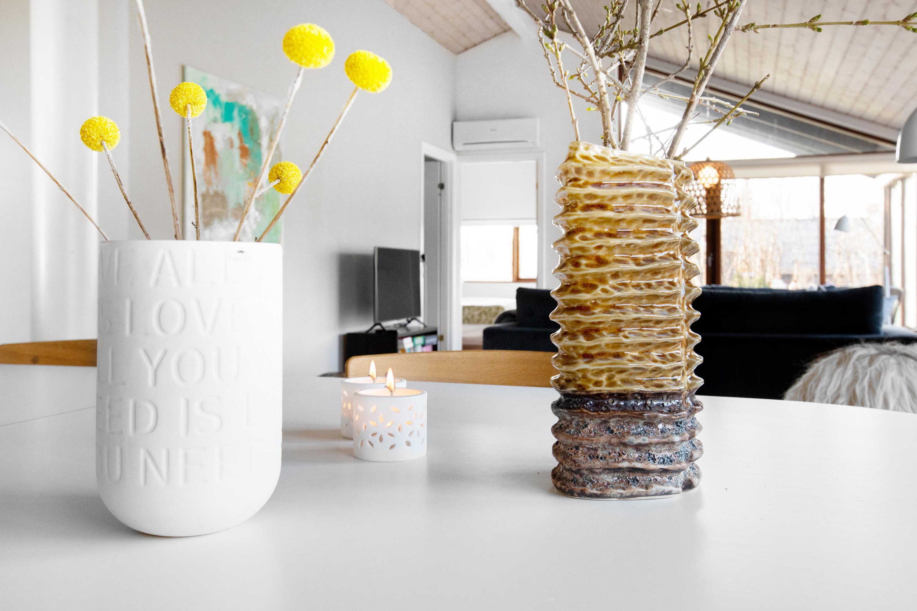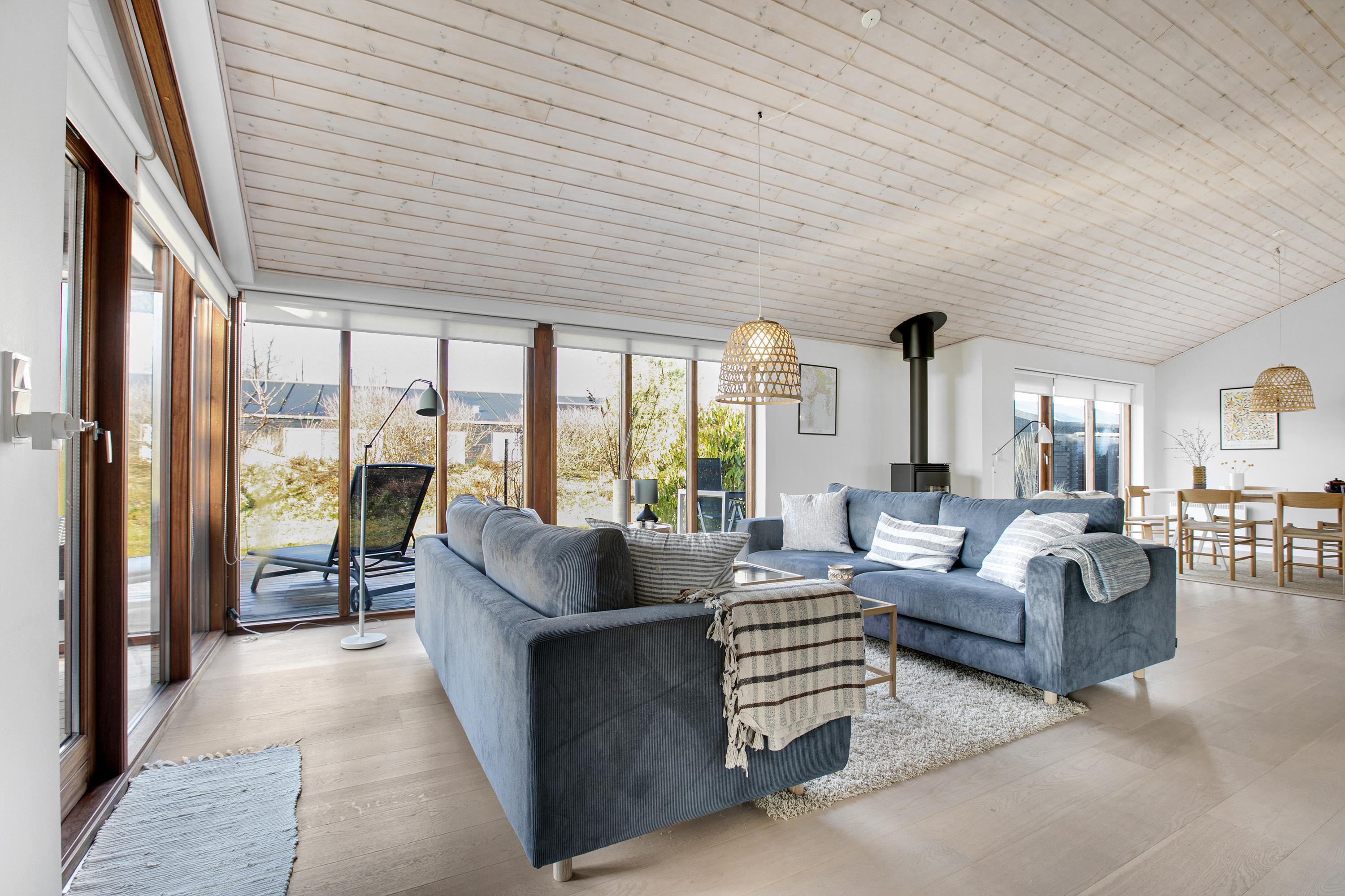 Neueres und außergewöhnlich gepflegtes, geräumiges Ferienhaus auf einem Naturgrundstück bei Øer in kurzer Entfernung von Sanddünen und kinderfreundlichem Strand. Ein helles und sehr geschmackvoll eingerichtetes Haus, das von einer großen, nach Südwesten ausgerichteten, teilweise überdachten Holz-/Fliesenterrasse mit Gartenmöbeln, Sonnenliegen, Sonnenschirm und Grill umgeben ist, auf der Sie von morgens bis abends die Sonne genießen können. Auf dem Grundstück befindet sich auch ein abschließbarer Schuppen.