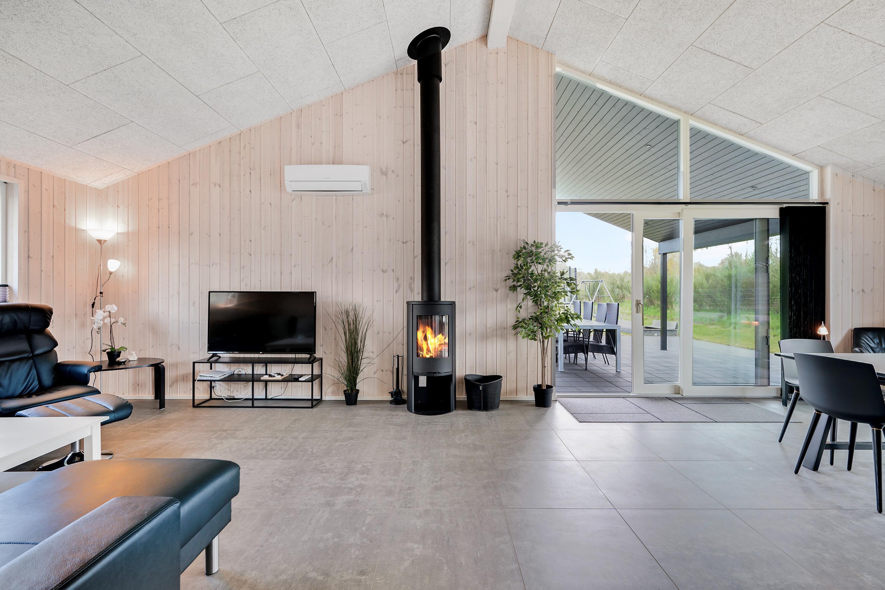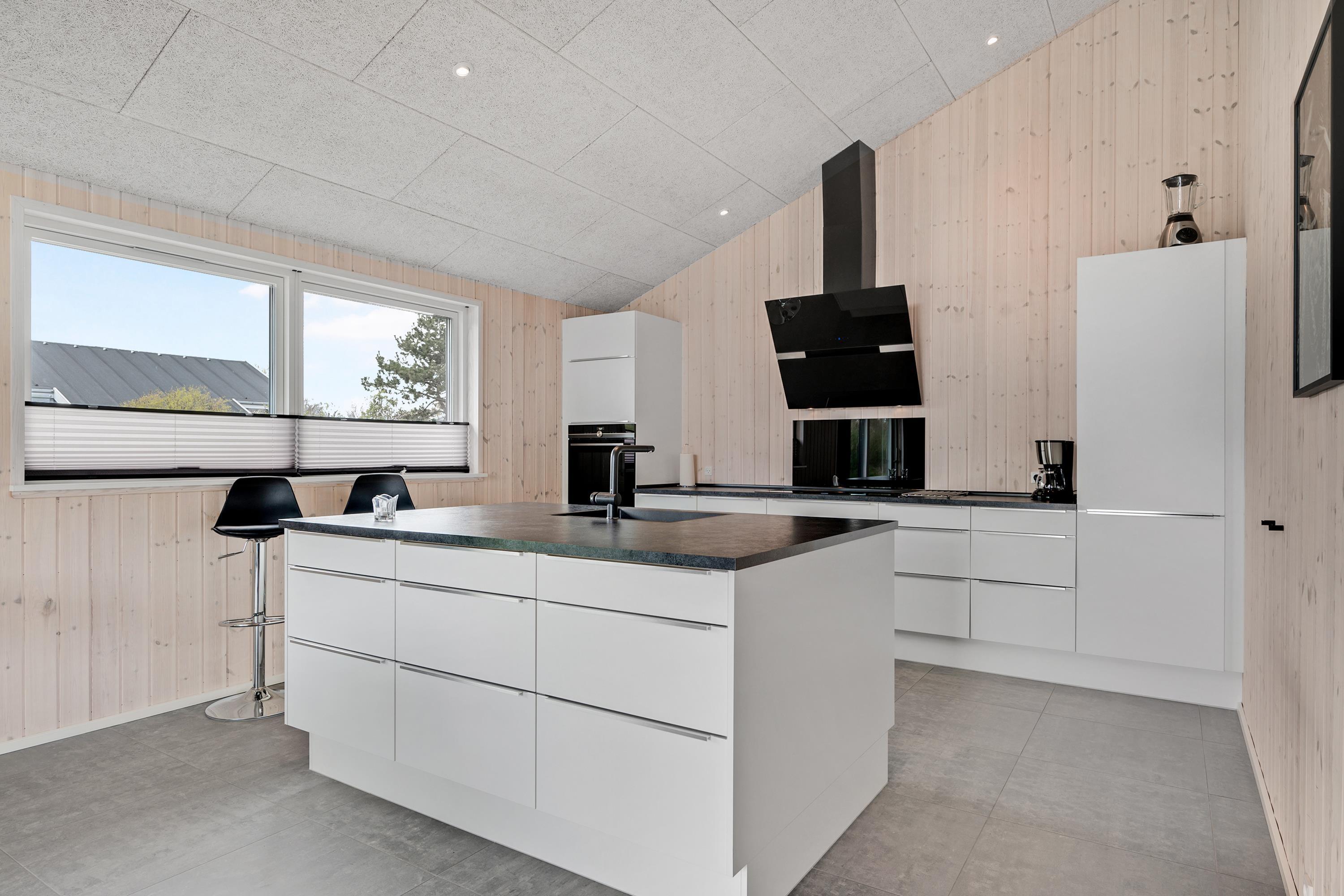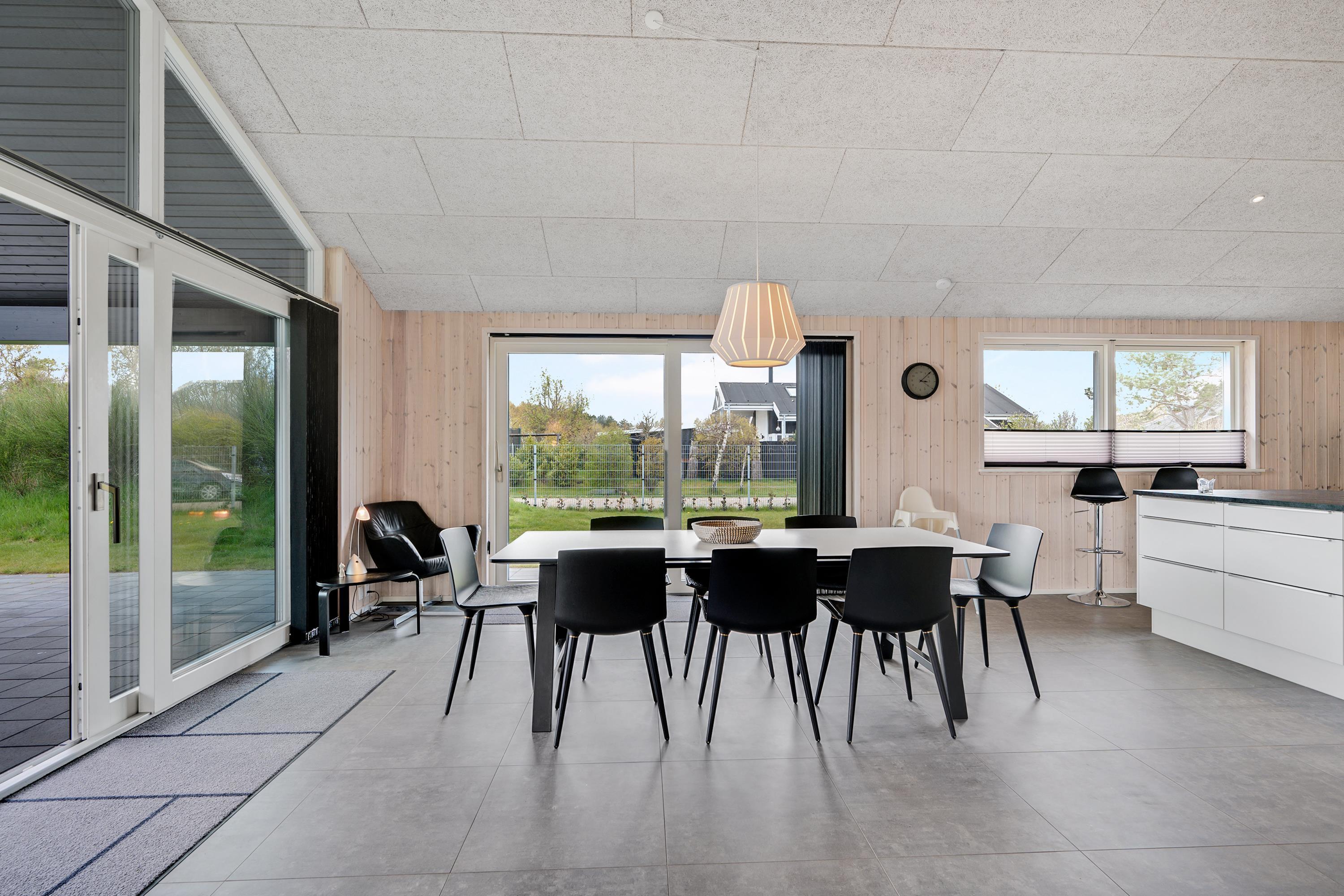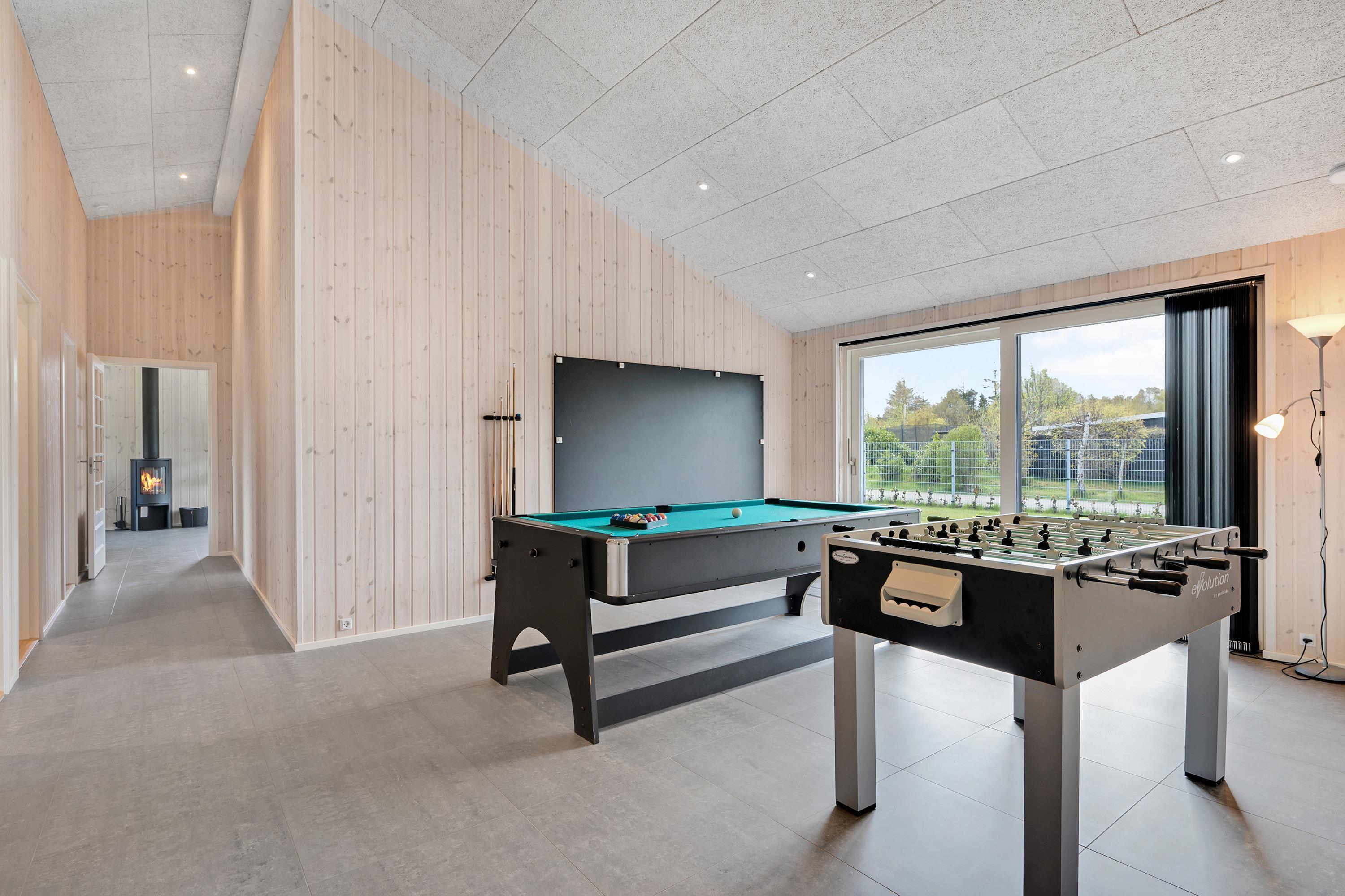 Die bis zum Dachfirst hin offene Bauweise sorgt für ein großzügiges und helles Raumgefühl. Das große Wohnzimmer mit Panoramafenstern und Zugang zur Terrasse liegt in offener Verbindung zur Küche. Es ist mit Essplatz für acht Personen, Kaminofen, schönem Sofabereich und TV mit dänischen (inkl. TV2) und deutschen Programmen ausgestattet. Schicke und gut eingerichtete Küche mit Induktionskochfeld, Backofen, Kühl-/Gefrierkombination, Geschirrspüler und Mikrowelle. Großer Aktivitäts-/Mehrzweckraum mit Billardtisch und Tischfußballspiel. Die acht Schlafplätze verteilen sich auf vier schöne, helle Schlafzimmer– zwei mit Doppelbett und zwei mit jeweils zwei Einzelbetten. Schickes, großes Badezimmer mit Dusche, Whirlpool und Sauna sowie ein etwas kleineres Badezimmer mit Dusche. Beide sind mit Fußbodenheizung ausgestattet. Im großen Eingangsbereich stehen eine Waschmaschine und ein Trockner. Internetzugang.
