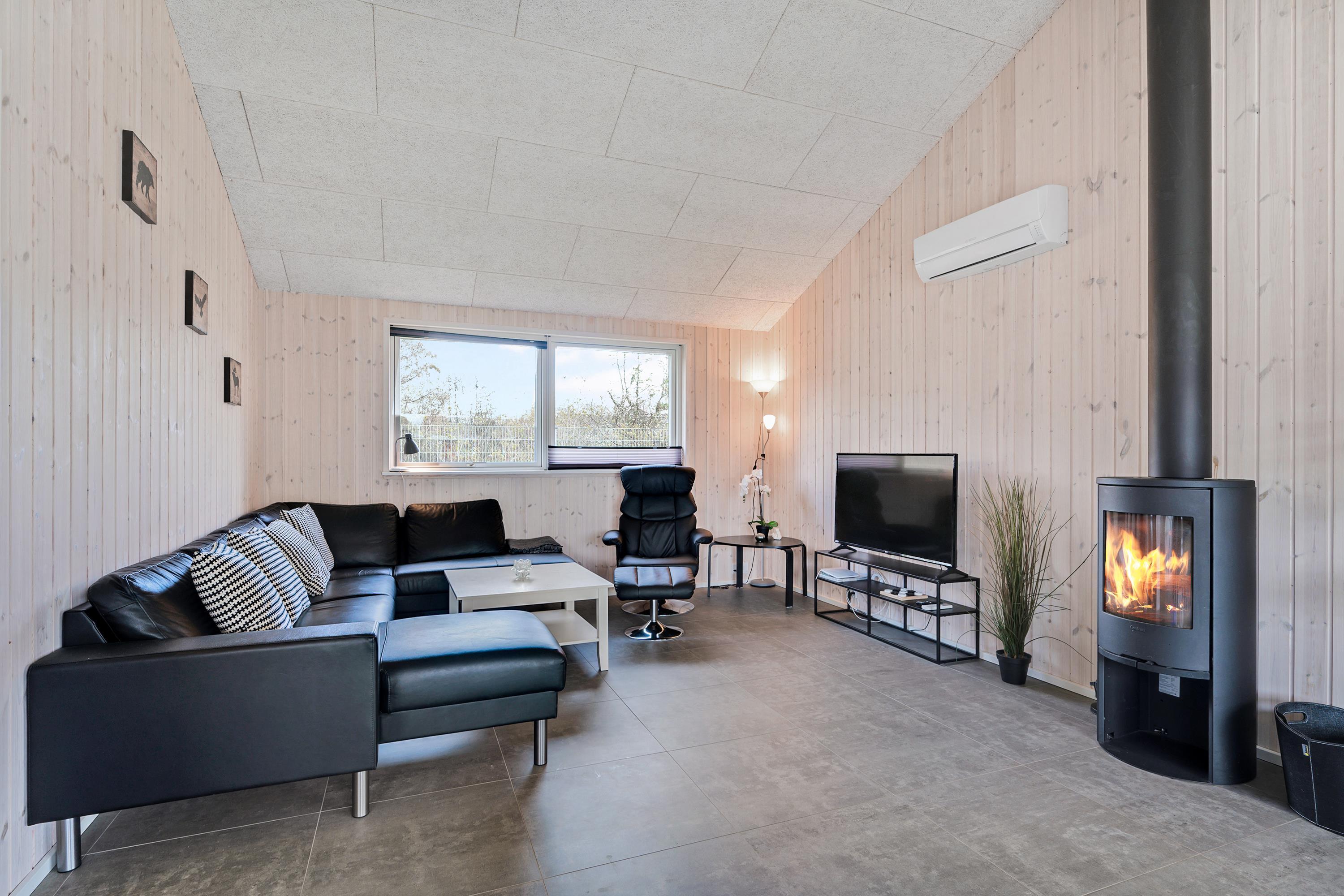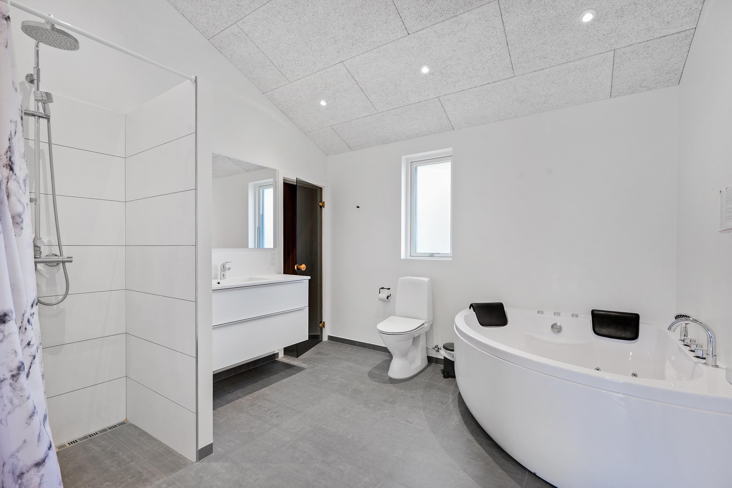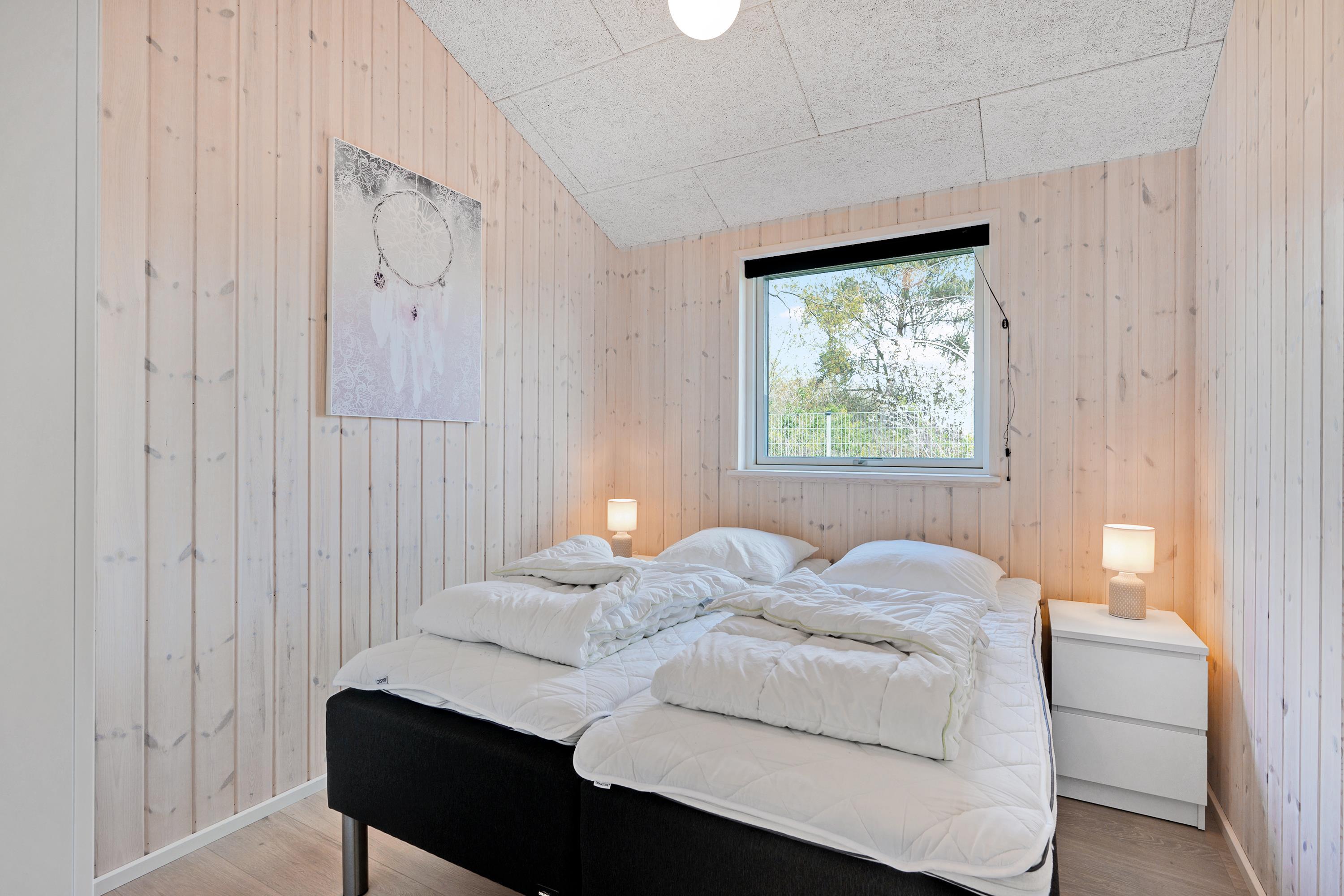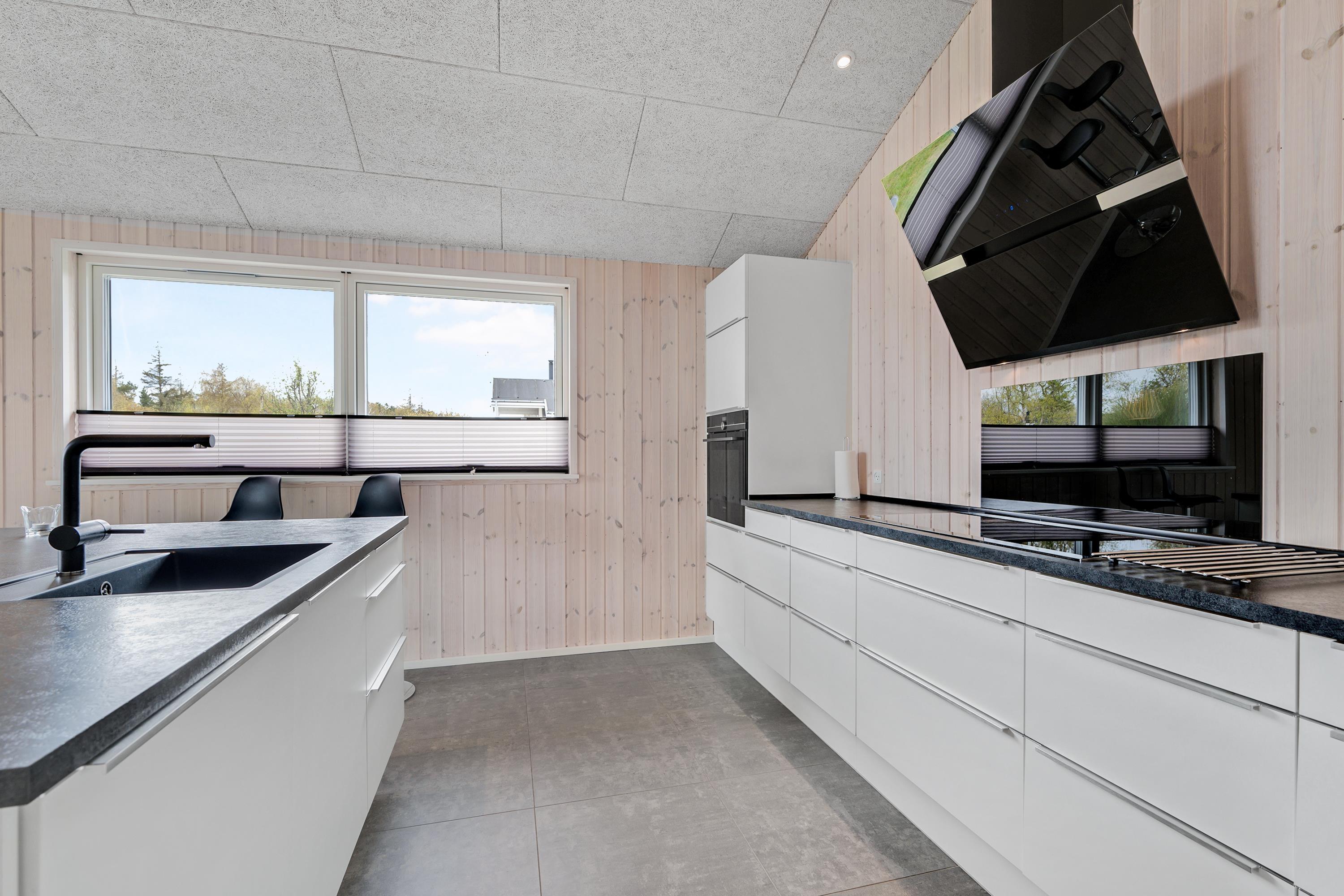 Die bis zum Dachfirst hin offene Bauweise sorgt für ein großzügiges und helles Raumgefühl. Das große Wohnzimmer mit Panoramafenstern und Zugang zur Terrasse liegt in offener Verbindung zur Küche. Es ist mit Essplatz für acht Personen, Kaminofen, schönem Sofabereich und TV mit dänischen (inkl. TV2) und deutschen Programmen ausgestattet. Schicke und gut eingerichtete Küche mit Induktionskochfeld, Backofen, Kühl-/Gefrierkombination, Geschirrspüler und Mikrowelle. Großer Aktivitäts-/Mehrzweckraum mit Billardtisch und Tischfußballspiel. Die acht Schlafplätze verteilen sich auf vier schöne, helle Schlafzimmer– zwei mit Doppelbett und zwei mit jeweils zwei Einzelbetten. Schickes, großes Badezimmer mit Dusche, Whirlpool und Sauna sowie ein etwas kleineres Badezimmer mit Dusche. Beide sind mit Fußbodenheizung ausgestattet. Im großen Eingangsbereich stehen eine Waschmaschine und ein Trockner. Internetzugang.