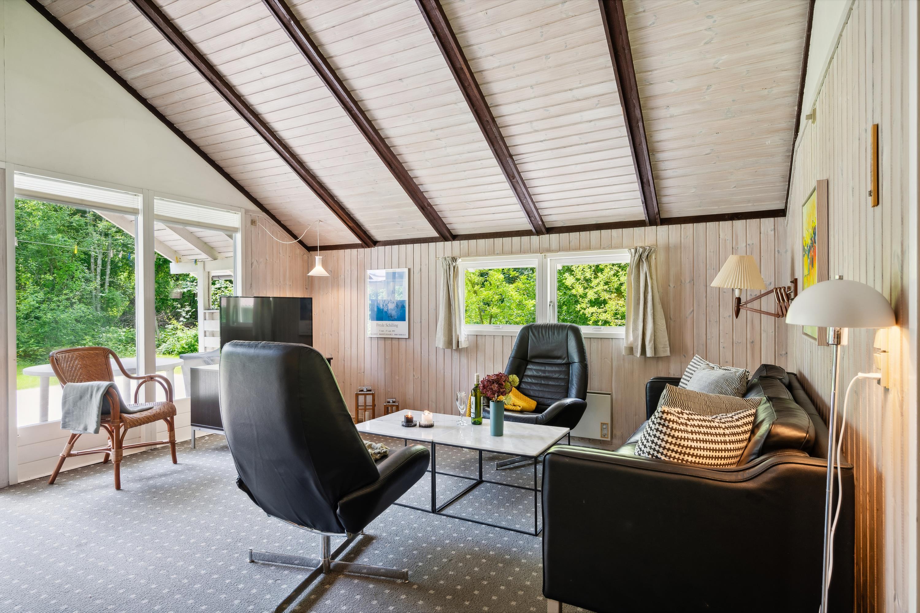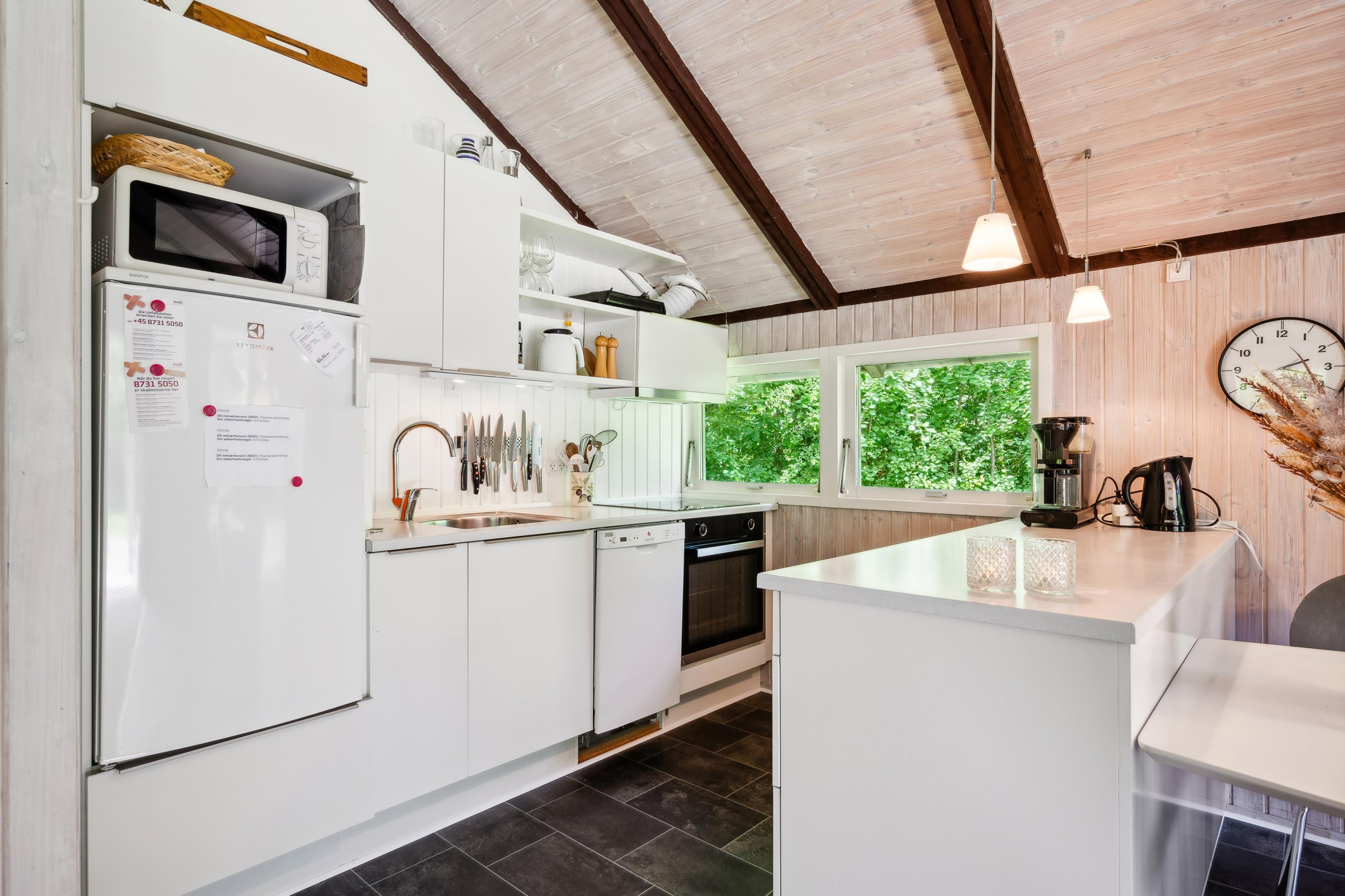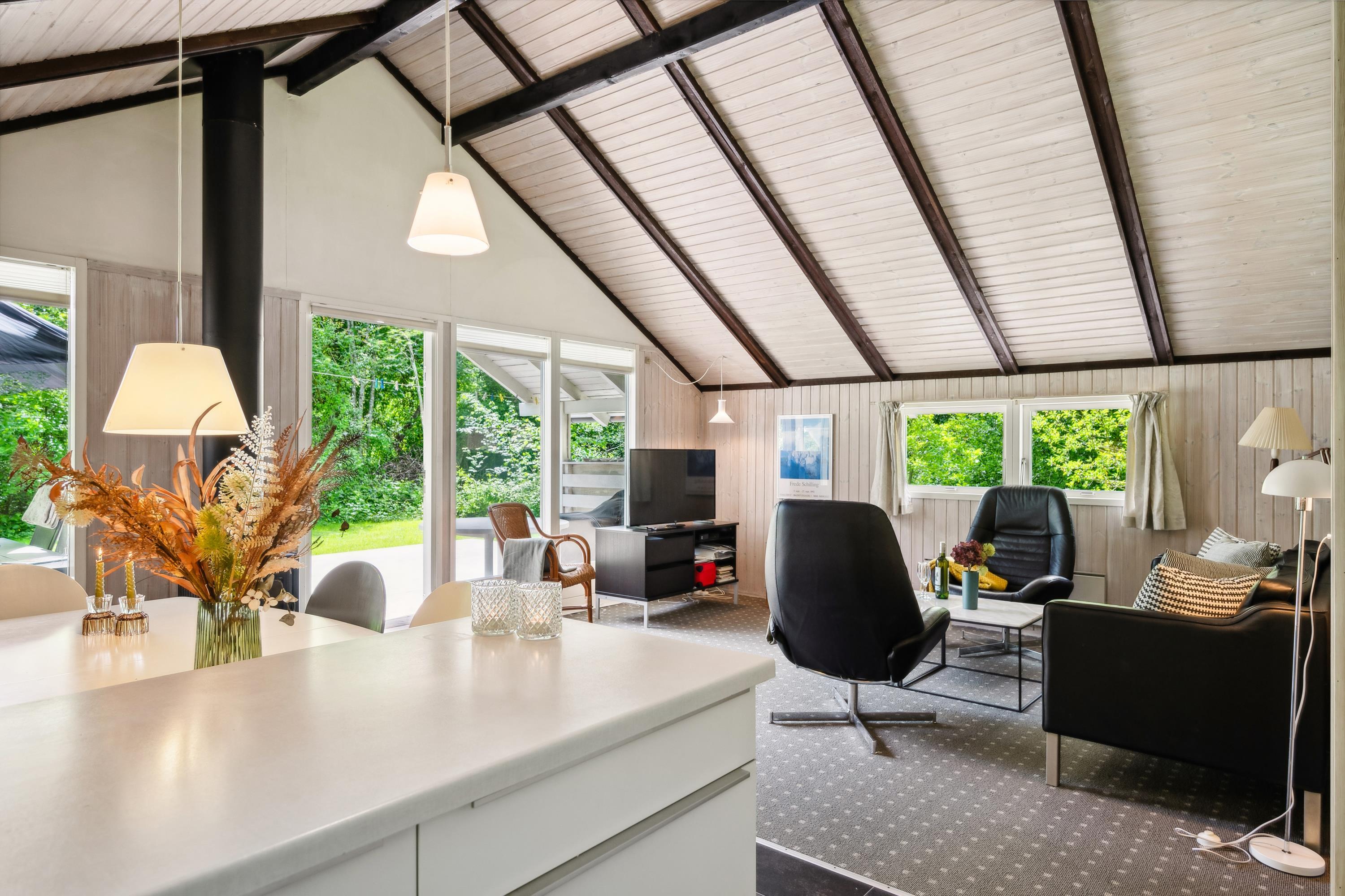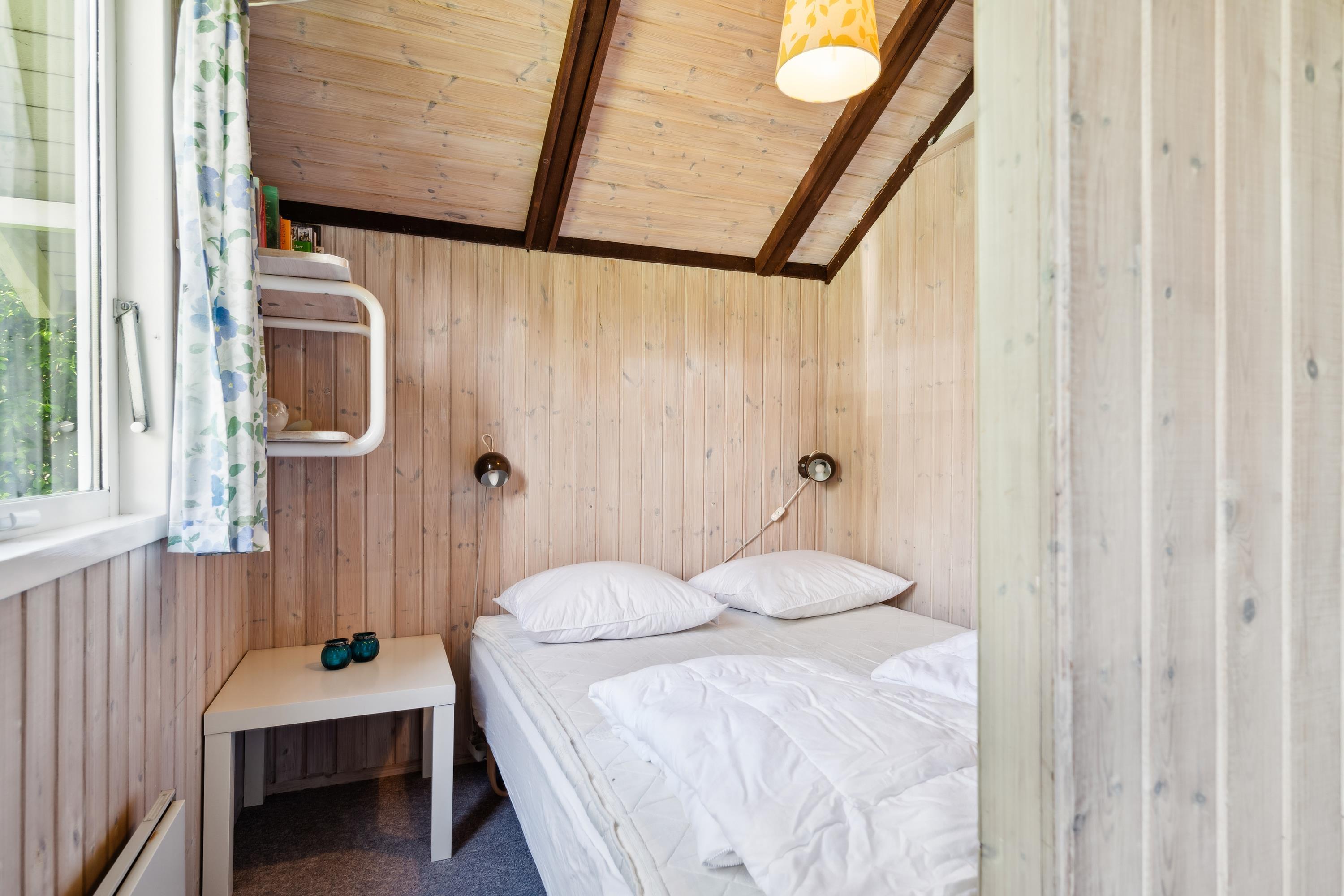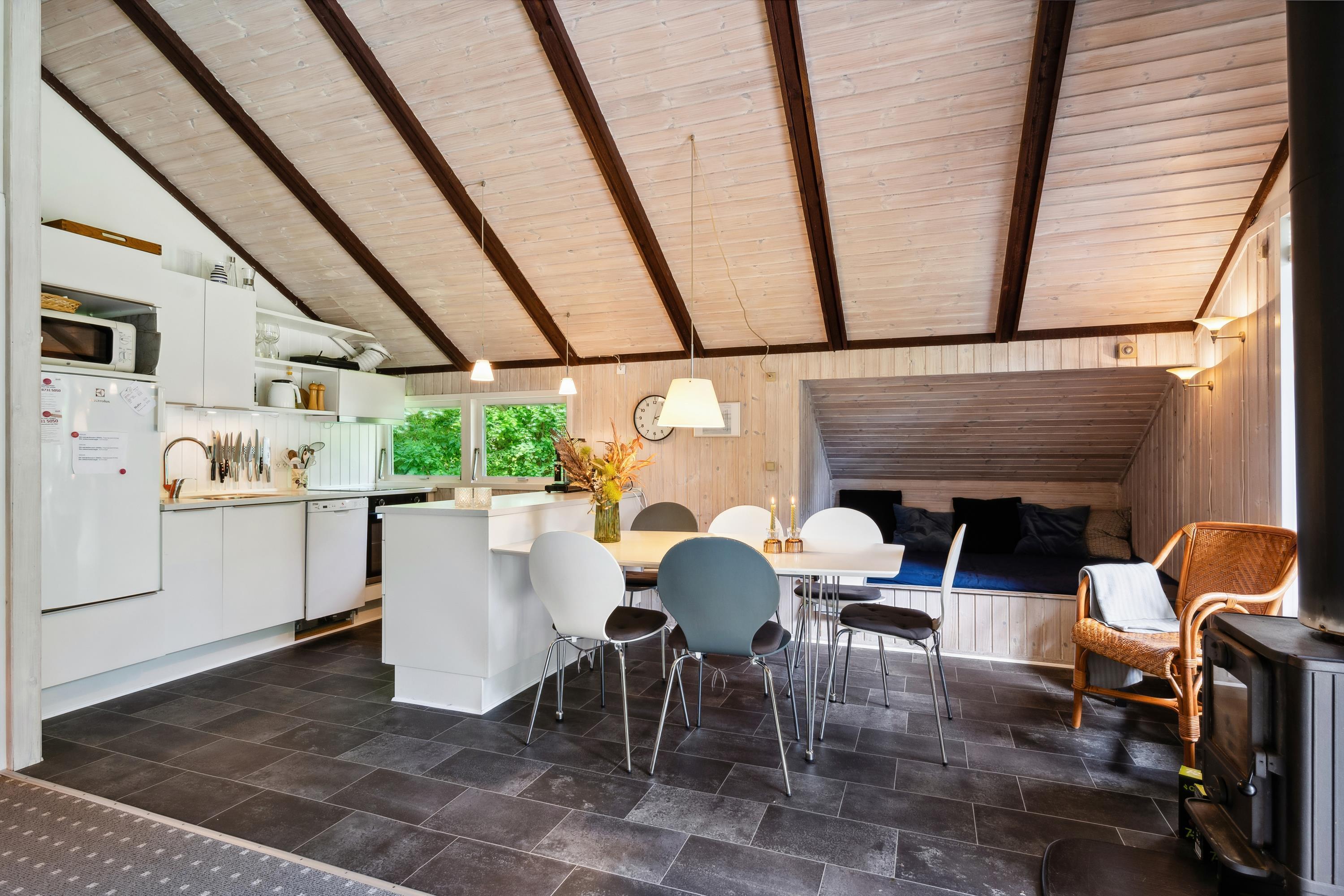 Helles Wohnzimmer in offener Verbindung zur Küche und mit Zugang zur Terrasse, möbliert mit Holzofen, Essecke für 5 Personen, gemütlicher Schlafnische, Sofagarnitur, Fernseher mit Satellitenschüssel (inkl. TV2), DVD-Player und Stereoanlage mit CD. Hier, wie im restlichen Haus, gibt es schräge Decke. Neu renovierte Küche mit Induktionskochfeld, Backofen, Geschirrspüler, Kühlschrank mit kleinem Gefrierfach und Mikrowelle. Das Haus bietet Platz für 5 Personen, aufgeteilt in 3 gute Schlafzimmer: 2 mit Doppelbett und 1 mit 1 Einzelbett. Älteres Badezimmer mit Dusche. Kinderbett und Hochstuhl. Das Haus hat Internetzugang.