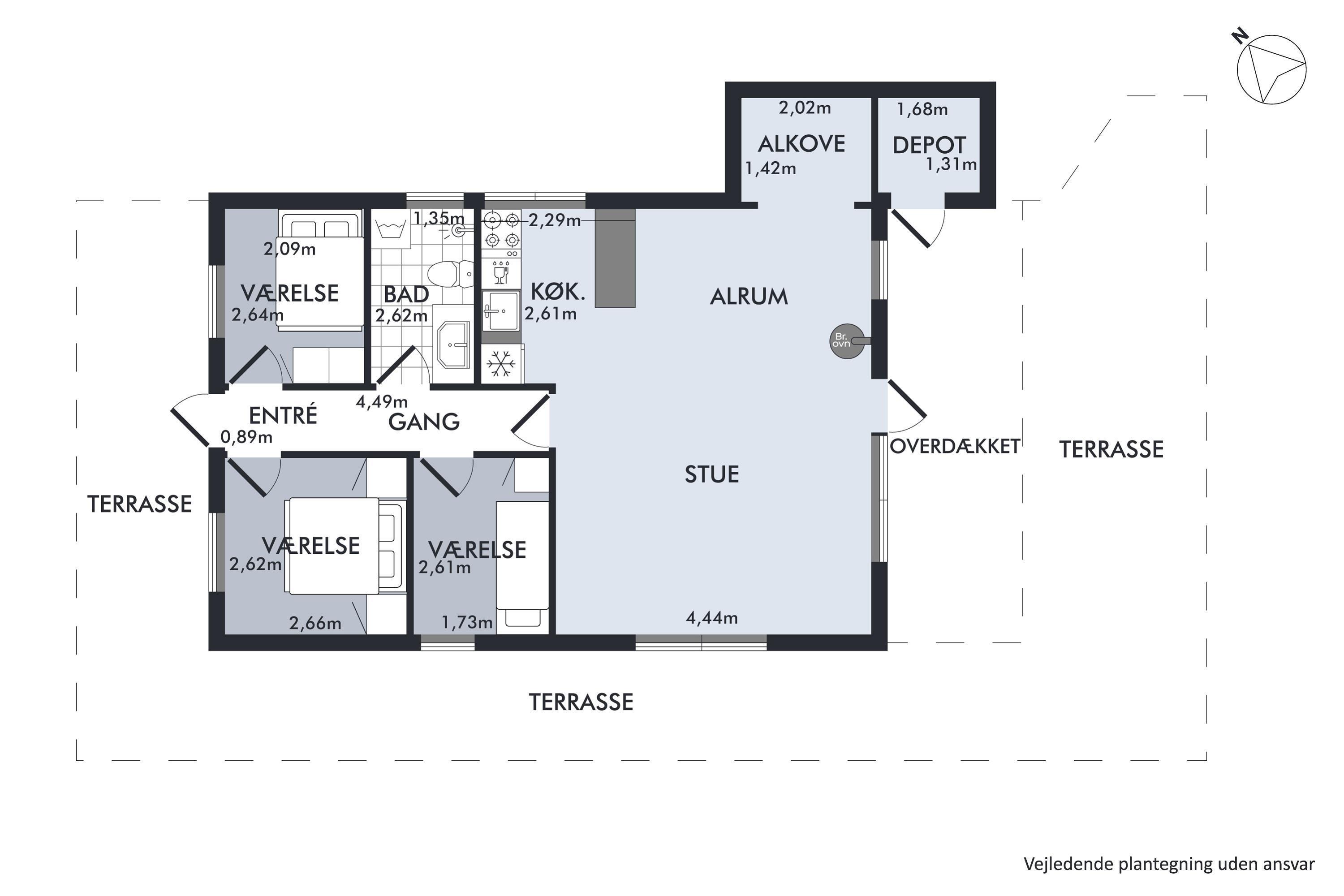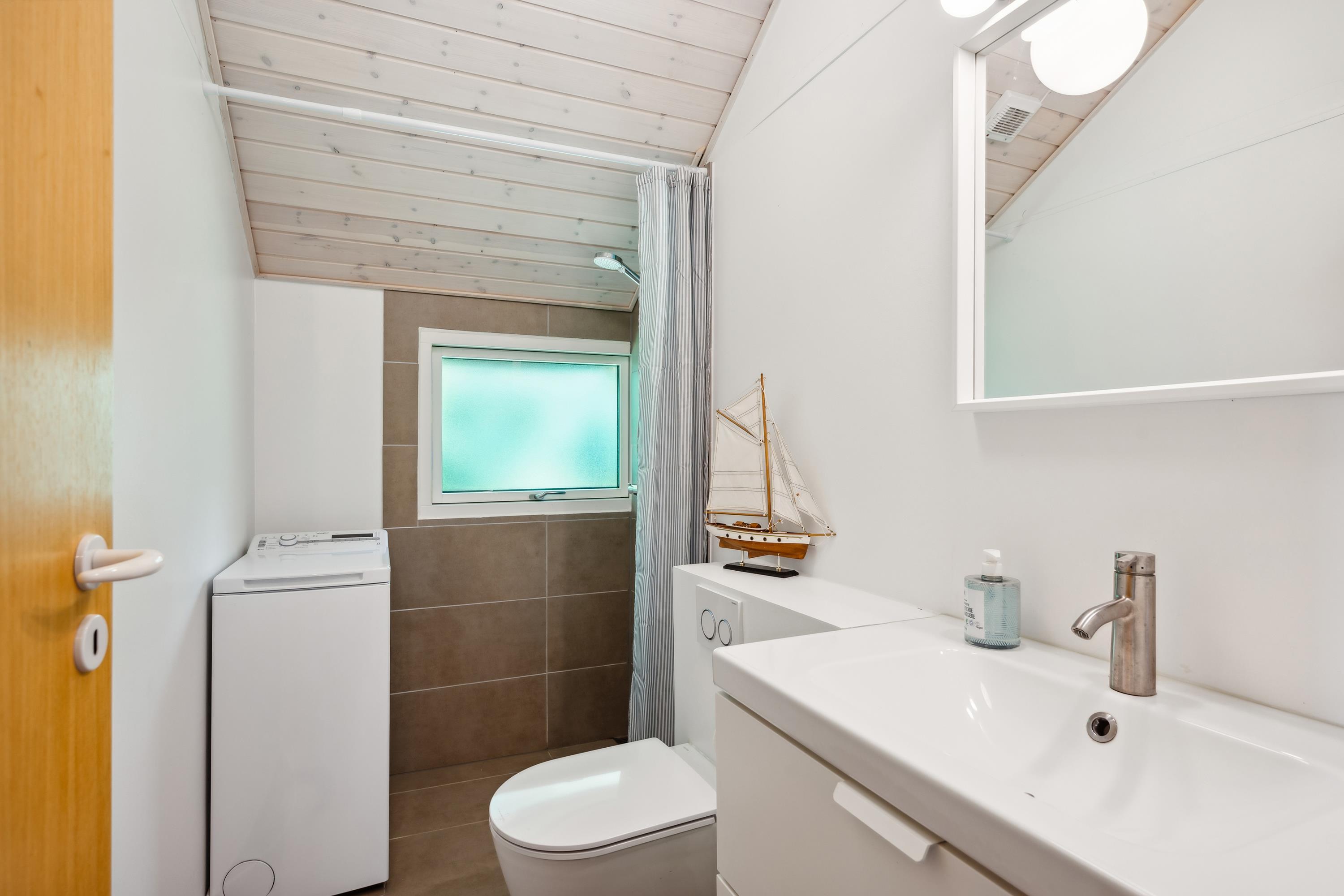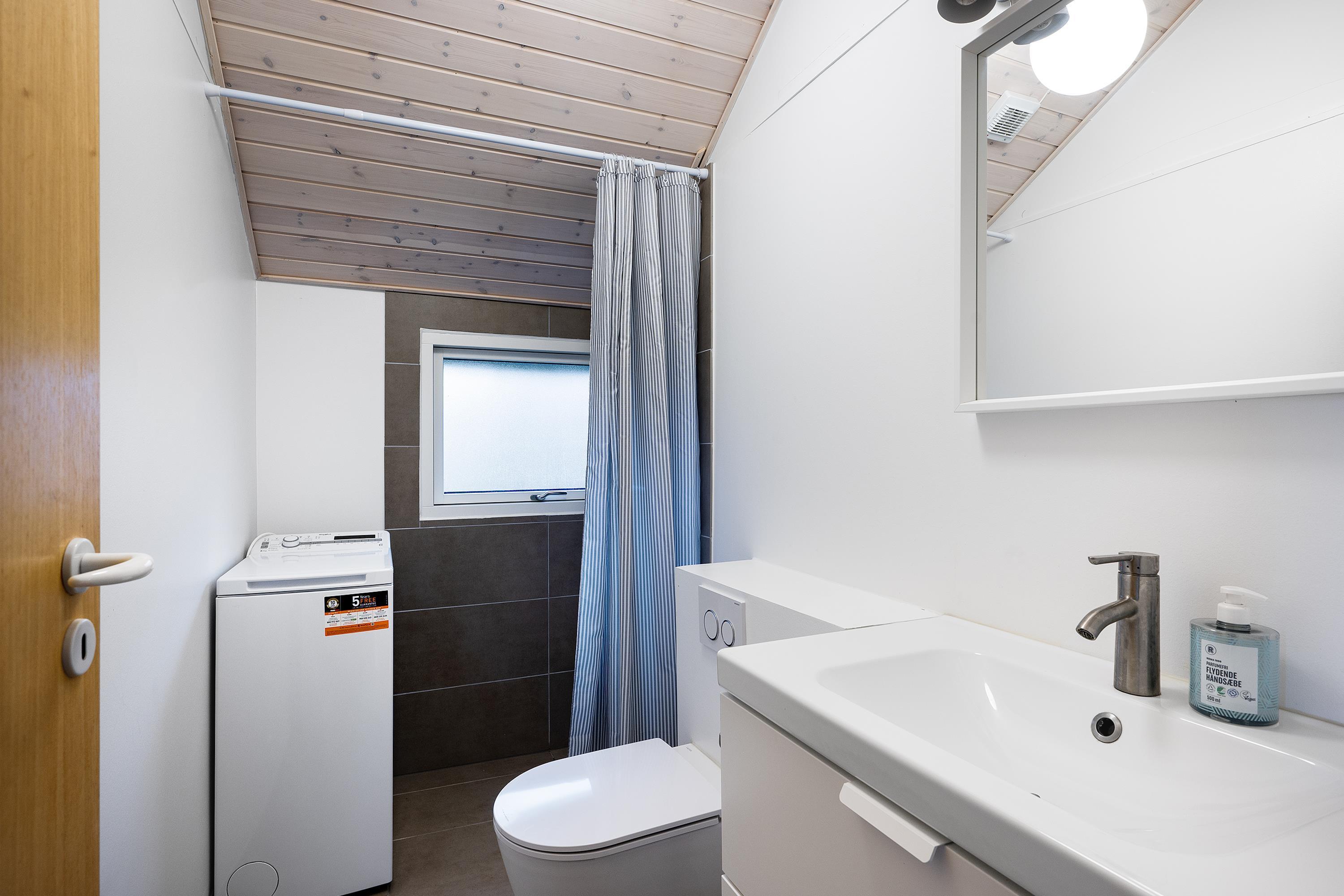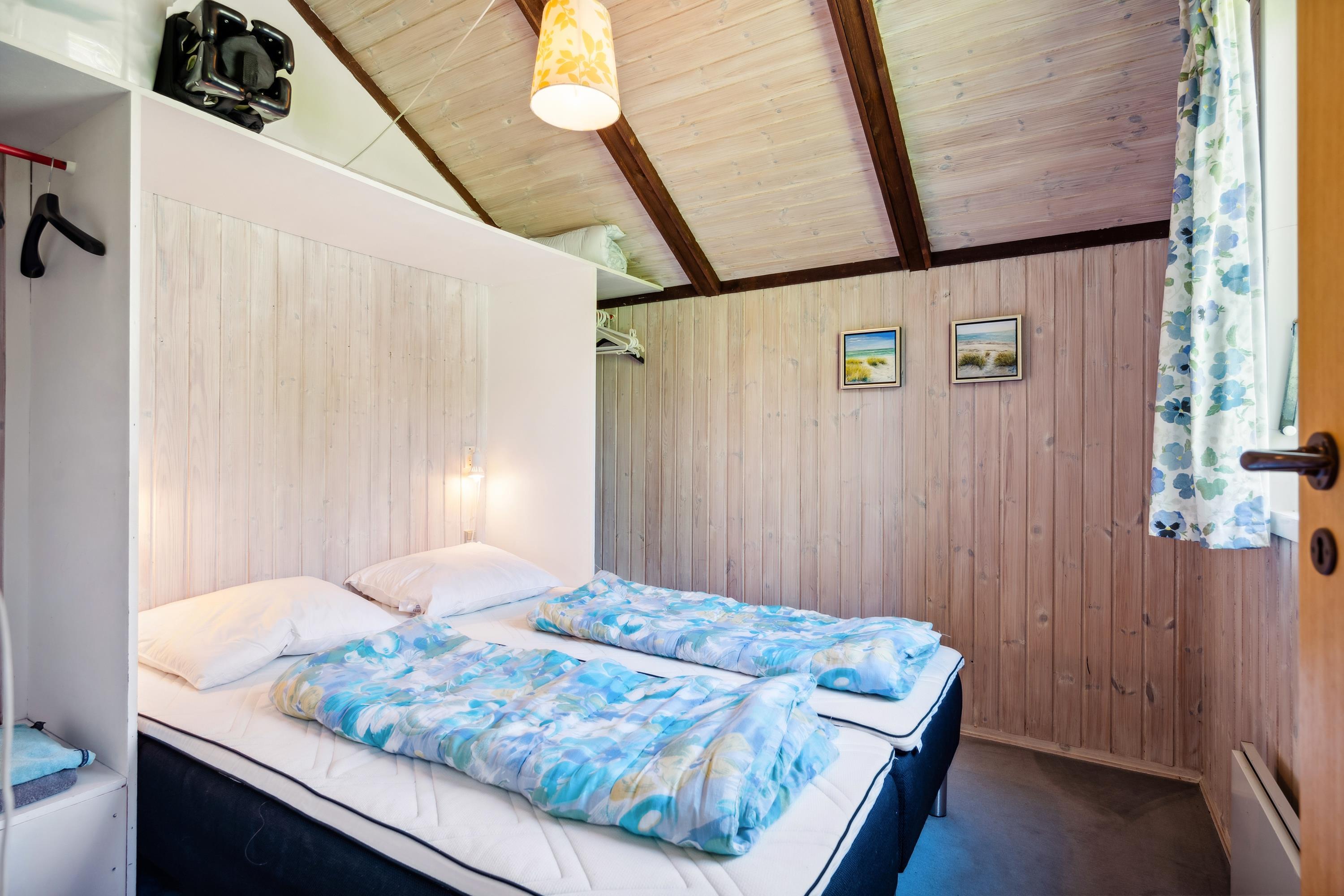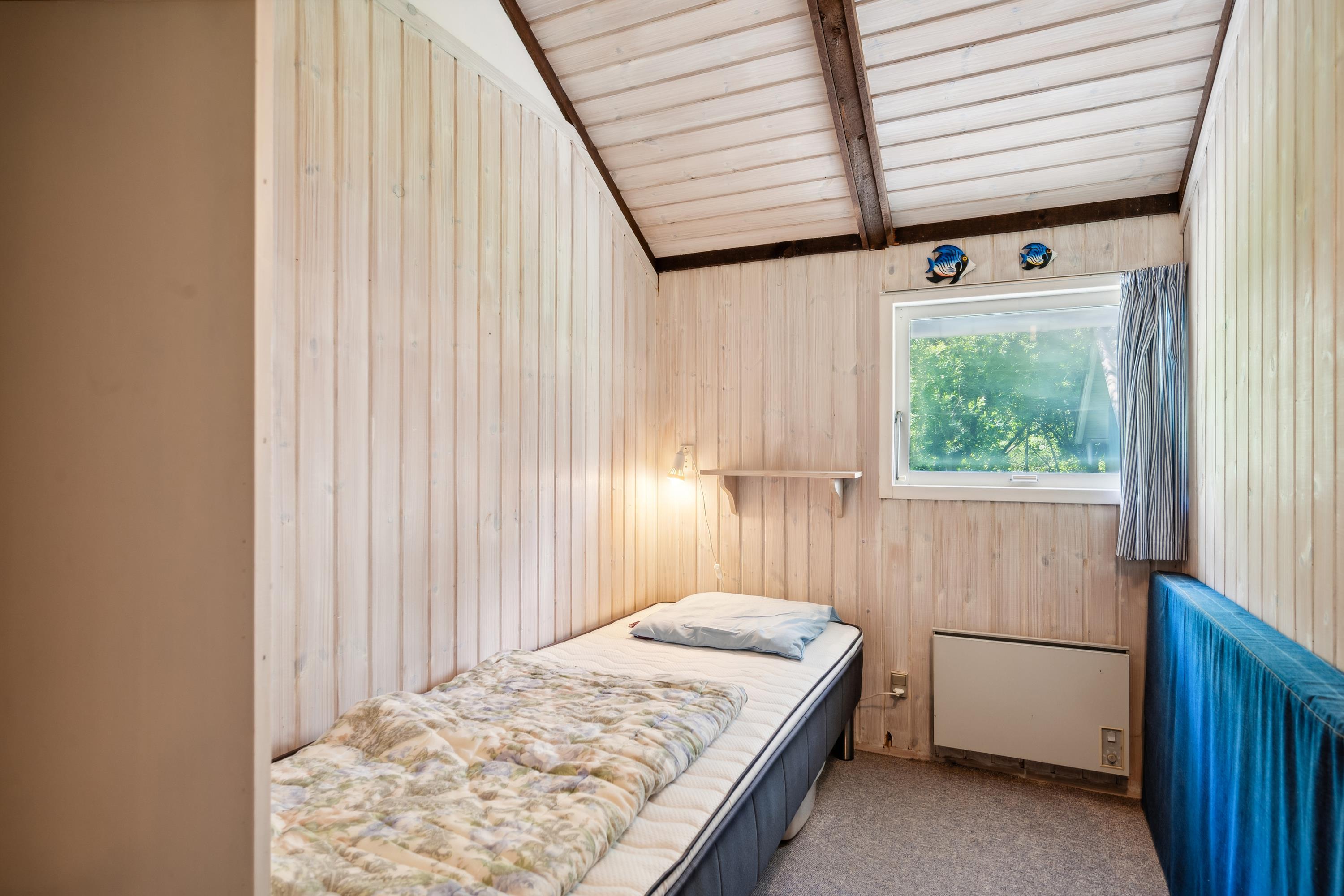 Helles Wohnzimmer in offener Verbindung zur Küche und mit Zugang zur Terrasse, möbliert mit Holzofen, Essecke für 5 Personen, gemütlicher Schlafnische, Sofagarnitur, Fernseher mit Satellitenschüssel (inkl. TV2), DVD-Player und Stereoanlage mit CD. Hier, wie im restlichen Haus, gibt es schräge Decke. Neu renovierte Küche mit Induktionskochfeld, Backofen, Geschirrspüler, Kühlschrank mit kleinem Gefrierfach und Mikrowelle. Das Haus bietet Platz für 5 Personen, aufgeteilt in 3 gute Schlafzimmer: 2 mit Doppelbett und 1 mit 1 Einzelbett. Älteres Badezimmer mit Dusche. Kinderbett und Hochstuhl. Das Haus hat Internetzugang.