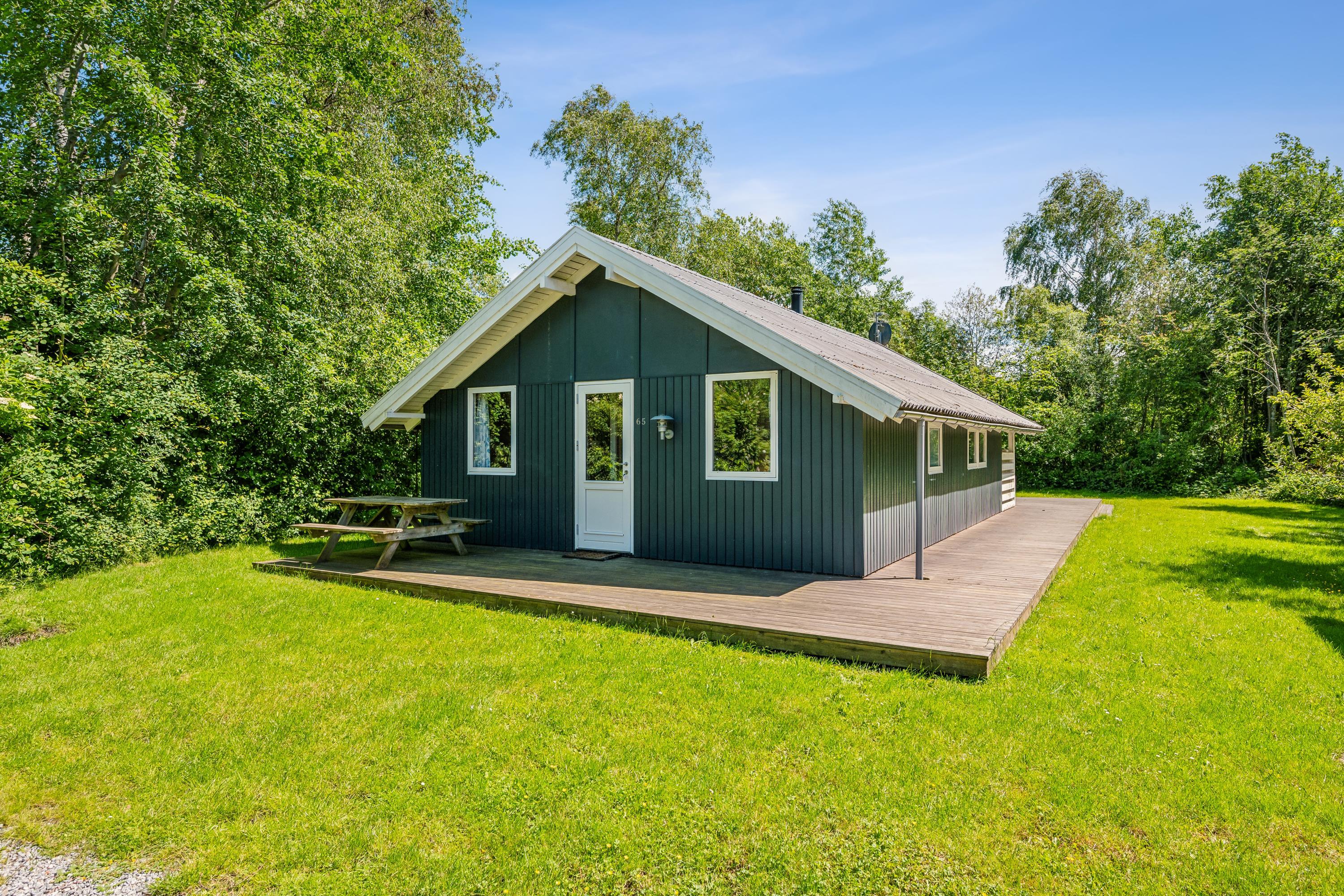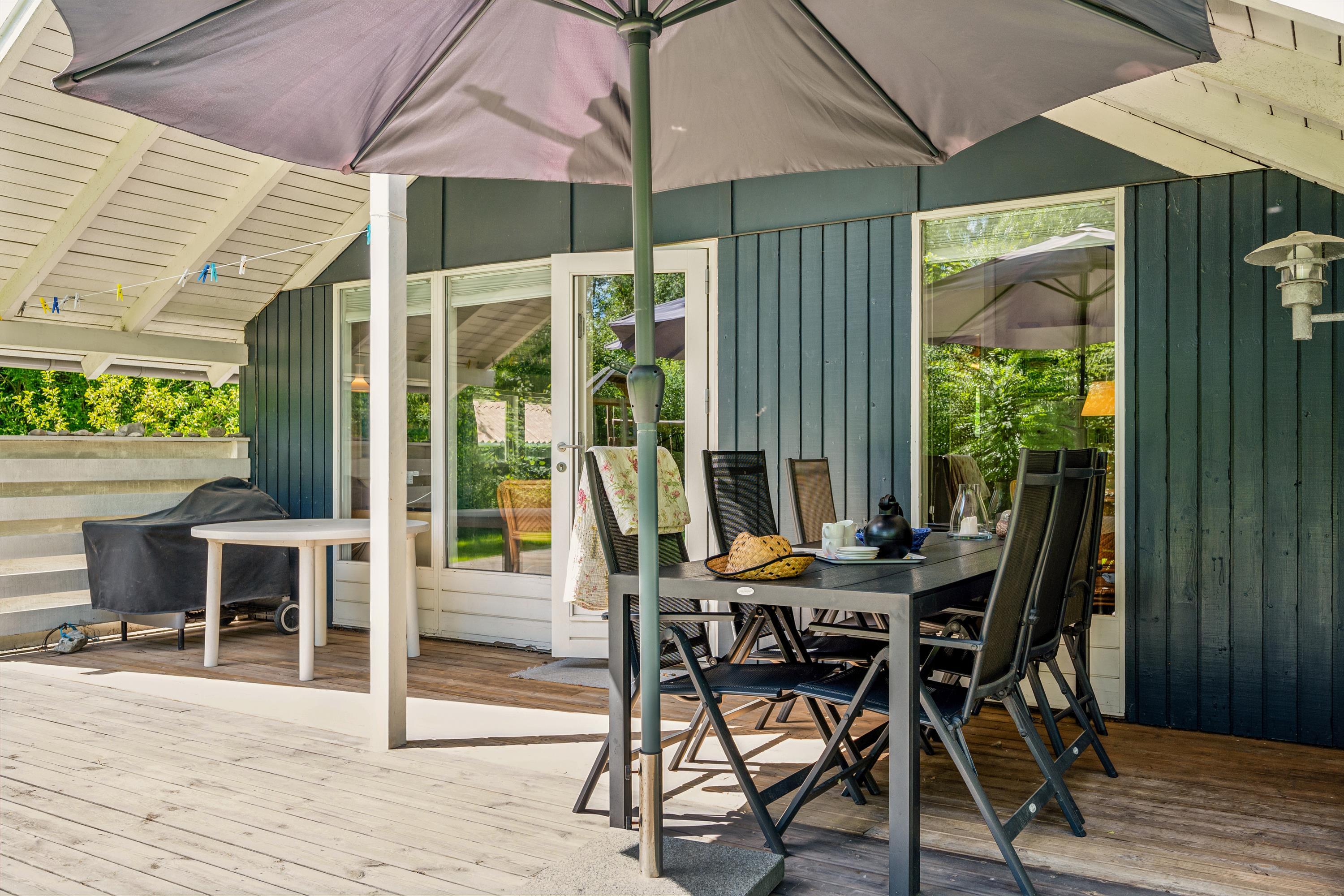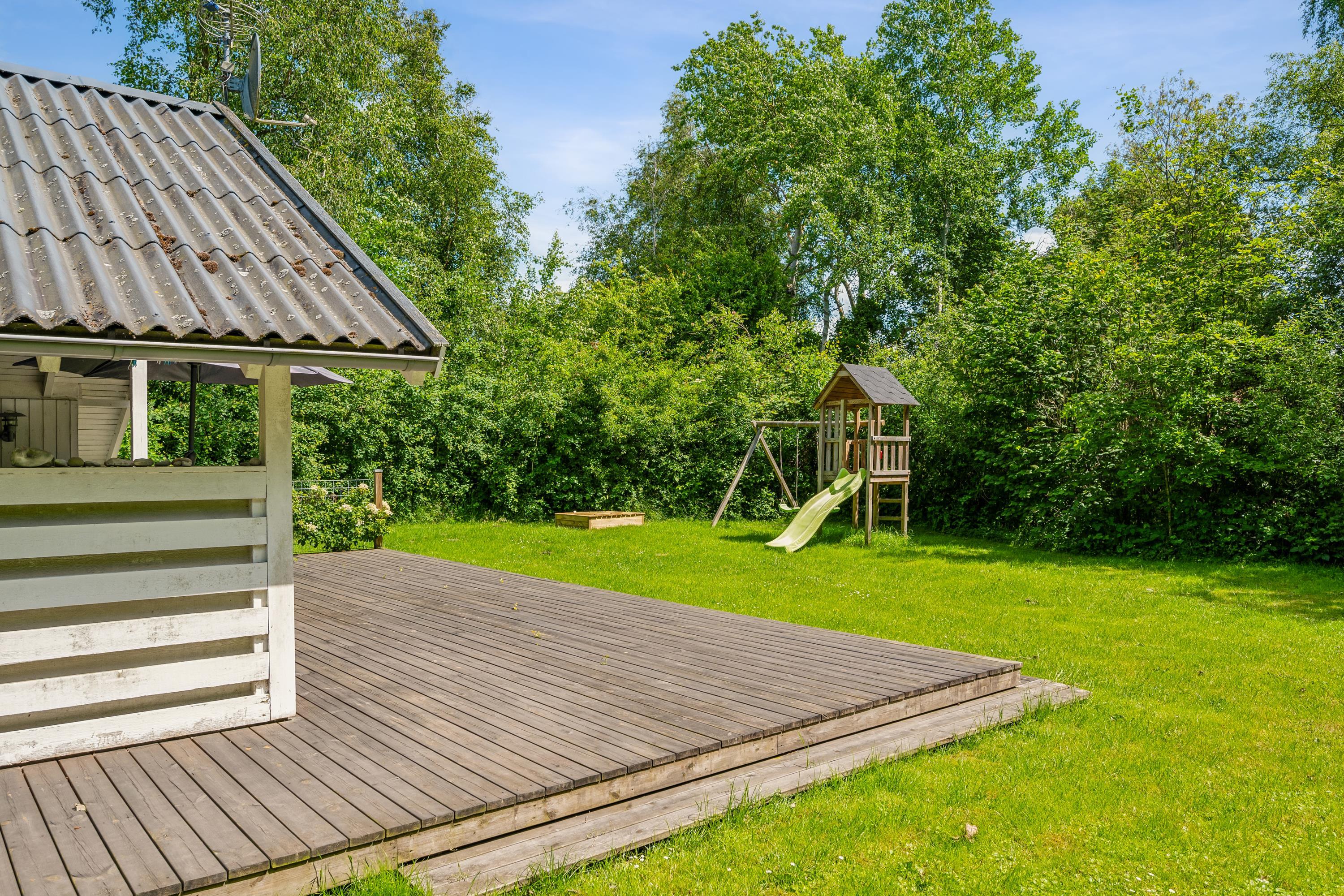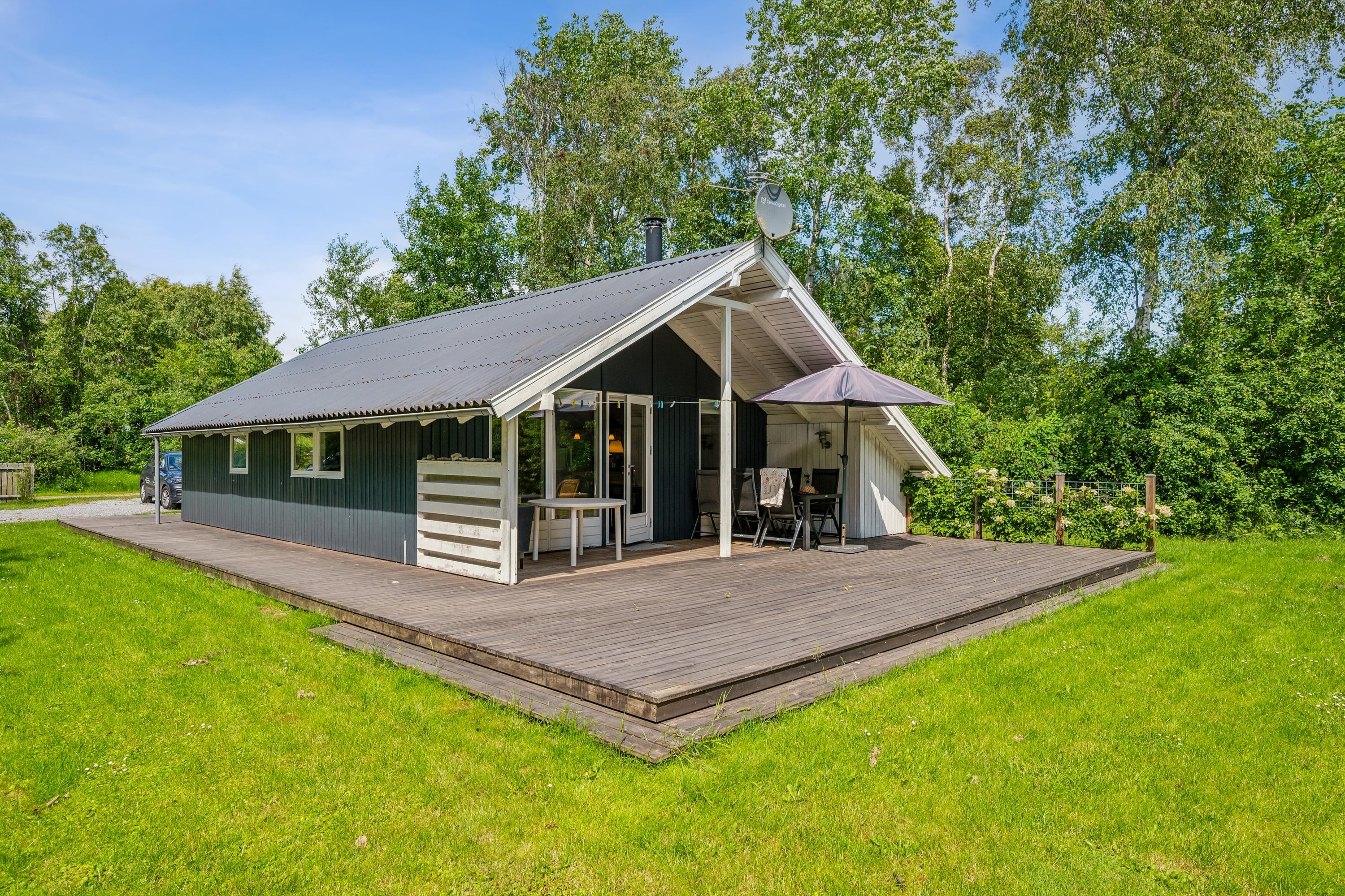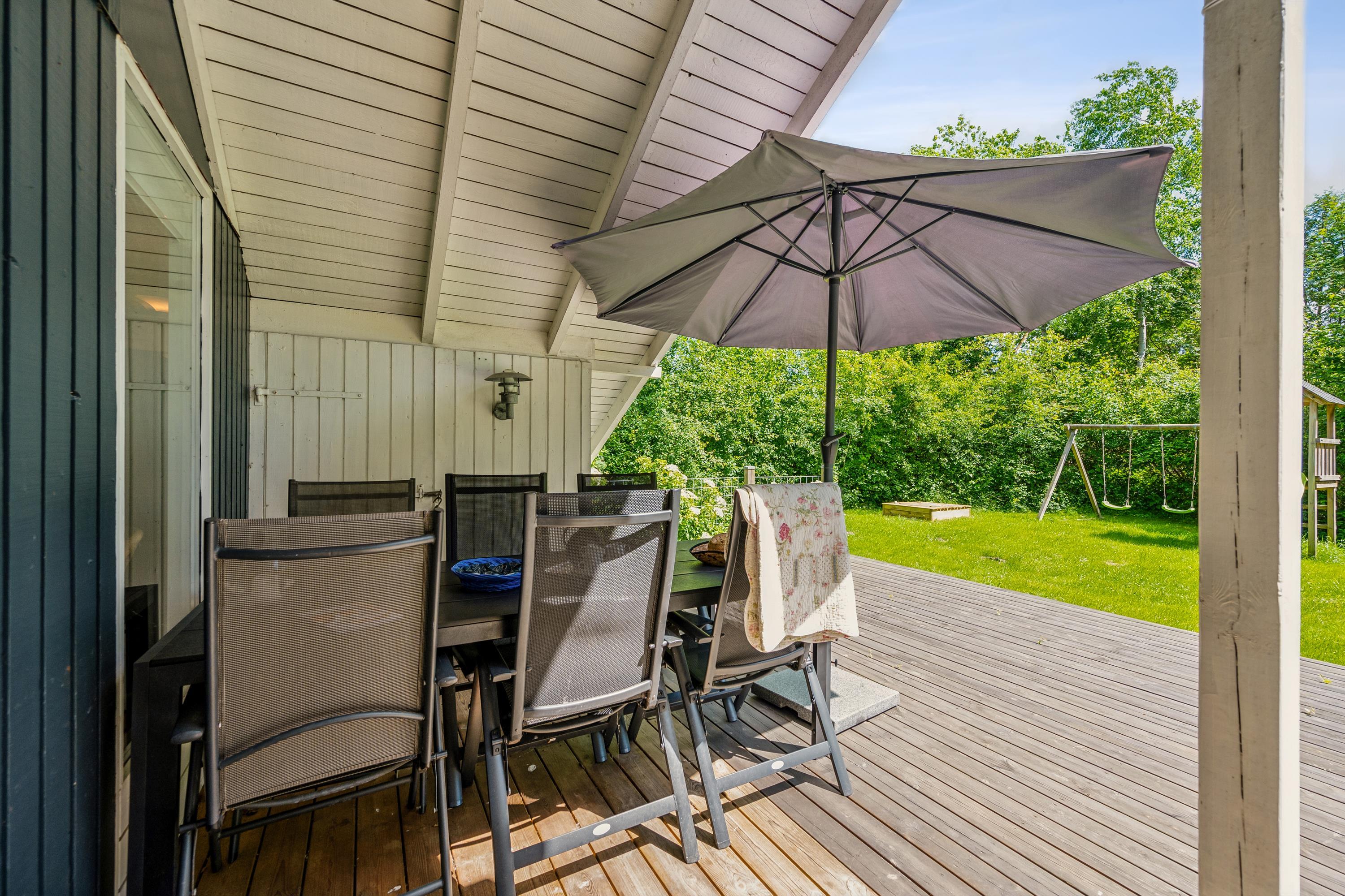 Älteres, gepflegtes Ferienhaus auf geschütztem Naturgrundstück am Ende einer Sackgasse. Schöne, neuere Holzterrasse mit Gartenmöbeln und Grill, und auf dem Grundstück gibt es Schaukel und Sandkasten für die kleinsten Feriengäste. Außerdem verfügt das Haus über einen abschließbaren Schuppen.