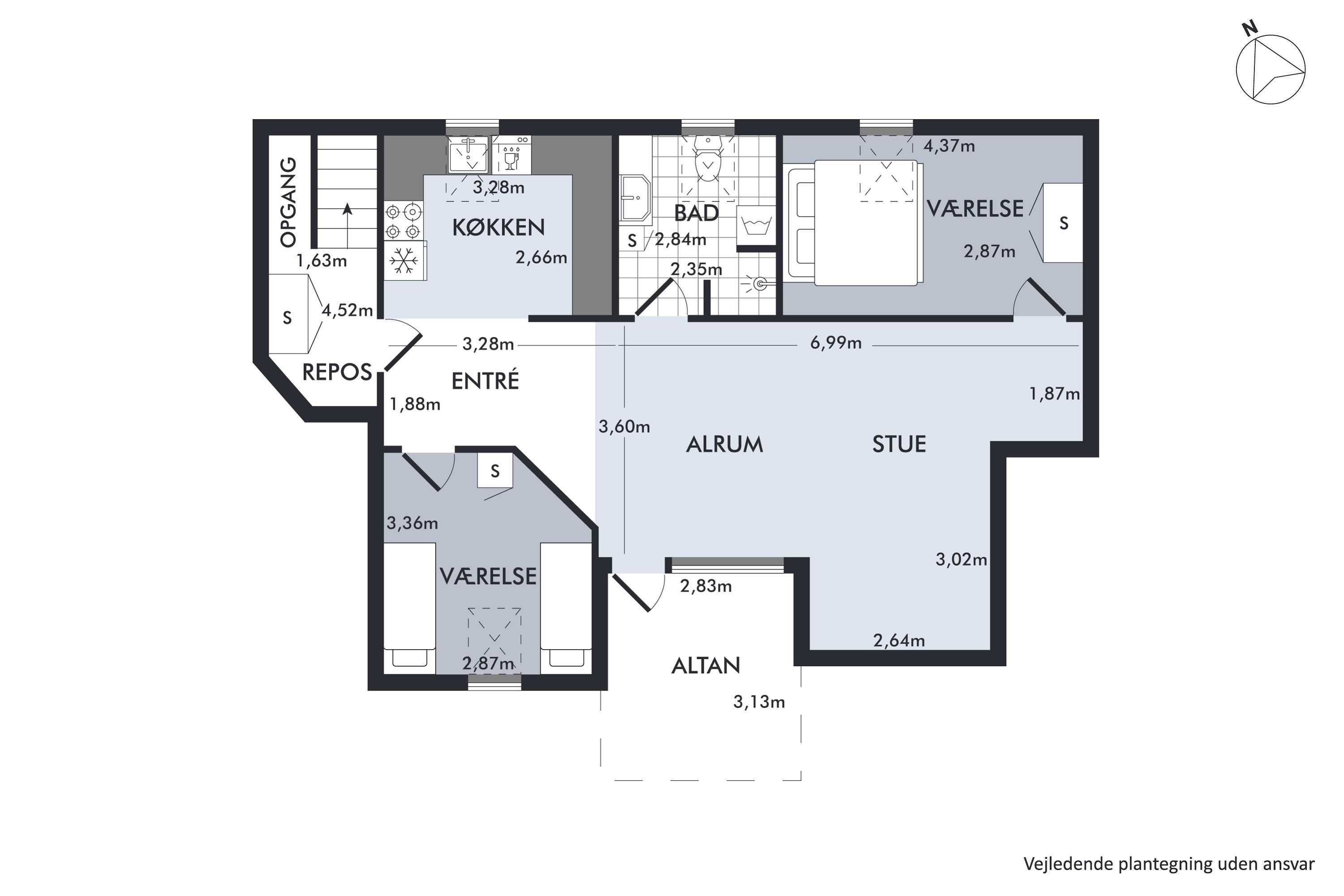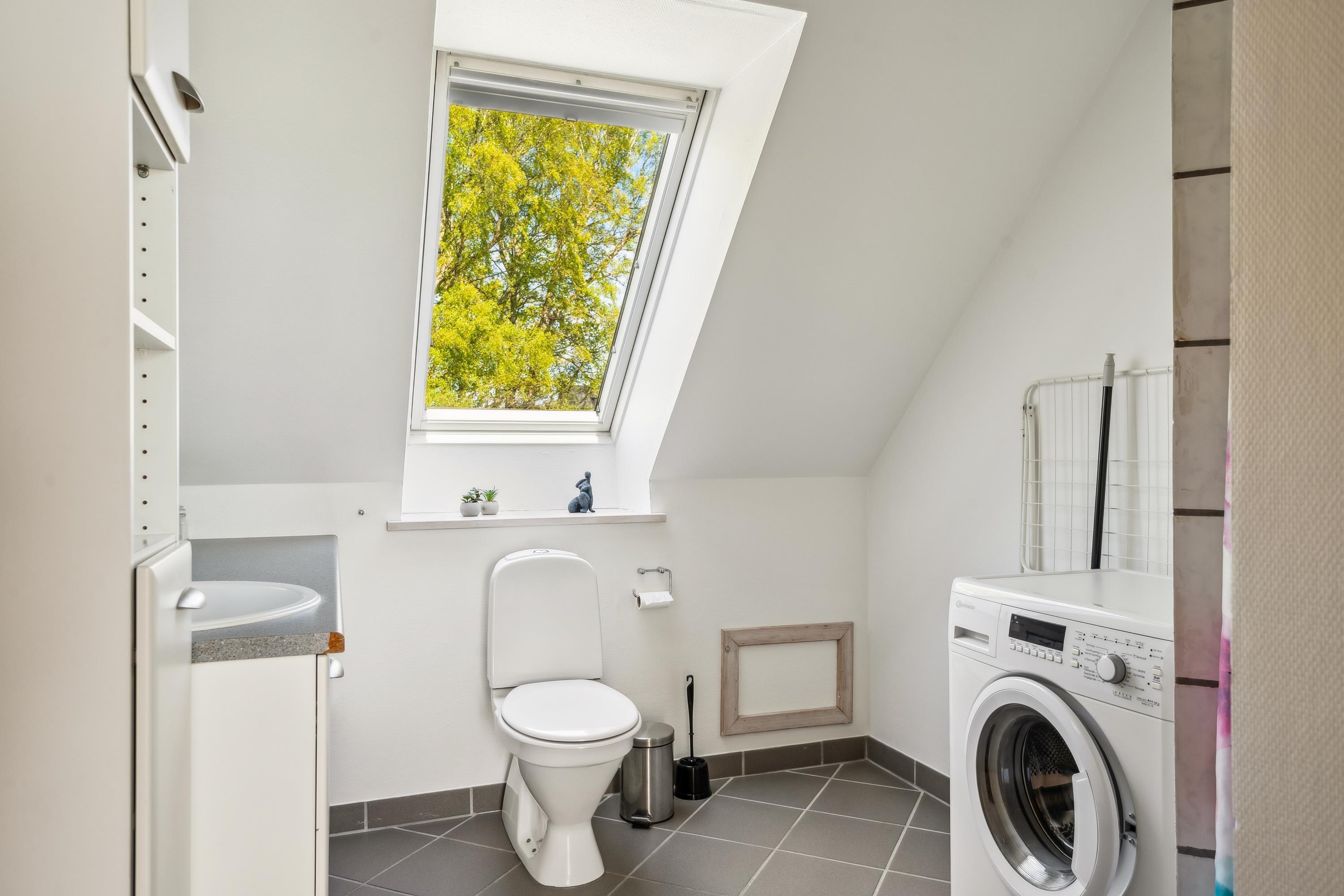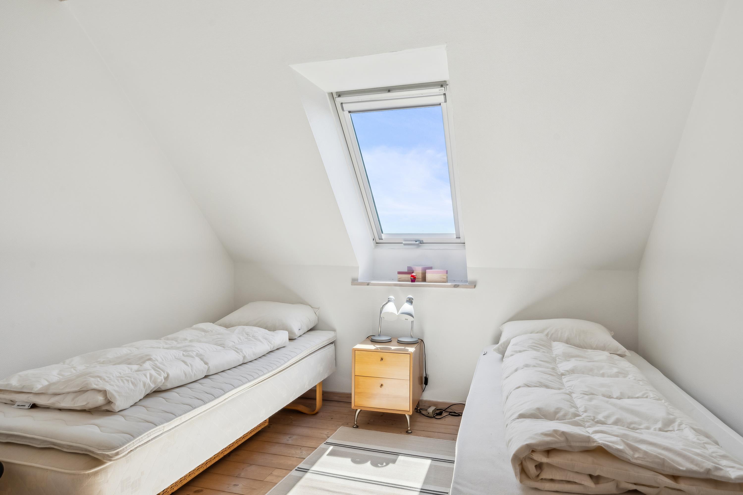 Gemeinsame Haustür mit der Erdgeschosswohnung, und vom Eingangsbereich führt eine Treppe hinauf zur Wohnungstür. Man kommt direkt in das gemütliche Wohnzimmer in halb offener Verbindung zur Küche. Das Wohnzimmer ist mit Zugang zum Balkon, Essplatz für sechs Personen, Sitzecke und TV mit dänischen Programmen ausgestattet. Große Küche mit viel Arbeitsfläche, Glaskeramikherd, Kühl-/Gefrierkombination, Geschirrspüler und Mikrowelle. Die insgesamt fünf Schlafplätze verteilen sich auf ein helles Schlafzimmer mit Doppelbett, ein etwas kleineres Zimmer mit zwei Einzelbetten sowie einen Schlafplatz auf dem Schlafsofa im Wohnzimmer. Schönes, gut eingerichtetes Badezimmer mit Fußbodenheizung, Dusche und Waschmaschine. Für die Kleinsten sind ein Kinderbett und ein Kinderstuhl vorhanden. Internetzugang.