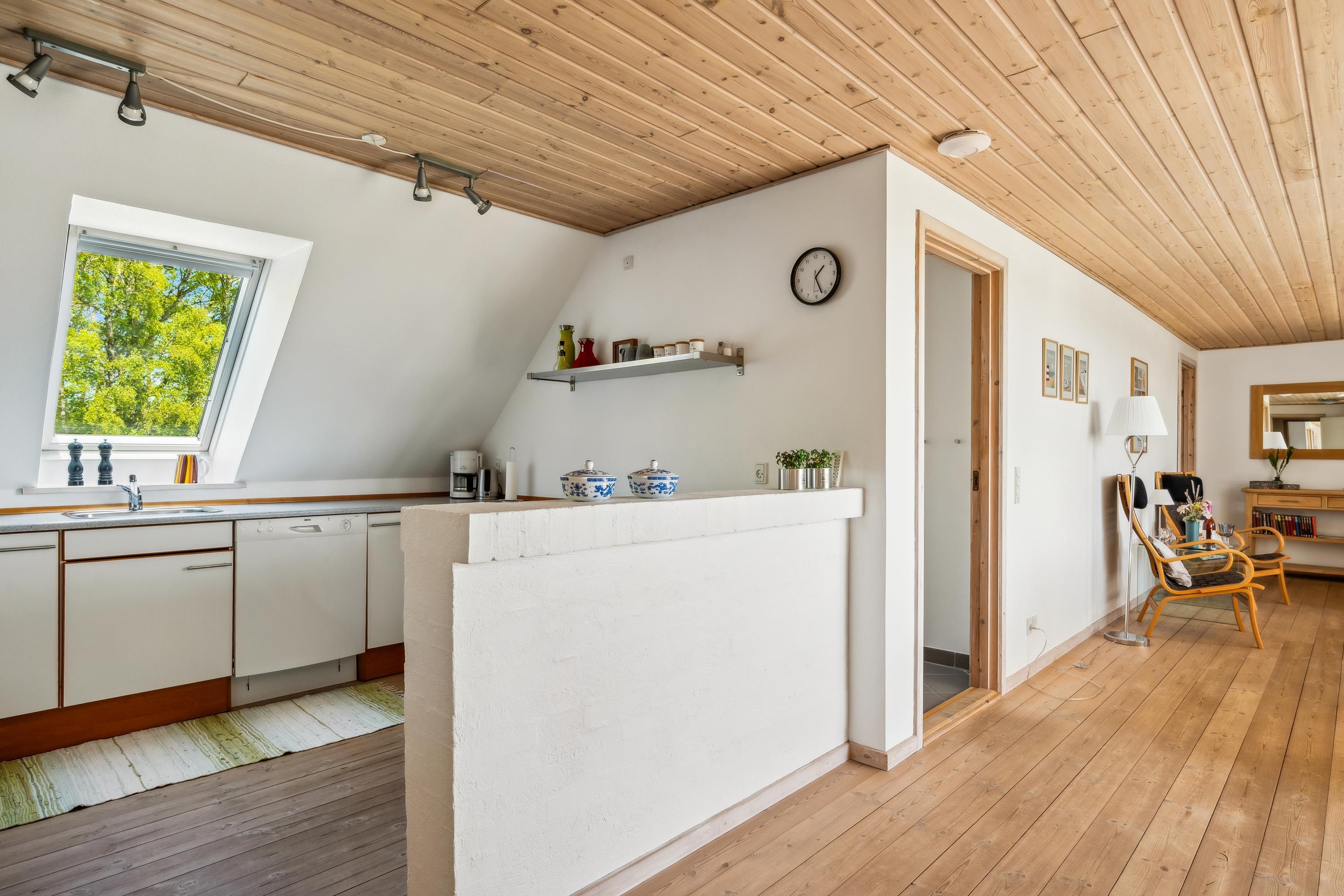 Einladende, helle und gepflegte Ferienwohnung auf einem hoch gelegenen, offenen Naturgrundstück mit Panoramablick auf das Kattegat und die hügelige Landschaft südlich von Ebeltoft. Die Wohnung liegt im ersten Stock und hat einen nach Südwesten gewandten Balkon mit Gartenmöbeln, Liegestühlen und Grill. Auf dem großen Grundstück, das mit drei anderen Ferienwohnungen geteilt wird, befinden sich eine Feuerstelle sowie eine Schaukel und ein Sandkasten für die Kinder.