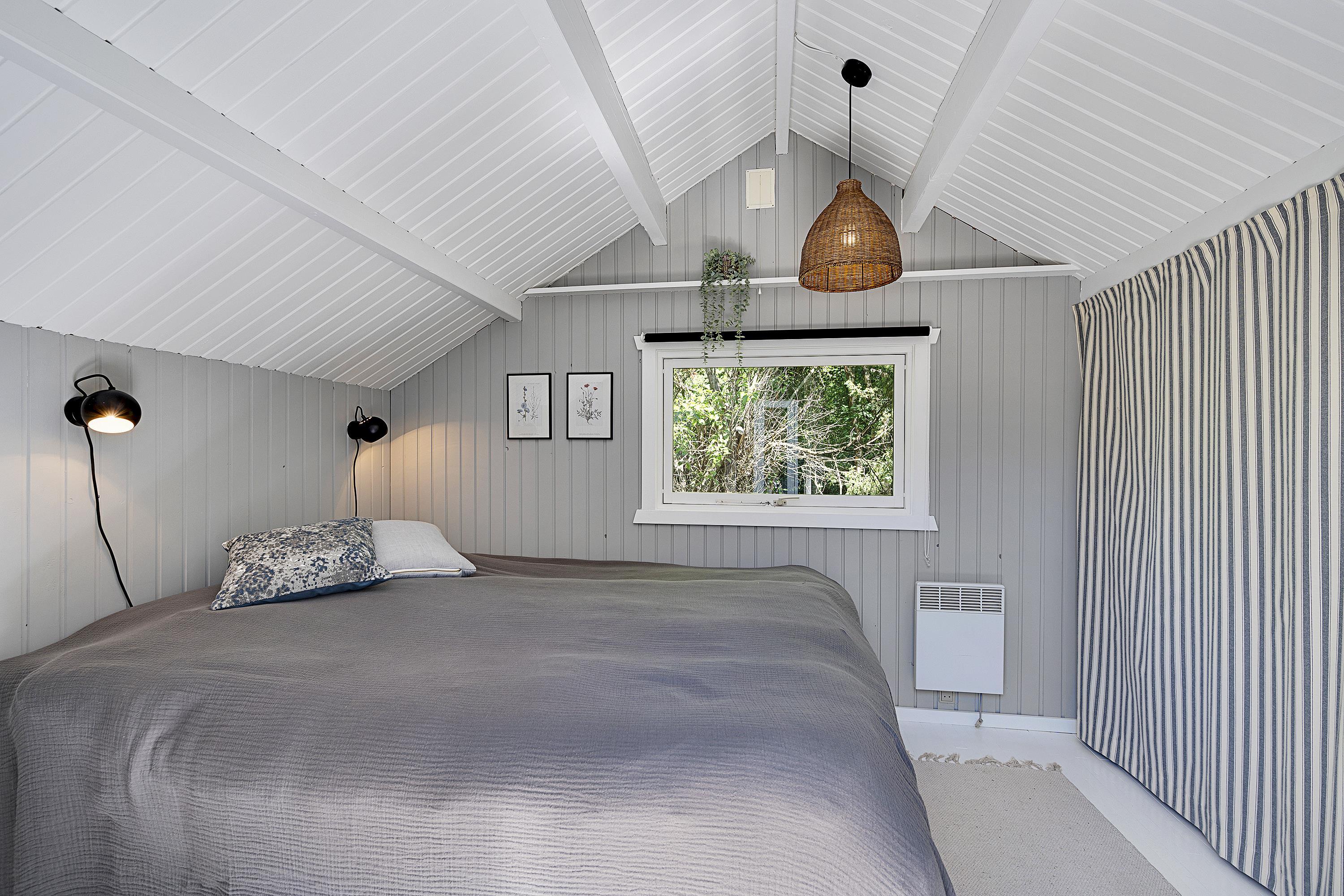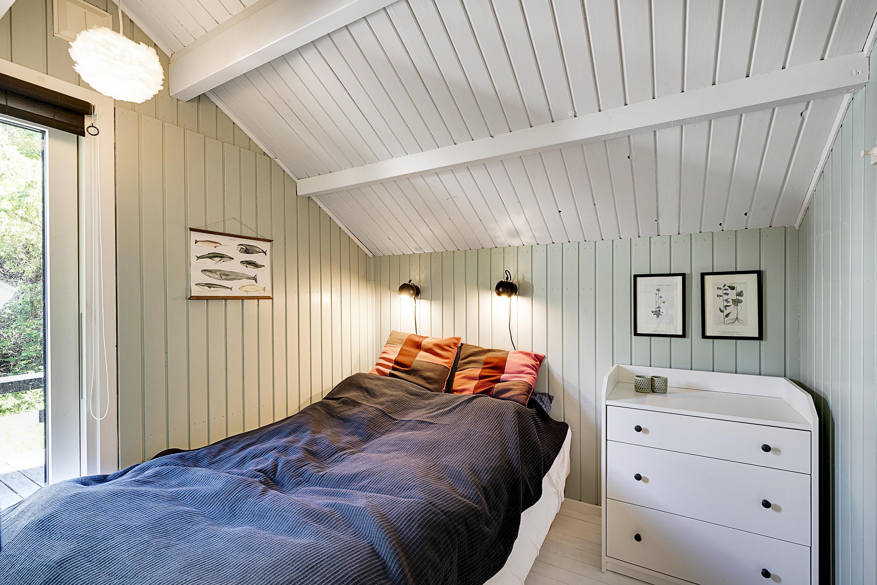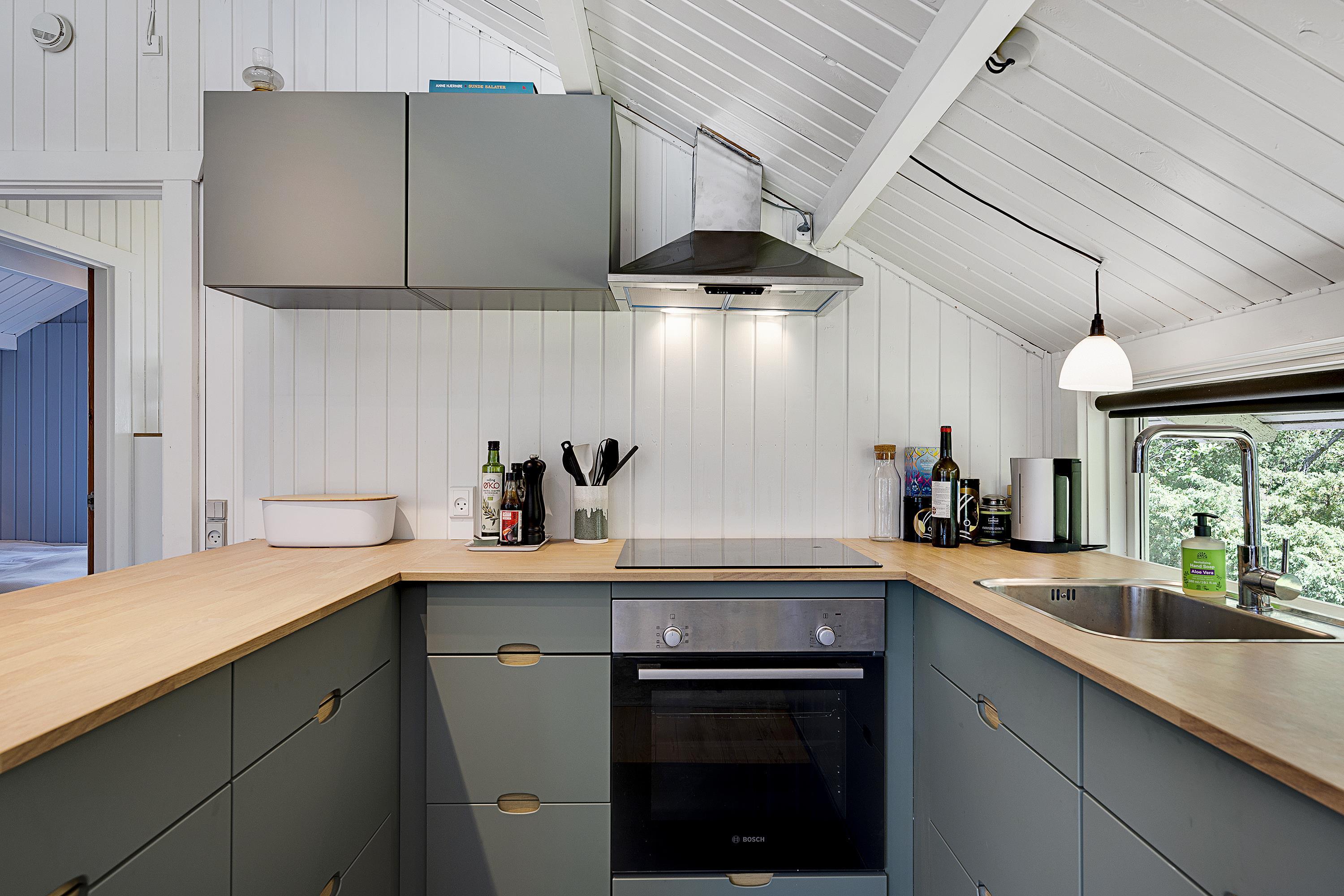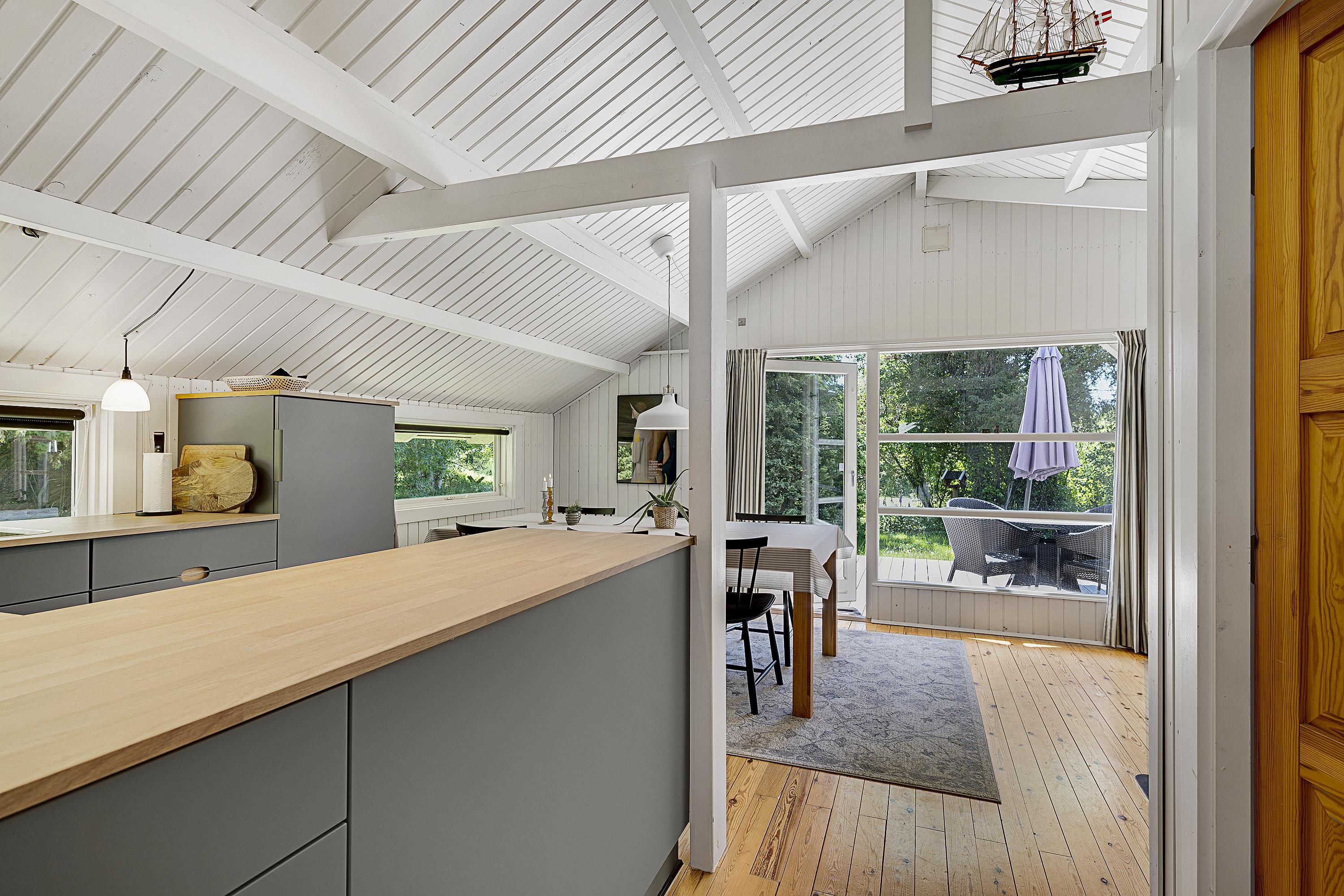Das helle, bis zum Dachfirst hin offene Wohnzimmer ist weiß gestrichen und hat einen schönen Kiefernholzboden sowie große Fensterpartien zur Südterrasse. Es ist mit geräumiger Sofaecke, Sesseln, Kaminofen, TV mit dänischen Programmen (inkl. TV2) und DVD-Player ausgestattet. Schicke, helle Wohnküche mit Essplatz für sechs Personen, viel Ablage- und Schrankfläche, Glaskeramikherd, Kühl-/Gefrierkombination, Geschirrspüler und Mikrowelle. Vom Flur aus besteht Zugang zu zwei guten Schlafzimmern mit Doppelbett – ein weiteres Doppelbett befindet sich im Nebengebäude (insgesamt sechs Schlafplätze). Geräumiges und helles Badezimmer mit Dusche. Im Schuppen neben der Terrasse steht eine Waschmaschine. Internetzugang.