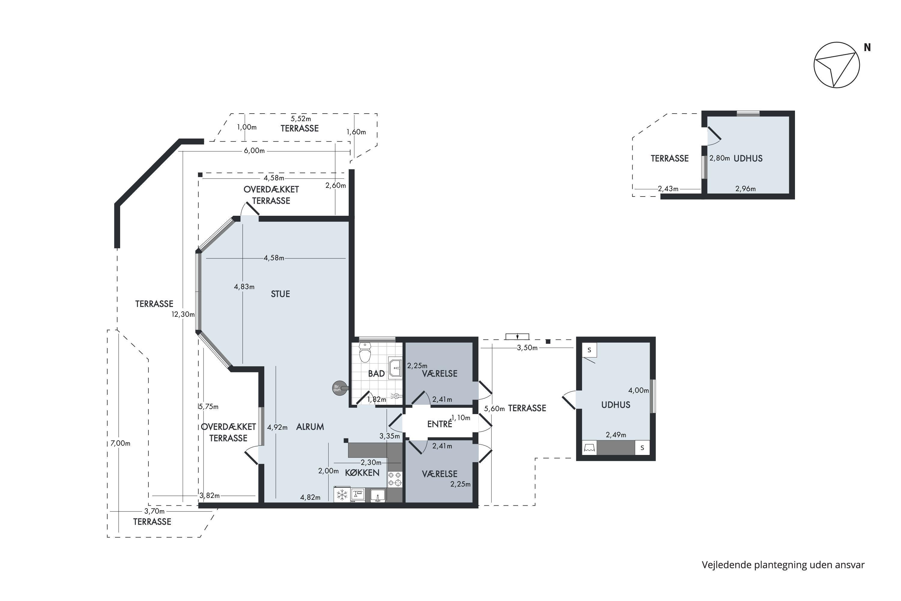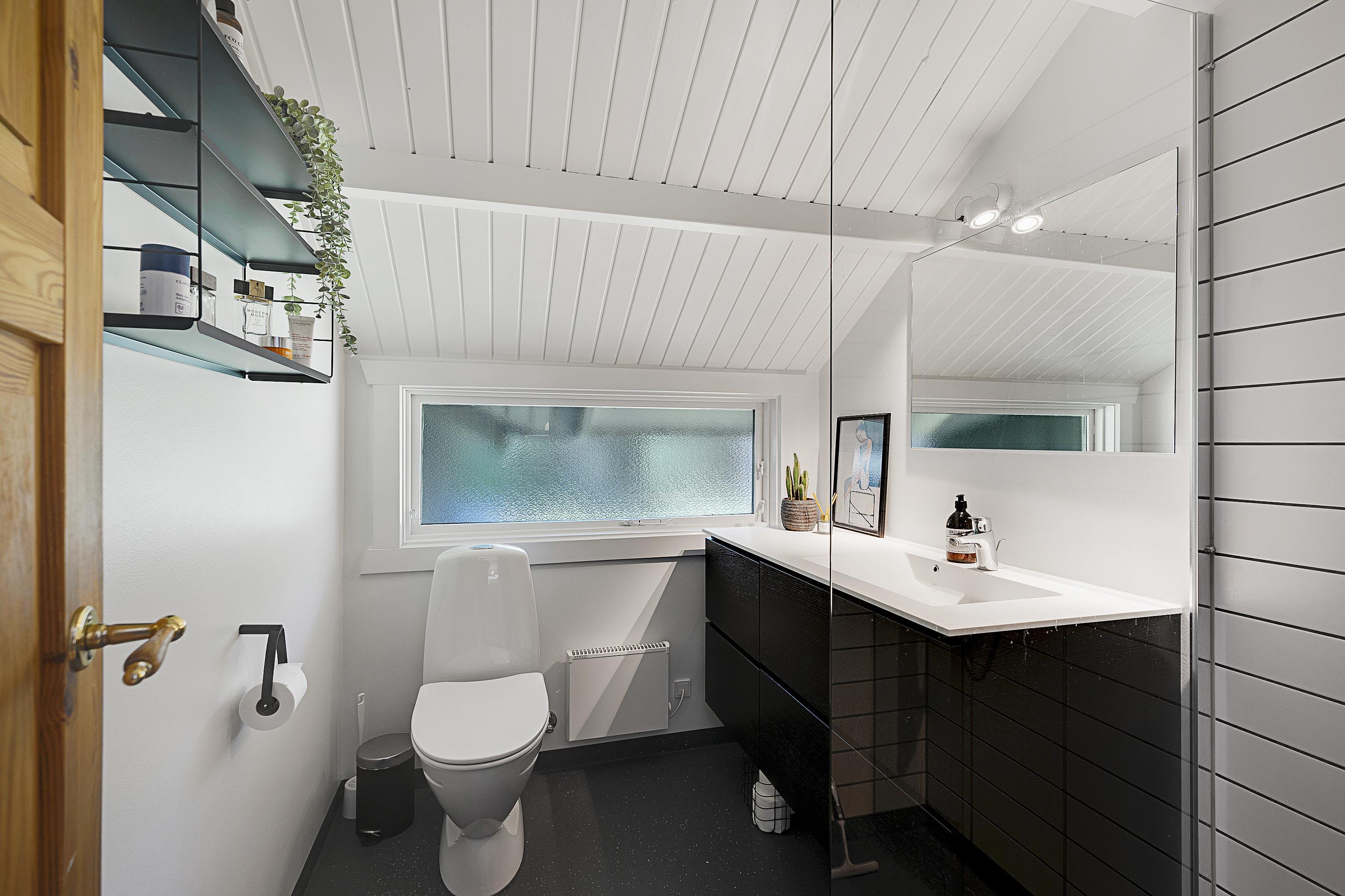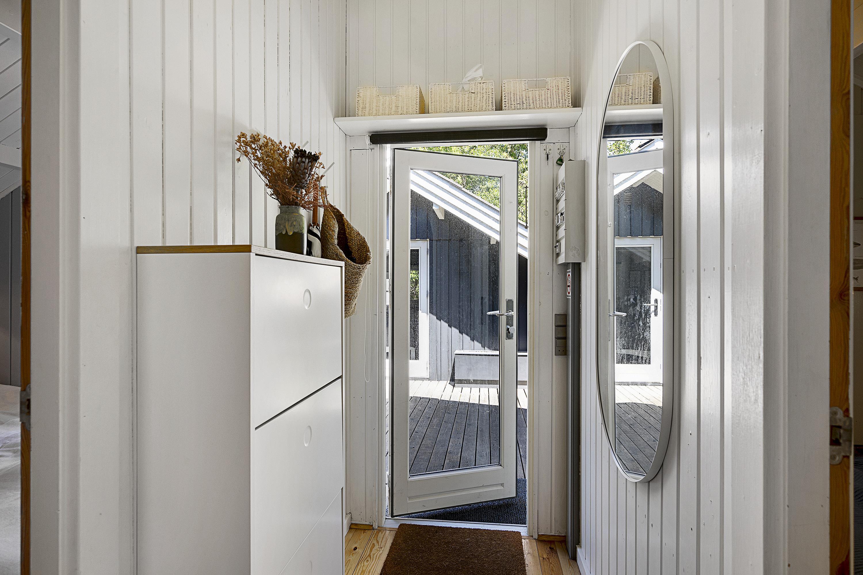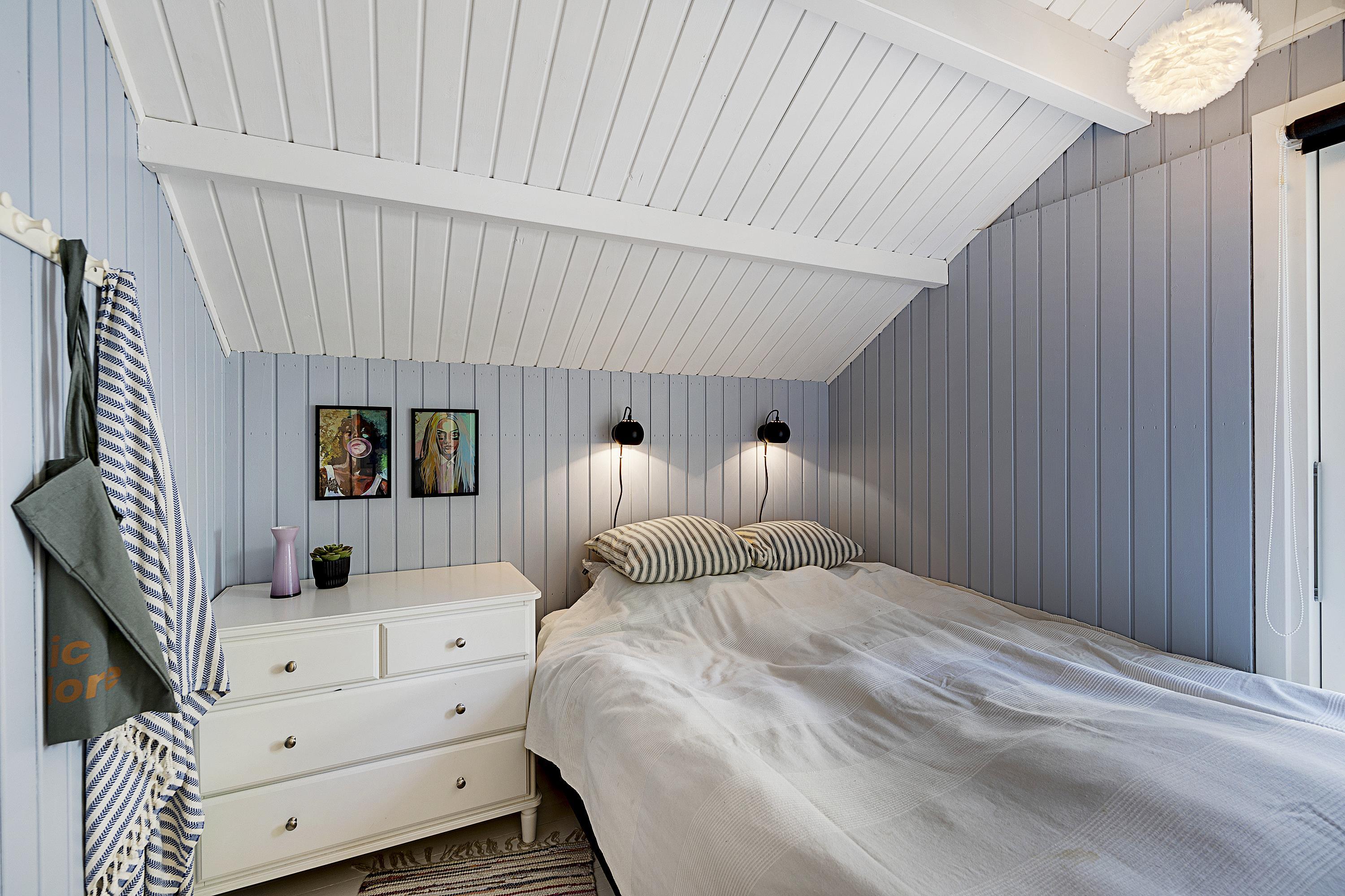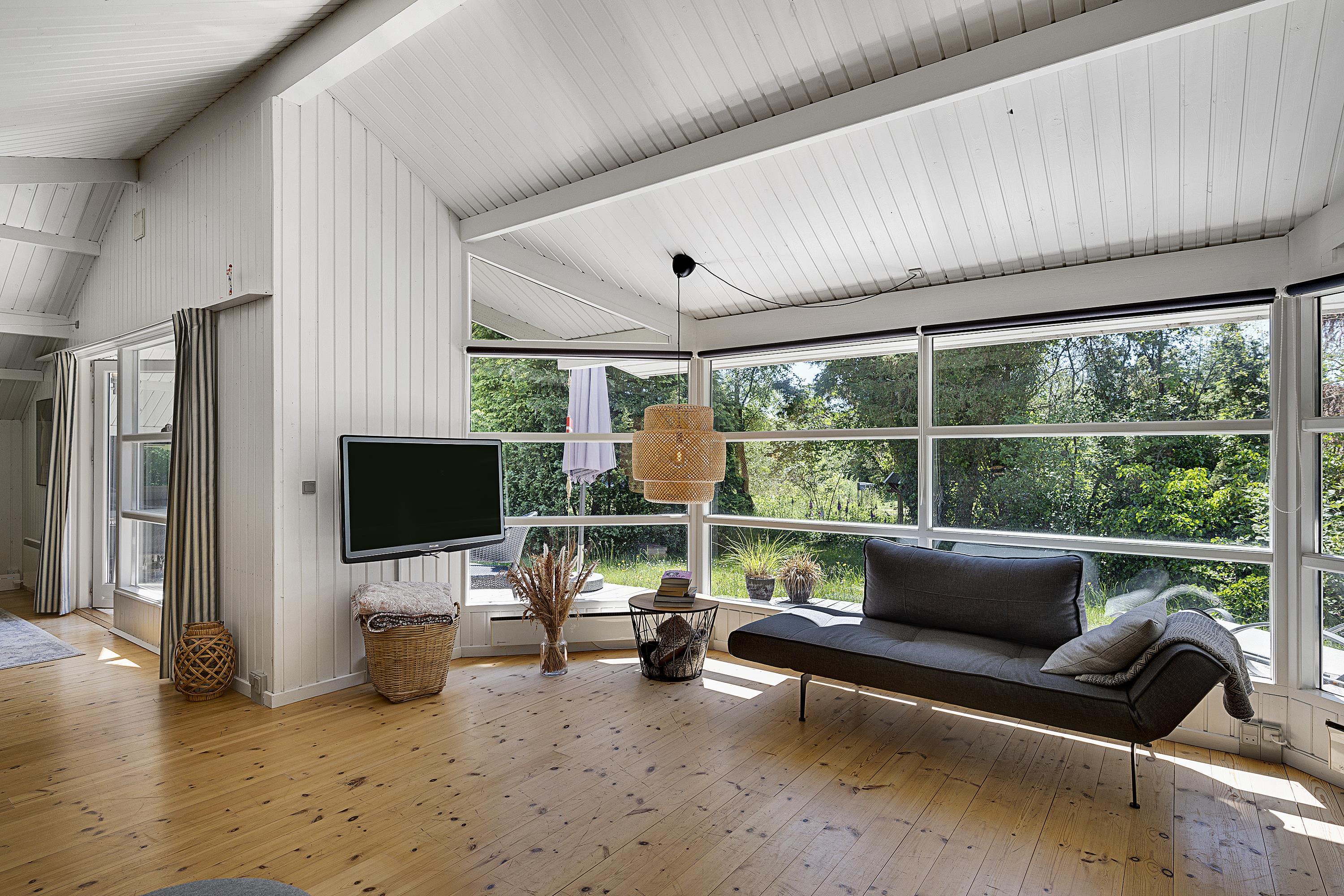 Das helle, bis zum Dachfirst hin offene Wohnzimmer ist weiß gestrichen und hat einen schönen Kiefernholzboden sowie große Fensterpartien zur Südterrasse. Es ist mit geräumiger Sofaecke, Sesseln, Kaminofen, TV mit dänischen Programmen (inkl. TV2) und DVD-Player ausgestattet. Schicke, helle Wohnküche mit Essplatz für sechs Personen, viel Ablage- und Schrankfläche, Glaskeramikherd, Kühl-/Gefrierkombination, Geschirrspüler und Mikrowelle. Vom Flur aus besteht Zugang zu zwei guten Schlafzimmern mit Doppelbett – ein weiteres Doppelbett befindet sich im Nebengebäude (insgesamt sechs Schlafplätze). Geräumiges und helles Badezimmer mit Dusche. Im Schuppen neben der Terrasse steht eine Waschmaschine. Internetzugang.