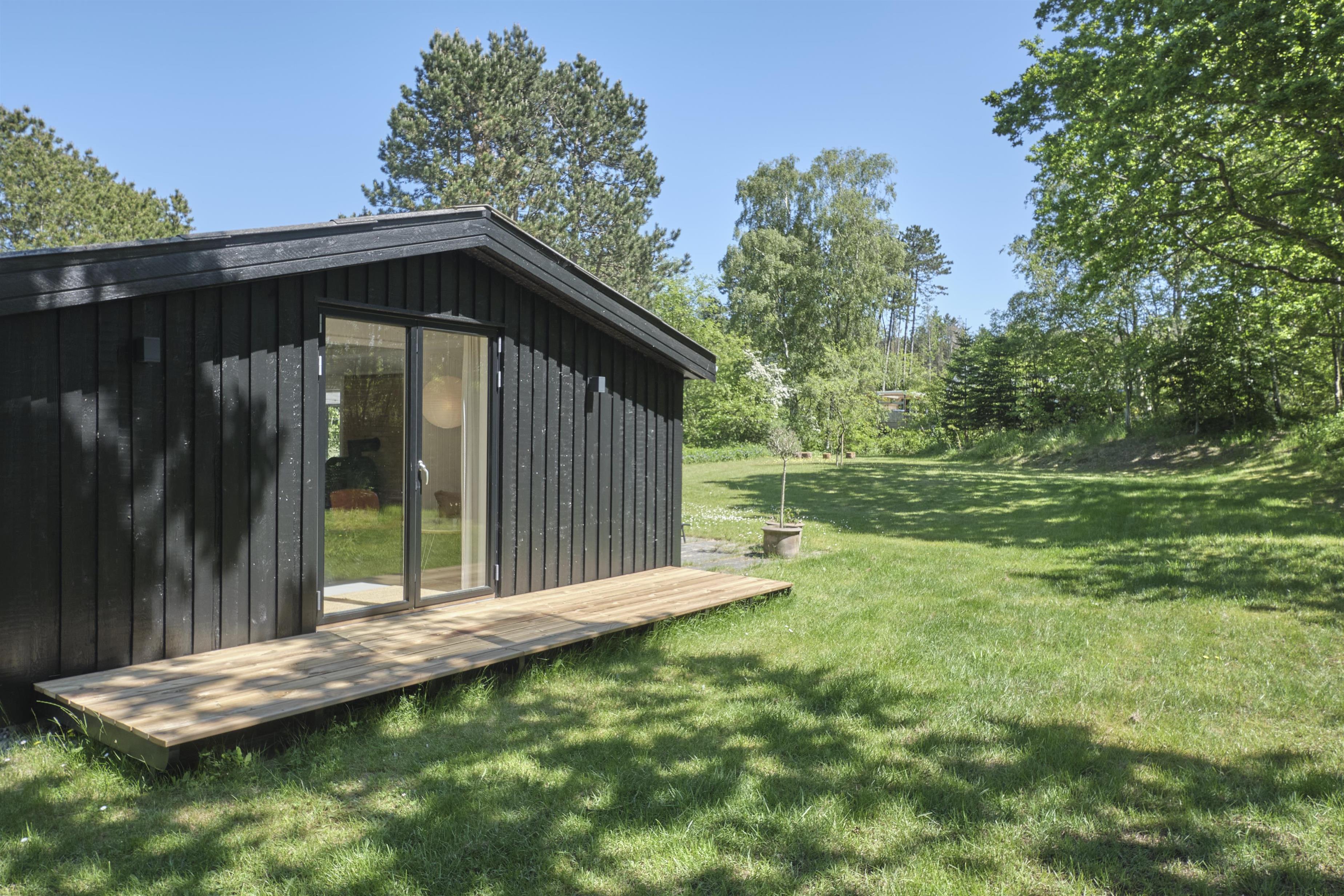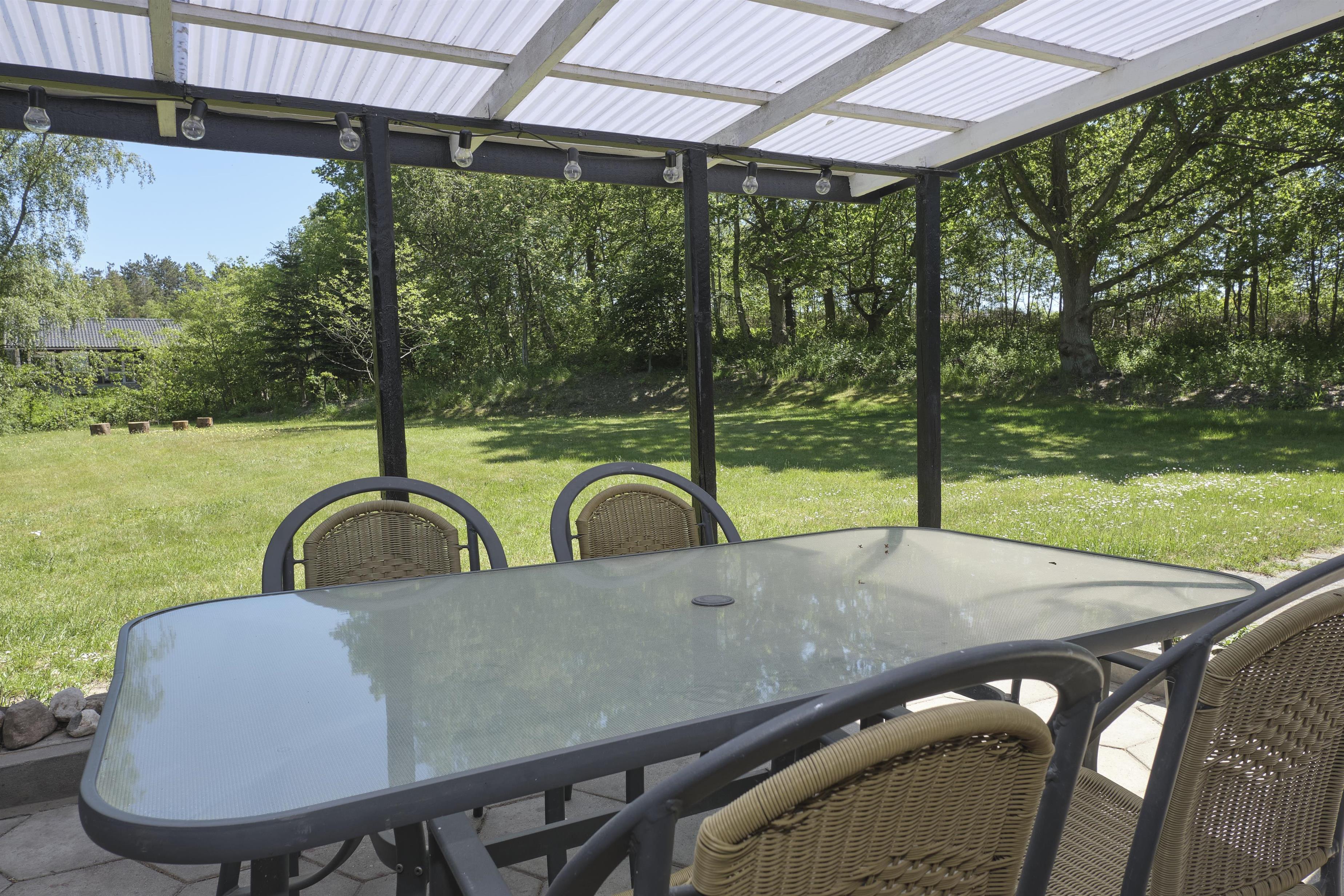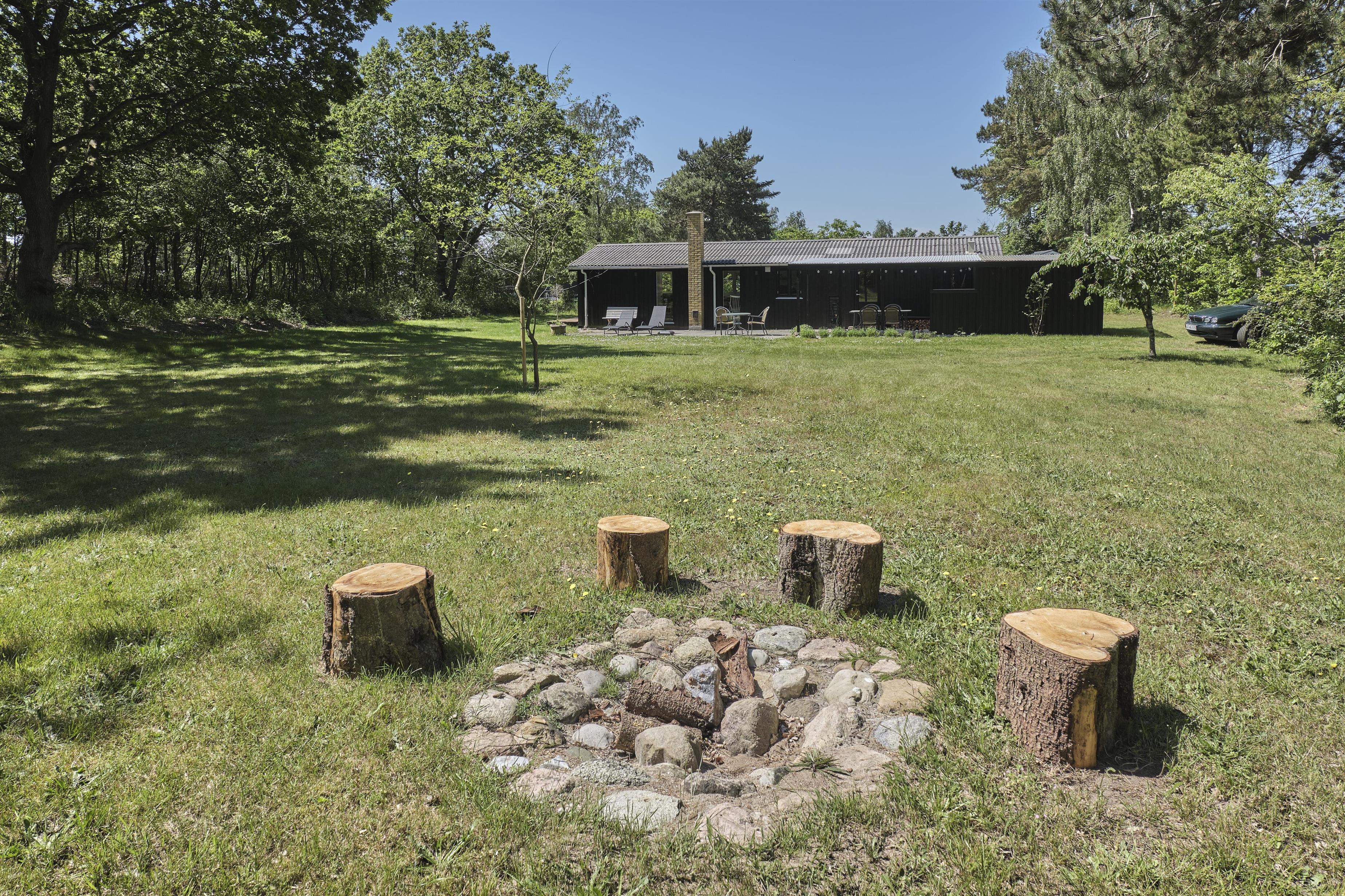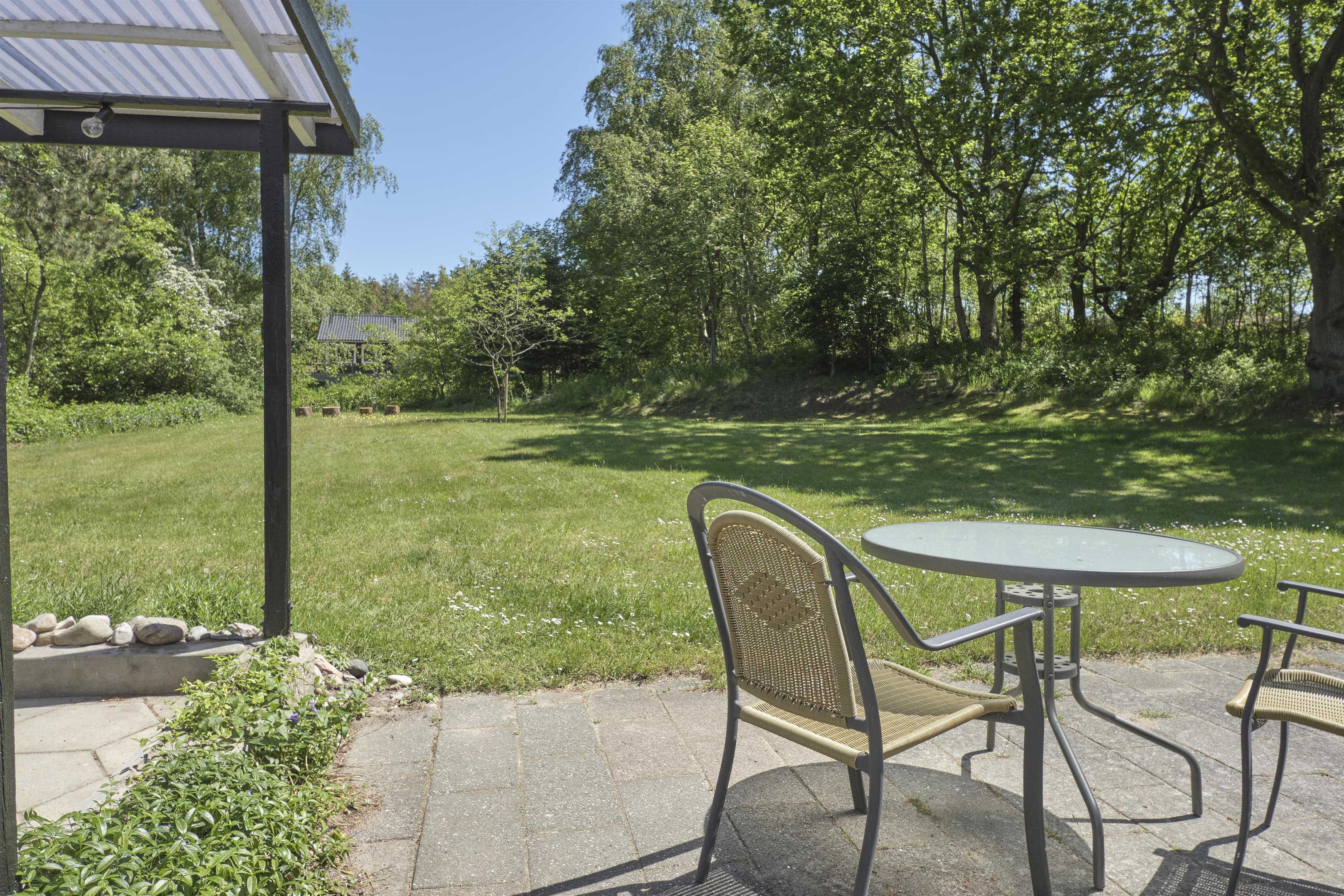 Dieses traditionelle, ältere und renovierte Ferienhaus liegt auf einem großen, bewachsenen Naturgrundstück unweit von Wald und Strand in der hügelige Landschaft südlich von Ebeltoft. Es hat eine große, nach Südosten gewandte und teilweise überdachte Fliesenterrasse und eine nach Süden gewandte Holzterrasse – beide mit Zugang vom Wohnzimmer. Sie sind mit Gartenmöbeln, Liegestühlen, Sonnenschirm und Grill ausgestattet. Auf dem Grundstück befindet sich auch eine gemütliche Feuerstelle.