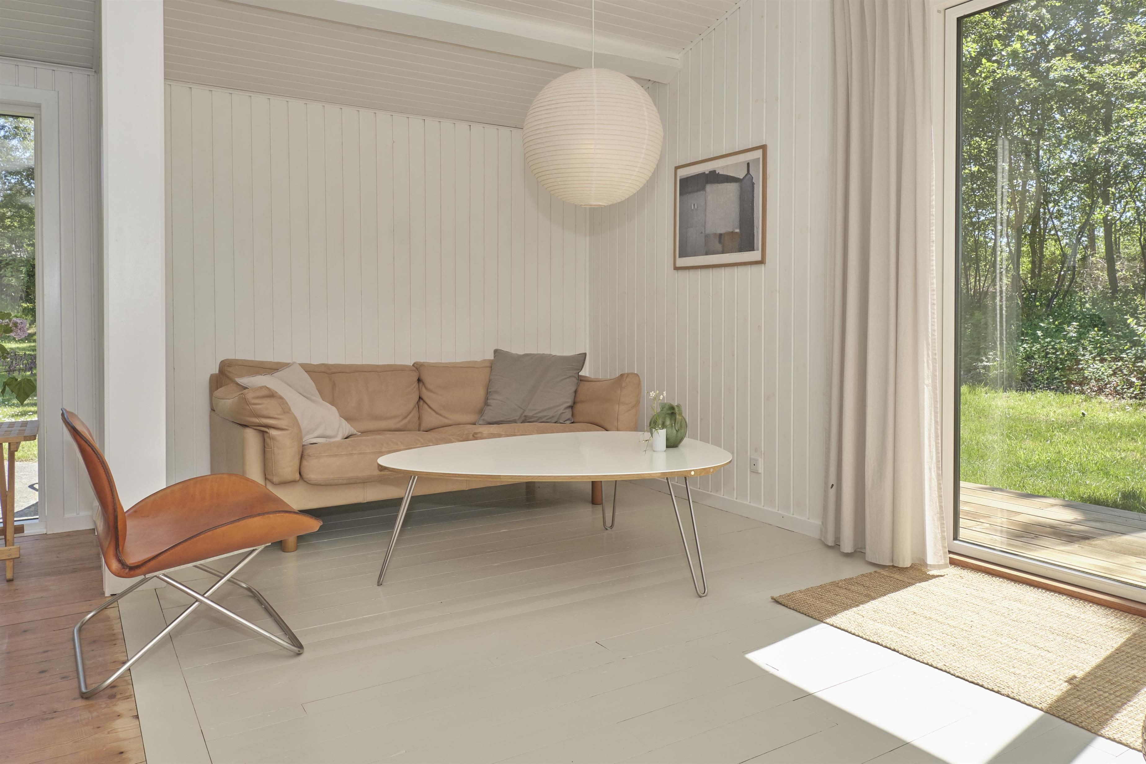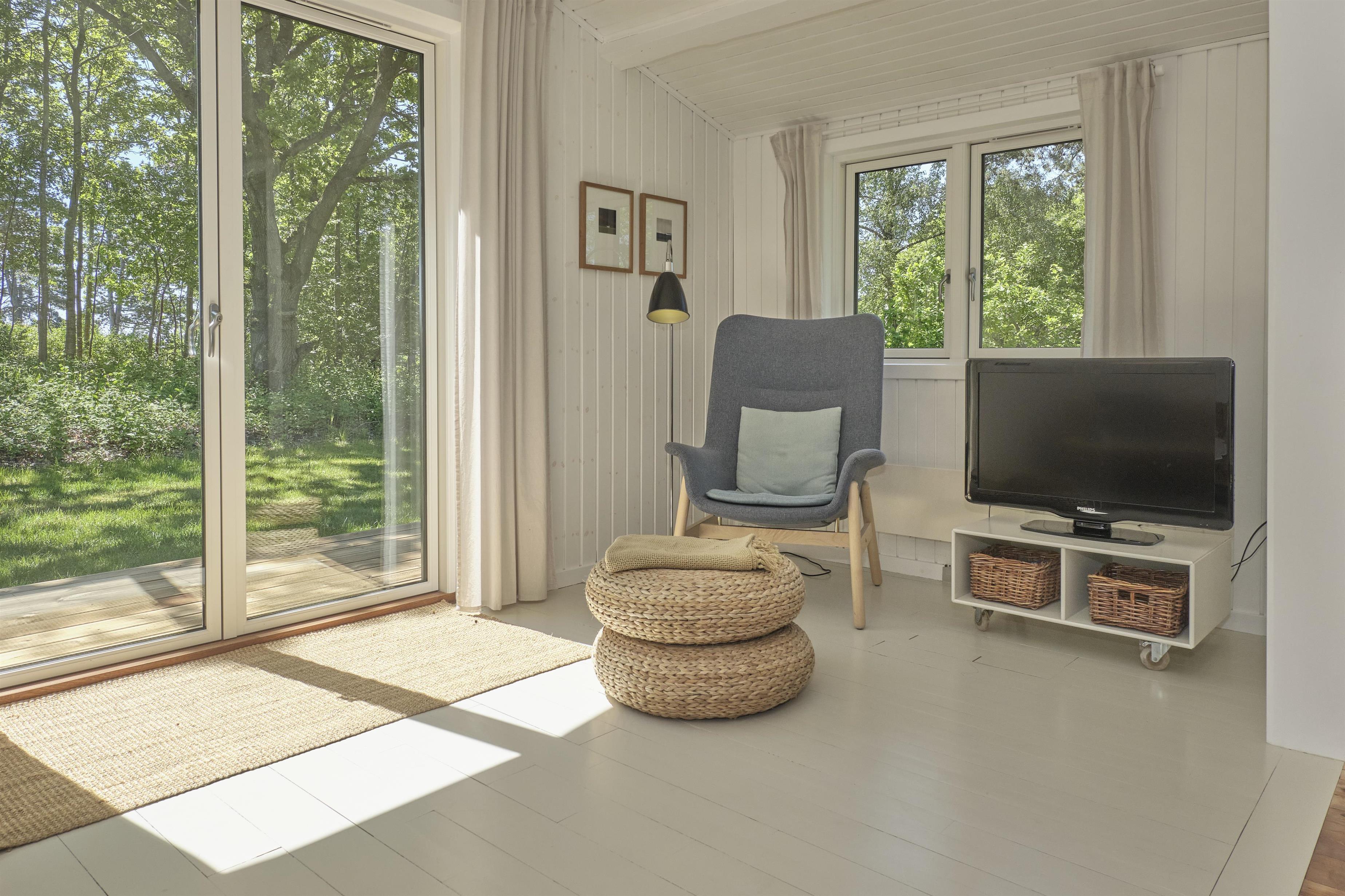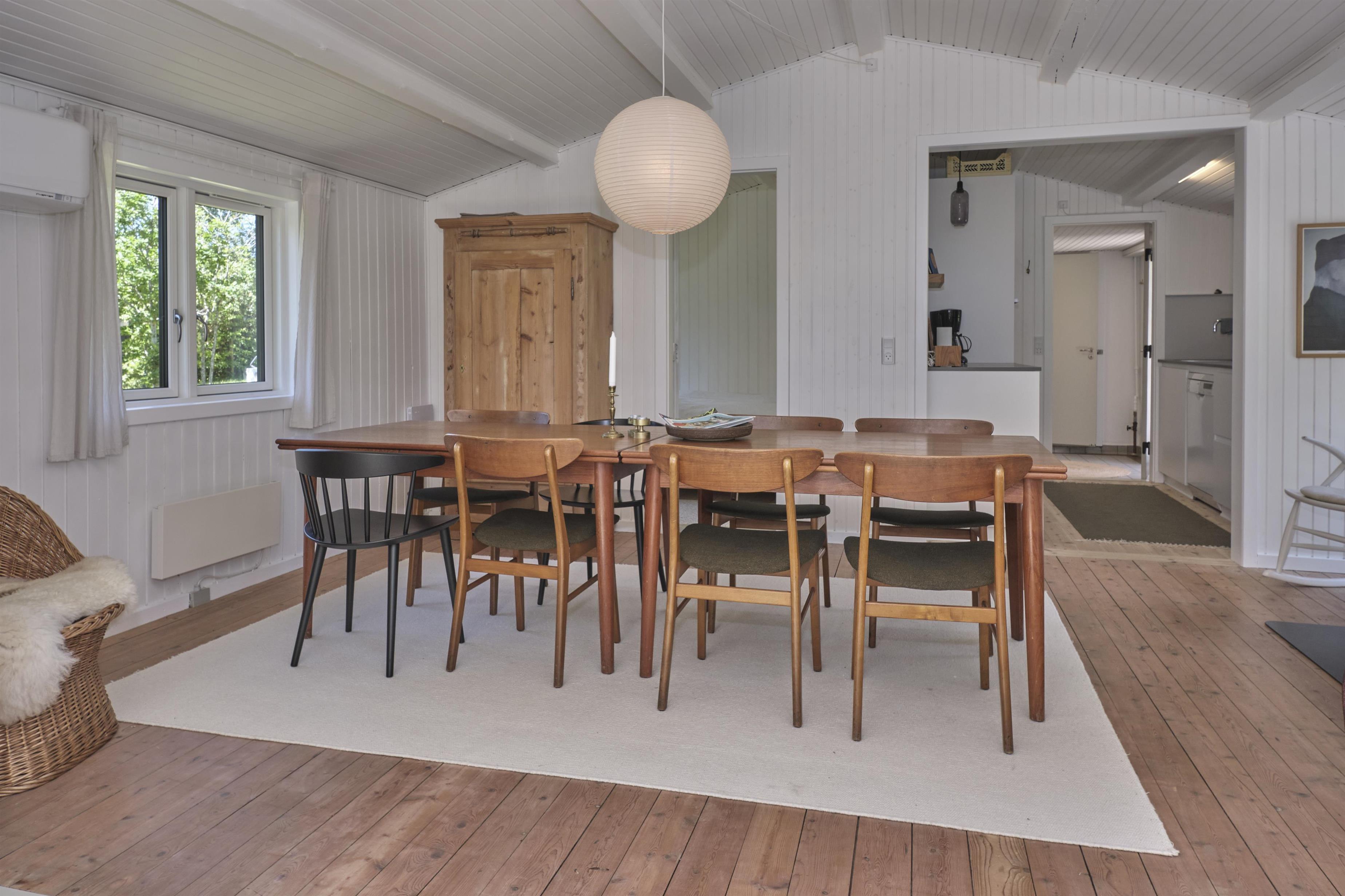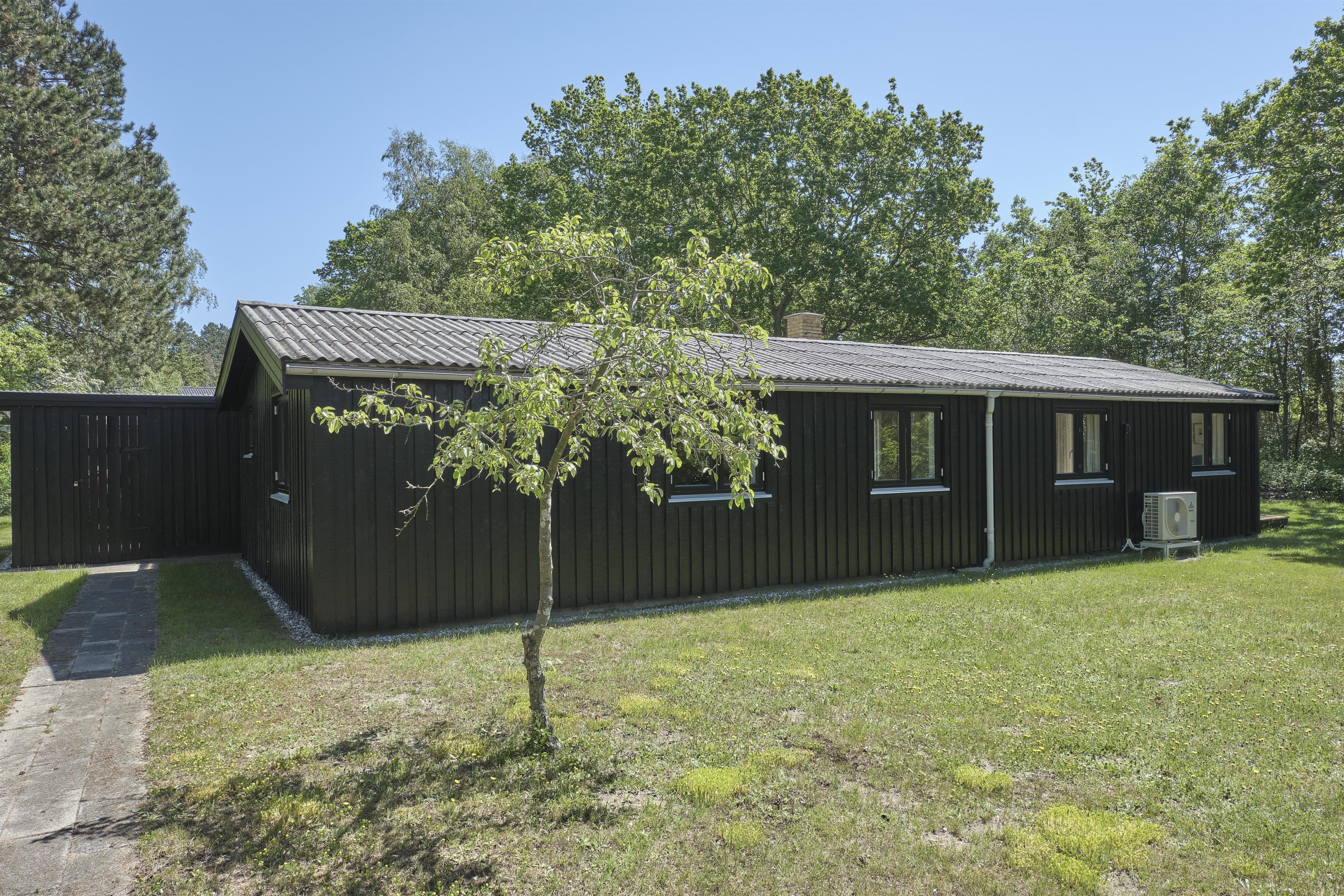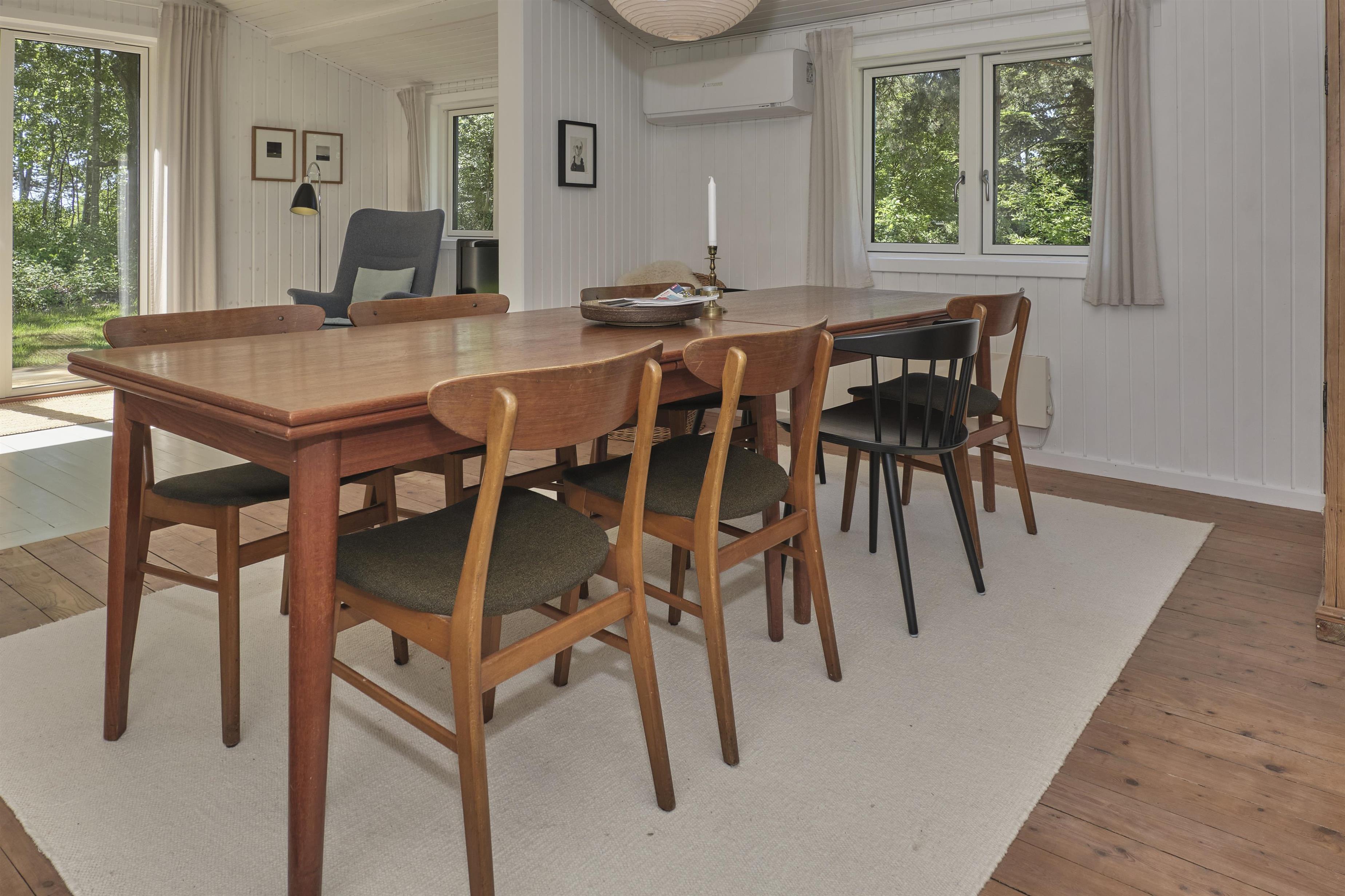 Dieses traditionelle, ältere und renovierte Ferienhaus liegt auf einem großen, bewachsenen Naturgrundstück unweit von Wald und Strand in der hügelige Landschaft südlich von Ebeltoft. Es hat eine große, nach Südosten gewandte und teilweise überdachte Fliesenterrasse und eine nach Süden gewandte Holzterrasse – beide mit Zugang vom Wohnzimmer. Sie sind mit Gartenmöbeln, Liegestühlen, Sonnenschirm und Grill ausgestattet. Auf dem Grundstück befindet sich auch eine gemütliche Feuerstelle.