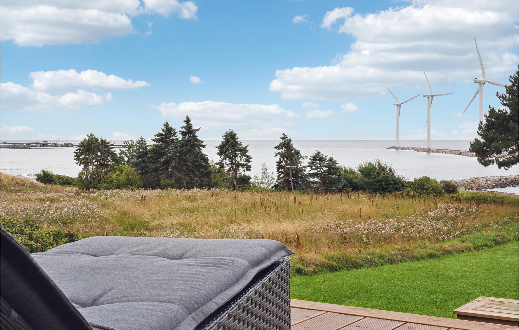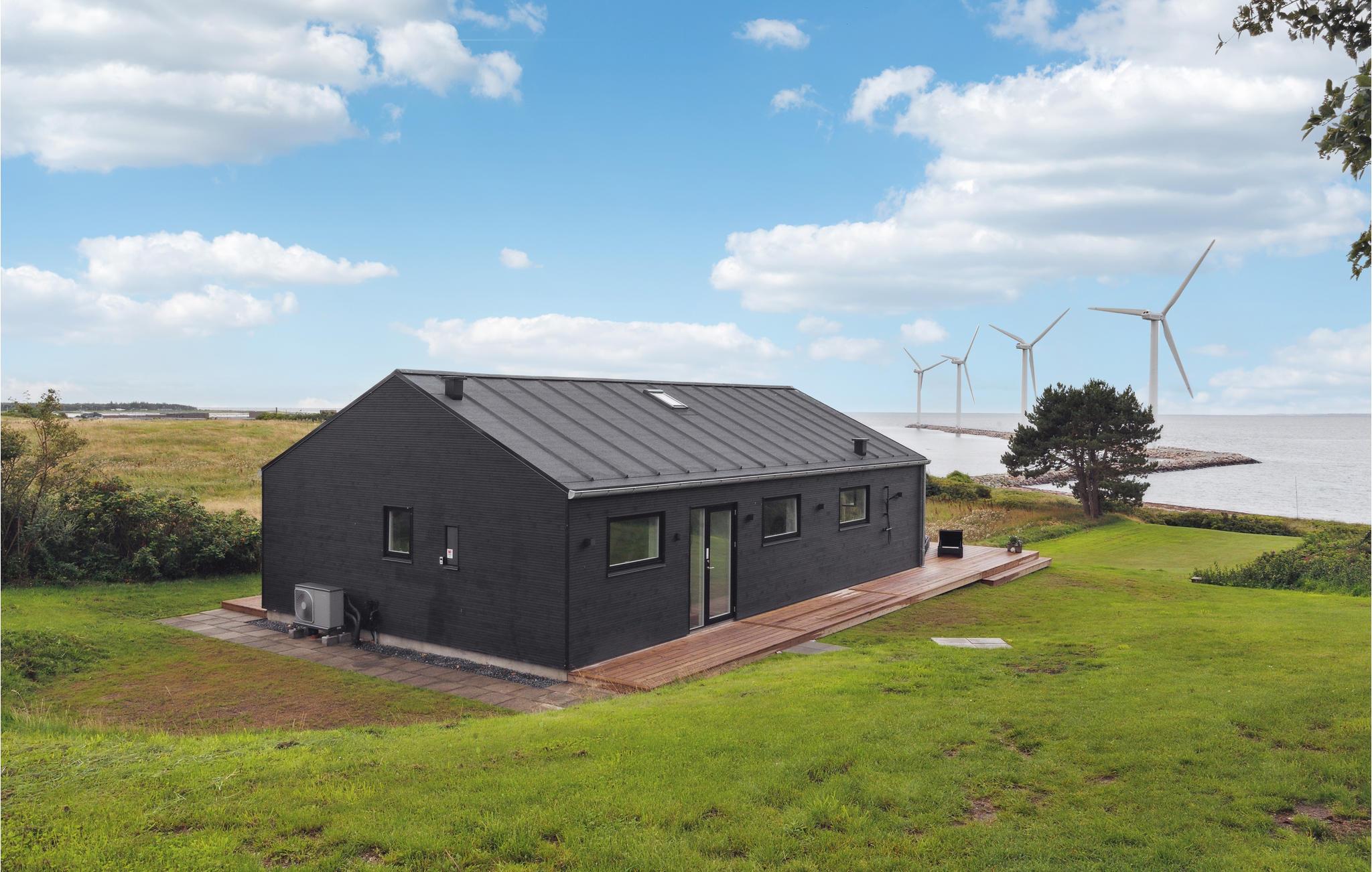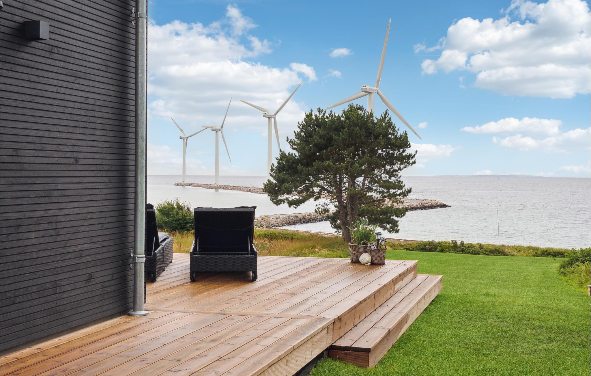 Modernes Ferienhaus in Alleinlage am Wasser mit Panoramablick auf Windräder und nah am Strand in Ebeltoft.