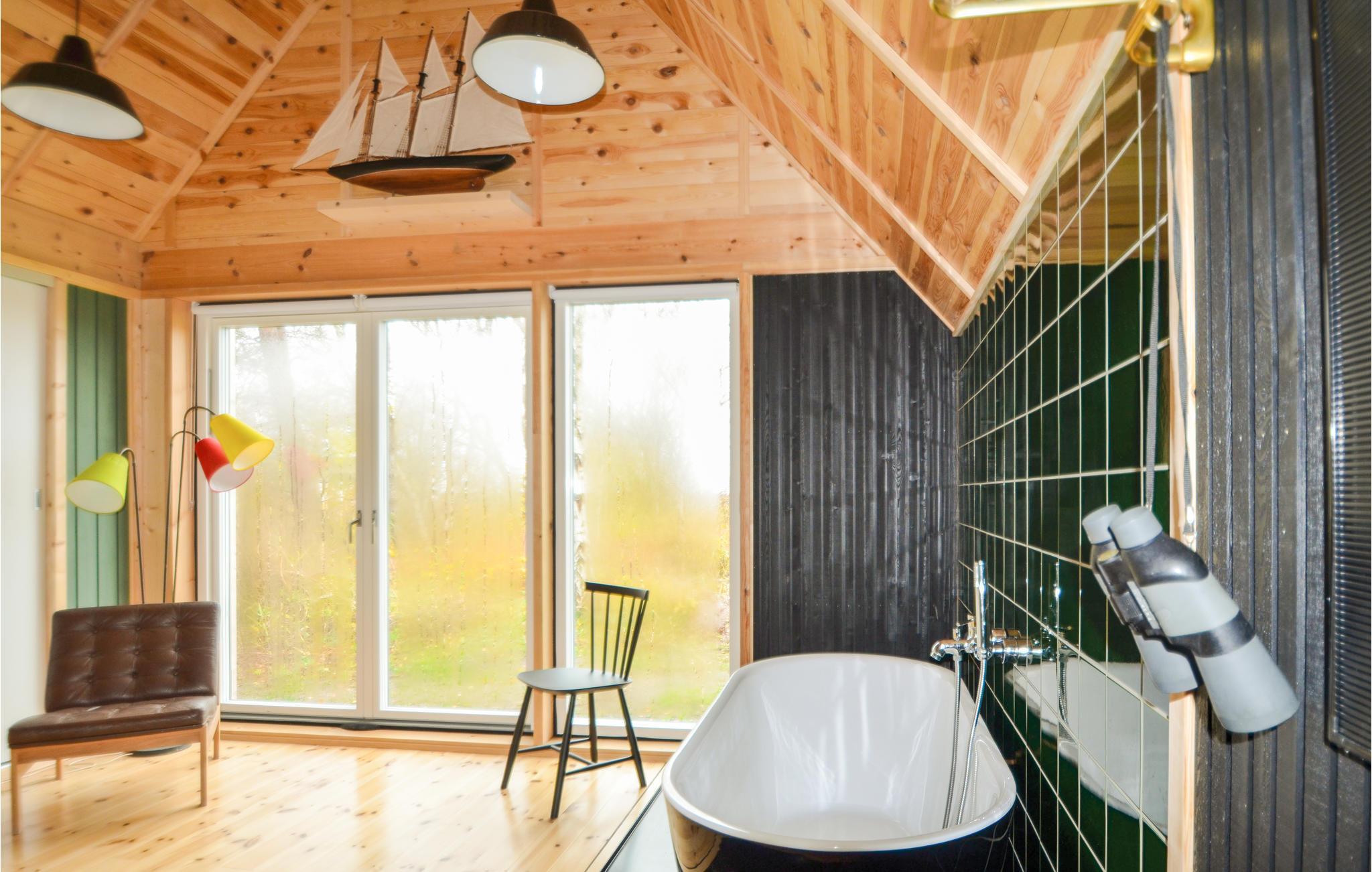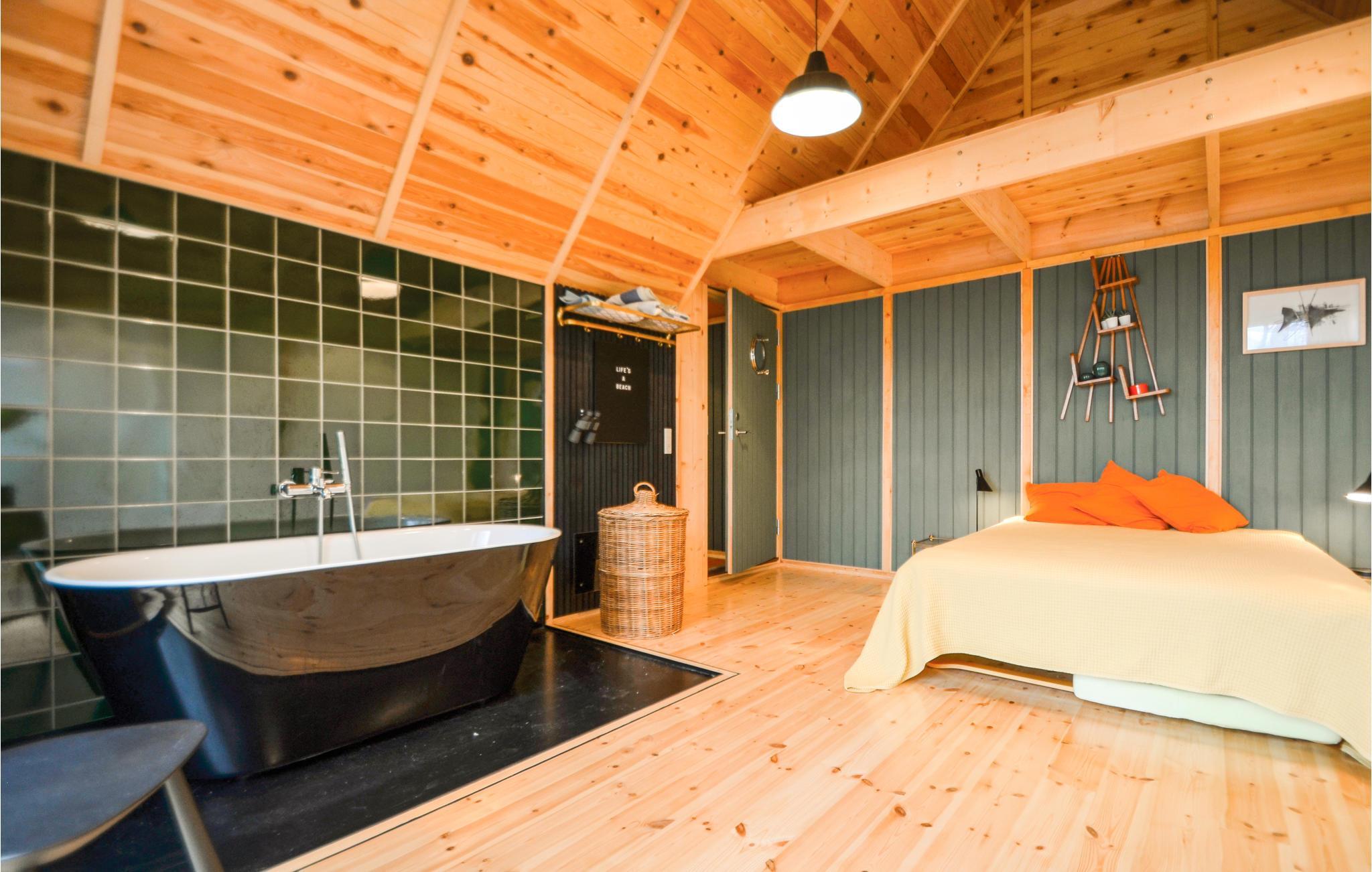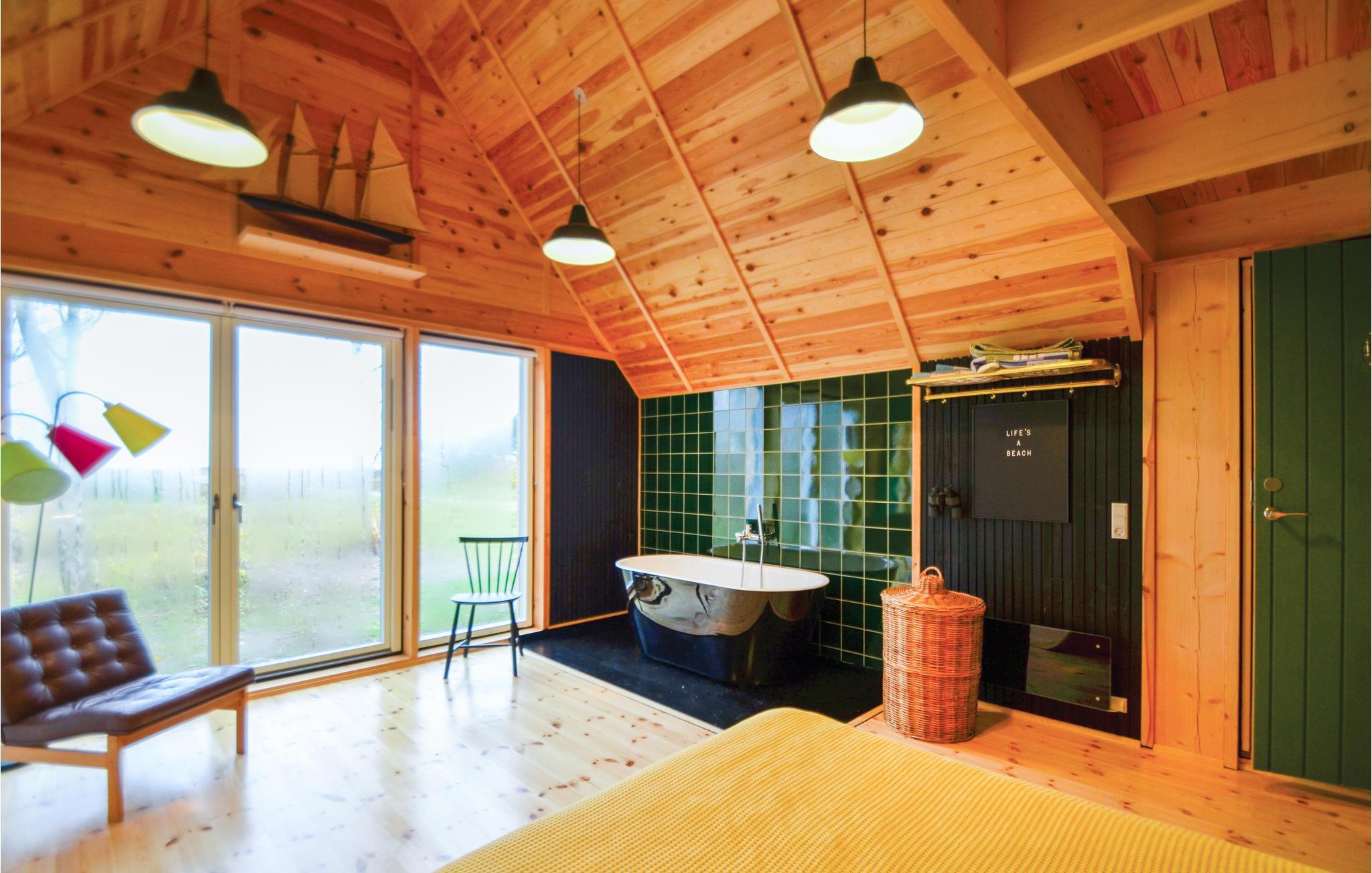 Modernes Ferienhaus direkt am Strand mit Meerblick, großer Terrasse und einzigartiger Badewanne im Schlafzimmer.
