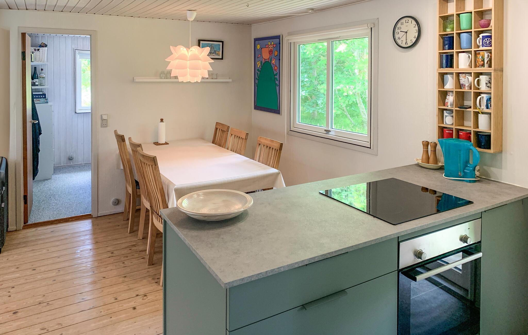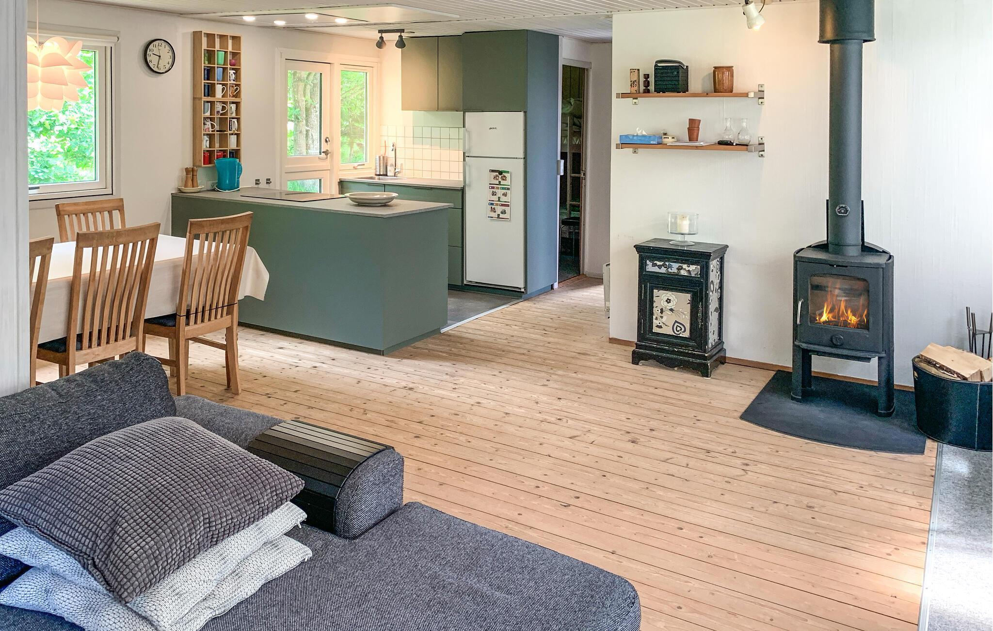 Verbringen Sie Ihren nächsten Urlaub in diesem gemütlichen Ferienhaus am Øer Strand, das Erholung und Entspannung verspricht. Das Haus bietet eine schöne Lage und eine großzügige Terrasse, die zum Sonnenbaden oder Grillen einlädt. Genießen Sie Ihren Morgen mit einem leckeren Frühstück im Wintergarten des Hauses, bevor Sie sich auf den bequemen Sofas im freundlich gestalteten Wohnzimmer entspannen. Die offene Gestaltung von Küche und Wohnbereich schafft eine einladende Atmosphäre für gesellige Abende mit der Familie oder Freunden.