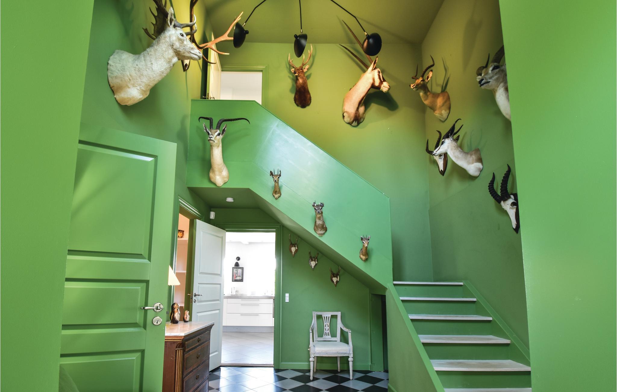 Bei der Ankunft kann man nicht umhin, das erstaunlich schöne und einzigartige Gartenzimmer mit Kaminofen und Sofagruppe zu bemerken. Danach betreten Sie die grüne Halle, die mit Jagdtrophäen geschmückt ist, und gehen weiter in die große Küche, die ganz natürlich zum Mittelpunkt des Hauses wird. Das geräumige helle Wohnzimmer enthält sowohl das Sofa als auch den Esstisch für alle Gäste.