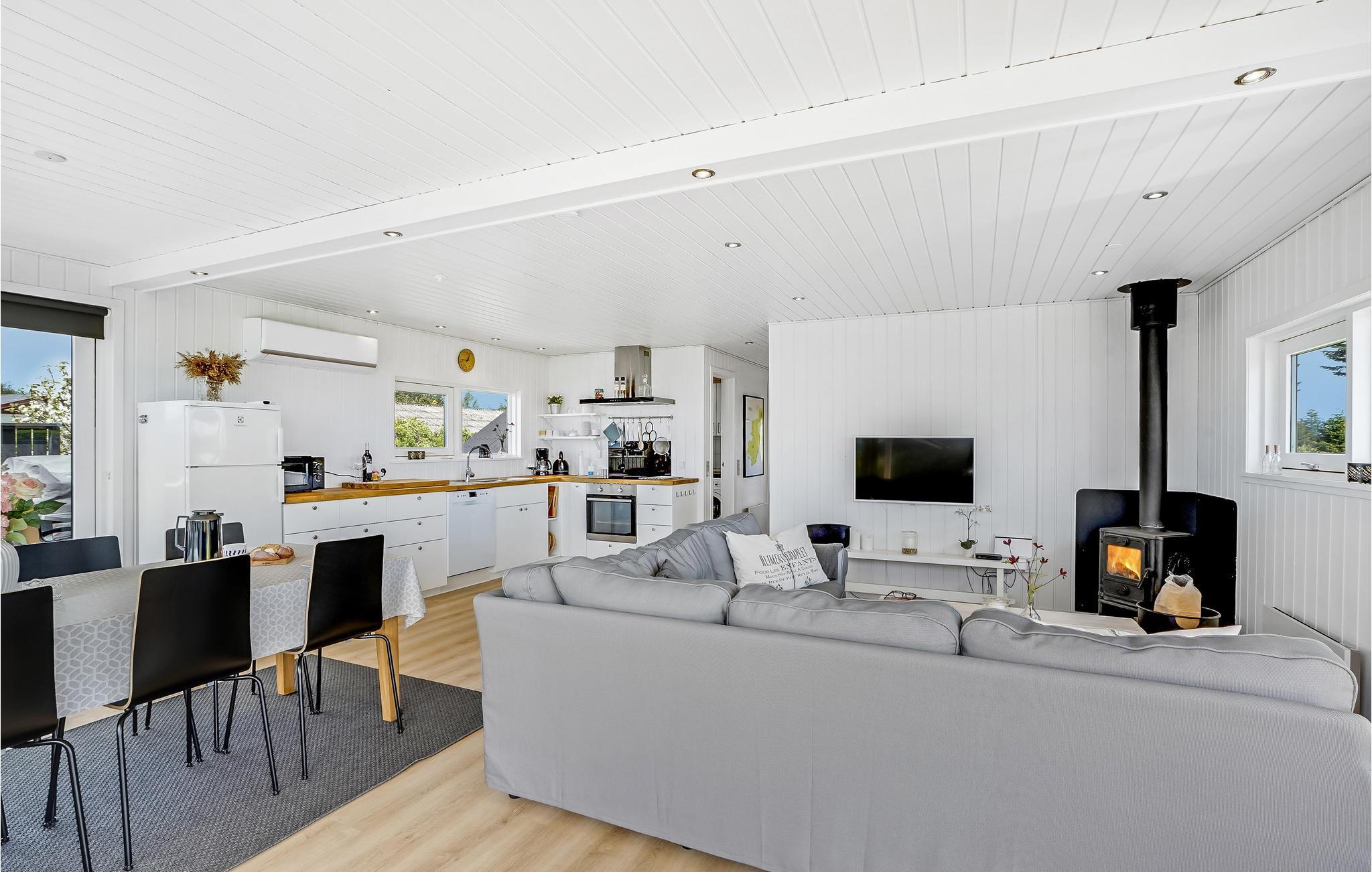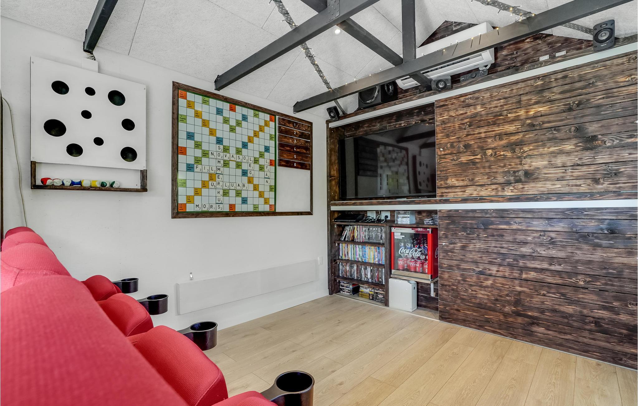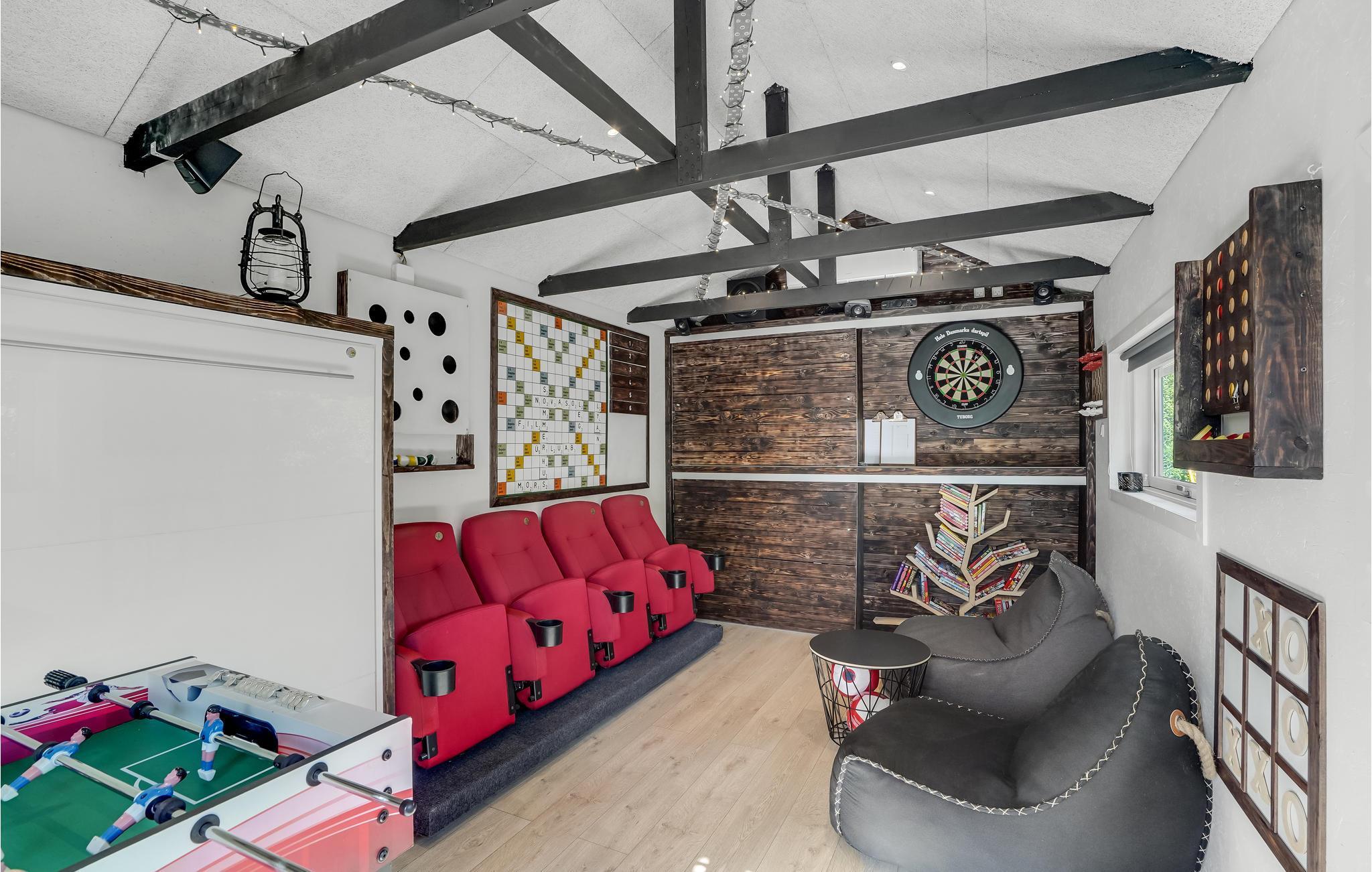 In diesem ansprechenden und renovierten Ferienhaus steht alles bereit für einen erholsamen Urlaub mit der ganzen Familie. Das Haus bietet mit 3 Schlafzimmern Platz für bis zu 6 Personen. Die Einrichtung der Räumlichkeiten ist hell und modern, durch große Fenster gelangt viel Licht ins Innere des Hauses. Vom Essplatz haben Sie einen wunderbaren Blick ins Freie, und der Kaminofen spendet zusätzliche Gemütlichkeit. Im Nebengebäude kann man sich gegenseitig zu verschiedenen Spielen herausfordern oder sich in die Kinosessel setzen und einen guten Film ansehen.