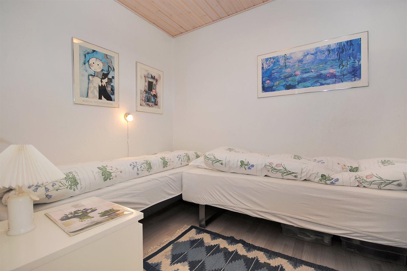 Es gibt einen Schlafraum. 2 Schlafplätze in Einzelbetten. 2 Schlafplätze auf einer Doppelschlafcouch.