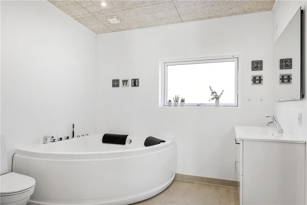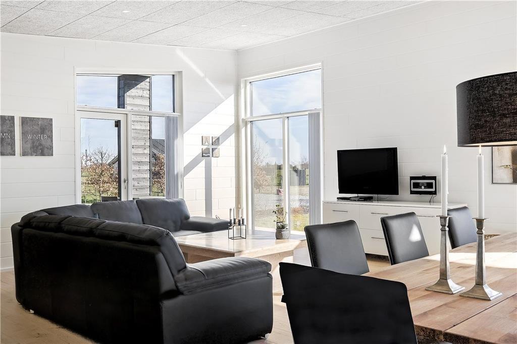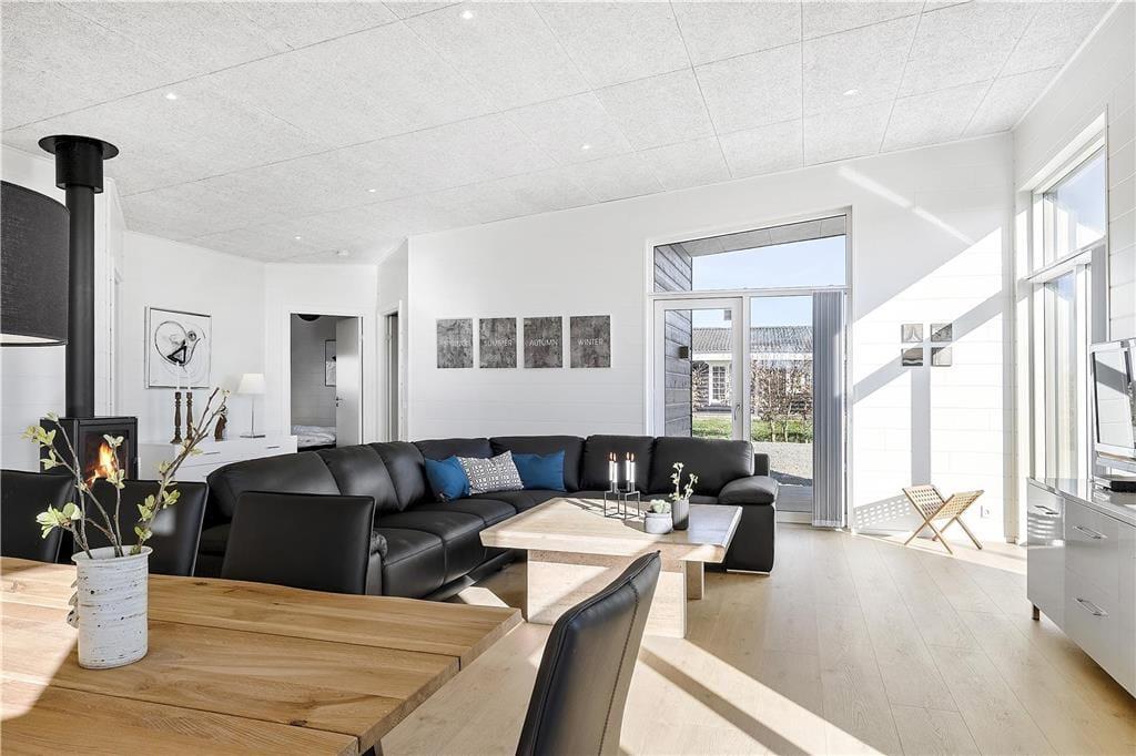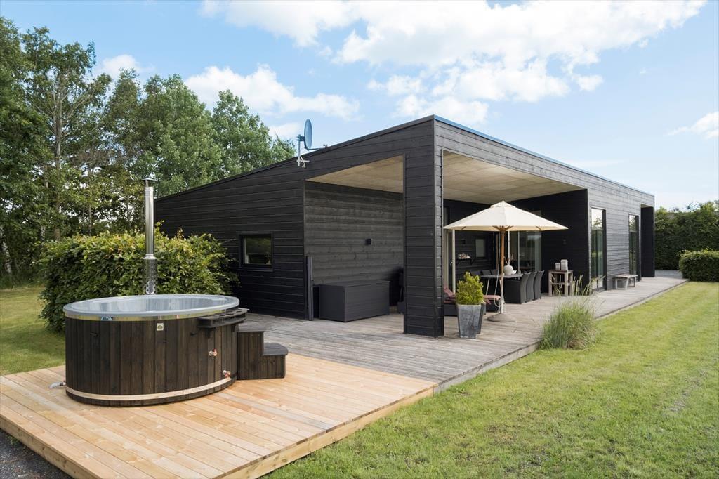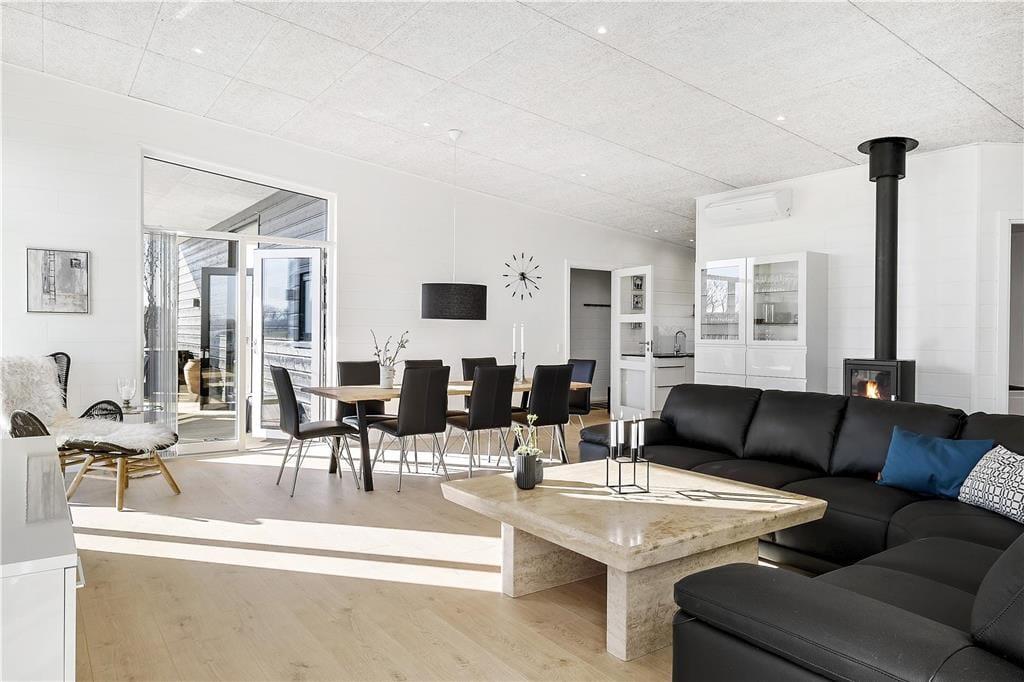Das Ferienhaus, gebaut 2019, zeichnet sich durch hohe Qualität aus. Der Wohnbereich ist stilvoll und sehr komfortabel eingerichtet, während die großzügige Verglasung für viel Tageslicht sorgt. Sie können sich auf ganzen 158 m² ausbreiten. Ihnen zur Verfügung steht unter anderem ein großes Wohnzimmer mit Kaminofen und integrierter Küche. Darüber hinaus gibt es vier Schlafzimmer, von denen je zwei auf je einer Seite des Hauses liegen, weshalb sich das Haus hervorragend für zwei Familien eignet, die gemeinsam verreisen möchten. Es gibt zwei Badezimmer, von denen eines auf Luxus-Niveau mit Whirlpool und Sauna ausgestattet ist. Wenn Sie sich gerade nicht bei einem warmen Bad entspannen möchten, können Sie sich anstelle dessen auch im hauseigenen Aktivitätsraum im Billard, Tischkicker oder Dart messen.