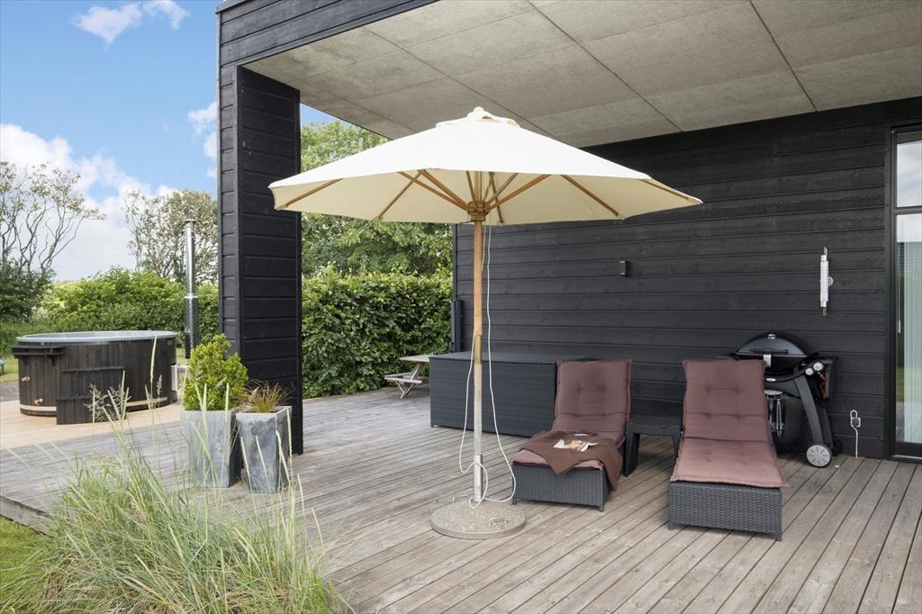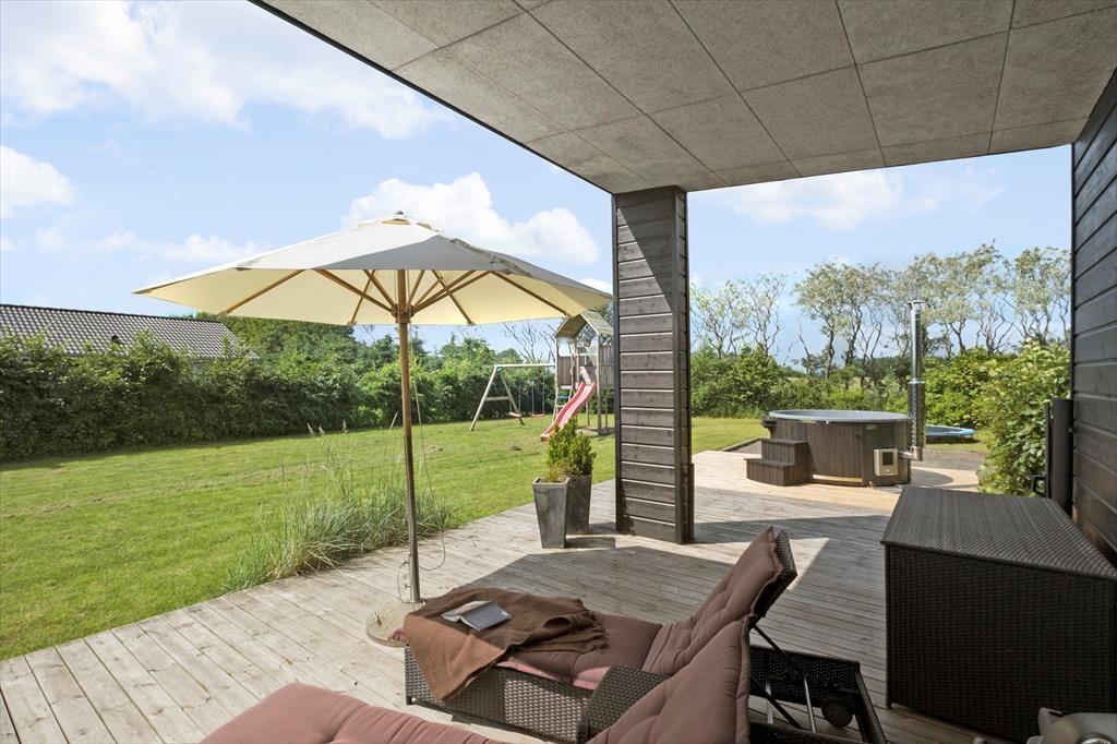 Das Haus wird von einer großen Terrasse flankiert, welche perfekt im Verhältnis zur Sonne angelegt ist. Wenn Sie Schatten wünschen, können Sie es sich in den Gartenmöbeln unter der Markise bequem machen. Der Carport bietet Schutz für Ihr Auto. Der Garten ist frisch und durchdacht angelegt und bietet u. a. eine Sandkiste und ein Klettergerüst für die jüngsten Feriengäste und in Whirlpool, wenn Sie wirklich entspannen wollen. Darüber hinaus befindet sich im Garten auch eine Feuerstelle, an der Sie sich am Ende des Tages in gemütlicher Sitzrunde entspannen können.