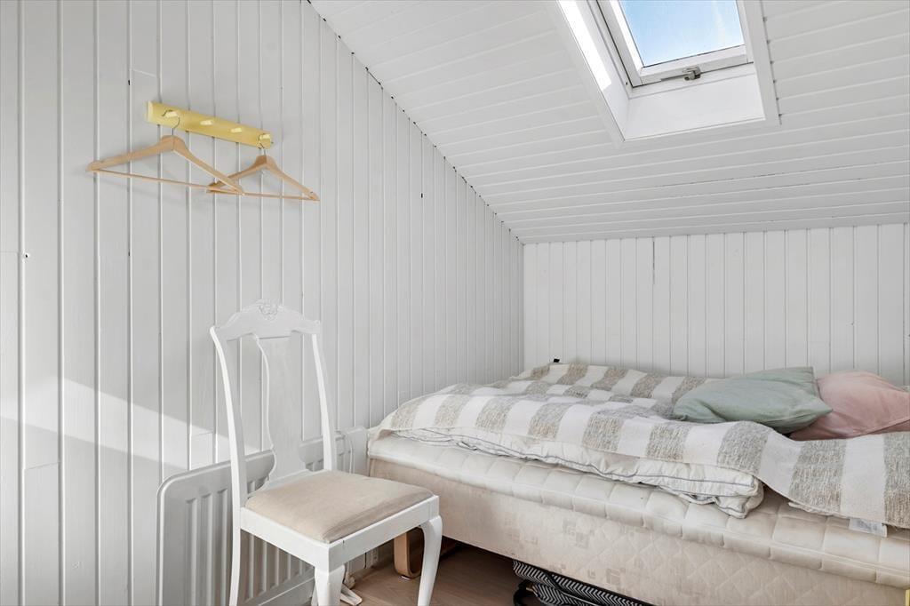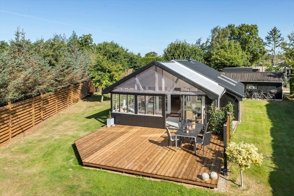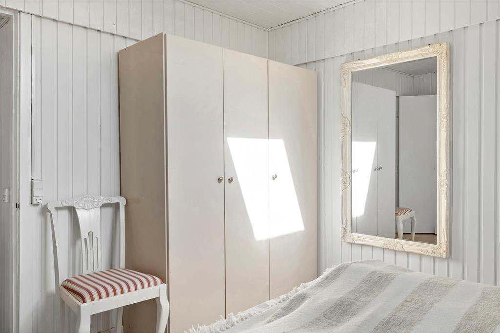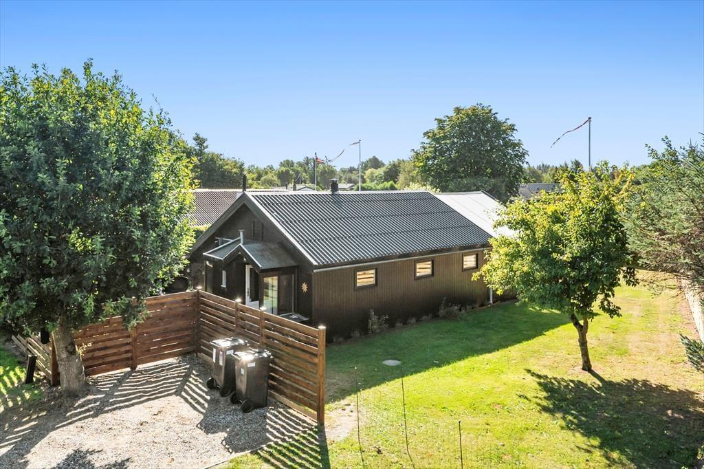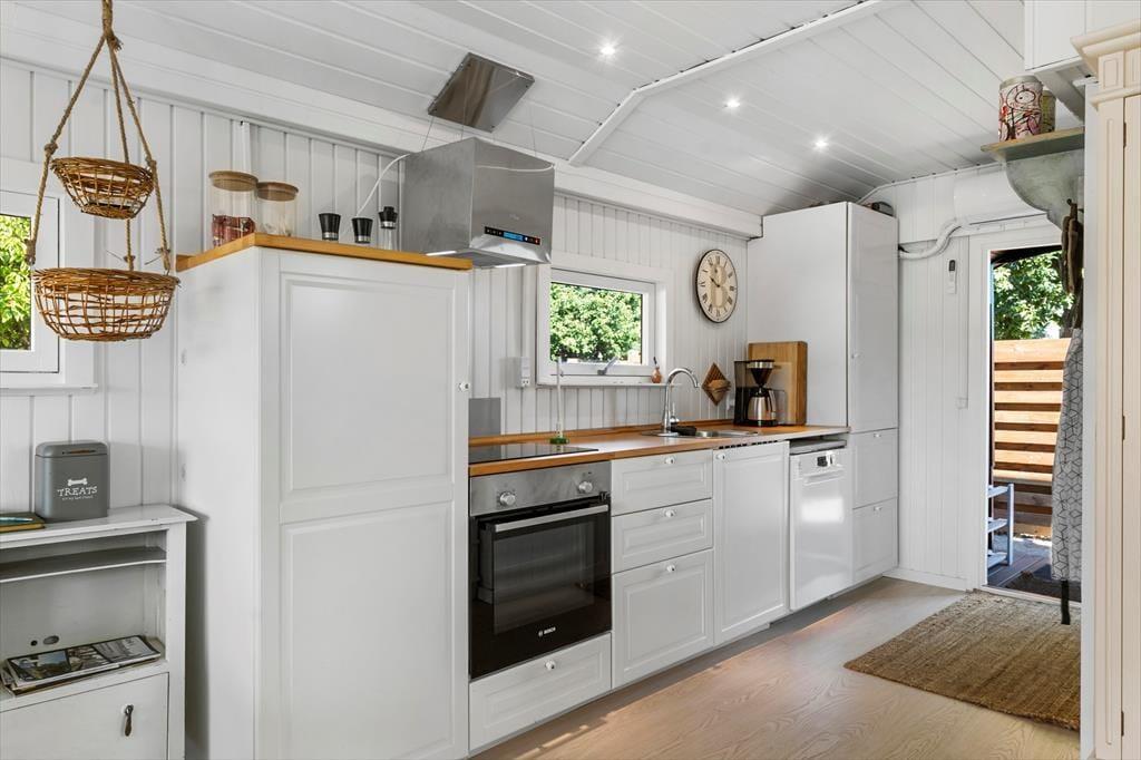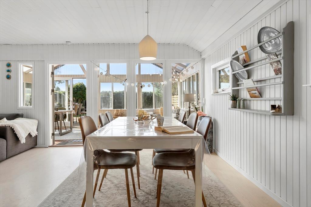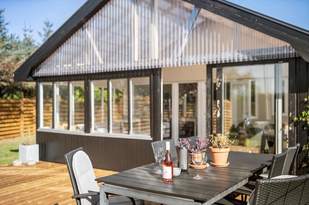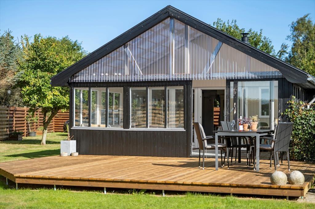 Das Ferienhaus ist ein klassisches dänisches Sommerhaus mit einer schwarz gestrichenen Holzfassade und weißen Fensterrahmen, und die charmante Atmosphäre setzt sich fort, wenn Sie eintreten. Es gibt ein herrliches Licht von den vielen Fensterpartien, und die weiß gestrichenen Wände und Decken tragen zur hellen und freundlichen Stimmung bei. Die Küche ist in den offenen Wohnbereich integriert, sodass Sie problemlos kochen können und dennoch an den Gesprächen am Tisch teilnehmen können. Das gemütliche Beisammensein kann auch in den angrenzenden Wintergarten verlegt werden, wo das Licht noch großzügiger ist – und von hier aus können Sie übrigens direkt in den Garten gehen. Das Haus enthält außerdem zwei Schlafzimmer und ein Badezimmer.