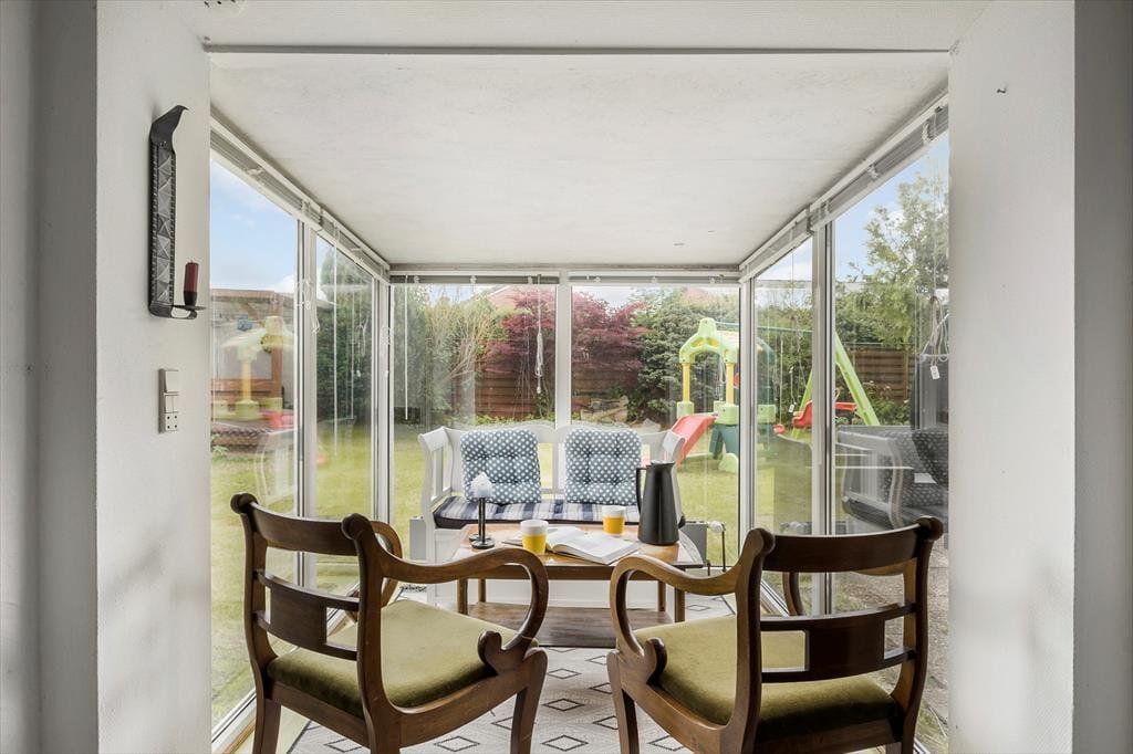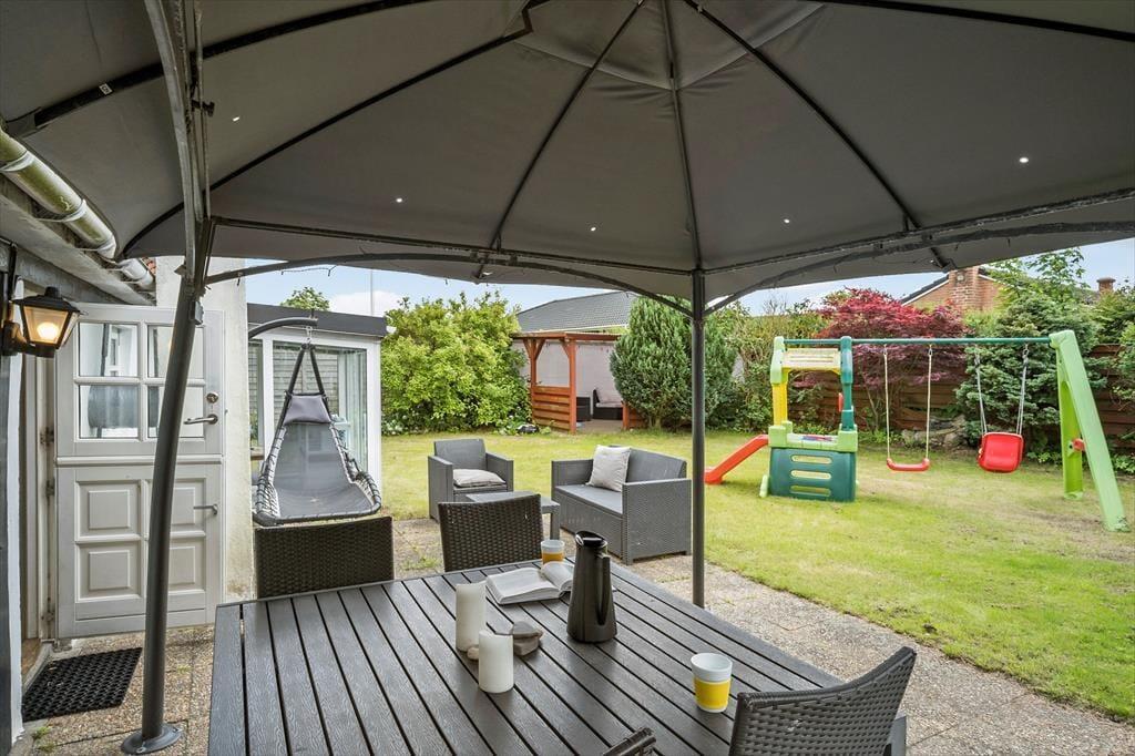 Draußen kannst du das Leben in der schönen Umgebung wirklich genießen. Der große Garten ist ideal zum Spielen und Entspannen für Kinder und Erwachsene. Hier können die Kinder herumlaufen und spielen, während die Erwachsenen sich auf den Gartenmöbeln der überdachten Terrasse entspannen. Die überdachte Terrasse ist auch perfekt für gemütliche Mahlzeiten im Freien, unabhängig vom Wetter. Hier kannst du den Morgenkaffee, das Mittagessen und das Abendessen genießen, während du den schönen Garten bewunderst. Am Abend kannst du den Grill anfeuern und leckere Grillgerichte zubereiten, während die Sonne über der Landschaft untergeht. Mit direktem Zugang vom Wohnzimmer zur Terrasse ist es einfach, einen fließenden Übergang zwischen Innen- und Außenleben zu schaffen.