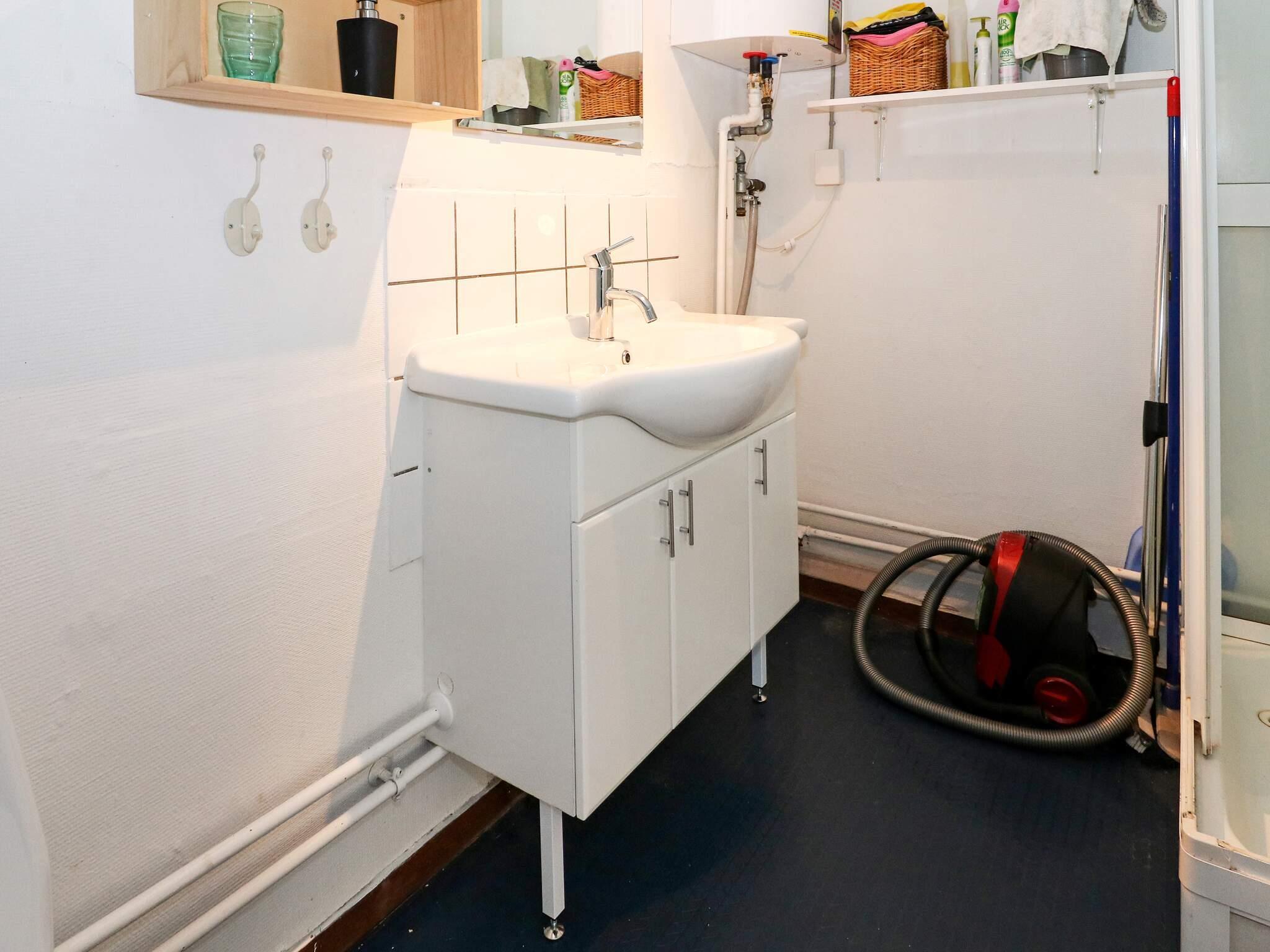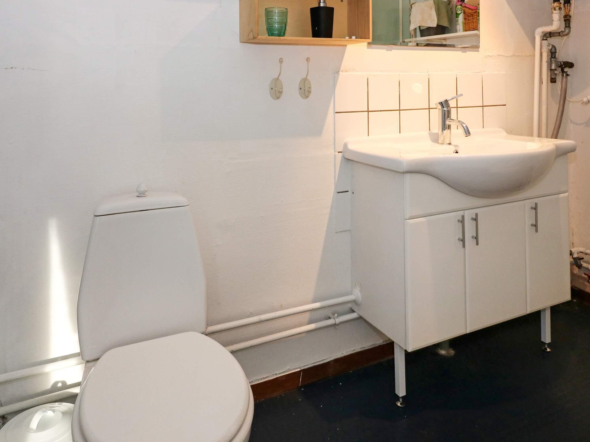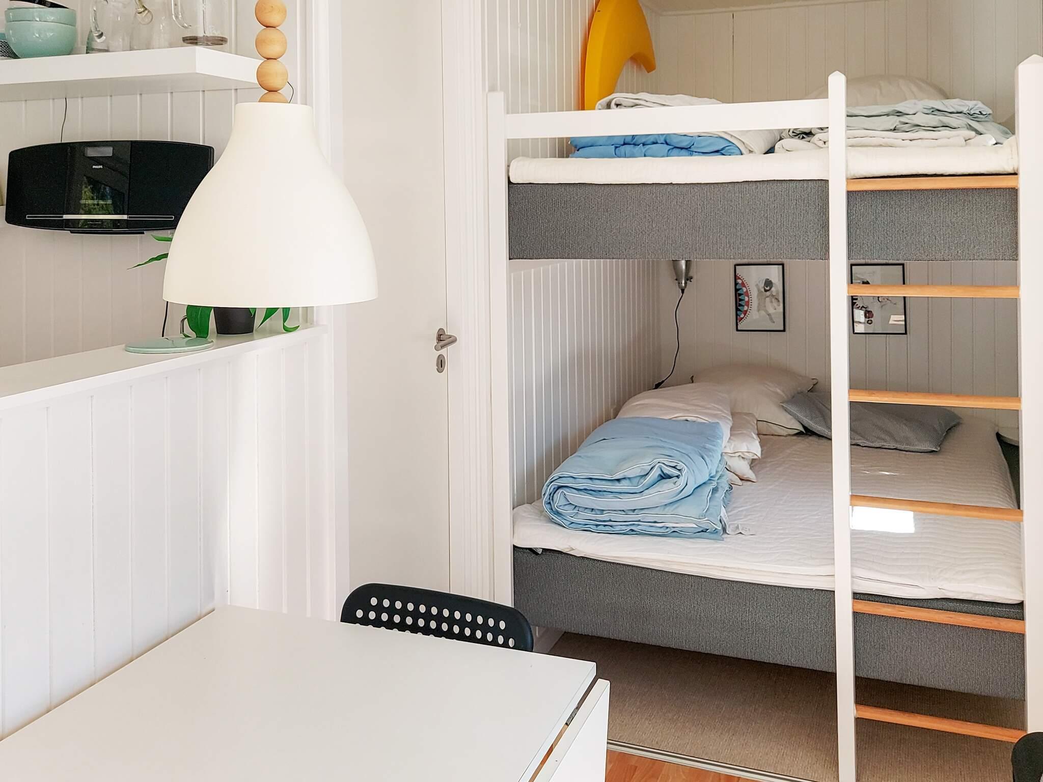 Im Haus helles Wohnzimmer mit Holzofen und doppelter Schlafcouch, in offener Verbindung zum Esszimmer und mit Zugang zur Terrasse. Im Anschluss daran abgeschirmter Schlafbereich (ohne Zimmertür) mit einem Etagenbett mit doppelter Liegefläche unten und Einzelkoje darüber. Von der Küche aus hat man ebenfalls Zugang zur Terrasse. Außerdem Bad mit Dusche und WC. Das Haus liegt auf einem schönen Grundstück mit Platz zum Entspannen und Spielen.
