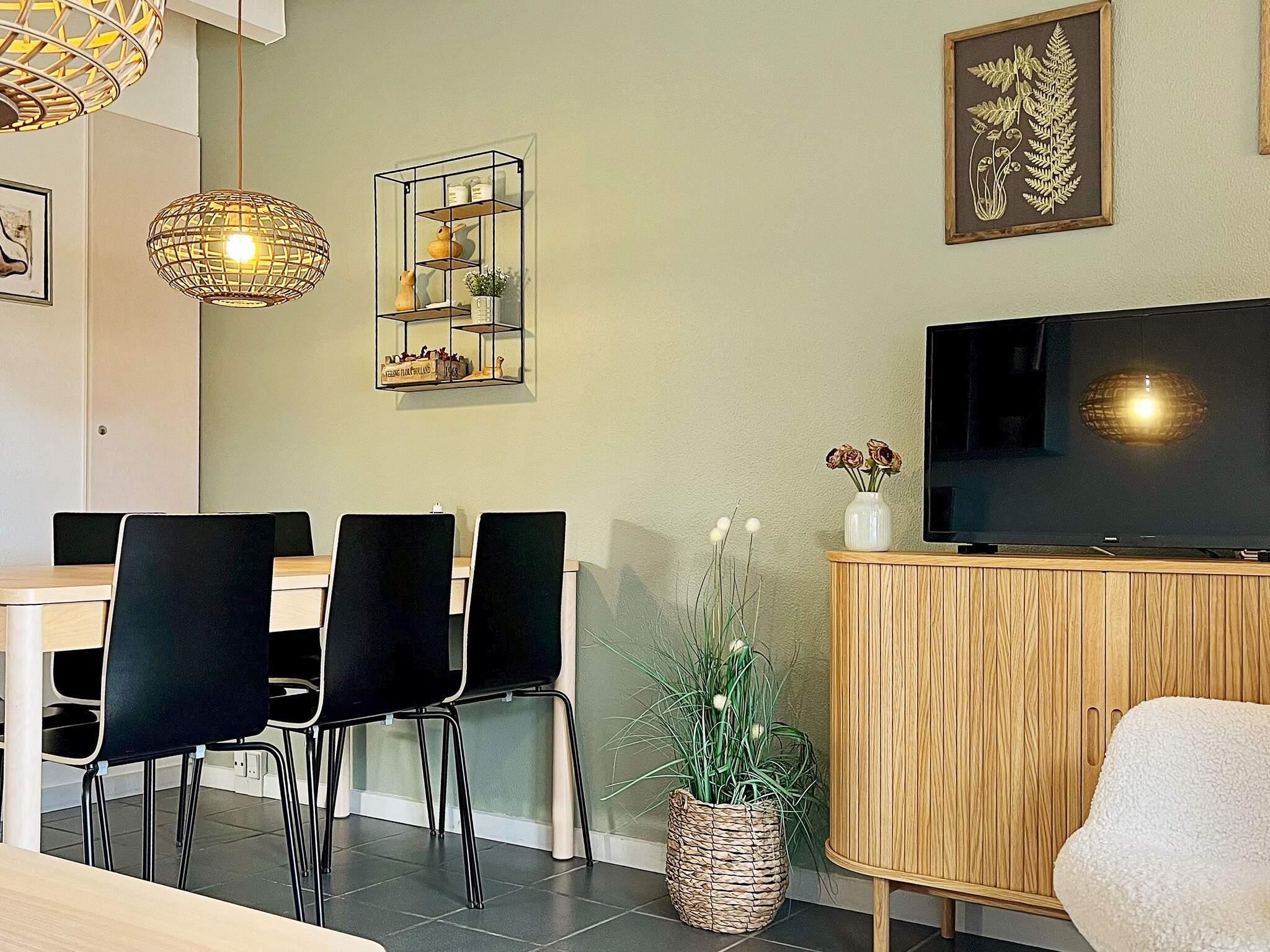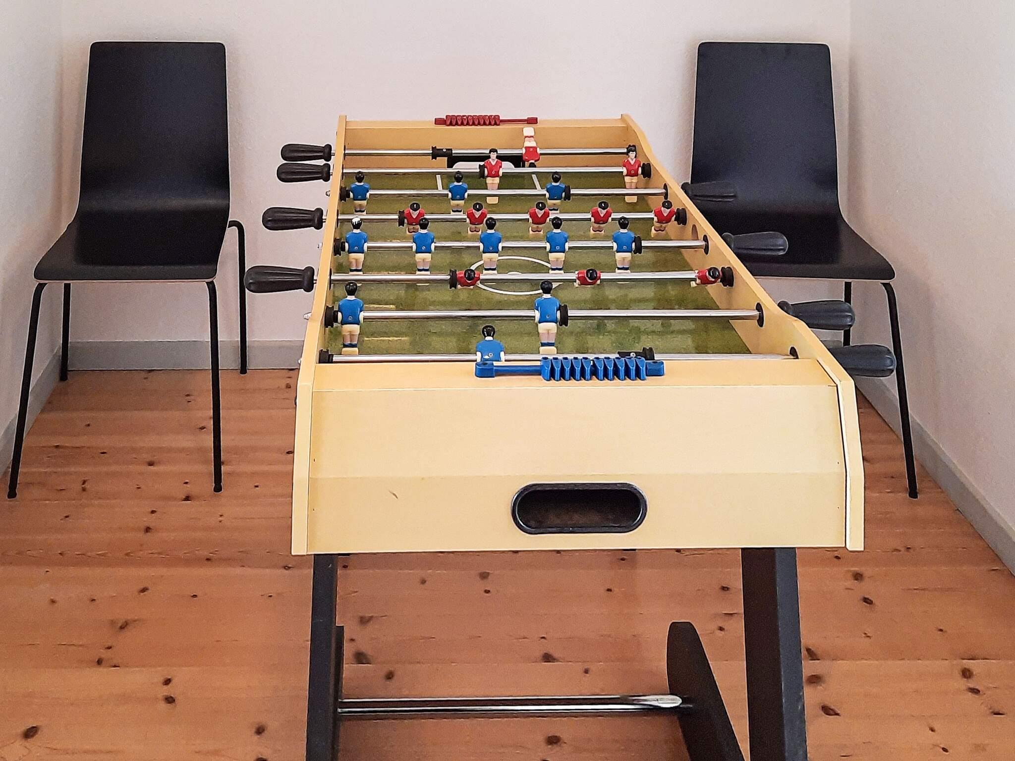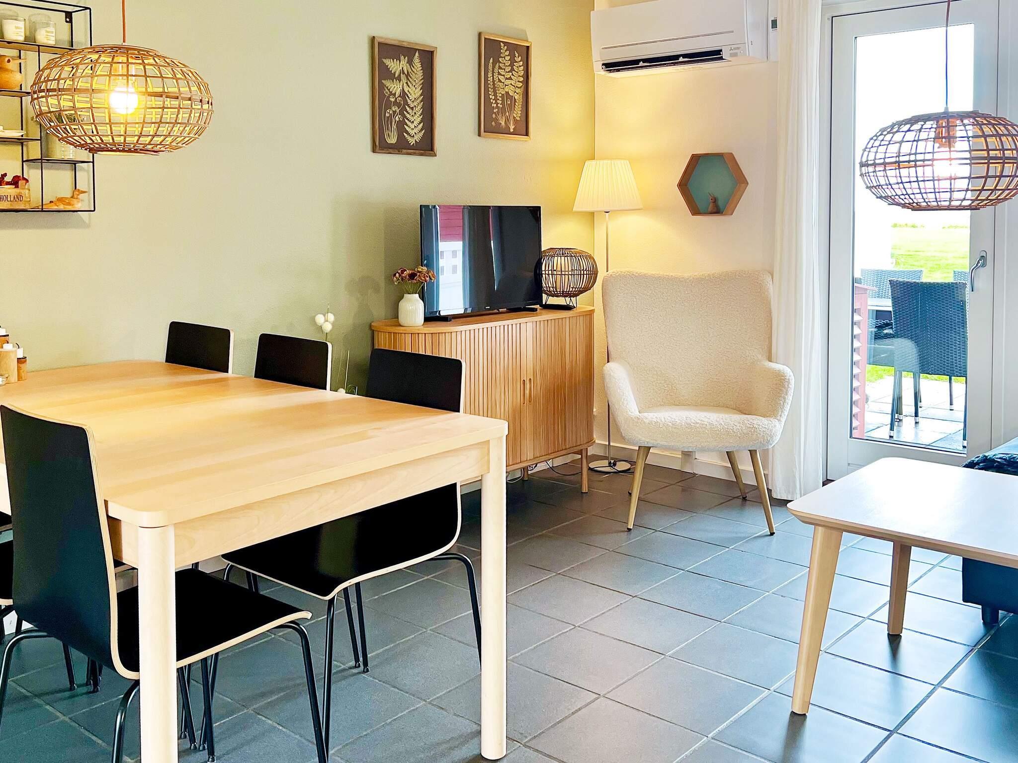 Die Wohnung ist im Erdgeschoss mit Bad, Küche, Ess- und Wohnzimmer mit Zugang zu einer Terrasse eingerichtet. Oben im 1. Stock gibt es einen schönen Balkon mit Meerblick, ein Schlafzimmer mit Doppelbett und ein zweites Zimmer mit 2 Etagenbetten und vier Schlafplätzen. Für den Freizeitspaß steht ein Tischkicker bereit. In der Wohnung wurden eine klimafreundliche Wärmepumpe sowie eine Waschmaschine installiert.