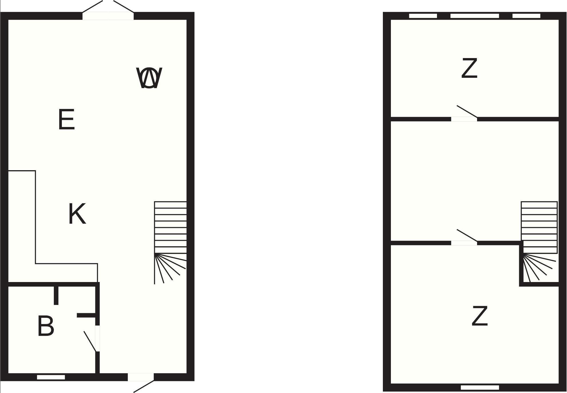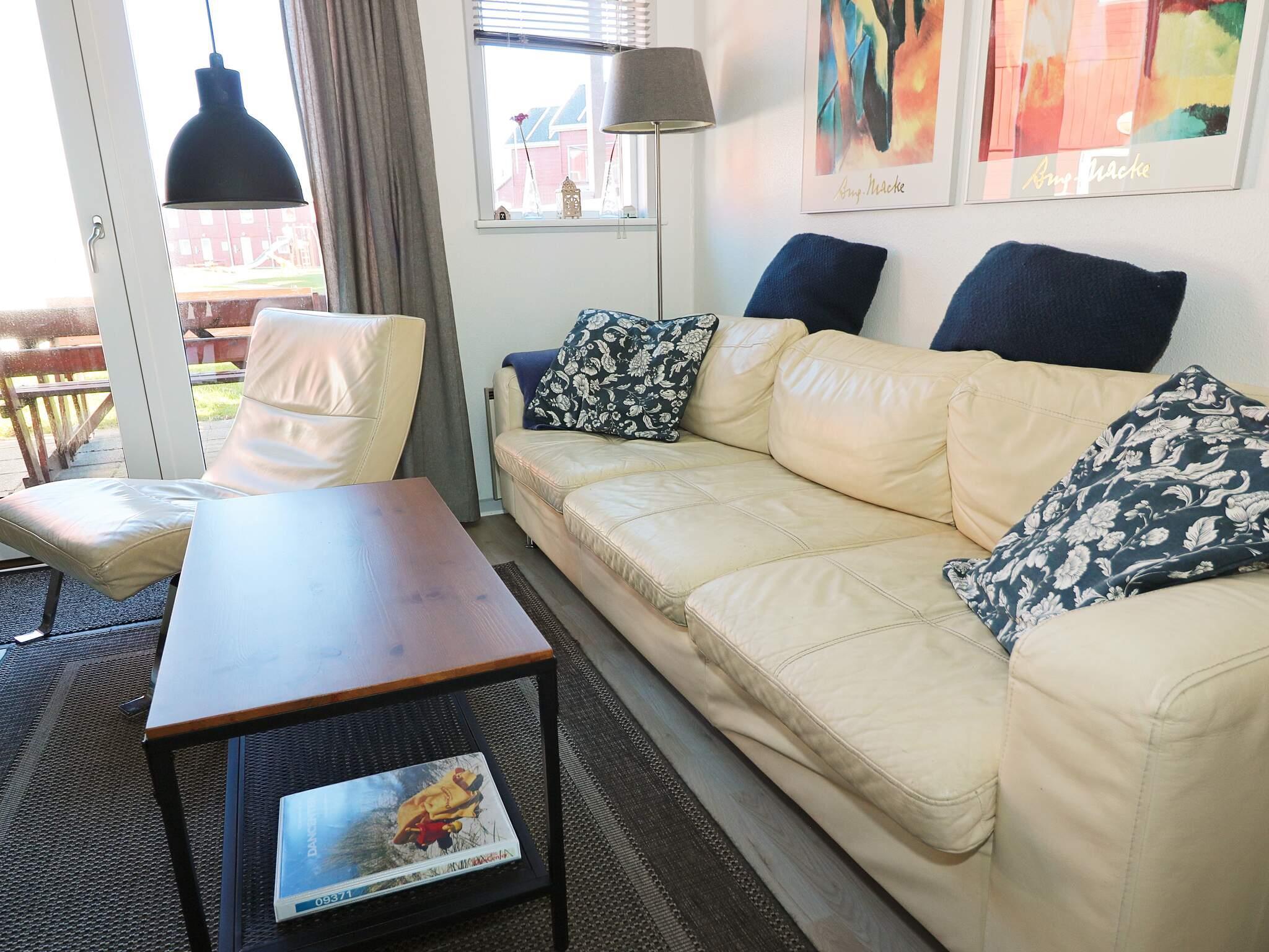 Die Wohnung hat im Erdgeschoss eine Küche, ein Esszimmer mit Zugang zu einer Terrasse mit Meerblick sowie ein Wohnzimmer mit doppelter Schlafcouch. Oben im Dachgeschoss liegen ein Schlafzimmer mit Doppelbett sowie ein zweites Schlafzimmer mit Etagenbett.