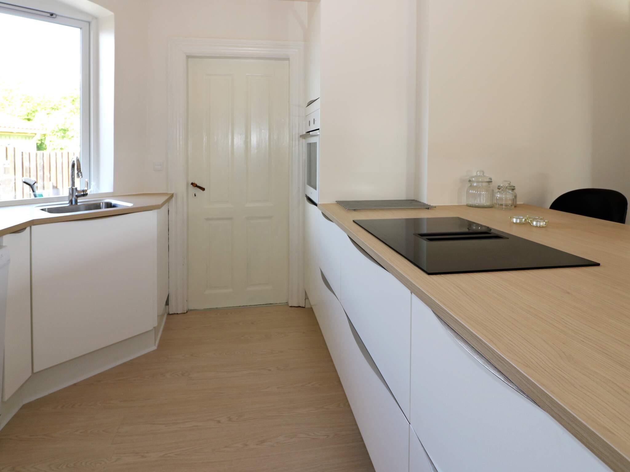 Küche: E-Herd, Kühl-Gefrier-Kombi, Mikrow., Abzugsh., Kaffeem., Spülm.