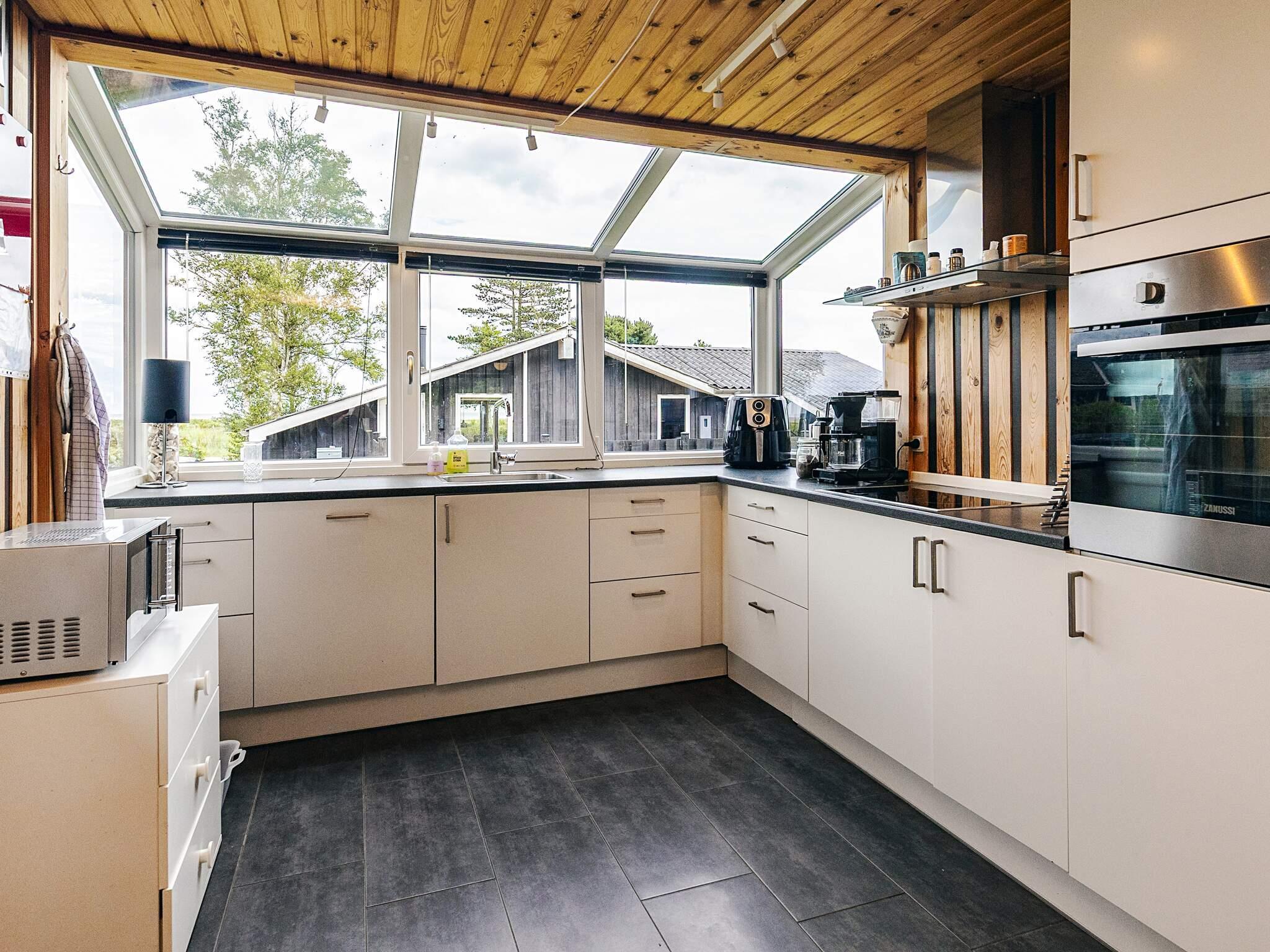 Innen helle Küche mit Blick aufs Wasser. Die Küche ist offen mit dem Esszimmer und dem Wohnzimmer verbunden und verfügt über einen Holzofen und eine Wärmepumpe. Vom Wohnzimmer aus gelangt man auf die große Holzterrasse und den Garten mit Schaukel und Spielgeräten. 1 Doppelzimmer mit 2 Einzelbetten bzw. Doppelbett, 1 Zimmer mit 2 Einzelbetten bzw. Doppelbett und 2 Kojen im Etagenbett. Badezimmer mit Dusche und WC.