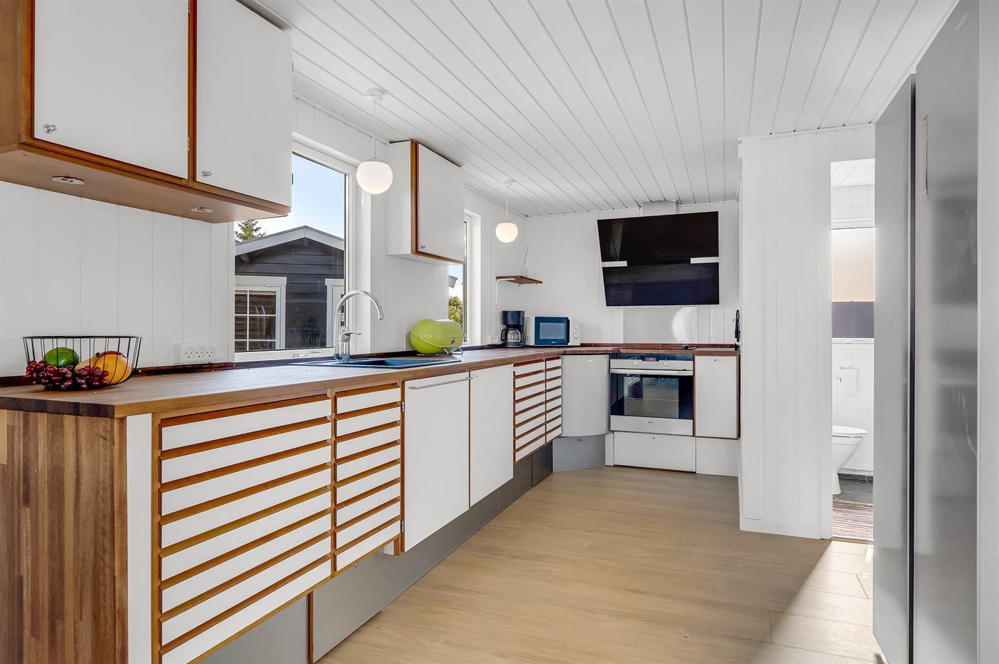 Die Küche ist mit Kühlschrank ausgestattet. Außerdem gibt es 4 Keramik-Kochfelder, Umluftofen, Mikrowelle sowie Geschirrspüler.