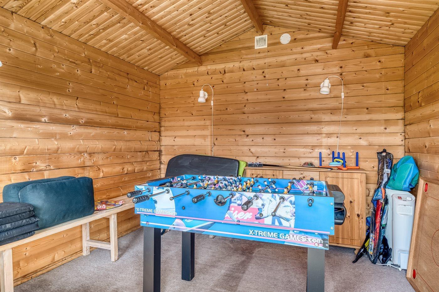 Das Haus bietet dir eine schöne Kombination aus Entspannung und Aktivitäten mit sowohl einer offenen als auch einer überdachten Terrasse, auf der du die Sommertage bei jedem Wetter genießen kannst. Auf der Terrasse findest du außerdem einen herrlichen Hot Tub – ideal für gemütliche Abende unter freiem Himmel. Zusätzlich verfügt das Haus über ein separates Aktivitätshaus, in dem sich Kinder und Erwachsene zu gemeinsamen, unterhaltsamen Momenten versammeln können.