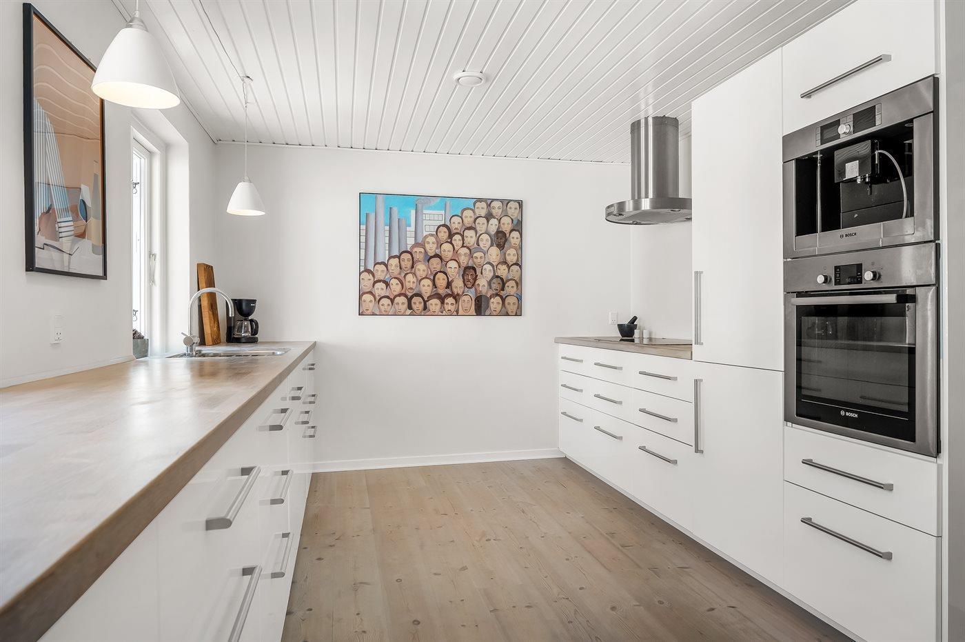 Die Küche ist mit Kühlschrank ausgestattet. Außerdem gibt es 4 Keramik-Kochfelder, Umluftofen, Mikrowelle sowie Geschirrspüler. Fußbodenheizung in der Küche.