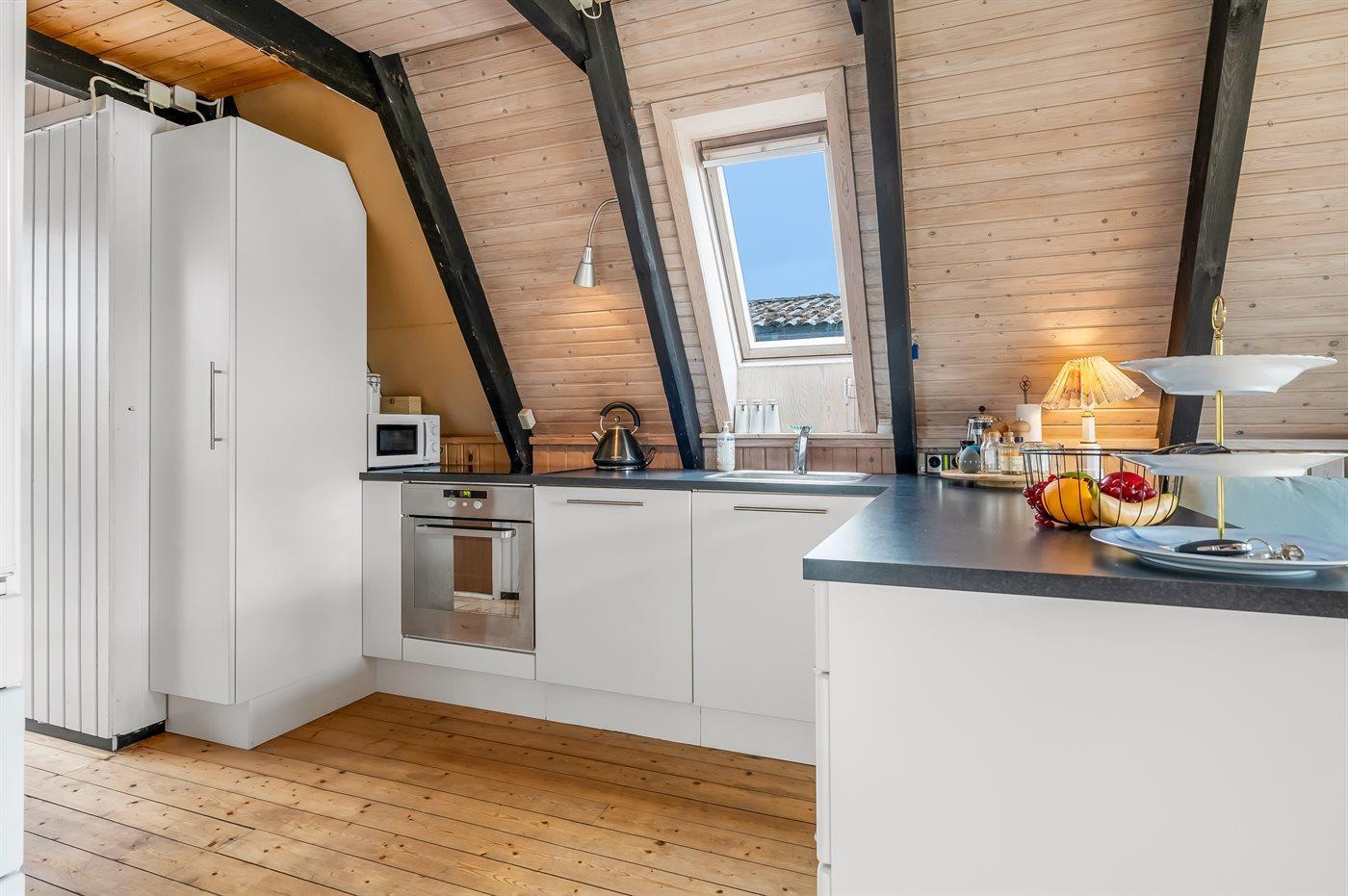 Die Küche ist mit Kühlschrank ausgestattet. Außerdem gibt es 4 Keramik-Kochfelder, Umluftofen, Mikrowelle sowie Geschirrspüler.