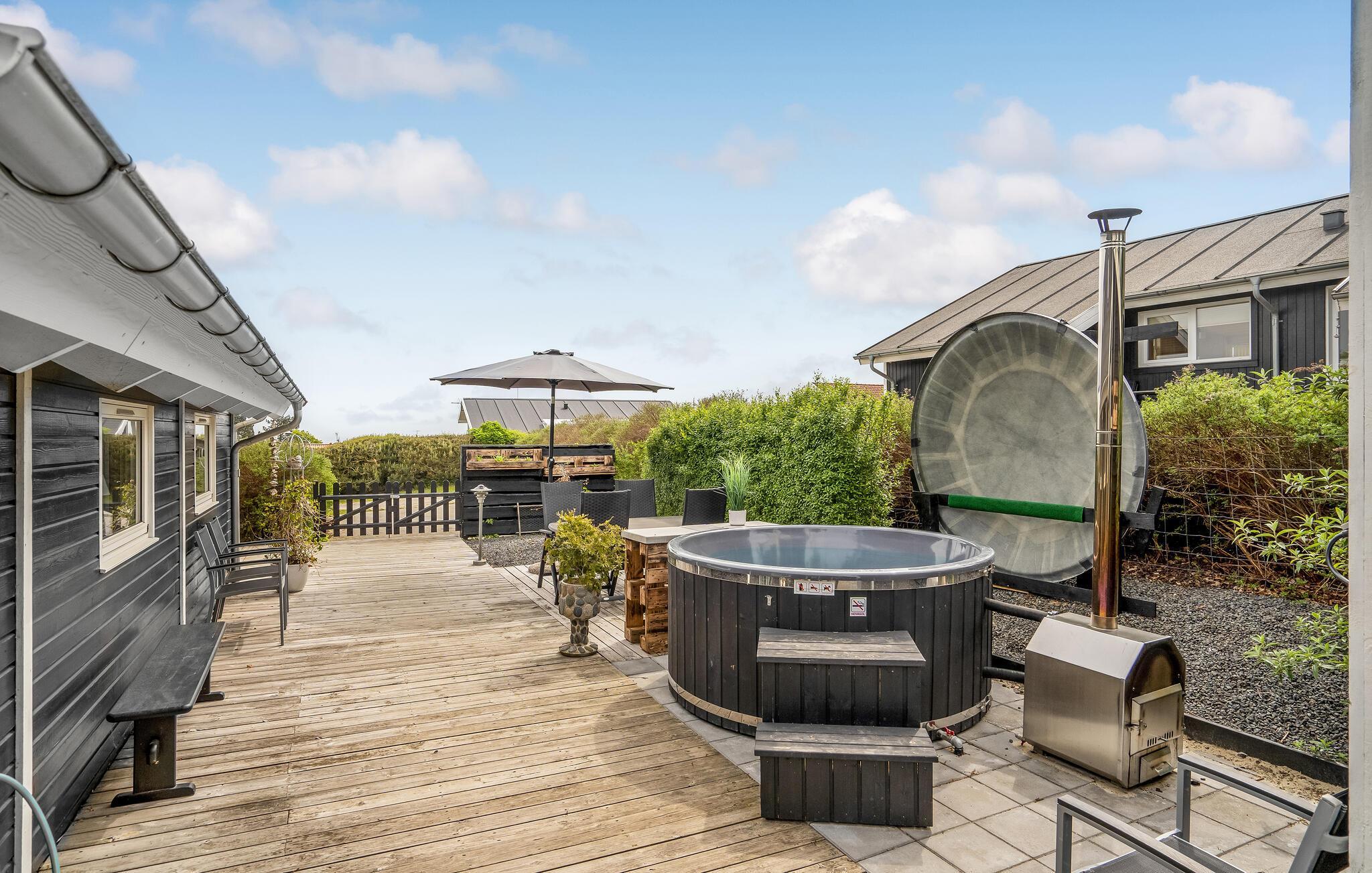 Modernes Ferienhaus mit Meerblick und holzbefeuerter Badetonne in Strandnähe für erholsame Urlaubstage.