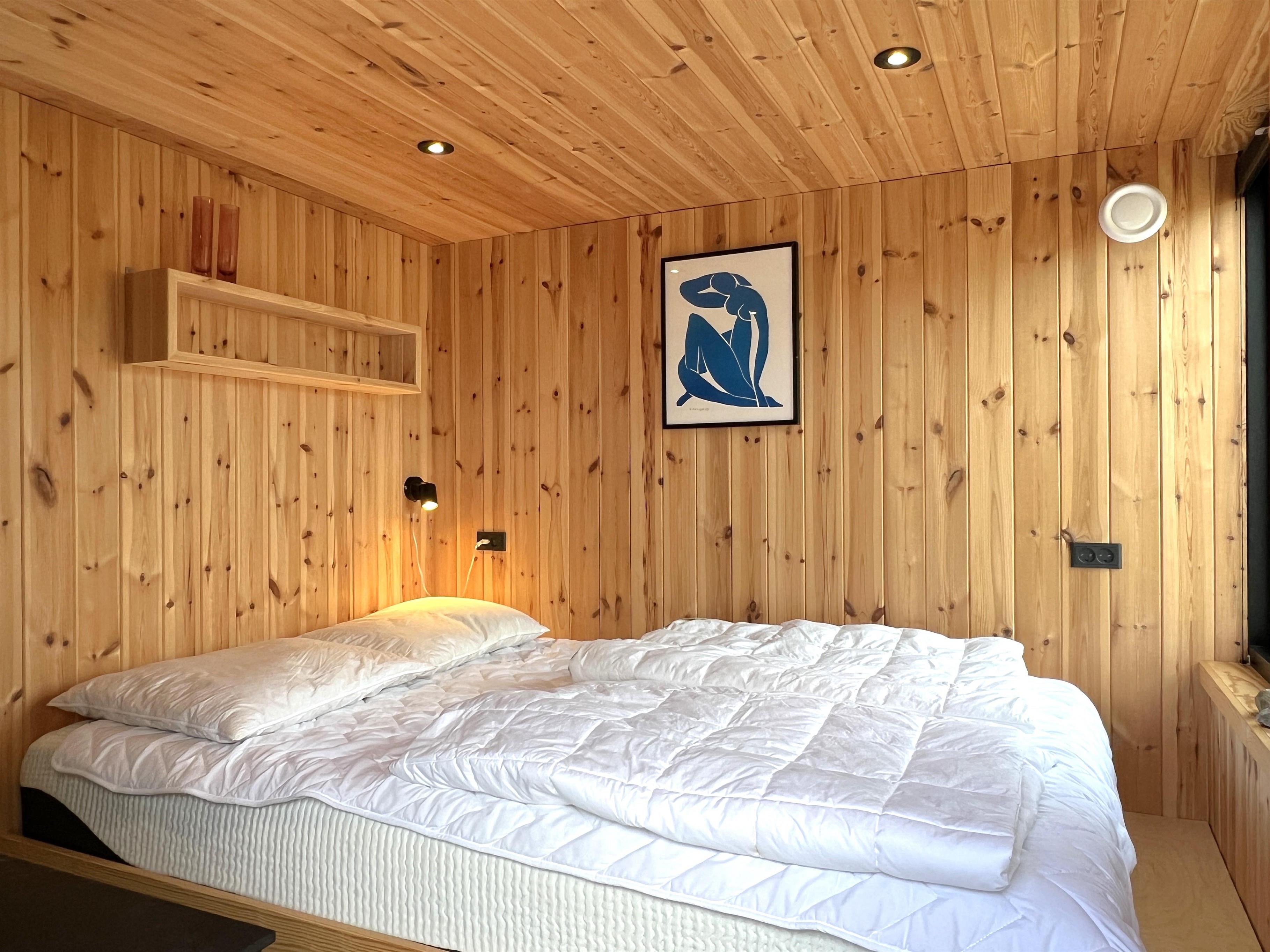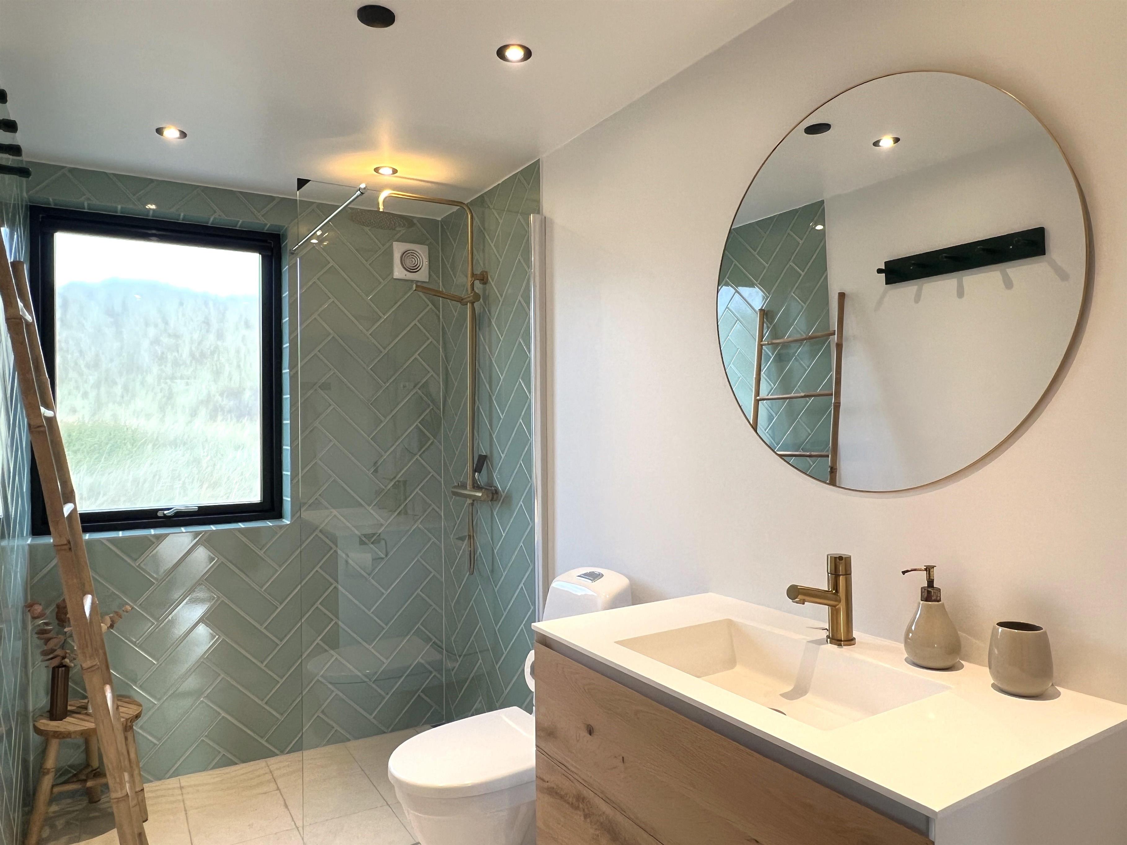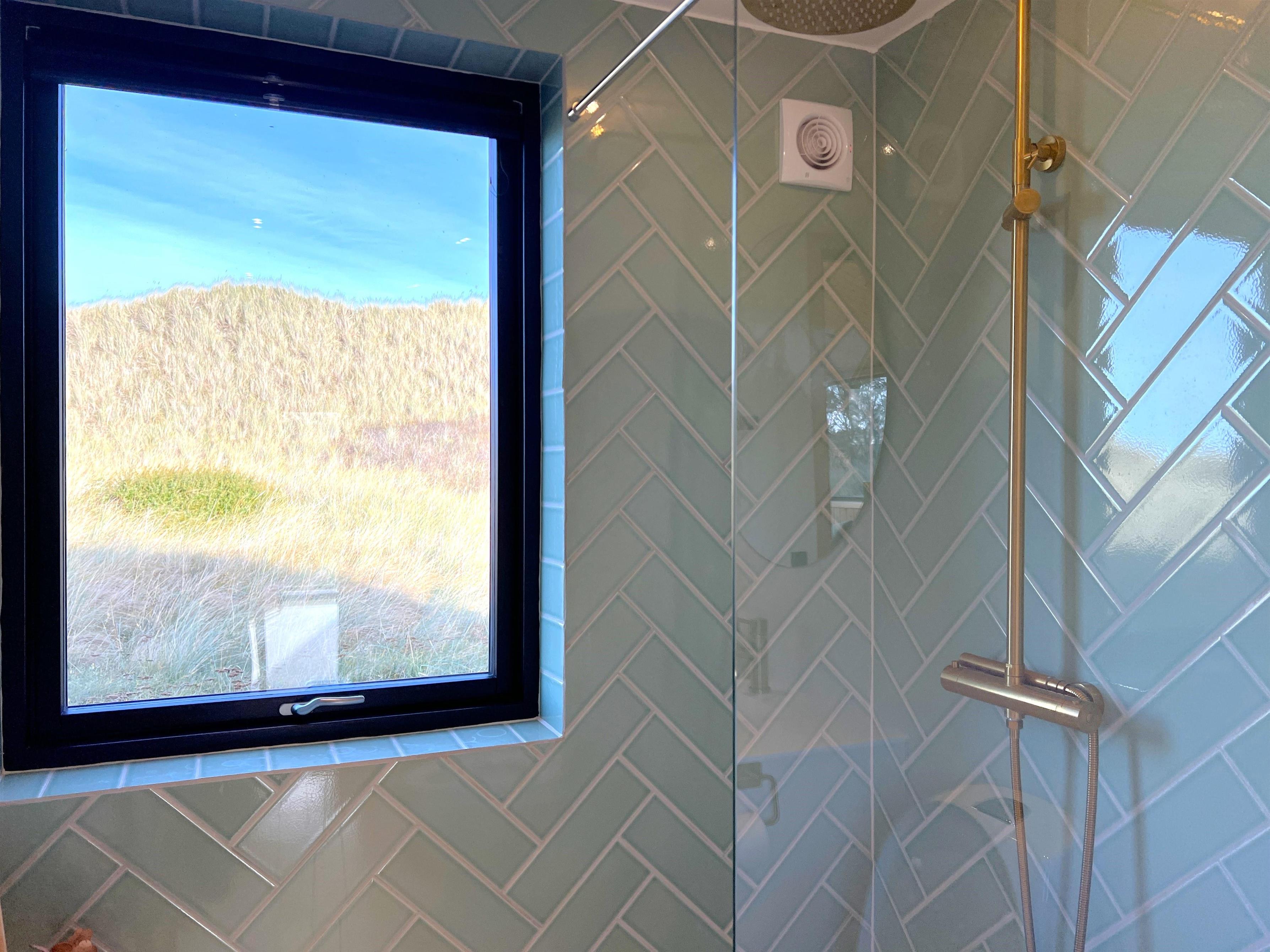 Schönes Badezimmer mit Dusche und zwei Schlafzimmer mit Doppelbetten und einer Aussicht, die den Morgen zu etwas ganz Besonderem macht. Schöner Anbau mit etwas kleinerem Doppelbett.