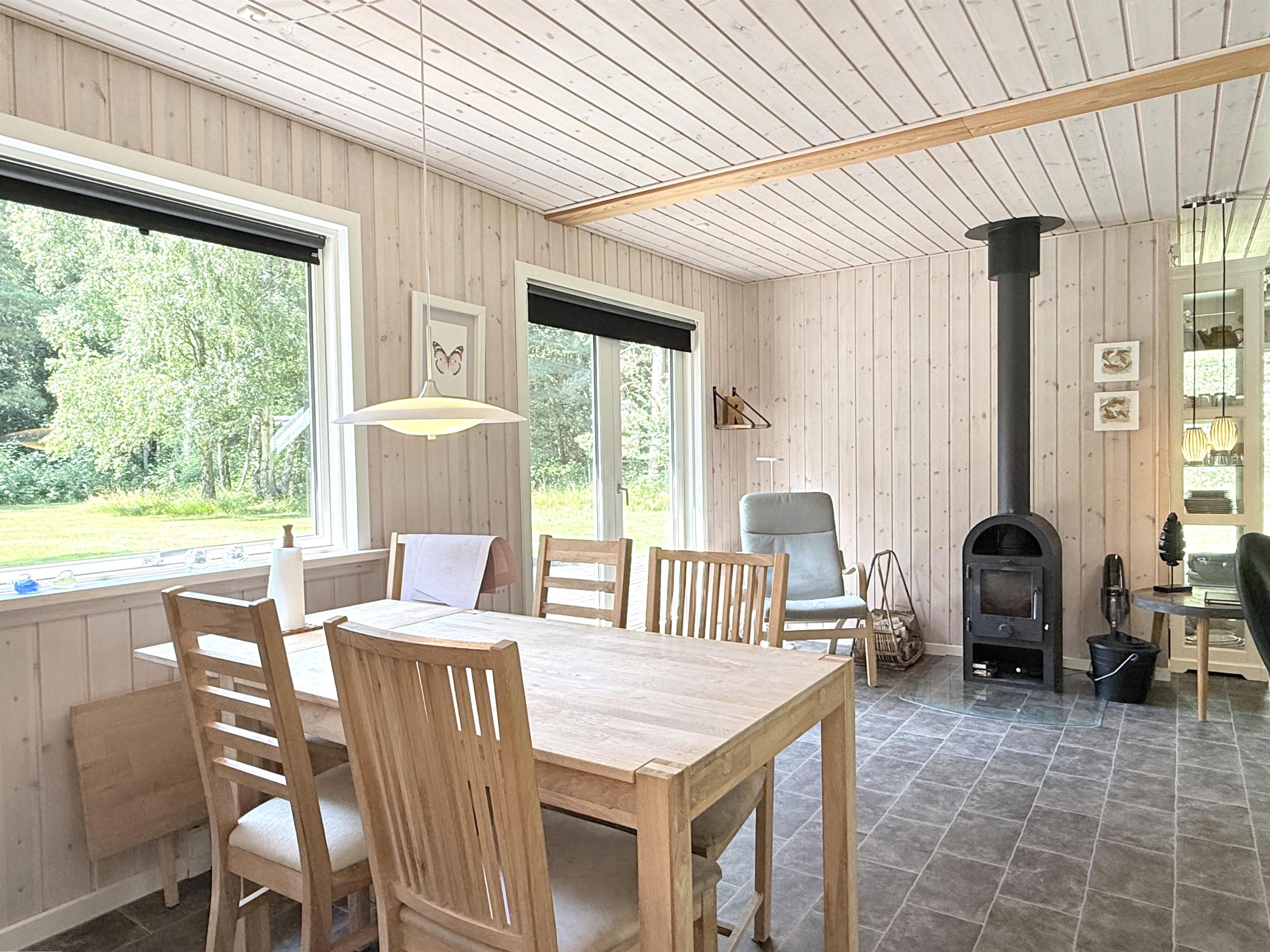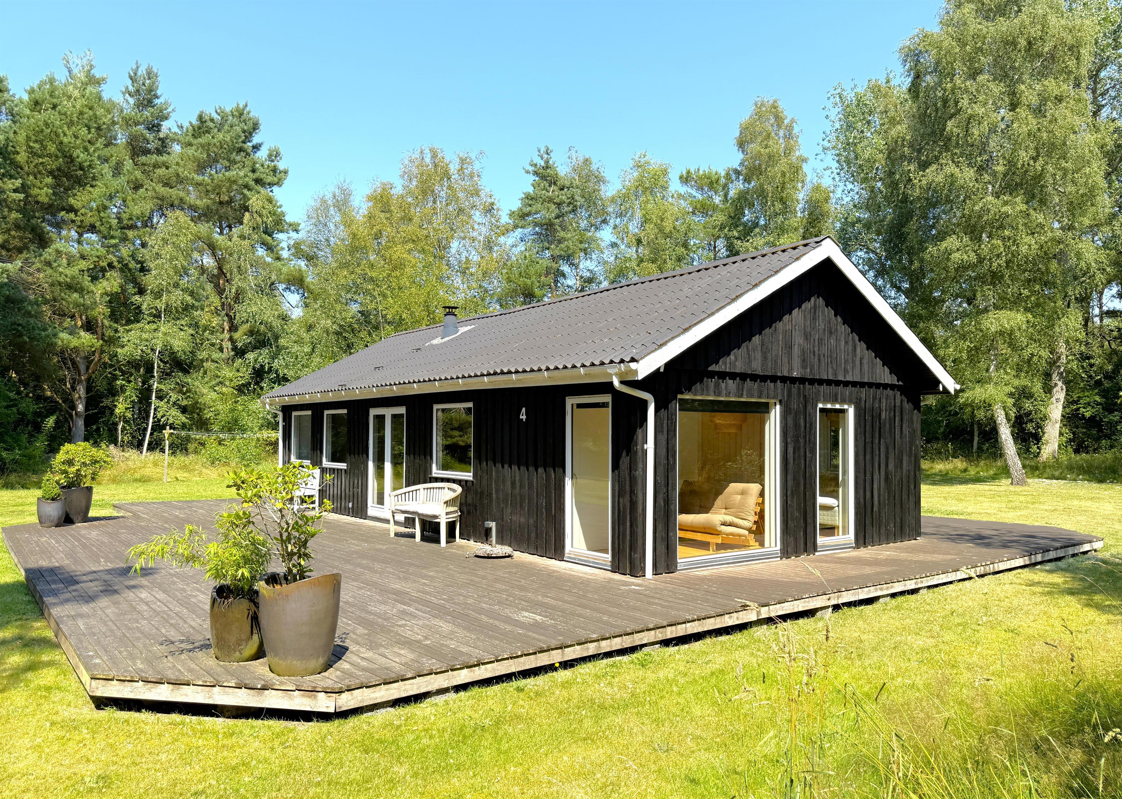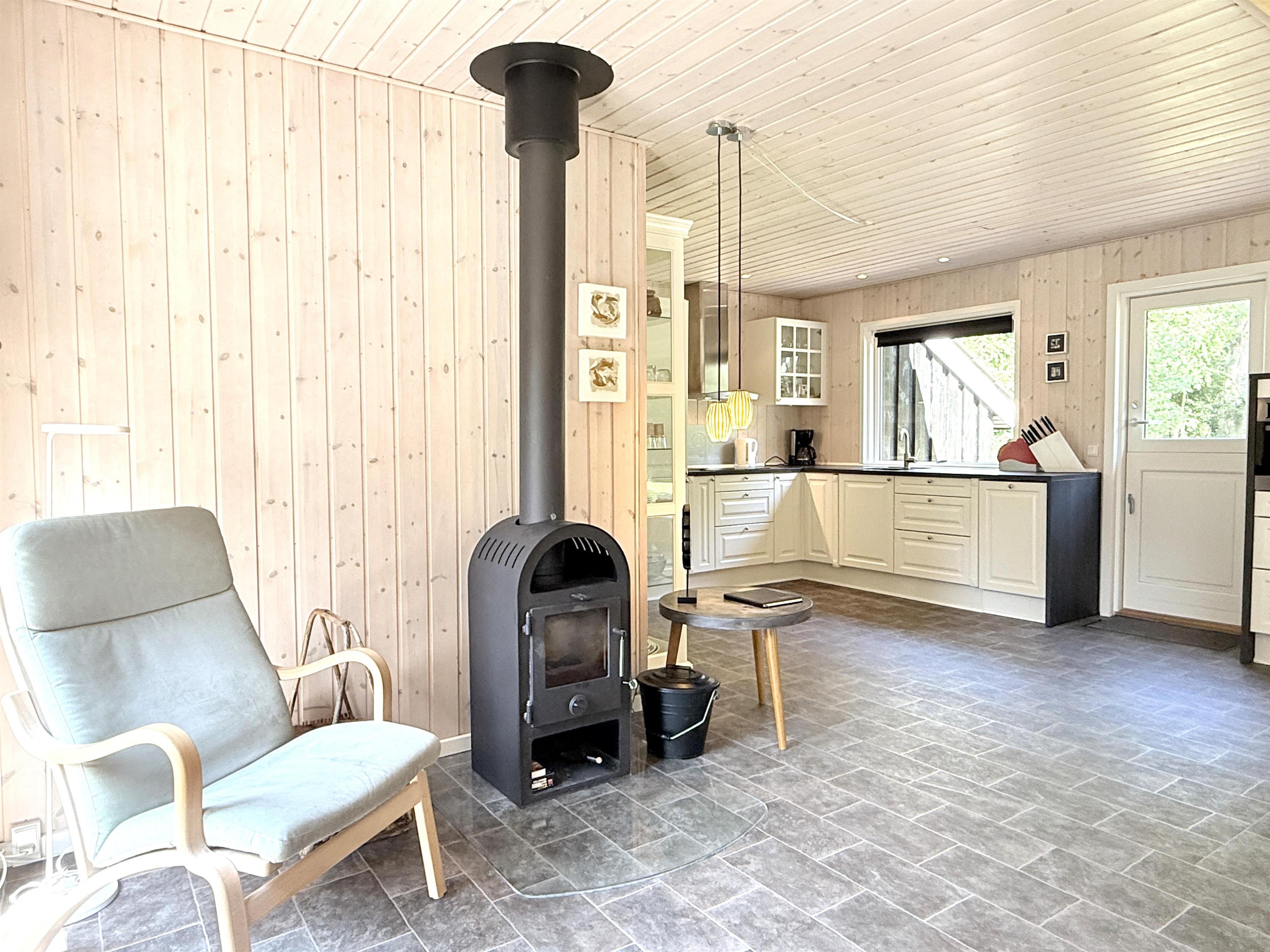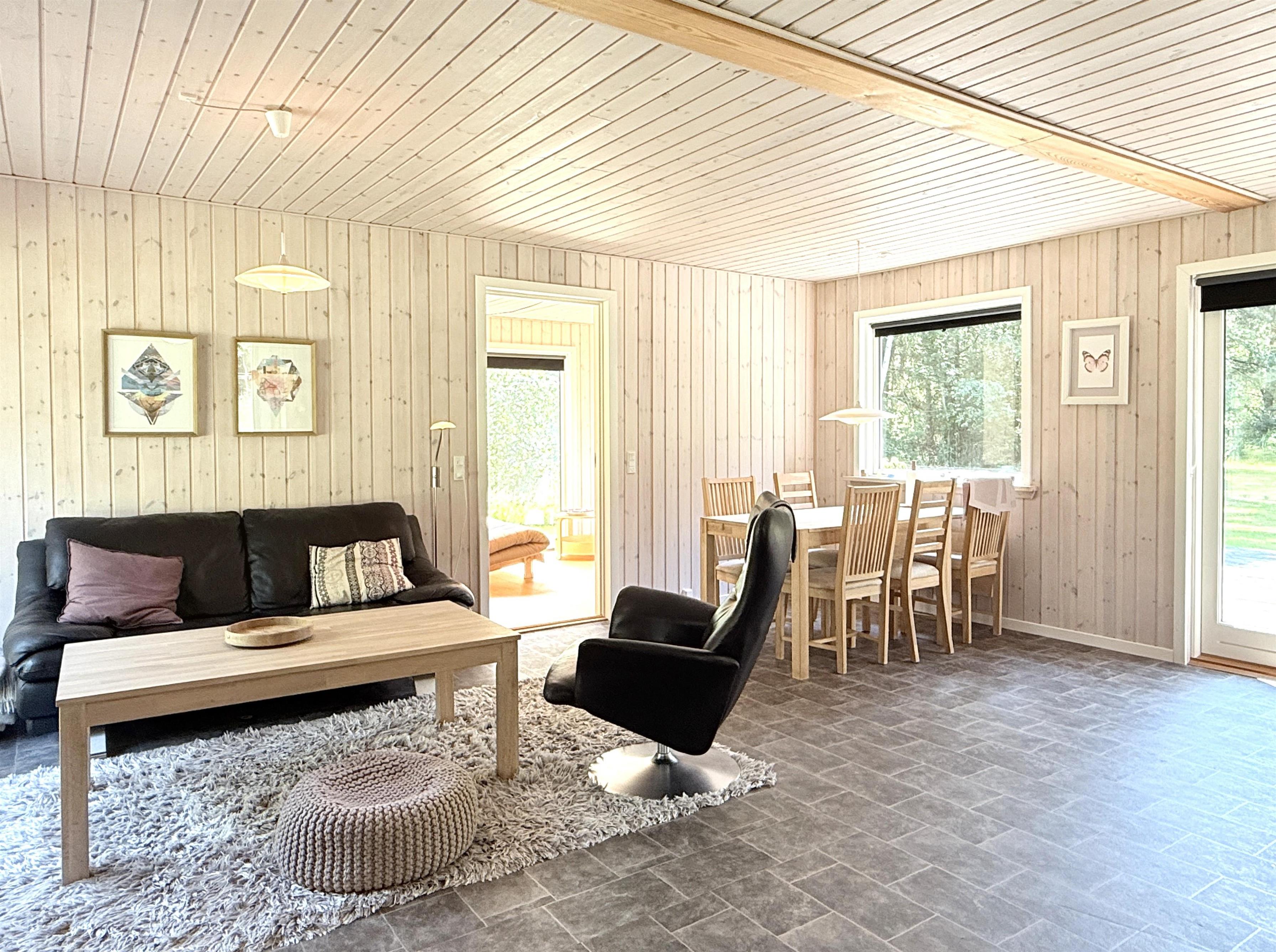 Das Ferienhaus verfügt über eine große, helle Wohnküche mit moderner Küche, Essbereich und gemütlicher Sofaecke mit Fernseher. Vom Wohnzimmer aus gelangt man auf die große, brandneue Holzterrasse (Herbst 2025), die mit ihren vielen Quadratmetern zu sonnigen Momenten inmitten der Natur einlädt. Das Haus verfügt über zwei gute Schlafzimmer mit viel Stauraum. Von einem Schlafzimmer aus gelangt man auch auf die Terrasse, wo der hauseigene Grill genutzt werden kann. Ein zusätzliches Zimmer mit Schlafsofa steht bei Bedarf zur Verfügung. Außerdem gibt es ein brandneues, schönes Badezimmer (2024). Ein Nebengebäude mit Waschmaschine und Trockner ist vorhanden. Neben der Holzterrasse mit Gartenmöbeln und Sonnenliegen gibt es auf dem Grundstück mehrere gemütliche Ecken, darunter eine Terrassenecke mit schönem Unterstand, zusätzlichen Gartenmöbeln und einer Feuerstelle. Hier können sich Familie und Hund vergnügen.