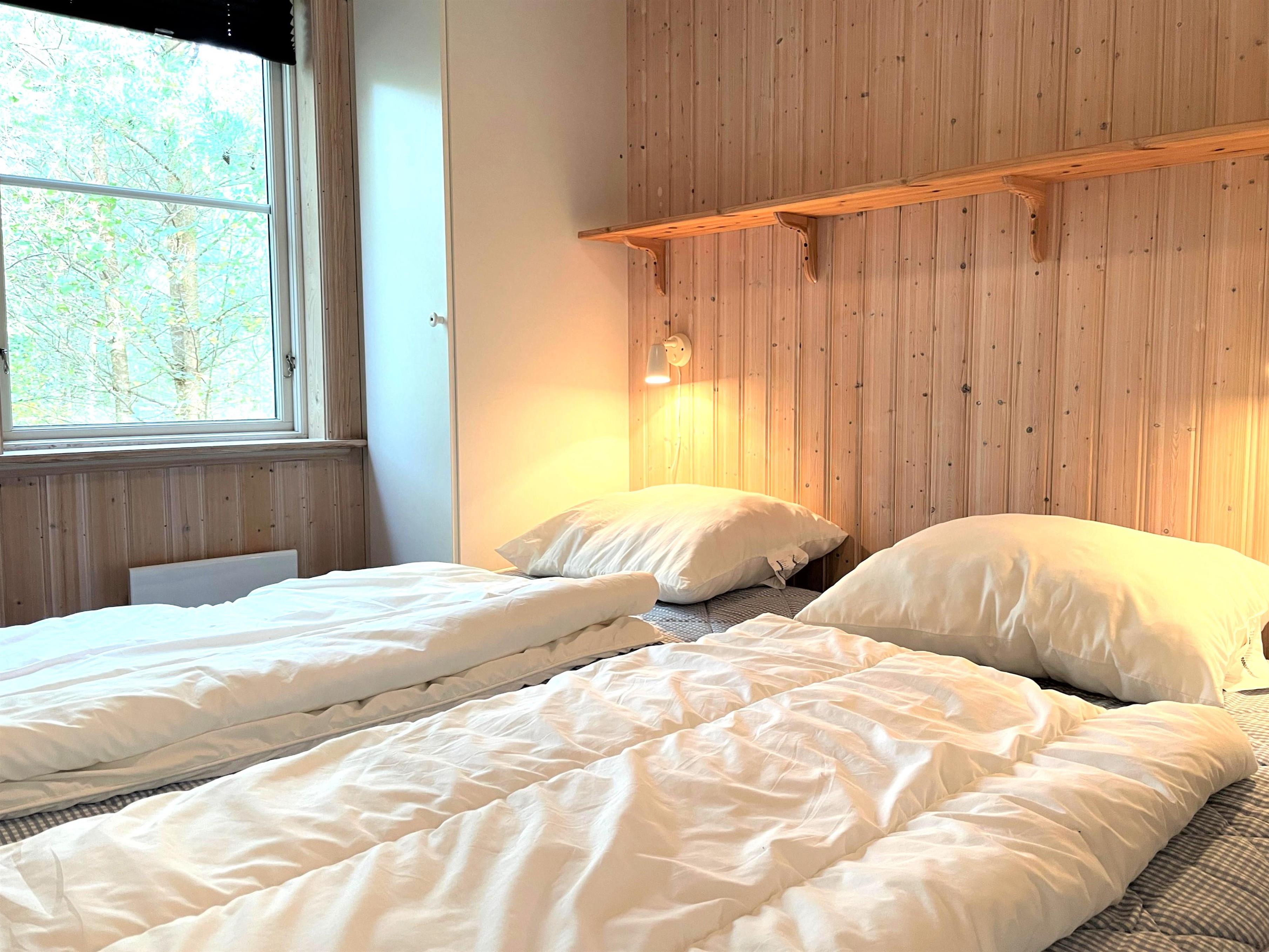 Schönes und gepflegtes Holzhaus, hell und modern. Große Wohnküche mit Zugang zur Terrasse. Gemütliches Wohnzimmer mit Holzofen und von dort Zugang zur großen Holzterrasse. Badezimmer mit Duschecke und Fußbodenheizung. Ein Zimmer mit Doppelbett. Drei Zimmer mit ausziehbaren Schlafsofas.