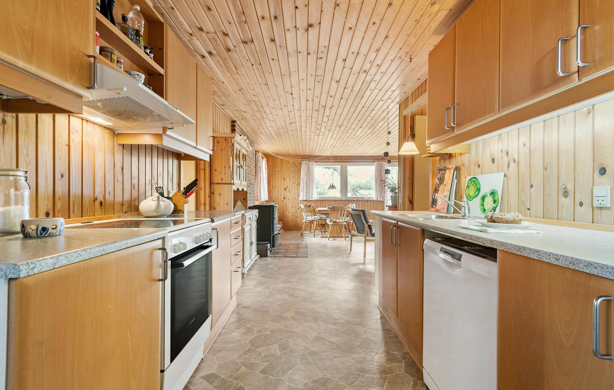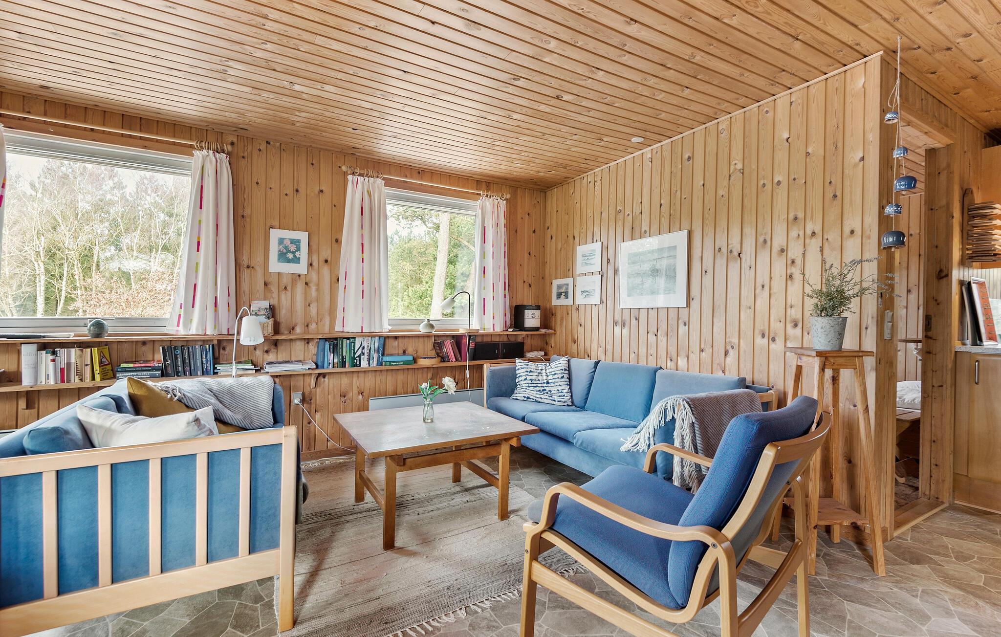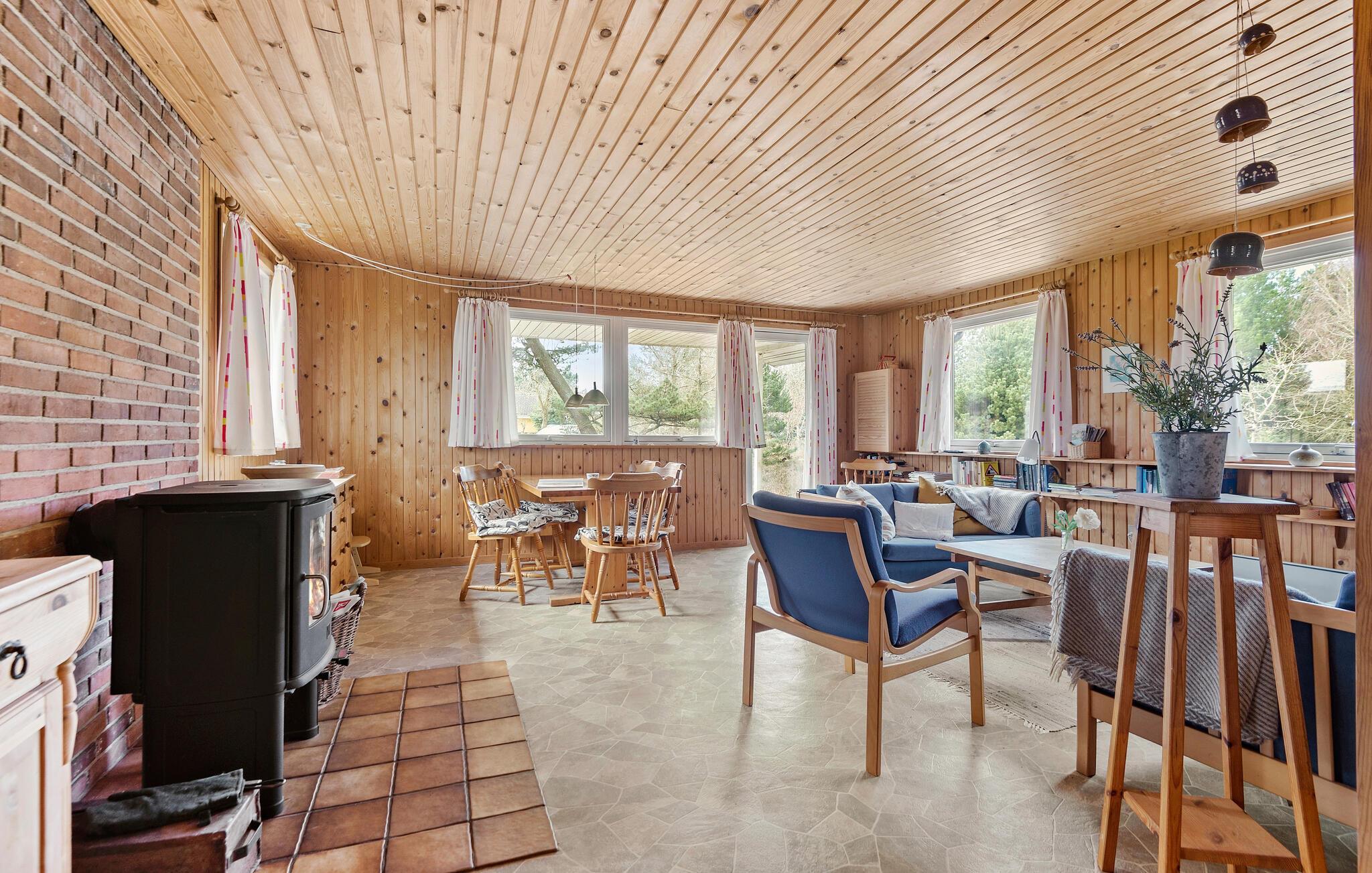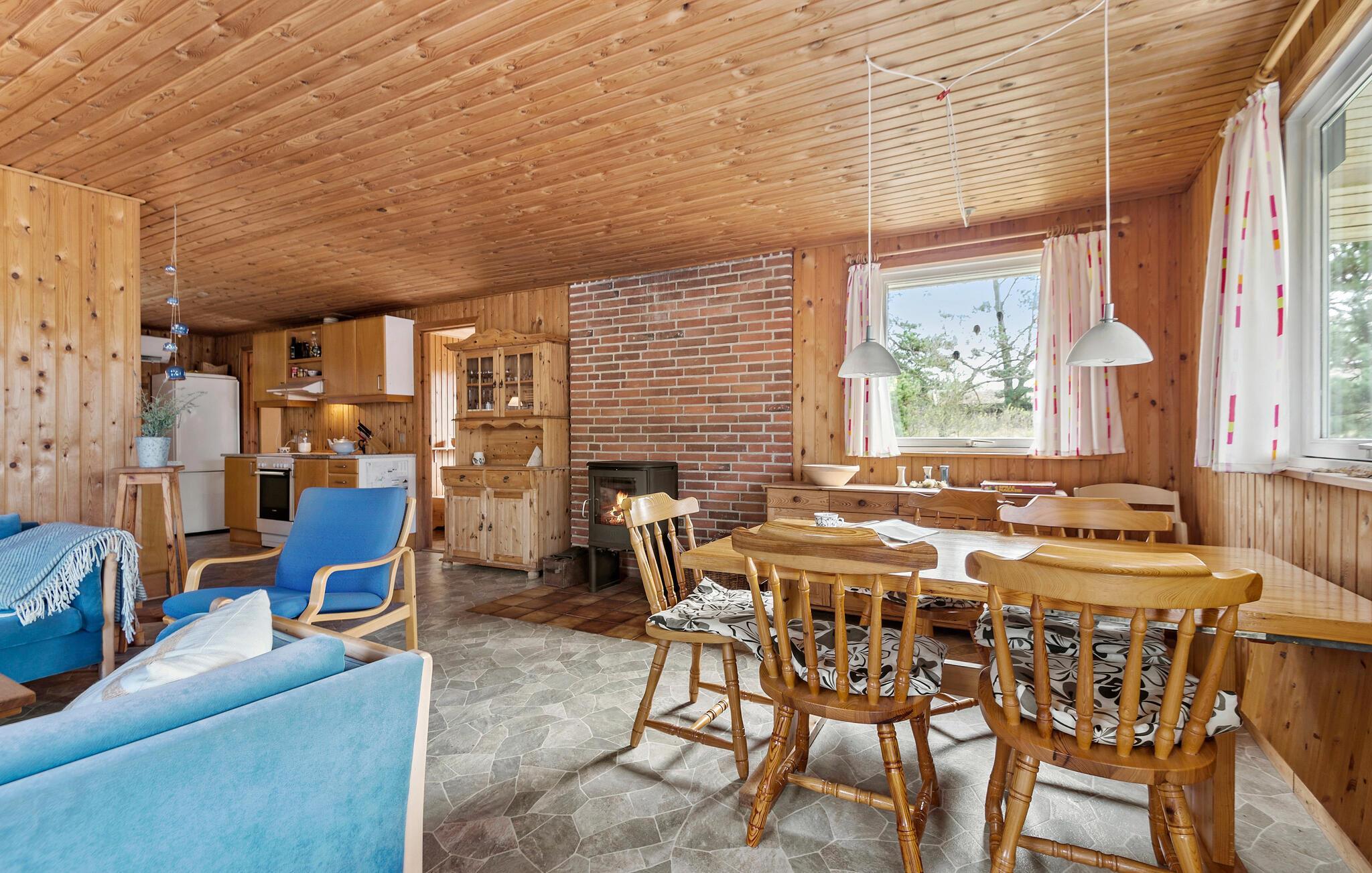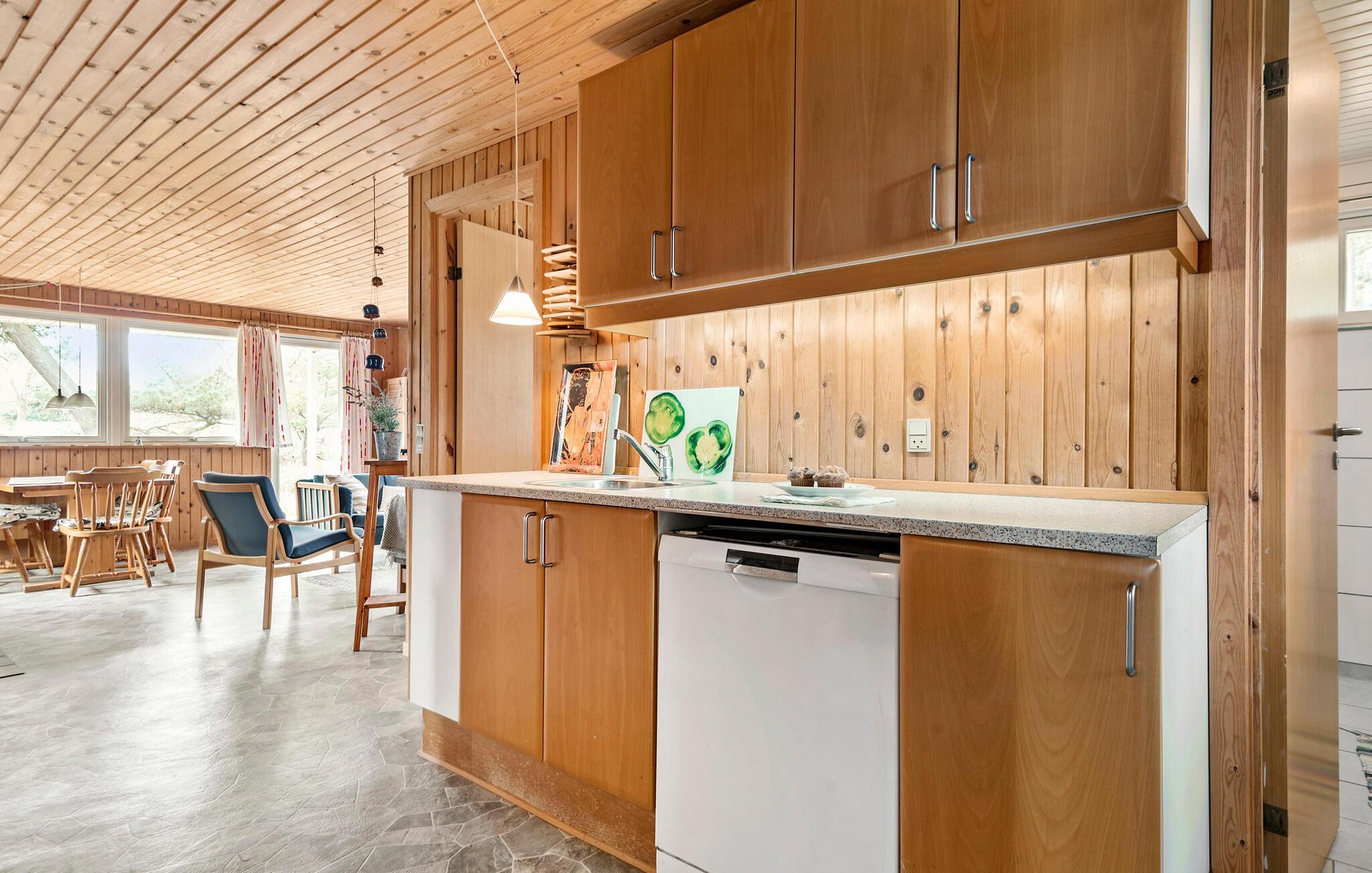 Auf der Ostseite der Insel Rømø heißt Sie dieses klassische Ferienhaus zu einem Urlaub mit viel Entspannung und frischer Luft willkommen. Das ganze Haus strahlt mit seinem Holzambiente eine warme und einladende Atmosphäre aus. Kochen Sie morgens in der offenen Küche eine Tasse Kaffee und genießen Sie diese draußen auf der Terrasse an der frischen Luft und atmen Sie hier den angenehmen Duft der Nadelbäume ein. Im Wohnbereich können Sie mit der Familie am Esstisch speisen oder auf den Sofas Brettspiele spielen und Bilder malen.